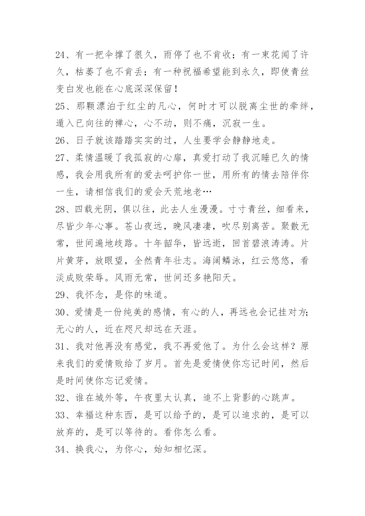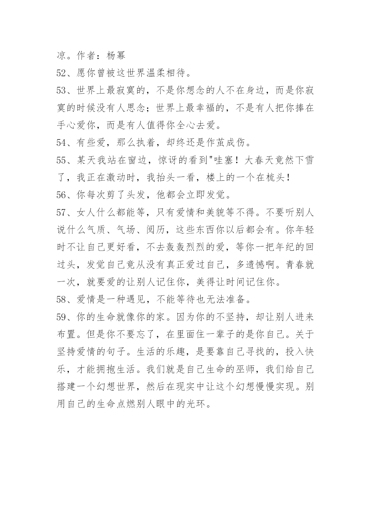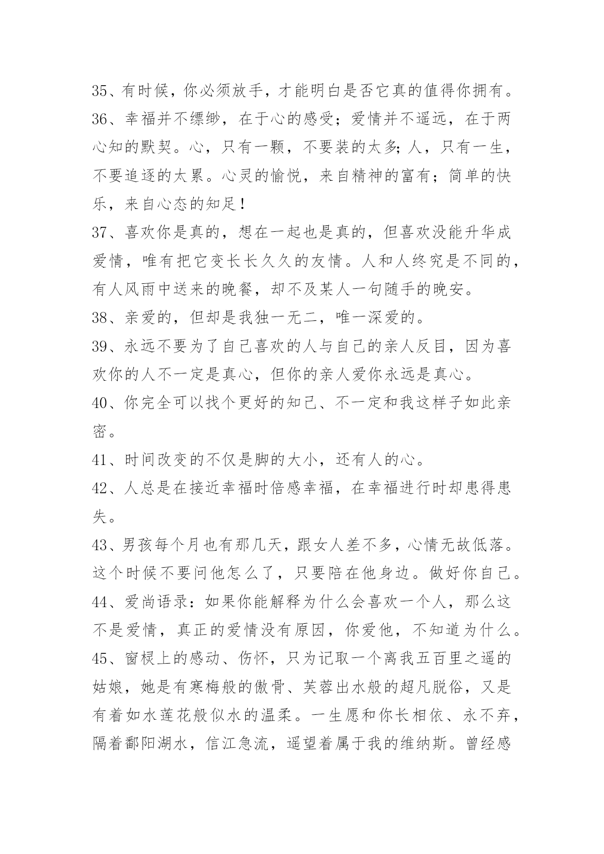 流行爱情句子59条2022年通用流行爱情句子汇总59条你打破我固定的生活,却随便离开了。下面是小编精心准备的流行爱情句子59条,欢迎阅读,希望能够对大家有所帮助。1、有些感情超越了友情,但止步于爱情。2、在遇到你之后,我真正体会到了什么是牵挂,什么是痴痴恋恋,什么是同节奏的心跳。爱,是一场雨,也时常湿了我干净的衣衫。喜欢雨里飘渺温馨的感觉,哪怕会湿了我干净的衣衫。3、亲爱的,就算全世界的人都不爱我,我也可以爱我自己。4、爱一个人就是大恸之后终于心头一片空白。不再爱也不再恨,不再恼怒也不再悲哀。心中渐渐滋生出怜悯,怜悯曾经沉溺的你更怜悯你爱过的那人,怜悯那份庸常,还有那份虚弱。5、一个人的生命里,擦肩而过的人有千千万万,有几个是知音?有几个是深爱自己的人?爱情再坚固,也无法承受忙碌的侵蚀,你忙得天荒地乱,你忙得忘记关心,你忙得身心疲惫,你忙得无所适从,但是爱情不能等你有空才珍惜。6、人活一世,无论爱的多么铭心刻骨,到头来也不过是对情感时光的一种交付。缘来相遇,缘尽分离。就算可以执手到老,也终究难逃轮回定数。因为我们毕竟不是神话,可以将一份爱情延续到千百万年,不变不移。7、或许,世间正是有了这样残缺的美才显得那么多姿,因为不完美所以才会去追求完美,一如爱情,越是朦胧我们便越是想要去揭穿它的面貌,爱过了,伤过了,也就懂得了。8、今时今日我已经没有那样再爱一个人的能力了。我只有心脏骤停,却无力回应。当时年少不经事,现在两个人都早已不能回头。风华是一指流砂,苍老是一段年华。9、人不是谁忠于谁,而是都忠于自己的爱情。10、世界上最美好的事物是无法被看到或触摸到的,他们必须用心去感受。11、谁来烧热我眼睛的黑色,谁能止得住我的干渴。12、我乱发脾气,是我不对,以后我一定尽量克制。想起我们曾经有过的甜蜜,所有的气都烟消云散了。亲爱的,我们复合好吗?13、恋爱就像手机,总是谣传要改单向收费,却永远出不了台,最后你才发现,谣言发源地不是用户自己,就是没有手机的所谓专家学者。14、有的人就是认定一辈子只会爱上一个人,这样的人真是的让我们感觉到了这个世界稀有动物的存在。在这方面,电视剧绝对是误导广大青少年的罪魁祸首,大肆的宣扬缘分、命运这些虚幻的东西,让人感觉我这辈子如果不和谁在一起那就是错过缘分,跟对不起人民群众似的,然后就拼了命的追啊。15、非万象皆你眉眼,是万象皆不如你。16、我想我总是不知道要如何去学会放弃,现在我知道。其实,有些是你根本就无法掌控的,不是你不去放弃,而是你根本就抓不住。再好的男人如果他不爱你,那么他的好也和你无关,不属于你的人,不爱你的人就不会对你投入真心,也不会对你作出一定的付出。17、祸水红颜,朱砂点,泪已泛滥,寻觅你一次又一次的阑珊,不在乎蜚语与流言。18、很多人都刻意去追求那种轰轰烈烈荡气回肠的爱情生活,而他们完全没有意识到身边的生活本来就应该是平淡的,平淡的就是幸福的。19、我相信,相濡以沫的爱情,但我更相信永远的兄弟!20、女人确实比男人更容易相信爱情。只为爱情的甜头尝过之后,接下来便是女人长达一生的付出——于是她们说,为了爱。一想到这三个字,女人自己就先释然了,至于那究竟是不是爱,或者在男人眼中算不算是爱,都已不再重要。时光流逝,爱与不爱都已被认真封存起来,不到特定日子,都不舍得拿出来尝上一口。21、一个人就算有再多缺点,可能处处忍让你,陪你到最后,那就是终点。因为陪伴与懂得,比爱情更加重要。找一个你愿意忍受你的人,一起走到最后。22、给我说说你有怎样的妻子,我就会告诉你你是怎样的丈夫。23、因为所有的爱,只要是爱,都不应该受到人们的冷落甚至不屑。24、有一把伞撑了很久,雨停了也不肯收;有一束花闻了许久,枯萎了也不肯丢;有一种祝福希望能到永久,即使青丝变白发也能在心底深深保留!25、那颗漂泊于红尘的凡心,何时才可以脱离尘世的牵绊,遁入已向往的禅心,心不动,则不痛,沉寂一生。26、日子就该踏踏实实的过,人生要学会静静地走。27、柔情温暖了我孤寂的心扉,真爱打动了我沉睡已久的情感,我会用我所有的爱去呵护你一世,用所有的情去陪伴你一生,请相信我们的爱会天荒地老…28、四载光阴,俱以往,此去人生漫漫。寸寸青丝,细看来,尽皆少年心事。苍山夜远,晚风凄凄,吹尽别离苦。聚散无常,世间遍地歧路。十年韶华,皆远逝,回首碧浪涛涛。片片黄芽,放眼望,全然青年壮志。海阔鳞泳,红云悠悠,看淡成败荣辱。风雨无常,世间还多艳阳天。29、我怀念,是你的味道。30、爱情是一份纯美的感情,有心的人,再远也会记挂对方;无心的人,近在咫尺却远在天涯。31、我对他再没有感觉,我不再爱他了。为什么会这样?原来我们的爱情败给了岁月。首先是爱情使你忘记时间,然后是时间使你忘记爱情。32、谁在城外等,午夜里太认真,追不上背影的心跳声。33、幸福这种东西,是