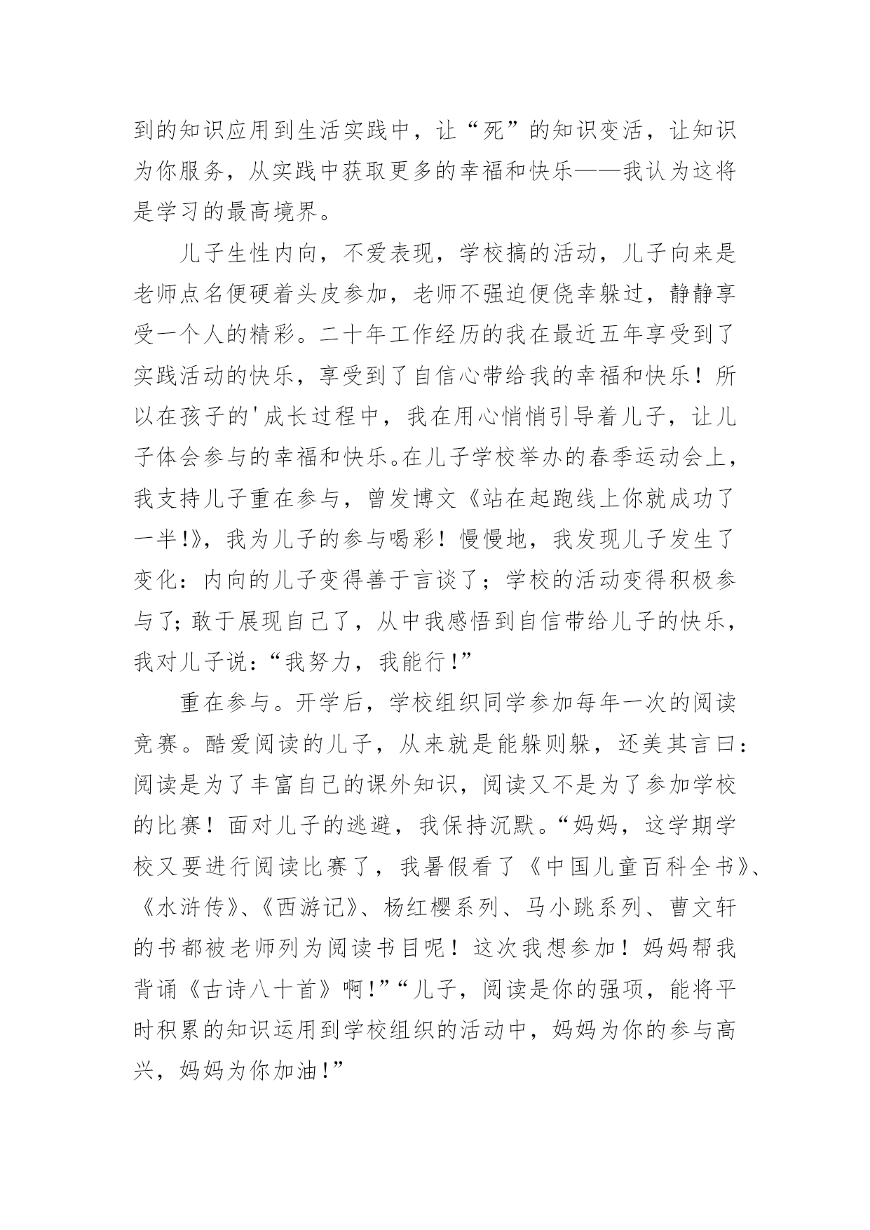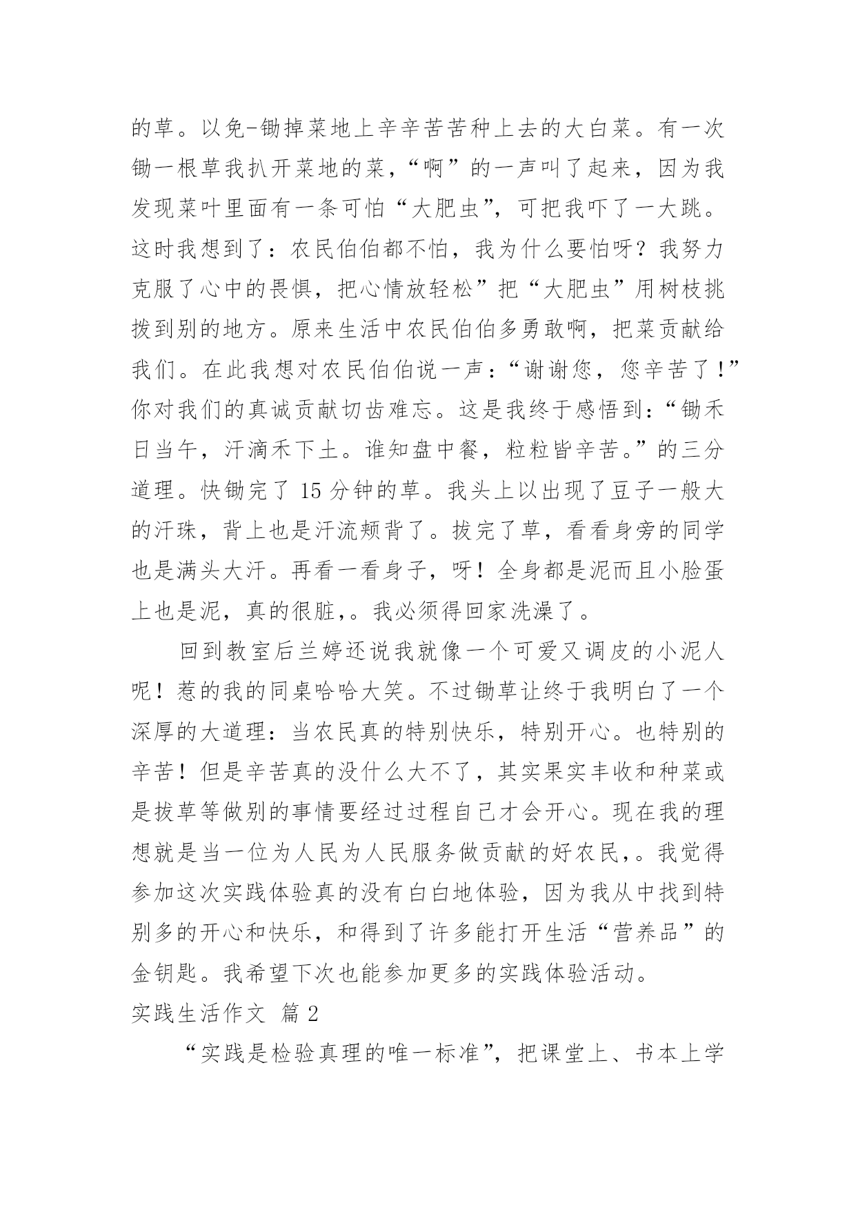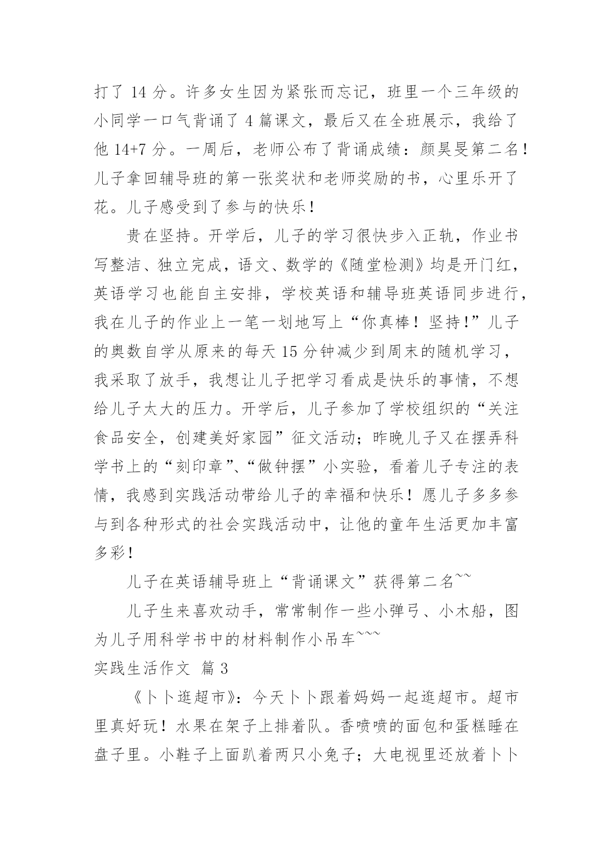 实践生活作文【热门】实践生活作文三篇在日常学习、工作和生活中,大家总少不了接触作文吧,作文一定要做到主题集中,围绕同一主题作深入阐述,切忌东拉西扯,主题涣散甚至无主题。那么你知道一篇好的作文该怎么写吗?以下是小编为大家整理的实践生活作文3篇,仅供参考,希望能够帮助到大家。实践生活作文篇1虽然骄阳没有那么火辣,也没有那么的耀眼。虽然白云没有太多的激励和欢情。但是我和其他几个同学有比骄阳更火辣的满腔热情。你猜我为什么这么的高兴呀?因为今天迎来了一次难得的体验实践活动——锄草。杨老师把我们带到学校的实践基地,找到了我们班级的基地。锄草开始了。刚刚开始的时候,我想:就锄草这点儿小事情很简单的,我一下就可以锄完的,锄草一点也不难。因为草和大白菜实在太相像了。所以我也不管三七二十一我就锄呀锄呀,后来杨老师走了过来仔细的瞧了瞧我们放草的草堆,提醒我说:“胡洋,你拔的都是菜,不是草。”我看了看,的确我拔的都是菜,这时我才感到-锄草真的特别讲究。。最后我在杨老师耐心的指教下,我进步了很多。我把脑子里的思想问题360°的大转弯了一下。我又继续干了起活来。我细心的保护我的“纤纤玉手”,又轻轻地锄地上的草。以免-锄掉菜地上辛辛苦苦种上去的大白菜。有一次锄一根草我扒开菜地的菜,“啊”的一声叫了起来,因为我发现菜叶里面有一条可怕“大肥虫”,可把我吓了一大跳。这时我想到了:农民伯伯都不怕,我为什么要怕呀?我努力克服了心中的畏惧,把心情放轻松”把“大肥虫”用树枝挑拨到别的地方。原来生活中农民伯伯多勇敢啊,把菜贡献给我们。在此我想对农民伯伯说一声:“谢谢您,您辛苦了!”你对我们的真诚贡献切齿难忘。这是我终于感悟到:“锄禾日当午,汗滴禾下土。谁知盘中餐,粒粒皆辛苦。”的三分道理。快锄完了15分钟的草。我头上以出现了豆子一般大的汗珠,背上也是汗流颊背了。拔完了草,看看身旁的同学也是满头大汗。再看一看身子,呀!全身都是泥而且小脸蛋上也是泥,真的很脏,。我必须得回家洗澡了。回到教室后兰婷还说我就像一个可爱又调皮的小泥人呢!惹的我的同桌哈哈大笑。不过锄草让终于我明白了一个深厚的大道理:当农民真的特别快乐,特别开心。也特别的辛苦!但是辛苦真的没什么大不了,其实果实丰收和种菜或是拔草等做别的事情要经过过程自己才会开心。现在我的理想就是当一位为人民为人民服务做贡献的好农民,。我觉得参加这次实践体验真的没有白白地体验,因为我从中找到特别多的开心和快乐,和得到了许多能打开生活“营养品”的金钥匙。我希望下次也能参加更多的实践体验活动。实践生活作文篇2“实践是检验真理的唯一标准”,把课堂上、书本上学到的知识应用到生活实践中,让“死”的知识变活,让知识为你服务,从实践中获取更多的幸福和快乐——我认为这将是学习的最高境界。儿子生性内向,不爱表现,学校搞的活动,儿子向来是老师点名便硬着头皮参加,老师不强迫便侥幸躲过,静静享受一个人的精彩。二十年工作经历的我在最近五年享受到了实践活动的快乐,享受到了自信心带给我的幸福和快乐!所以在孩子的'成长过程中,我在用心悄悄引导着儿子,让儿子体会参与的幸福和快乐。在儿子学校举办的春季运动会上,我支持儿子重在参与,曾发博文《站在起跑线上你就成功了一半!》,我为儿子的参与喝彩!慢慢地,我发现儿子发生了变化:内向的儿子变得善于言谈了;学校的活动变得积极参与了;敢于展现自己了,从中我感悟到自信带给儿子的快乐,我对儿子说:“我努力,我能行!”重在参与。开学后,学校组织同学参加每年一次的阅读竞赛。酷爱阅读的儿子,从来就是能躲则躲,还美其言曰:阅读是为了丰富自己的课外知识,阅读又不是为了参加学校的比赛!面对儿子的逃避,我保持沉默。“妈妈,这学期学校又要进行阅读比赛了,我暑假看了《中国儿童百科全书》、《水浒传》、《西游记》、杨红樱系列、马小跳系列、曹文轩的书都被老师列为阅读书目呢!这次我想参加!妈妈帮我背诵《古诗八十首》啊!”“儿子,阅读是你的强项,能将平时积累的知识运用到学校组织的活动中,妈妈为你的参与高兴,妈妈为你加油!”参与的快乐。儿子无论是处于老妈的威力,还是感到了英语纳入小升初总成绩的压力,儿子最终于暑假期间选择了英语辅导班——汉斯英语,插班学习(当时已经学到《新概念英语》第15课)。韩老师对儿子的赏识激发了儿子的学习积极性,每篇课文要求背诵并默写,儿子一向对记单词感到头痛,老师这样要求儿子会不会打退堂鼓?我与儿子一起制定学习计划:辅导班结束的当天下午,完成英语作业;前三天每天背诵一小段课文、记2-3个单词;后三天复习。儿子在轻松愉快中完成了老师的所有要求。第三次上课时,英语辅导班决定举行“背诵比赛”(背诵7篇课文),一周的复习时间,我让儿子自己做主。“我试着背诵吧,看到时能背诵到什么程度,妈妈不能强迫我。”儿子的暑假作业已基本完成,每天有充裕的时间听录音