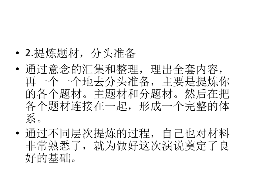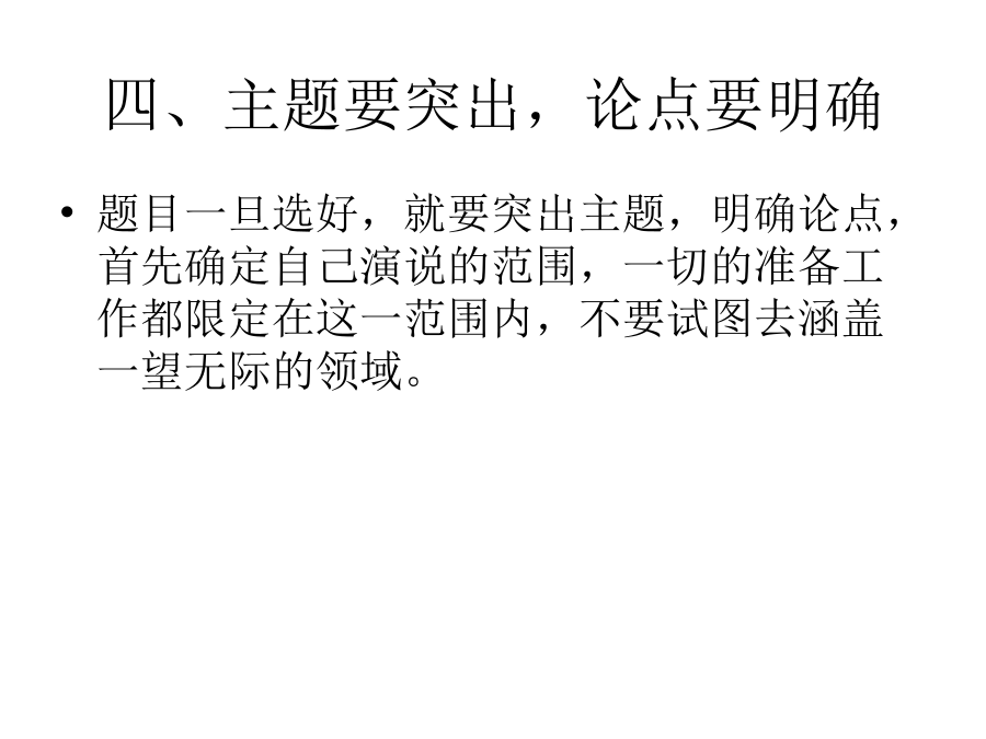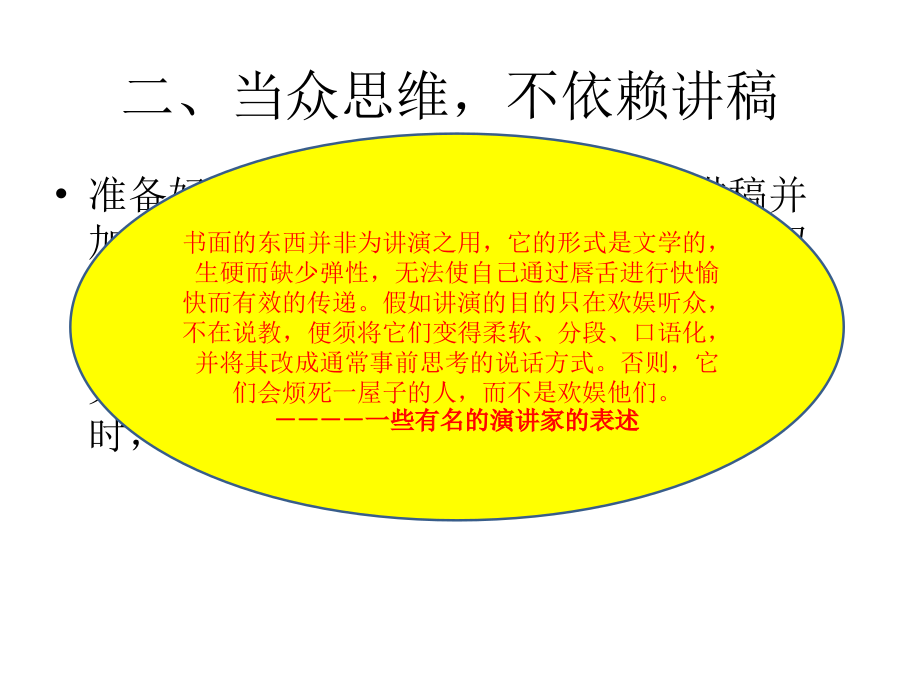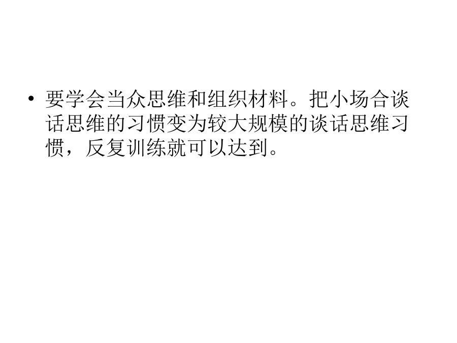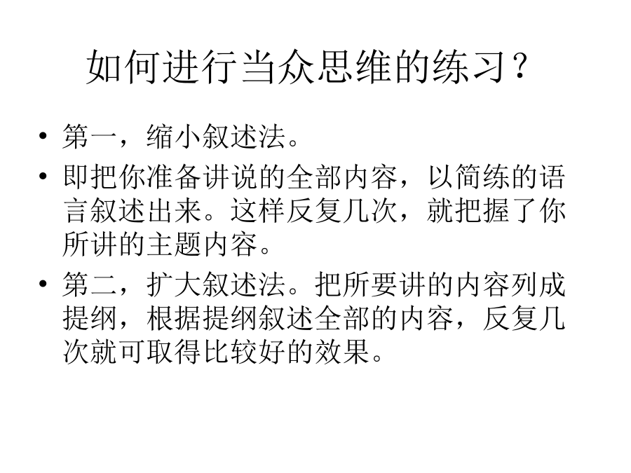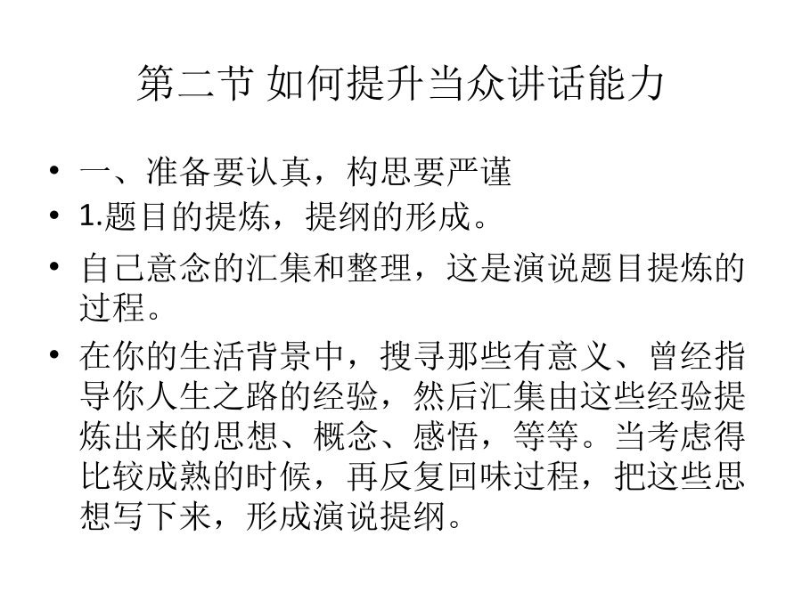 第十章公共场合沟通第一节克服当众讲话恐惧的五大法则第二节如何提升当众讲话能力二、当众思维,不依赖讲稿如何进行当众思维的练习?三、实例要具体,语言要形象四、主题要突出,论点要明确五、丰富素材库,随用随调取六、千锤百炼,主题内涵融为一体七、以人为本,引起听众关注八、制造视觉效果,生动而有吸引力九、讲话充满激情,营造热烈气氛十、满足听众需要,讲听融为一体十一、即席讲话,练习站着思维第三节当众讲话的语言运用技巧二、当众讲话的肢体语言运用技巧第四节如何组织和主持会议二、怎样明确会议目标(二)如何使会议有序进行三、主持词四、会议决策技巧五、充分准备才能有效地参与一个会议六、会议记录
