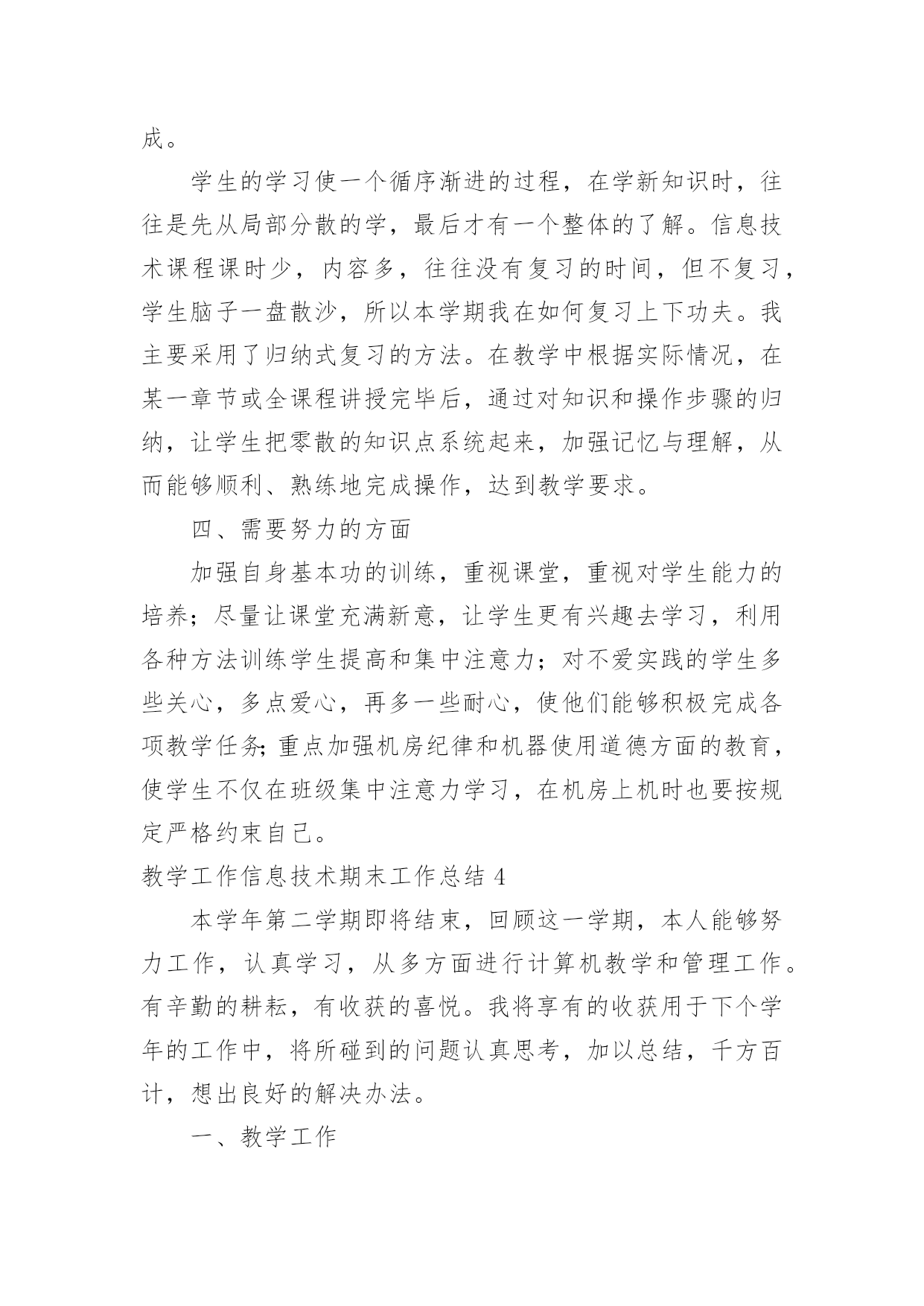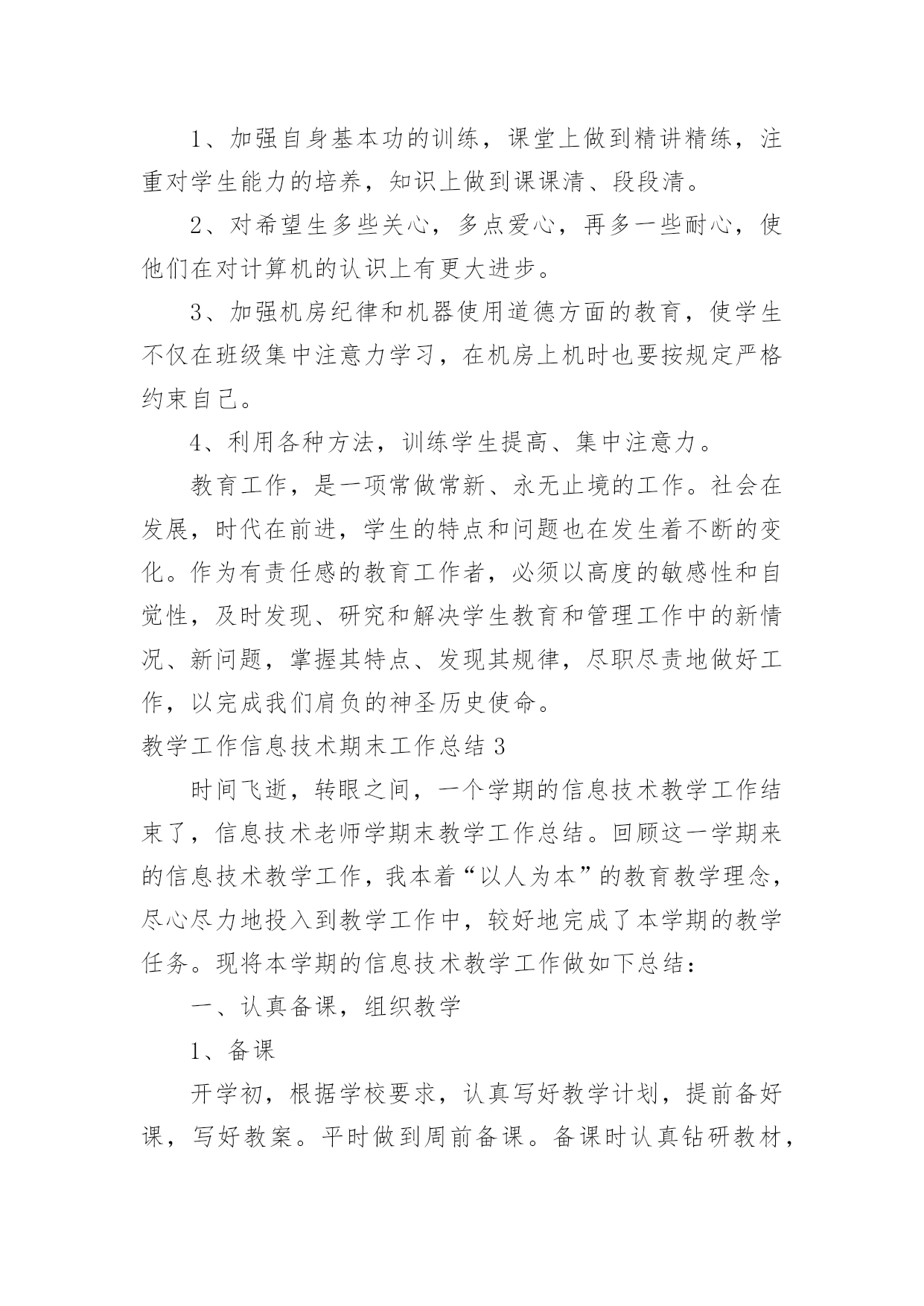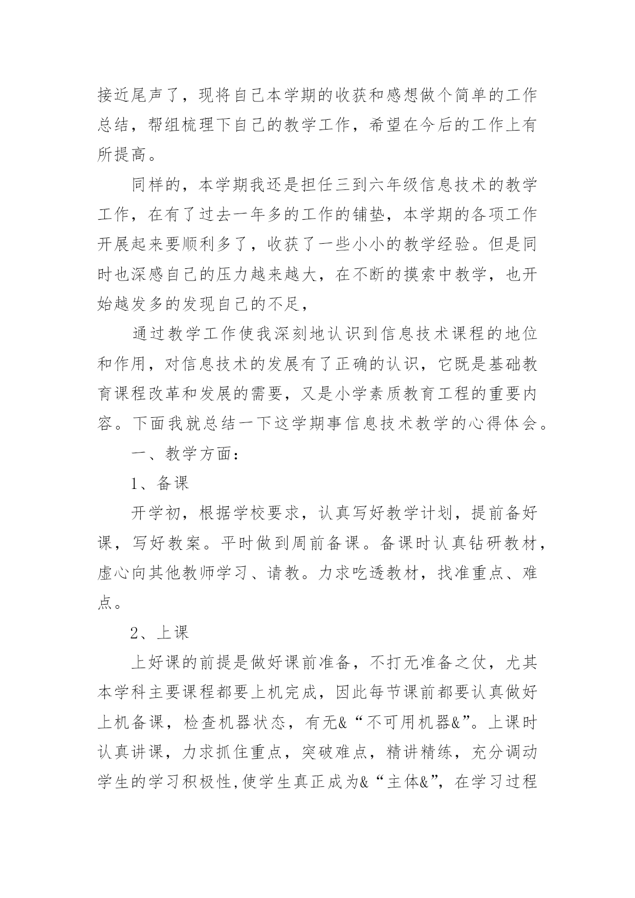 教学工作信息技术期末工作总结教学工作信息技术期末工作总结总结是对某一特定时间段内的学习和工作生活等表现情况加以回顾和分析的一种书面材料,它可以提升我们发现问题的能力,因此我们需要回头归纳,写一份总结了。那么你知道总结如何写吗?下面是小编为大家整理的教学工作信息技术期末工作总结,欢迎大家借鉴与参考,希望对大家有所帮助。教学工作信息技术期末工作总结1与其它必修课相比,信息技术课程的最大特点是一门集知识性和技能性于一体的基础性课程。课堂形式灵活,授课不易掌控。作为一名信息技术课的教师,最理想的教学境界就是让学生既有知识又有技能。回顾一年来的工作和学习,体会颇多,在学校领导关心、支持和鼓励下,在同事们的帮助,支持和积极配合下,我圆满地完成了预期的工作目标和任务,工作在忙碌中收获,我在收获中得到了成长,这一切都激励着我继续奋进。为让学生了解和掌握信息技术的基本知识和技能,提高学生科学文化素质结合我校实际教学需要及校领导下达的教学任务。现将我任信息技术教学工作和主控室日常工作做如下总结:1、边讲边练计算机学科是实践性非常强的学科,强调学生操作能力的`培养。如果在教学过程中教师只是讲授理论知识,而不给学生充分的练习时间,计算机教学就失去了它的意义;反之,教师不讲,只让学生盲目的上机练习,学习效率很难得以保证,并且很多中学生的心理比较脆弱,自学能力较差,面对一无所知的新知识茫然无措,上过一、两节这样满头雾水的课之后,就会失去对该课程的兴趣。所以一堂课我一般只安排10—15分钟进行讲解、示范,按照需要,该堂课的内容可以一次讲完,也可以分几次进行、讲完一个问题就让学生实践一下,等他们掌握以后再讲下一个知识点。这样每堂课讲授的知识学生们都能应用于实践并得到巩固,最后达到熟练掌握。2、精讲多练讲课内容根据学生的实际水平作出适当调整,力求精讲、少讲,仅把同学们普遍感到陌生的知识点及难点作为主要内容来讲,例如在讲到“超链接”时,我就把所以要涉及到这一操作的操作都提出来,这样可以节约很多时间又把握住了重点,让学生重视起来。把时间最大限度的放给学生去操作实习,实践证明,学生在操作时提出的问题远比讲理论时提出的问题要多得多,这说明操作实践有效地促进了学生作为学习主体积极主动的思考。3、分层次教学。目前,计算机在家庭中基本普及,大部分同学都用过,玩过计算机,只有少部分同学从来没碰过计算机,这样学生们有了一定的计算机使用基础,但仅限于游戏,娱乐等,而在应用计算机制作办公文档时,学生们的水平就不一样了,这样就给计算机教学带来很大的困难,有基础的学生吃不饱",很容易失去上课的兴趣;而后进生因"吃不了"常常会失去了信心。因此,在教学过程中,我试着进行分层次教学。中学计算机教学主要是让同学们认知计算机,培养同学们获取信息、处理信息的能力。在开始学习新一类内容时,先测试一下,基础薄弱的按教材学习,从易到难,逐步认识、使用计算机。对教材所要求的内容非常熟悉且操作熟练的同学,具备了一定的自学能力,我会加深他们的学习深度。另外,还对学生进行课外兴趣的培养,对有基础和潜力的学生可进行课本外知识的引导,比如:辅导他们学习电子报刊、电子绘画等。4、存在的问题:在教学中也发现存在不少的问题。首先是设备问题,部分机器老化,机器在使用过程中会无缘无故出现故障,不便管理,为教学带来一定的难度。其次部分学生常常趁老师不备自行将自己带来的软件安装和不正当开关电脑致使电脑时常出问题。今后,我将继续从思想上严格要求自己在行动上提高责任心,树立一切为学生的思想用自己的真诚之心培育人,继续努力,为一线的教学工作做好服务。我相信只要不断提高自身的道德素养刻苦提高业务水平一定能够成长为一名优秀的教育工作者。教学工作信息技术期末工作总结2信息技术教学工作总结转眼间,本学期的教学工作又将接近尾声了,现将自己本学期的收获和感想做个简单的工作总结,帮组梳理下自己的教学工作,希望在今后的工作上有所提高。同样的,本学期我还是担任三到六年级信息技术的教学工作,在有了过去一年多的工作的铺垫,本学期的各项工作开展起来要顺利多了,收获了一些小小的教学经验。但是同时也深感自己的压力越来越大,在不断的摸索中教学,也开始越发多的发现自己的不足,通过教学工作使我深刻地认识到信息技术课程的地位和作用,对信息技术的发展有了正确的认识,它既是基础教育课程改革和发展的需要,又是小学素质教育工程的重要内容。下面我就总结一下这学期事信息技术教学的心得体会。一、教学方面:1、备课开学初,根据学校要求,认真写好教学计划,提前备好课,写好教案。平时做到周前备课。备课时认真钻研教材,虚心向其他教师学习、请教。力求吃透教材,找准重点、难点。2、上课上好课的前提是做好课前准备,不打无准备之仗,尤其本学科主要课程都要上机完成,因此每节课前都要认真做好上机备课