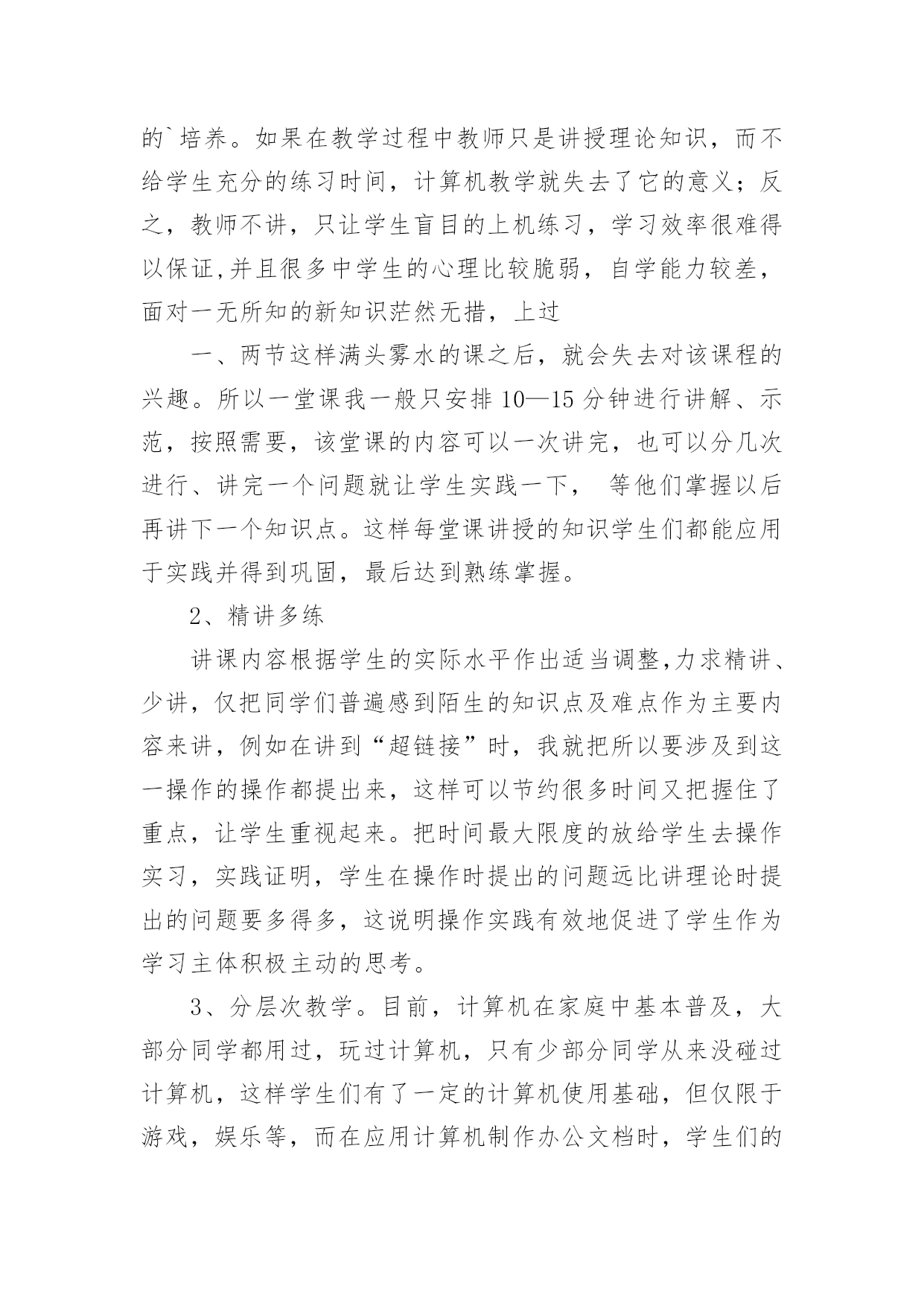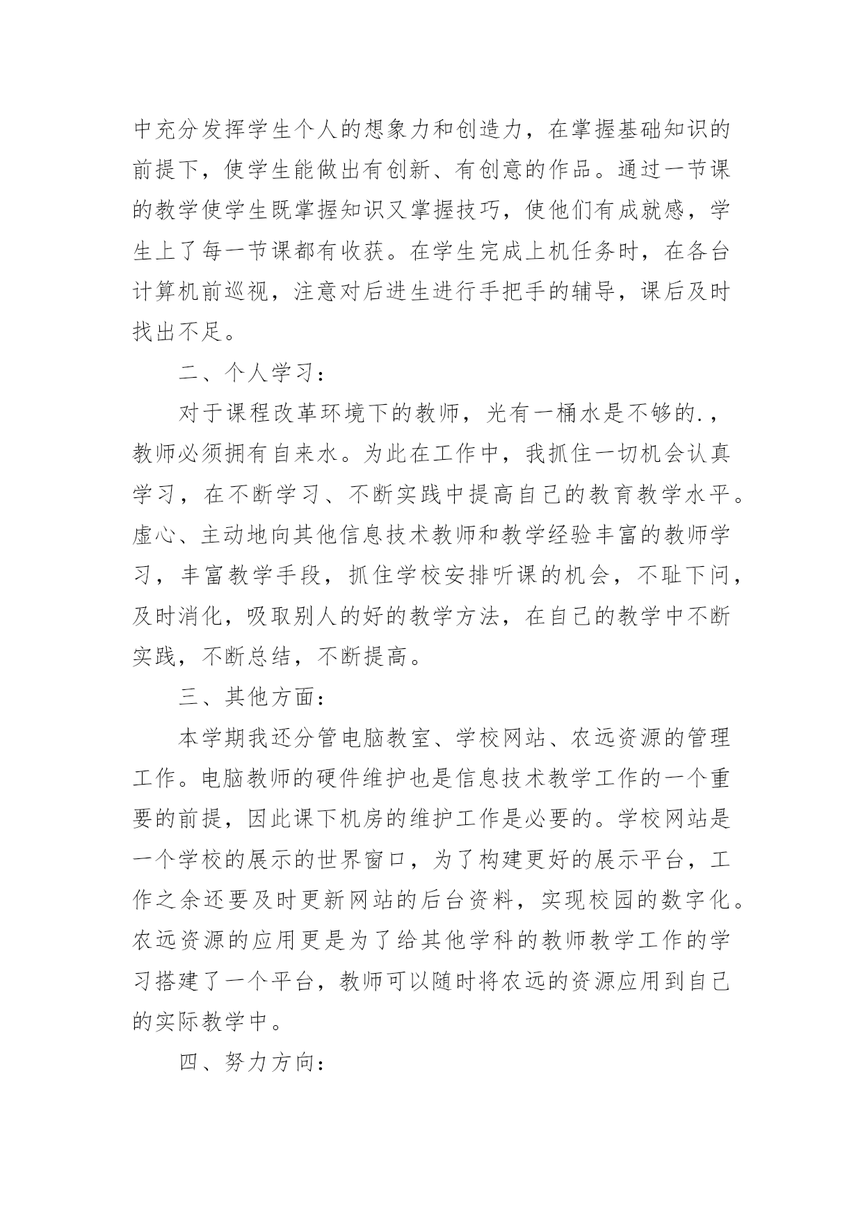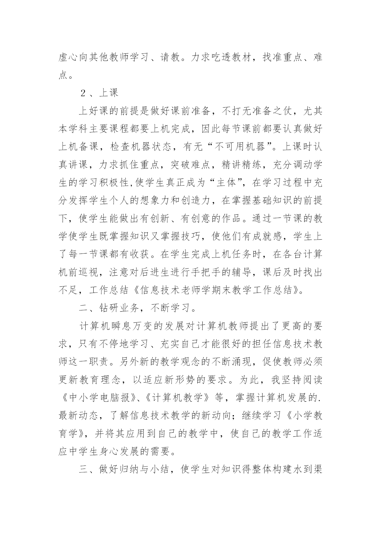 教学工作信息技术期末工作总结教学工作信息技术期末工作总结总结是对某一特定时间段内的学习和工作生活等表现情况加以回顾和分析的一种书面材料,它可以提升我们发现问题的能力,因此我们需要回头归纳,写一份总结了。那么你知道总结如何写吗?下面是小编为大家整理的教学工作信息技术期末工作总结,欢迎大家借鉴与参考,希望对大家有所帮助。教学工作信息技术期末工作总结1与其它必修课相比,信息技术课程的最大特点是一门集知识性和技能性于一体的基础性课程。课堂形式灵活,授课不易掌控。作为一名信息技术课的教师,最理想的教学境界就是让学生既有知识又有技能。回顾一年来的工作和学习,体会颇多,在学校领导关心、支持和鼓励下,在同事们的帮助,支持和积极配合下,我圆满地完成了预期的工作目标和任务,工作在忙碌中收获,我在收获中得到了成长,这一切都激励着我继续奋进。为让学生了解和掌握信息技术的基本知识和技能,提高学生科学文化素质结合我校实际教学需要及校领导下达的教学任务。现将我任信息技术教学工作和主控室日常工作做如下总结:1、边讲边练计算机学科是实践性非常强的学科,强调学生操作能力的`培养。如果在教学过程中教师只是讲授理论知识,而不给学生充分的练习时间,计算机教学就失去了它的意义;反之,教师不讲,只让学生盲目的上机练习,学习效率很难得以保证,并且很多中学生的心理比较脆弱,自学能力较差,面对一无所知的新知识茫然无措,上过一、两节这样满头雾水的课之后,就会失去对该课程的兴趣。所以一堂课我一般只安排10—15分钟进行讲解、示范,按照需要,该堂课的内容可以一次讲完,也可以分几次进行、讲完一个问题就让学生实践一下,等他们掌握以后再讲下一个知识点。这样每堂课讲授的知识学生们都能应用于实践并得到巩固,最后达到熟练掌握。2、精讲多练讲课内容根据学生的实际水平作出适当调整,力求精讲、少讲,仅把同学们普遍感到陌生的知识点及难点作为主要内容来讲,例如在讲到“超链接”时,我就把所以要涉及到这一操作的操作都提出来,这样可以节约很多时间又把握住了重点,让学生重视起来。把时间最大限度的放给学生去操作实习,实践证明,学生在操作时提出的问题远比讲理论时提出的问题要多得多,这说明操作实践有效地促进了学生作为学习主体积极主动的思考。3、分层次教学。目前,计算机在家庭中基本普及,大部分同学都用过,玩过计算机,只有少部分同学从来没碰过计算机,这样学生们有了一定的计算机使用基础,但仅限于游戏,娱乐等,而在应用计算机制作办公文档时,学生们的水平就不一样了,这样就给计算机教学带来很大的困难,有基础的学生吃不饱",很容易失去上课的兴趣;而后进生因"吃不了"常常会失去了信心。因此,在教学过程中,我试着进行分层次教学。中学计算机教学主要是让同学们认知计算机,培养同学们获取信息、处理信息的能力。在开始学习新一类内容时,先测试一下,基础薄弱的按教材学习,从易到难,逐步认识、使用计算机。对教材所要求的内容非常熟悉且操作熟练的同学,具备了一定的自学能力,我会加深他们的学习深度。另外,还对学生进行课外兴趣的培养,对有基础和潜力的学生可进行课本外知识的引导,比如:辅导他们学习电子报刊、电子绘画等。4、存在的问题:在教学中也发现存在不少的问题。首先是设备问题,部分机器老化,机器在使用过程中会无缘无故出现故障,不便管理,为教学带来一定的难度。其次部分学生常常趁老师不备自行将自己带来的软件安装和不正当开关电脑致使电脑时常出问题。今后,我将继续从思想上严格要求自己在行动上提高责任心,树立一切为学生的思想用自己的真诚之心培育人,继续努力,为一线的教学工作做好服务。我相信只要不断提高自身的道德素养刻苦提高业务水平一定能够成长为一名优秀的教育工作者。教学工作信息技术期末工作总结2信息技术教学工作总结转眼间,本学期的教学工作又将接近尾声了,现将自己本学期的收获和感想做个简单的工作总结,帮组梳理下自己的教学工作,希望在今后的工作上有所提高。同样的,本学期我还是担任三到六年级信息技术的教学工作,在有了过去一年多的工作的铺垫,本学期的各项工作开展起来要顺利多了,收获了一些小小的教学经验。但是同时也深感自己的压力越来越大,在不断的摸索中教学,也开始越发多的发现自己的不足,通过教学工作使我深刻地认识到信息技术课程的地位和作用,对信息技术的发展有了正确的认识,它既是基础教育课程改革和发展的需要,又是小学素质教育工程的重要内容。下面我就总结一下这学期事信息技术教学的心得体会。一、教学方面:1、备课开学初,根据学校要求,认真写好教学计划,提前备好课,写好教案。平时做到周前备课。备课时认真钻研教材,虚心向其他教师学习、请教。力求吃透教材,找准重点、难点。2、上课上好课的前提是做好课前准备,不打无准备之仗,尤其本学科主要课程都要上机完成,因此每节课前都要认真做好上机备课