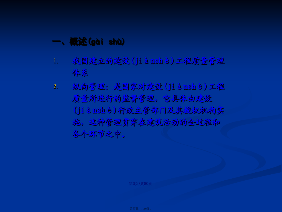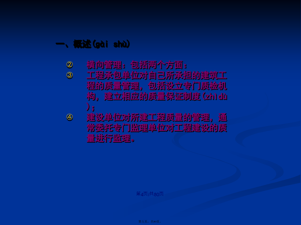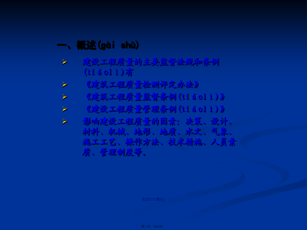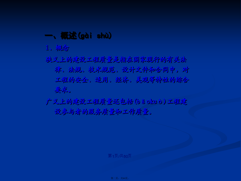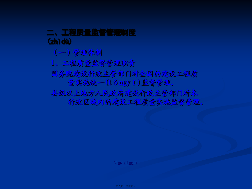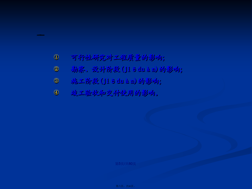 会计学1、概念狭义上的建设工程质量是指在国家现行的有关法律、法规、技术规范、设计文件和合同中,对工程的安全、适用、经济、美观等特性的综合要求。广义上的建设工程质量还包括(bāokuò)工程建设参与者的服务质量和工作质量。建设工程质量的主要监督法规和条例(tiáolì)有《建筑工程质量检测评定办法》《建筑工程质量监督条例(tiáolì)》《建设工程质量管理条例(tiáolì)》影响建设工程质量的因素:决策、设计、材料、机械、地形、地质、水文、气象、施工工艺、操作方法、技术措施、人员素质、管理制度等。我国建立的建设(jiànshè)工程质量管理体系纵向管理:是国家对建设(jiànshè)工程质量所进行的监督管理,它具体由建设(jiànshè)行政主管部门及其授权机构实施,这种管理贯穿在建筑活动的全过程和各个环节之中。横向管理:包括两个方面:工程承包单位对自己所承担的建筑工程的质量管理,包括设立专门质检机构,建立相应的质量保证制度(zhìdù);建设单位对所建工程质量的管理,通常委托专门监理单位对工程建设的质量进行监理。可行性研究对工程质量的影响;勘察、设计阶段(jiēduàn)的影响;施工阶段(jiēduàn)的影响;竣工验收和交付使用的影响。凡在中华人民共和国境内从事建设工程的新建、扩建、改建等有关活动及实施(shíshī)对建设工程质量监督管理的,必须遵守《建设工程质量管理条例》建设工程:是指土木工程、建筑工程、线路管道和设备安装工程及装修工程建设单位、勘察单位、设计(shèjì)单位、施工单位、工程监理单位依法对建设工程质量负责。(一)管理体制1、工程质量监督管理职责国务院建设行政主管部门对全国的建设工程质量实施统一(tǒngyī)监督管理。县级以上地方人民政府建设行政主管部门对本行政区域内的建设工程质量实施监督管理。国务院发展计划部门按照国务院规定的职责,组织稽察特派员,对国家(guójiā)出资的重大建设项目实施监督检查。国务院经济贸易主管部门按照国务院规定的职责,对国家(guójiā)重大技术改造项目实施监督检查。要求被检查的单位提供(tígōng)有关工程质量的文件和资料;进入被检查单位的施工现场进行检查;发现有影响工程质量的问题时,责令其改正。建设工程质量(zhìliàng)监督机构:是指建设行政主管部门或其他有关部门考核,具有法人独立资格的单位。它受政府建设行政主管部门或有关专业部门的委托,对建设工程质量(zhìliàng)具体实施监督管理,并对委托的政府有关部门负责。建设工程质量(zhìliàng)监督管理,可以由建设行政主管部门或者其他有关部门委托的建设工程质量(zhìliàng)监督机构(质监站)具体实施。房屋建筑工程和市政基础设施工程竣工验收备案管理暂行办法建设部,2000.4、《质量条例》建设单位应当(yīngdāng)自建设工程竣工验收合格之日起15日内进行备案(1)工程竣工验收备案表;(2)工程竣工验收报告:①工程报建日期;②施工许可证号;③施工图设计文件审查(shěnchá)意见;④勘察、设计、施工(shīgōng)、监理等单位分别签署的质量合格文件及验收人员签署的竣工验收原始文件;⑤市政基础设施的有关质量检测和功能性试验资料;⑥备案机关需要的其他资料;(3)法律、法规规定应当由规划、公安消防、环保等部门出具的认可文件或者准许使用文件;(4)施工单位签署的工程质量保修书;(5)法规、规章规定必须提供的其他文件;(6)商品住宅(zhùzhái)应提交《住宅(zhùzhái)质量保证书》和《住宅(zhùzhái)使用说明书》。(1)工程竣工验收合格15日内未办理竣工验收备案;(2)在重新(chóngxīn)组织竣工验收前擅自使用工程;(3)采用虚假证明文件办理竣工备案。建设(jiànshè)单位应当将工程发包给具有相应资质等级的单位,不得肢解发包;建设(jiànshè)单位应当依法对工程建设(jiànshè)项目的勘察、设计、施工、监理以及与工程建设(jiànshè)有关的重要设备、材料等的采购进行招标;建设单位不得(bude)对承包单位的建设活动进行不合理干预:建设单位不得(bude)迫使承包方以低于成本的价格竞标,不得(bude)任意压缩工期;建设单位不得(bude)明示或暗示设计、施工单位违反工程建设强制性标准;建设单位不得(bude)明示或暗示施工单位使用不合格的建筑材料、建筑构配件和设备。施工图设计文件未经审查批准的,不得使用;必须监理的工程,建设单位应当委托监理;开工前应办理工程质量监督手续,否则不发施工许可证,不得开工;涉及建筑(jiànzhù)主体和承重结构变动的装修工程,建设单位要有设计方案建设工程验收合