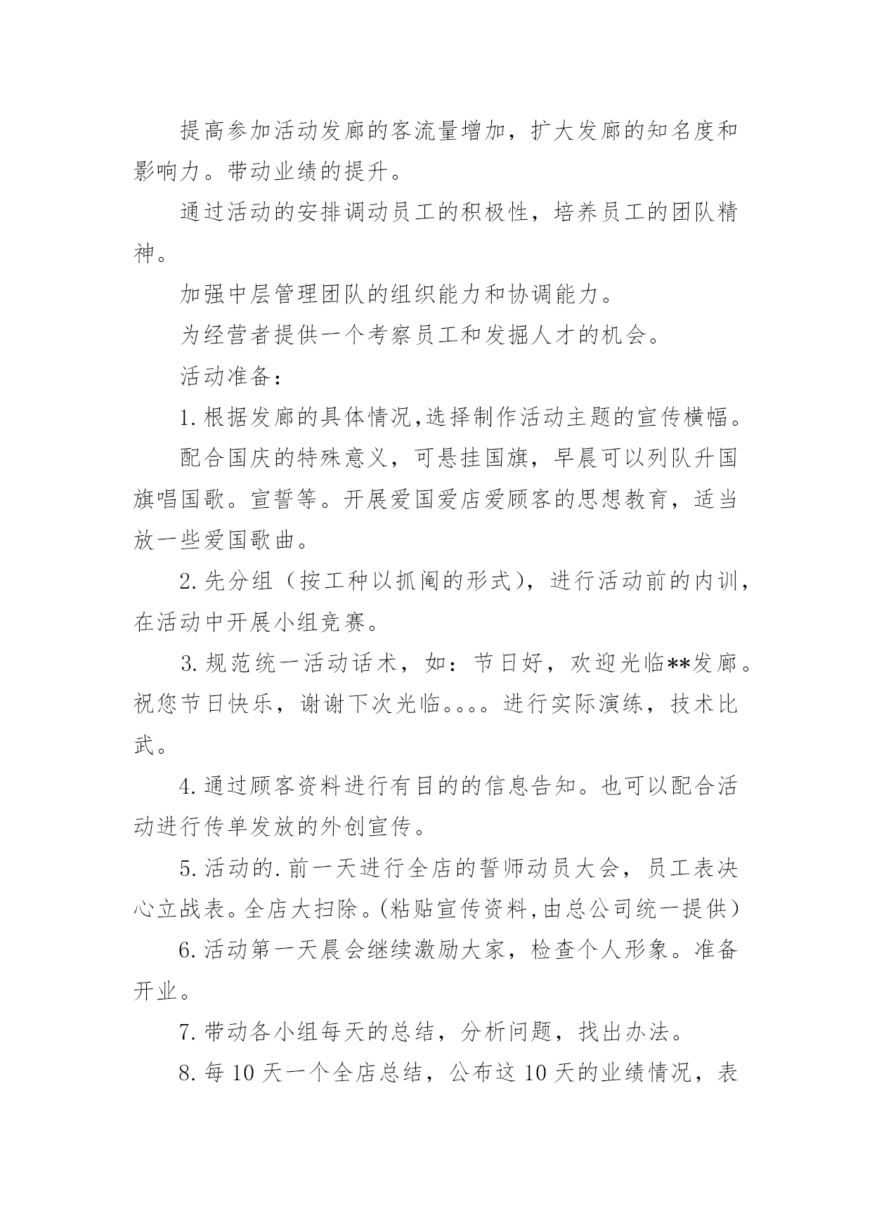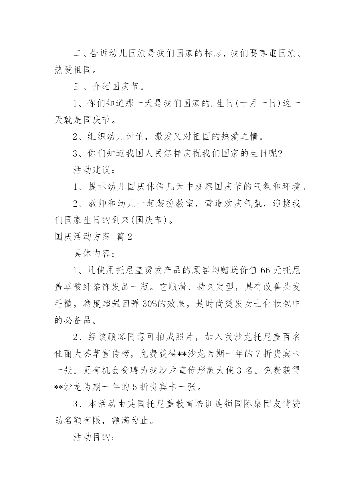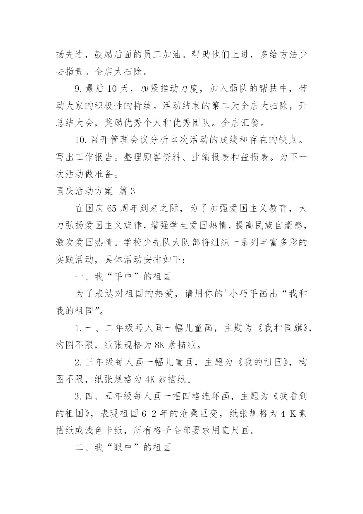 国庆活动方案【精品】国庆活动方案模板汇总4篇为保障事情或工作顺利开展,就常常需要事先准备方案,方案是综合考量事情或问题相关的因素后所制定的书面计划。那么你有了解过方案吗?以下是小编收集整理的国庆活动方案5篇,欢迎阅读与收藏。国庆活动方案篇1活动名称:迎国庆节活动活动目标:1、让幼儿认识我国的国旗,知道十月一日是我们国家的生日——国庆节。2、是幼儿懂得尊重国旗,激发幼儿热爱祖国的情感。活动准备:国旗一面,图片活动过程:一、认识国旗。1、出示国旗,组织幼儿讨论。我国国旗是什么颜色的?有几颗大五角星?有几颗大小角星?2、让幼儿谈谈在那些地方见过国旗,在什么场合看到过升国旗活动。3、自己有没参加过升旗仪式,在什么地方,什么时候,升旗时我们小朋友应该行什么礼?二、告诉幼儿国旗是我们国家的标志,我们要尊重国旗、热爱祖国。三、介绍国庆节。1、你们知道那一天是我们国家的.生日(十月一日)这一天就是国庆节。2、组织幼儿讨论,激发又对祖国的热爱之情。3、你们知道我国人民怎样庆祝我们国家的生日呢?活动建议:1、提示幼儿国庆休假几天中观察国庆节的气氛和环境。2、教师和幼儿一起装扮教室,营造欢庆气氛,迎接我们国家生日的到来(国庆节)。国庆活动方案篇2具体内容:1、凡使用托尼盖烫发产品的顾客均赠送价值66元托尼盖草酸纤柔饰发品一瓶。它顺滑、持久定型,具有改善头发毛糙,卷度超强回弹30%的效果,是时尚烫发女士化妆包中的必备品。2、经该顾客同意可拍成照片,加入我沙龙托尼盖百名佳丽大荟萃宣传榜,免费获得**沙龙为期一年的7折贵宾卡一张。更有机会受聘为我沙龙宣传形象大使3名。免费获得**沙龙为期一年的5折贵宾卡一张。3、本活动由英国托尼盖教育培训连锁国际集团友情赞助名额有限,额满为止。活动目的:提高参加活动发廊的客流量增加,扩大发廊的知名度和影响力。带动业绩的提升。通过活动的安排调动员工的积极性,培养员工的团队精神。加强中层管理团队的组织能力和协调能力。为经营者提供一个考察员工和发掘人才的机会。活动准备:1.根据发廊的具体情况,选择制作活动主题的宣传横幅。配合国庆的特殊意义,可悬挂国旗,早晨可以列队升国旗唱国歌。宣誓等。开展爱国爱店爱顾客的思想教育,适当放一些爱国歌曲。2.先分组(按工种以抓阄的形式),进行活动前的内训,在活动中开展小组竞赛。3.规范统一活动话术,如:节日好,欢迎光临**发廊。祝您节日快乐,谢谢下次光临。。。。进行实际演练,技术比武。4.通过顾客资料进行有目的的信息告知。也可以配合活动进行传单发放的外创宣传。5.活动的.前一天进行全店的誓师动员大会,员工表决心立战表。全店大扫除。(粘贴宣传资料,由总公司统一提供)6.活动第一天晨会继续激励大家,检查个人形象。准备开业。7.带动各小组每天的总结,分析问题,找出办法。8.每10天一个全店总结,公布这10天的业绩情况,表扬先进,鼓励后面的员工加油。帮助他们上进,多给方法少去指责。全店大扫除。9.最后10天,加紧推动力度,加入弱队的帮扶中,带动大家的积极性的持续。活动结束的第二天全店大扫除,开总结大会,奖励优秀个人和优秀团队。全店汇餐。10.召开管理会议分析本次活动的成绩和存在的缺点。写出工作报告。整理顾客资料、业绩报表和益损表。为下一次活动做准备。国庆活动方案篇3在国庆65周年到来之际,为了加强爱国主义教育,大力弘扬爱国主义旋律,增强学生爱国热情,提高民族自豪感,激发爱国热情。学校少先队大队部将组织一系列丰富多彩的实践活动,具体活动安排如下:一、我“手中”的祖国为了表达对祖国的热爱,请用你的'小巧手画出“我和我的祖国”。1.一、二年级每人画一幅儿童画,主题为《我和国旗》,构图不限,纸张规格为8K素描纸。2.三年级每人画一幅儿童画,主题为《我的祖国》,构图不限,纸张规格为4K素描纸。3.四、五年级每人画一幅四格连环画,主题为《我看到的祖国》,表现祖国62年的沧桑巨变,纸张规格为4K素描纸或浅色卡纸,所有格子全部要求用直尺画。二、我“眼中”的祖国用相机记录你所到过的地方,感受祖国的秀美与壮丽,征集优秀摄影作品,每位学生上报一幅优秀摄影作品,发至少先队邮箱zm参与评比,要求作品注明作者的姓名、班级、年龄,以及对作品的介绍(50字以内)。三、我“心中”的祖国祖国的沧桑巨变我们已经感受到了,那就让我们用美丽的语言表达出对祖国的祝福吧!1.一、二年级征文150字。2.三年级征文400字。3.四五年级征文600字。以上所有作品请于开学后上交少先队,各中队的儿童画作品和连环画作品择优上报5幅参与评比,征文5篇发少先队邮箱,摄影作品尽可能每人一幅!国庆活动方案篇4一、活动背景:1、xx电器有限公司成立19周年,为更好的证明了xx的实力,传达xx的经营理念,提升企业品牌形象,开展全方位的推广活动势在必行。2、直接竞争对