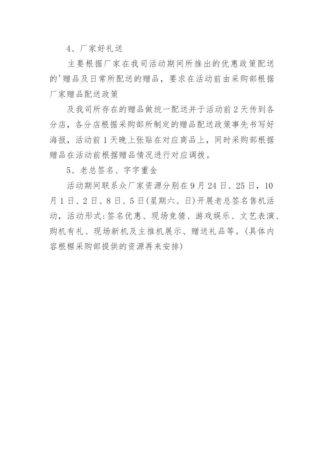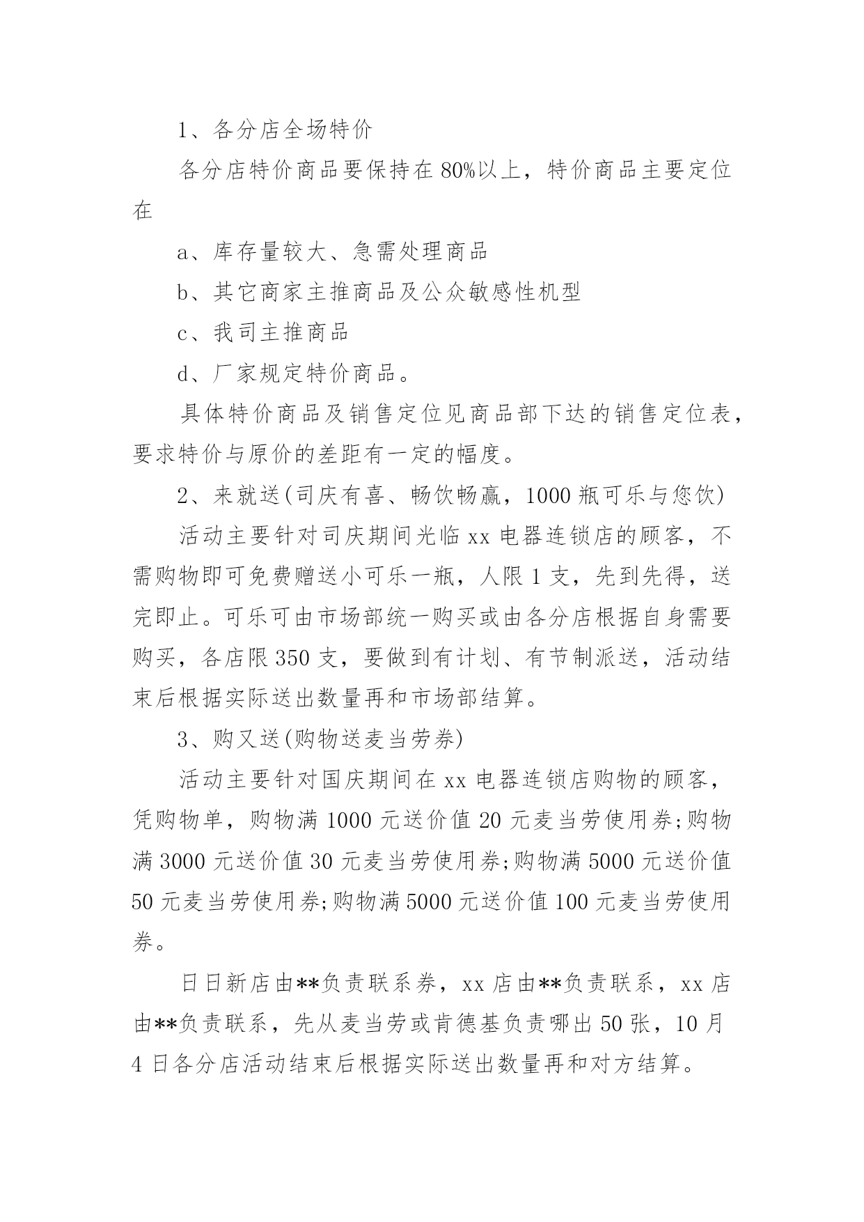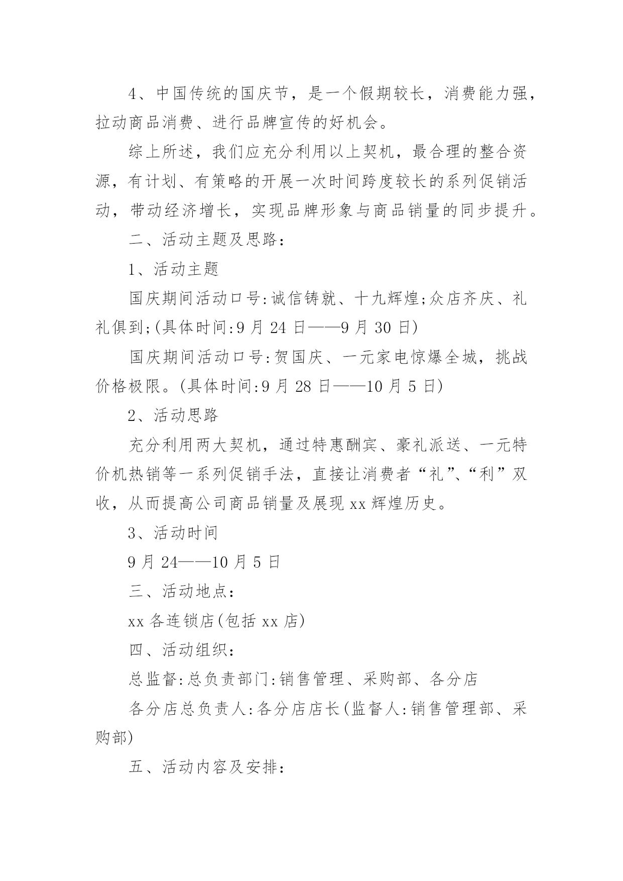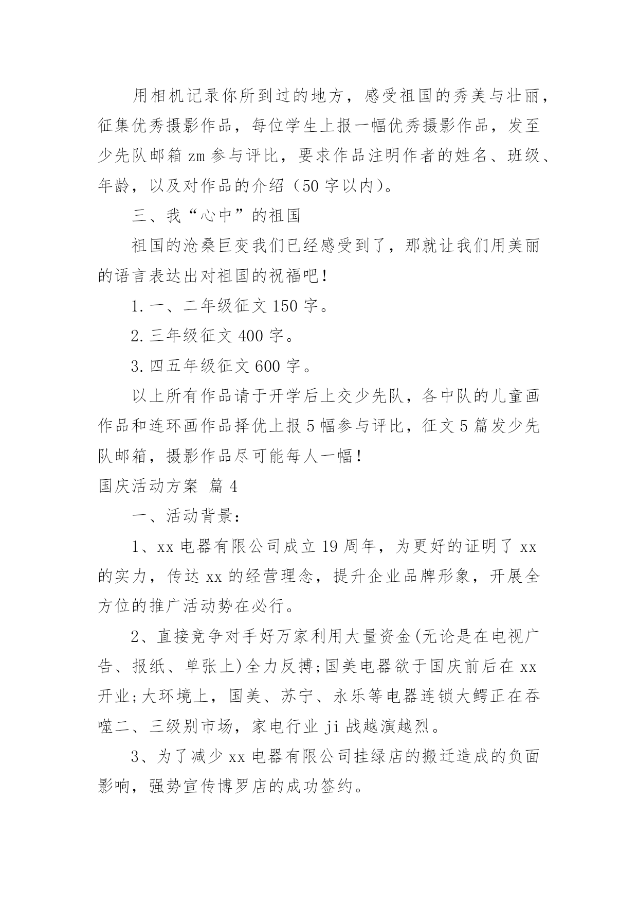 国庆活动方案【精品】国庆活动方案模板汇总4篇为保障事情或工作顺利开展,就常常需要事先准备方案,方案是综合考量事情或问题相关的因素后所制定的书面计划。那么你有了解过方案吗?以下是小编收集整理的国庆活动方案5篇,欢迎阅读与收藏。国庆活动方案篇1活动名称:迎国庆节活动活动目标:1、让幼儿认识我国的国旗,知道十月一日是我们国家的生日——国庆节。2、是幼儿懂得尊重国旗,激发幼儿热爱祖国的情感。活动准备:国旗一面,图片活动过程:一、认识国旗。1、出示国旗,组织幼儿讨论。我国国旗是什么颜色的?有几颗大五角星?有几颗大小角星?2、让幼儿谈谈在那些地方见过国旗,在什么场合看到过升国旗活动。3、自己有没参加过升旗仪式,在什么地方,什么时候,升旗时我们小朋友应该行什么礼?二、告诉幼儿国旗是我们国家的标志,我们要尊重国旗、热爱祖国。三、介绍国庆节。1、你们知道那一天是我们国家的.生日(十月一日)这一天就是国庆节。2、组织幼儿讨论,激发又对祖国的热爱之情。3、你们知道我国人民怎样庆祝我们国家的生日呢?活动建议:1、提示幼儿国庆休假几天中观察国庆节的气氛和环境。2、教师和幼儿一起装扮教室,营造欢庆气氛,迎接我们国家生日的到来(国庆节)。国庆活动方案篇2具体内容:1、凡使用托尼盖烫发产品的顾客均赠送价值66元托尼盖草酸纤柔饰发品一瓶。它顺滑、持久定型,具有改善头发毛糙,卷度超强回弹30%的效果,是时尚烫发女士化妆包中的必备品。2、经该顾客同意可拍成照片,加入我沙龙托尼盖百名佳丽大荟萃宣传榜,免费获得**沙龙为期一年的7折贵宾卡一张。更有机会受聘为我沙龙宣传形象大使3名。免费获得**沙龙为期一年的5折贵宾卡一张。3、本活动由英国托尼盖教育培训连锁国际集团友情赞助名额有限,额满为止。活动目的:提高参加活动发廊的客流量增加,扩大发廊的知名度和影响力。带动业绩的提升。通过活动的安排调动员工的积极性,培养员工的团队精神。加强中层管理团队的组织能力和协调能力。为经营者提供一个考察员工和发掘人才的机会。活动准备:1.根据发廊的具体情况,选择制作活动主题的宣传横幅。配合国庆的特殊意义,可悬挂国旗,早晨可以列队升国旗唱国歌。宣誓等。开展爱国爱店爱顾客的思想教育,适当放一些爱国歌曲。2.先分组(按工种以抓阄的形式),进行活动前的内训,在活动中开展小组竞赛。3.规范统一活动话术,如:节日好,欢迎光临**发廊。祝您节日快乐,谢谢下次光临。。。。进行实际演练,技术比武。4.通过顾客资料进行有目的的信息告知。也可以配合活动进行传单发放的外创宣传。5.活动的.前一天进行全店的誓师动员大会,员工表决心立战表。全店大扫除。(粘贴宣传资料,由总公司统一提供)6.活动第一天晨会继续激励大家,检查个人形象。准备开业。7.带动各小组每天的总结,分析问题,找出办法。8.每10天一个全店总结,公布这10天的业绩情况,表扬先进,鼓励后面的员工加油。帮助他们上进,多给方法少去指责。全店大扫除。9.最后10天,加紧推动力度,加入弱队的帮扶中,带动大家的积极性的持续。活动结束的第二天全店大扫除,开总结大会,奖励优秀个人和优秀团队。全店汇餐。10.召开管理会议分析本次活动的成绩和存在的缺点。写出工作报告。整理顾客资料、业绩报表和益损表。为下一次活动做准备。国庆活动方案篇3在国庆65周年到来之际,为了加强爱国主义教育,大力弘扬爱国主义旋律,增强学生爱国热情,提高民族自豪感,激发爱国热情。学校少先队大队部将组织一系列丰富多彩的实践活动,具体活动安排如下:一、我“手中”的祖国为了表达对祖国的热爱,请用你的'小巧手画出“我和我的祖国”。1.一、二年级每人画一幅儿童画,主题为《我和国旗》,构图不限,纸张规格为8K素描纸。2.三年级每人画一幅儿童画,主题为《我的祖国》,构图不限,纸张规格为4K素描纸。3.四、五年级每人画一幅四格连环画,主题为《我看到的祖国》,表现祖国62年的沧桑巨变,纸张规格为4K素描纸或浅色卡纸,所有格子全部要求用直尺画。二、我“眼中”的祖国用相机记录你所到过的地方,感受祖国的秀美与壮丽,征集优秀摄影作品,每位学生上报一幅优秀摄影作品,发至少先队邮箱zm参与评比,要求作品注明作者的姓名、班级、年龄,以及对作品的介绍(50字以内)。三、我“心中”的祖国祖国的沧桑巨变我们已经感受到了,那就让我们用美丽的语言表达出对祖国的祝福吧!1.一、二年级征文150字。2.三年级征文400字。3.四五年级征文600字。以上所有作品请于开学后上交少先队,各中队的儿童画作品和连环画作品择优上报5幅参与评比,征文5篇发少先队邮箱,摄影作品尽可能每人一幅!国庆活动方案篇4一、活动背景:1、xx电器有限公司成立19周年,为更好的证明了xx的实力,传达xx的经营理念,提升企业品牌形象,开展全方位的推广活动势在必行。2、直接竞争对