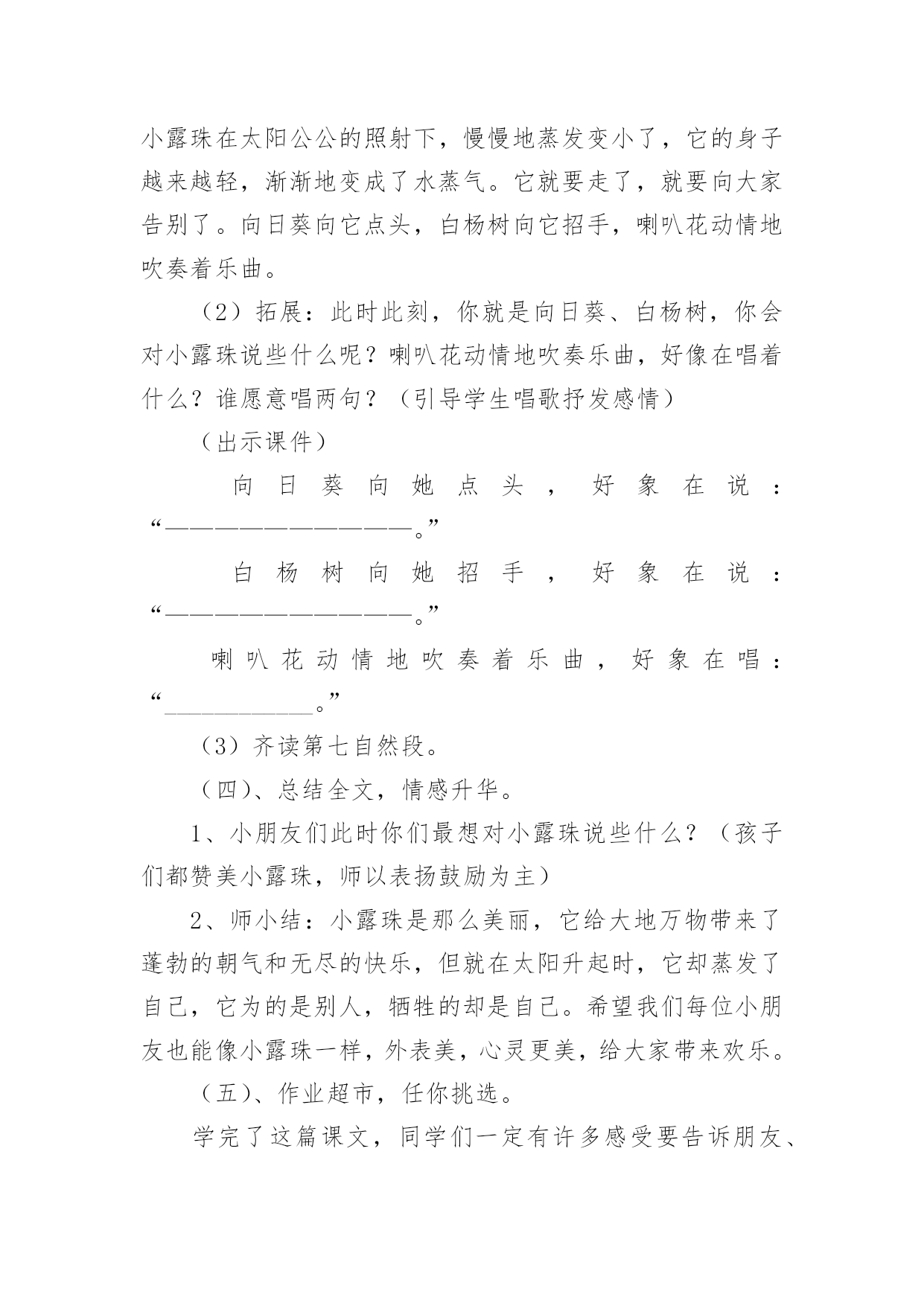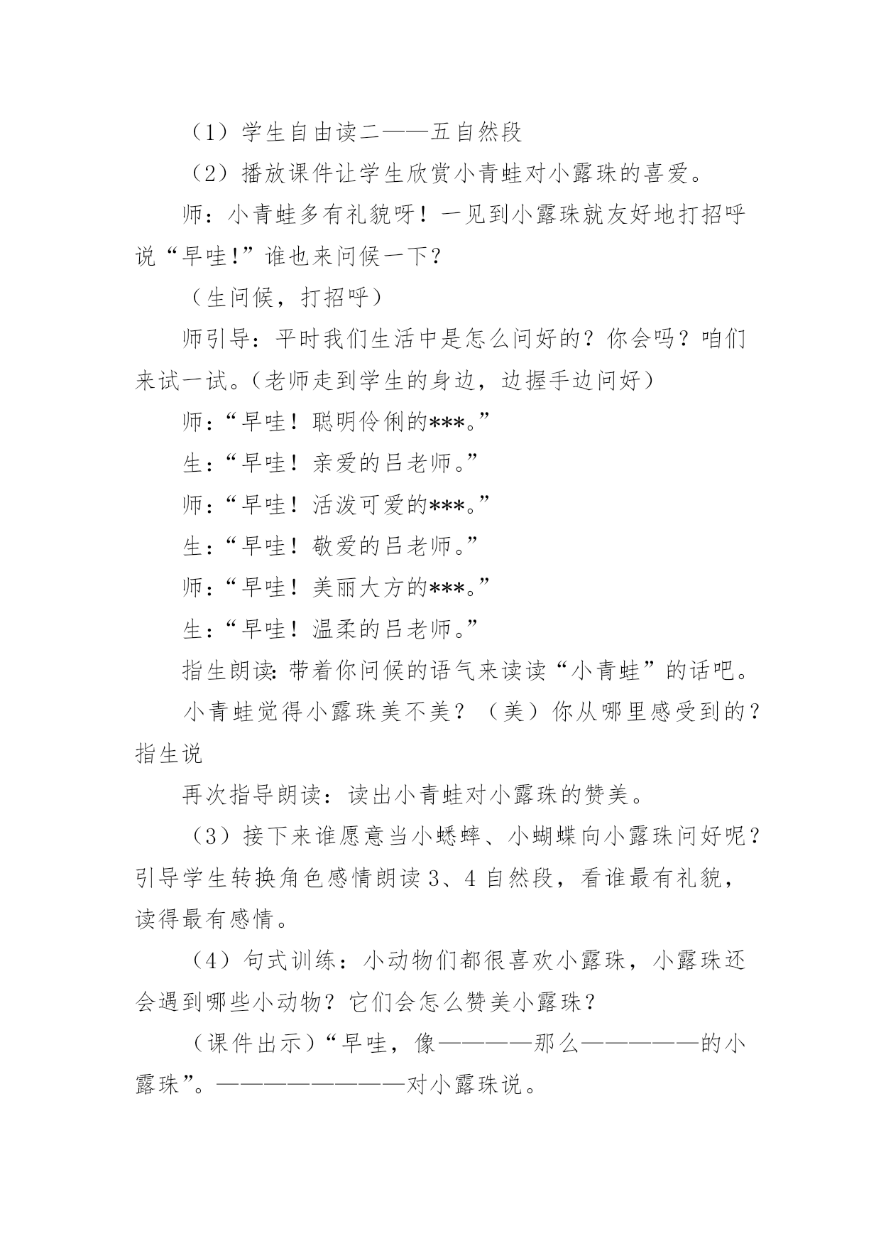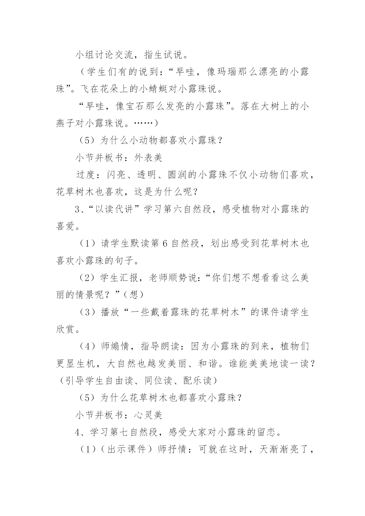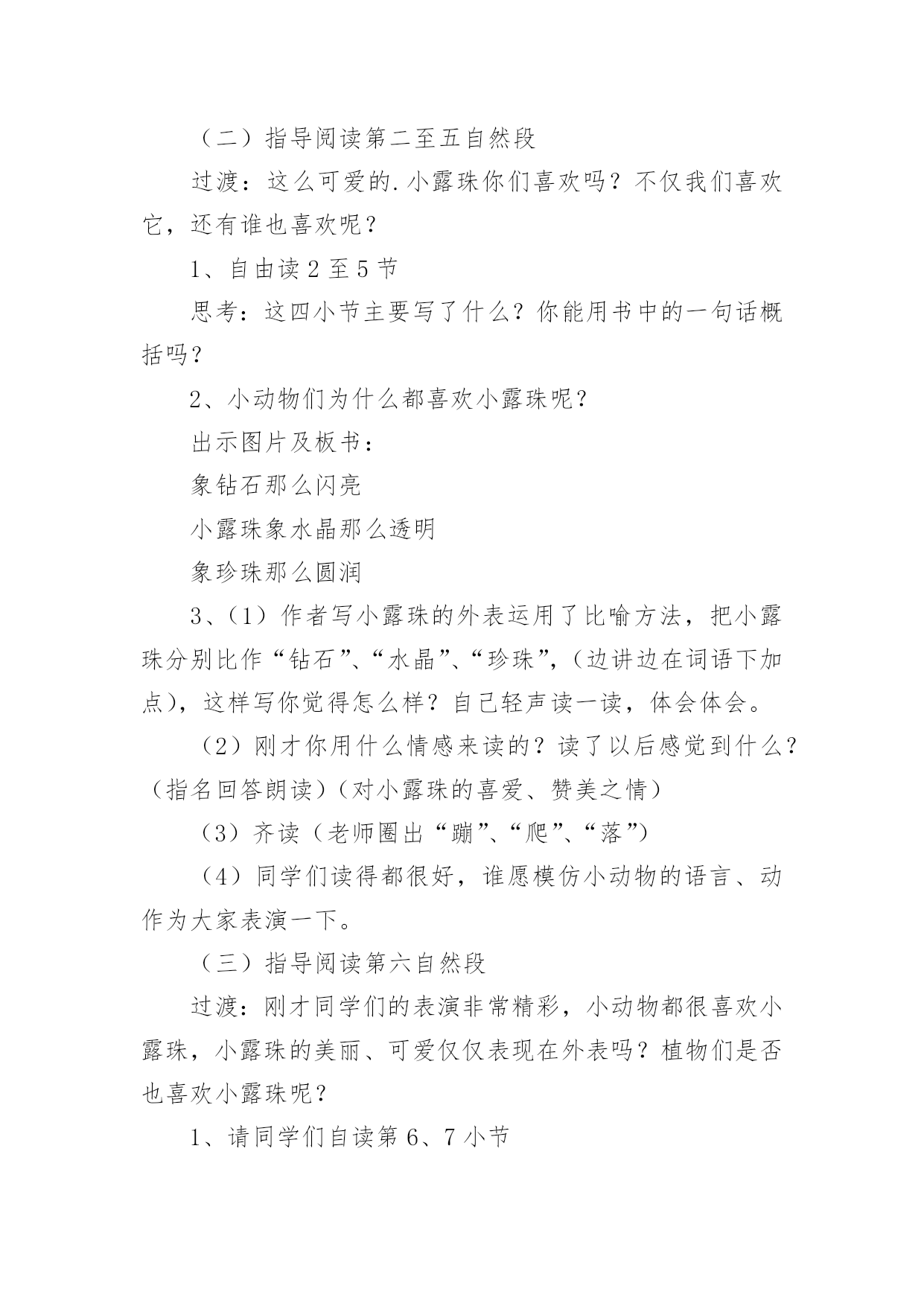 《小露珠》教学设计作为一名老师,时常需要用到教学设计,教学设计是一个系统化规划教学系统的过程。那么教学设计应该怎么写才合适呢?下面是小编精心整理的《小露珠》教学设计,希望能够帮助到大家。《小露珠》教学设计1一、教材解读:《小露珠》是苏教版语文第五册一篇优美的童话。写小露珠由形成到消失的过程,以及小动物和植物对小露珠的喜爱,赞扬了小露珠的美丽、可爱以及大自然的和谐、融洽。全文共七个自然段。第一自然段先交代小露珠诞生的时间及地点,小露珠就这样悄无声息、毫不张扬地来到了世上。第二至五自然段写小露珠受到小动物们的喜欢。小动物们见到小露珠纷纷和她打招呼,并且赞美她“像钻石那么闪亮”“像水晶那么透明”“像珍珠那么圆润”,归结起来,这些赞美称颂的是小露珠美丽的容颜和纯洁的品质,这也正是小动物们都喜欢小露珠的原因。第六自然段写小露珠装点了花草树木。小露珠不仅本身很美,而且还会用自己的美来装点别人,让植物们显得更精神更美丽。第七自然段写小露珠消失的过程,植物与她依依惜别。课文融科学知识、优美语言、思想启迪于一体,有利于潜移默化地培养学生的美好情操。语言准确、生动、形象,为丰富学生的语言积累提供了很好的凭借。二、教学目标:1、知识目标:(1)能正确、流利、有感情地朗读课文、背诵课文。(2)学会本课10个生字,理解由生字组成的词语。2、能力目标:(1)有感情地阅读课文,提高学生的感悟能力。(2)抓住重点句子品读,积累优美的语言。3、情感目标:凭借对课文的朗读感悟,知道小动物和植物都喜欢小露珠,感受大自然的和谐、融洽和美丽。三、教学重难点:重点:1、学会本课生字、理解由生字组成的词语。2、使学生通过朗读、背诵课文,感受课文的优美语言。难点:使学生从动物、植物对小露珠的态度中,感悟小露珠无私奉献、无怨无悔的品格。四、设计理念:《小露珠》是一篇极美的课文。翻开课本,细细读来,如一股清新的风扑面而来。我想,教学这篇课文最重要的一点就是:带孩子进入审美的天地!让我们的孩子感知美、感受美、为美感动,并进入审美佳境。因此教学时我主要采取创设情境、美读感悟的方法展开教学。五、教学准备:课件六、教学时间:2课时七、教学过程:这篇课文共安排了2课时,第一课时引导学生初读课文,了解主要内容,掌握生字新词;第二课时细读课文,理解课文内容,有感情地朗读课文,感受小露珠的可爱。我重点说一下第二课时的教学过程,它基本由以下环节组成:(1)创设情境,谈话导入。(2)播放动画,整体感知。(感受小露珠的可爱。)(3)细读课文,重点感悟。(感受小动物对小露珠的喜爱;感受植物对小露珠的喜爱;感受大家对小露珠的留恋。)(4)总结全文,情感升华。(5)作业超市,任你挑选。(一)创设情境,谈话导入。1、老师创设语言情境:同学们,语文是丰富多彩的,语言文字更会使浮想联翩。比如说,这个“雨”字,有人会联想到和风细雨的春天,有人会联想到狂风暴雨的夏日,还有人因雨而想到许多关于它的事情等等。那么一个“小”字(板书:小),你会联想到什么?(生:小狗、小孩、小时候、小东西……)师:这些事物,只要带上“小”字,就让人感觉特别亲切可爱,谁能亲切地读读它的名字?(板书:露珠)2、指生读题。3、这节课我们来继续学习第15课。过渡:夜深人静,万物都已入睡,小露珠却在这时神秘的出现了,你们想不想到大自然中找它们?(想)那现在就让我们走进夜幕,去寻找小露珠的踪迹吧!(二)、播放动画,整体感知。1、老师播放动画片《小露珠》。2、要求学生边看边想:你眼中的小露珠是什么样子的?(生汇报:小露珠是晶莹透亮的;小露珠非常漂亮……)3、师小节:夜晚的时候,花呀、草呀、石头了温度比空气低,当教热的空气碰到它们时,便会凝结成小水滴,就是我们所说的露水。过渡:现在就让我们到课文中去找一找那调皮的小露珠吧!(三)、细读课文,重点感悟。1、略读第一自然段。(1)指名读课文,其他同学思考:读了这段,你知道了什么?(生:夜晚,小露珠出现了,到了黎明变大了……)(2)理解词语:夜幕降临(3)指导朗读:小露珠爬呀、滚呀,多可爱多顽皮啊,谁愿意读一读?学生朗读过渡:清晨,小露珠遇见了三个好朋友:小青蛙、小蟋蟀和小蝴蝶,早起的'小动物看见了小露珠,都来向它问好。请大家自由读读二——五自然段,看看小动物眼中的小露珠是什么样子的?2、细读第二——五自然段,感受小动物对小露珠的喜爱。(1)学生自由读二——五自然段(2)播放课件让学生欣赏小青蛙对小露珠的喜爱。师:小青蛙多有礼貌呀!一见到小露珠就友好地打招呼说“早哇!”谁也来问候一下?(生问候,打招呼)师引导:平时我们生活中是怎么问好的?你会吗?咱们来试一试。(老师走到学生的身边,边握手边问好)师:“早哇!聪明伶俐的***。”生:“早哇!亲爱的吕老师。”师:“早哇!活泼可爱的***。”生:“早哇!敬爱的吕老