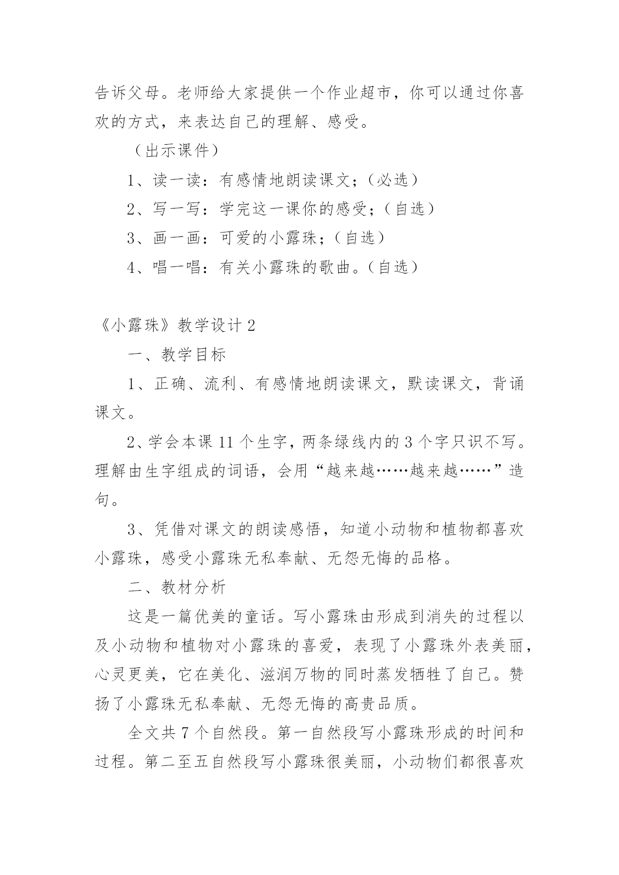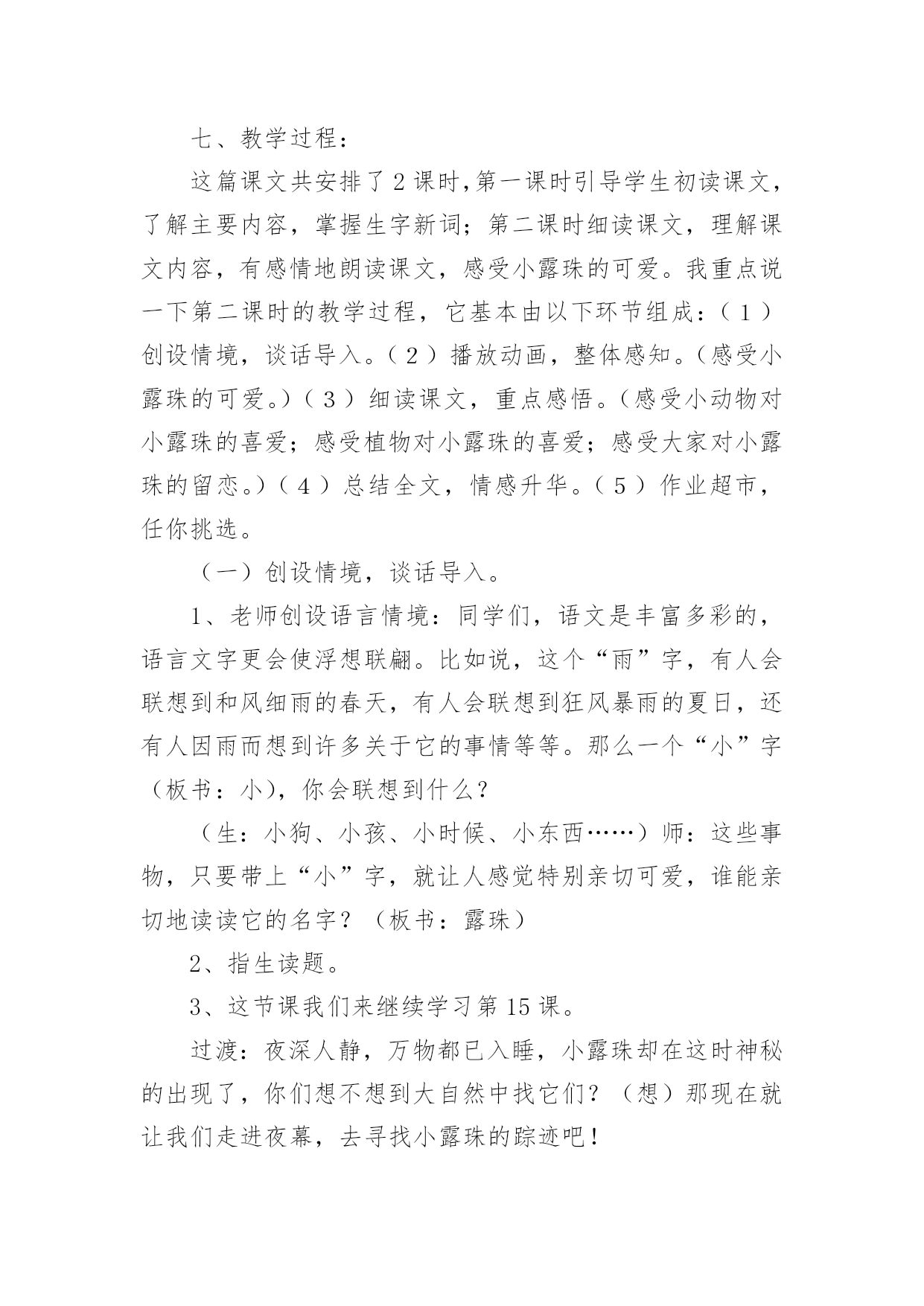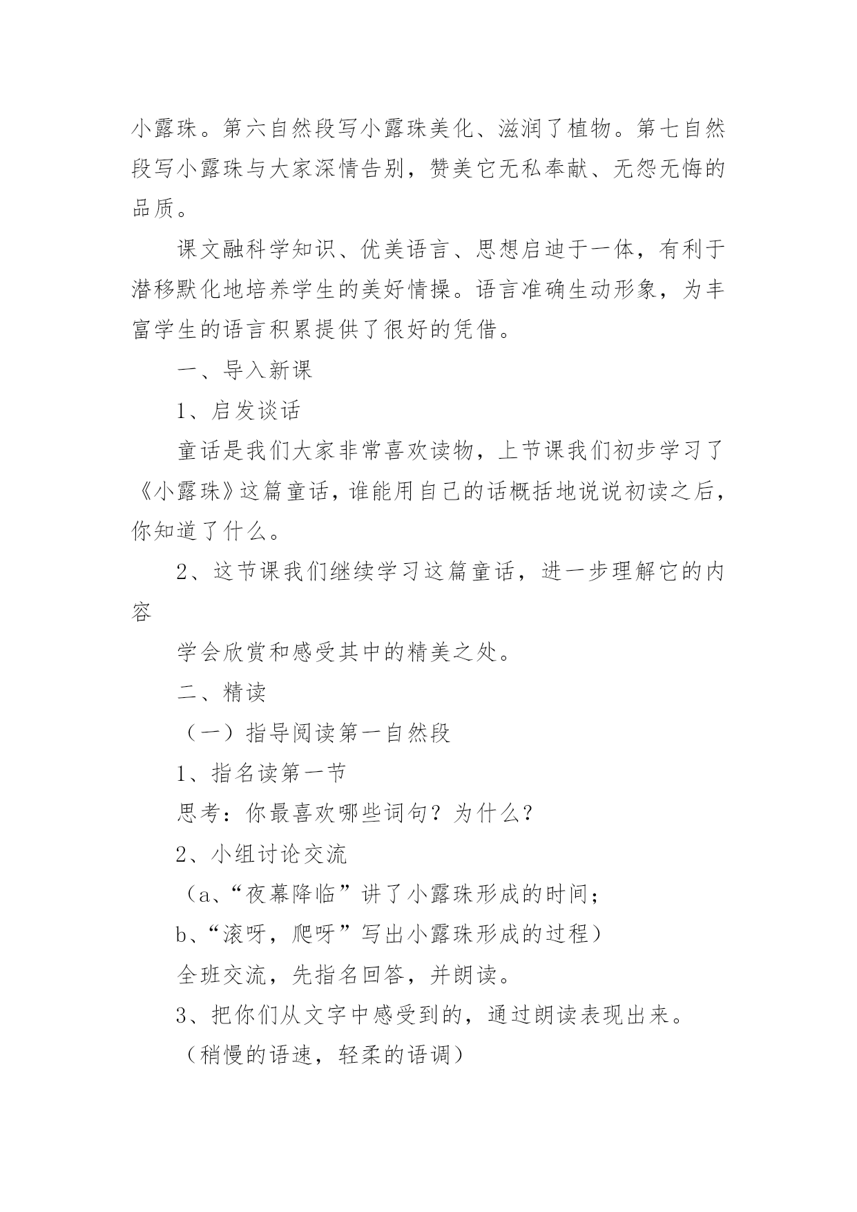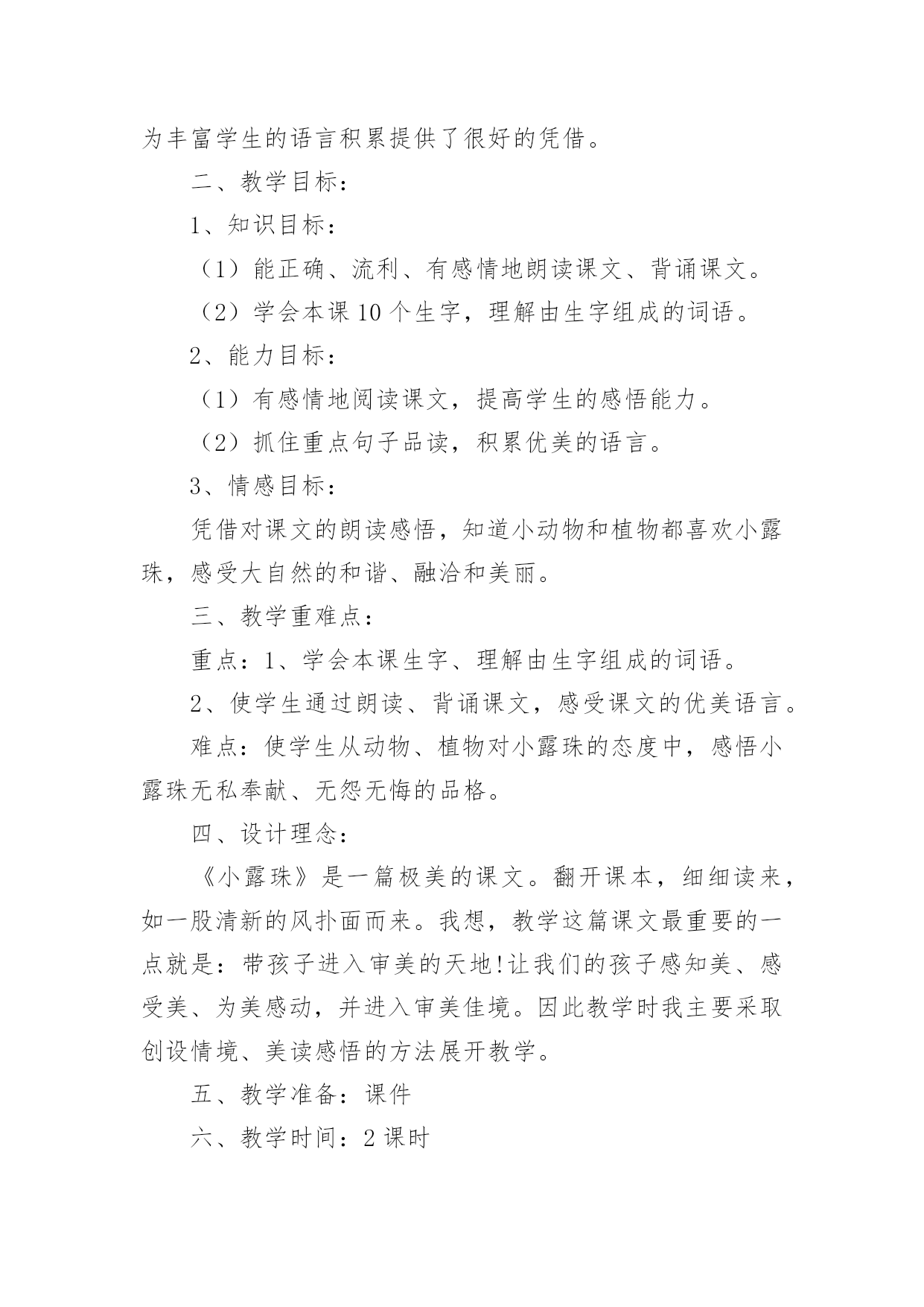 《小露珠》教学设计作为一名老师,时常需要用到教学设计,教学设计是一个系统化规划教学系统的过程。那么教学设计应该怎么写才合适呢?下面是小编精心整理的《小露珠》教学设计,希望能够帮助到大家。《小露珠》教学设计1一、教材解读:《小露珠》是苏教版语文第五册一篇优美的童话。写小露珠由形成到消失的过程,以及小动物和植物对小露珠的喜爱,赞扬了小露珠的美丽、可爱以及大自然的和谐、融洽。全文共七个自然段。第一自然段先交代小露珠诞生的时间及地点,小露珠就这样悄无声息、毫不张扬地来到了世上。第二至五自然段写小露珠受到小动物们的喜欢。小动物们见到小露珠纷纷和她打招呼,并且赞美她“像钻石那么闪亮”“像水晶那么透明”“像珍珠那么圆润”,归结起来,这些赞美称颂的是小露珠美丽的容颜和纯洁的品质,这也正是小动物们都喜欢小露珠的原因。第六自然段写小露珠装点了花草树木。小露珠不仅本身很美,而且还会用自己的美来装点别人,让植物们显得更精神更美丽。第七自然段写小露珠消失的过程,植物与她依依惜别。课文融科学知识、优美语言、思想启迪于一体,有利于潜移默化地培养学生的美好情操。语言准确、生动、形象,为丰富学生的语言积累提供了很好的凭借。二、教学目标:1、知识目标:(1)能正确、流利、有感情地朗读课文、背诵课文。(2)学会本课10个生字,理解由生字组成的词语。2、能力目标:(1)有感情地阅读课文,提高学生的感悟能力。(2)抓住重点句子品读,积累优美的语言。3、情感目标:凭借对课文的朗读感悟,知道小动物和植物都喜欢小露珠,感受大自然的和谐、融洽和美丽。三、教学重难点:重点:1、学会本课生字、理解由生字组成的词语。2、使学生通过朗读、背诵课文,感受课文的优美语言。难点:使学生从动物、植物对小露珠的态度中,感悟小露珠无私奉献、无怨无悔的品格。四、设计理念:《小露珠》是一篇极美的课文。翻开课本,细细读来,如一股清新的风扑面而来。我想,教学这篇课文最重要的一点就是:带孩子进入审美的天地!让我们的孩子感知美、感受美、为美感动,并进入审美佳境。因此教学时我主要采取创设情境、美读感悟的方法展开教学。五、教学准备:课件六、教学时间:2课时七、教学过程:这篇课文共安排了2课时,第一课时引导学生初读课文,了解主要内容,掌握生字新词;第二课时细读课文,理解课文内容,有感情地朗读课文,感受小露珠的可爱。我重点说一下第二课时的教学过程,它基本由以下环节组成:(1)创设情境,谈话导入。(2)播放动画,整体感知。(感受小露珠的可爱。)(3)细读课文,重点感悟。(感受小动物对小露珠的喜爱;感受植物对小露珠的喜爱;感受大家对小露珠的留恋。)(4)总结全文,情感升华。(5)作业超市,任你挑选。(一)创设情境,谈话导入。1、老师创设语言情境:同学们,语文是丰富多彩的,语言文字更会使浮想联翩。比如说,这个“雨”字,有人会联想到和风细雨的春天,有人会联想到狂风暴雨的夏日,还有人因雨而想到许多关于它的事情等等。那么一个“小”字(板书:小),你会联想到什么?(生:小狗、小孩、小时候、小东西……)师:这些事物,只要带上“小”字,就让人感觉特别亲切可爱,谁能亲切地读读它的名字?(板书:露珠)2、指生读题。3、这节课我们来继续学习第15课。过渡:夜深人静,万物都已入睡,小露珠却在这时神秘的出现了,你们想不想到大自然中找它们?(想)那现在就让我们走进夜幕,去寻找小露珠的踪迹吧!(二)、播放动画,整体感知。1、老师播放动画片《小露珠》。2、要求学生边看边想:你眼中的小露珠是什么样子的?(生汇报:小露珠是晶莹透亮的;小露珠非常漂亮……)3、师小节:夜晚的时候,花呀、草呀、石头了温度比空气低,当教热的空气碰到它们时,便会凝结成小水滴,就是我们所说的露水。过渡:现在就让我们到课文中去找一找那调皮的小露珠吧!(三)、细读课文,重点感悟。1、略读第一自然段。(1)指名读课文,其他同学思考:读了这段,你知道了什么?(生:夜晚,小露珠出现了,到了黎明变大了……)(2)理解词语:夜幕降临(3)指导朗读:小露珠爬呀、滚呀,多可爱多顽皮啊,谁愿意读一读?学生朗读过渡:清晨,小露珠遇见了三个好朋友:小青蛙、小蟋蟀和小蝴蝶,早起的'小动物看见了小露珠,都来向它问好。请大家自由读读二——五自然段,看看小动物眼中的小露珠是什么样子的?2、细读第二——五自然段,感受小动物对小露珠的喜爱。(1)学生自由读二——五自然段(2)播放课件让学生欣赏小青蛙对小露珠的喜爱。师:小青蛙多有礼貌呀!一见到小露珠就友好地打招呼说“早哇!”谁也来问候一下?(生问候,打招呼)师引导:平时我们生活中是怎么问好的?你会吗?咱们来试一试。(老师走到学生的身边,边握手边问好)师:“早哇!聪明伶俐的***。”生:“早哇!亲爱的吕老师。”师:“早哇!活泼可爱的***。”生:“早哇!敬爱的吕老