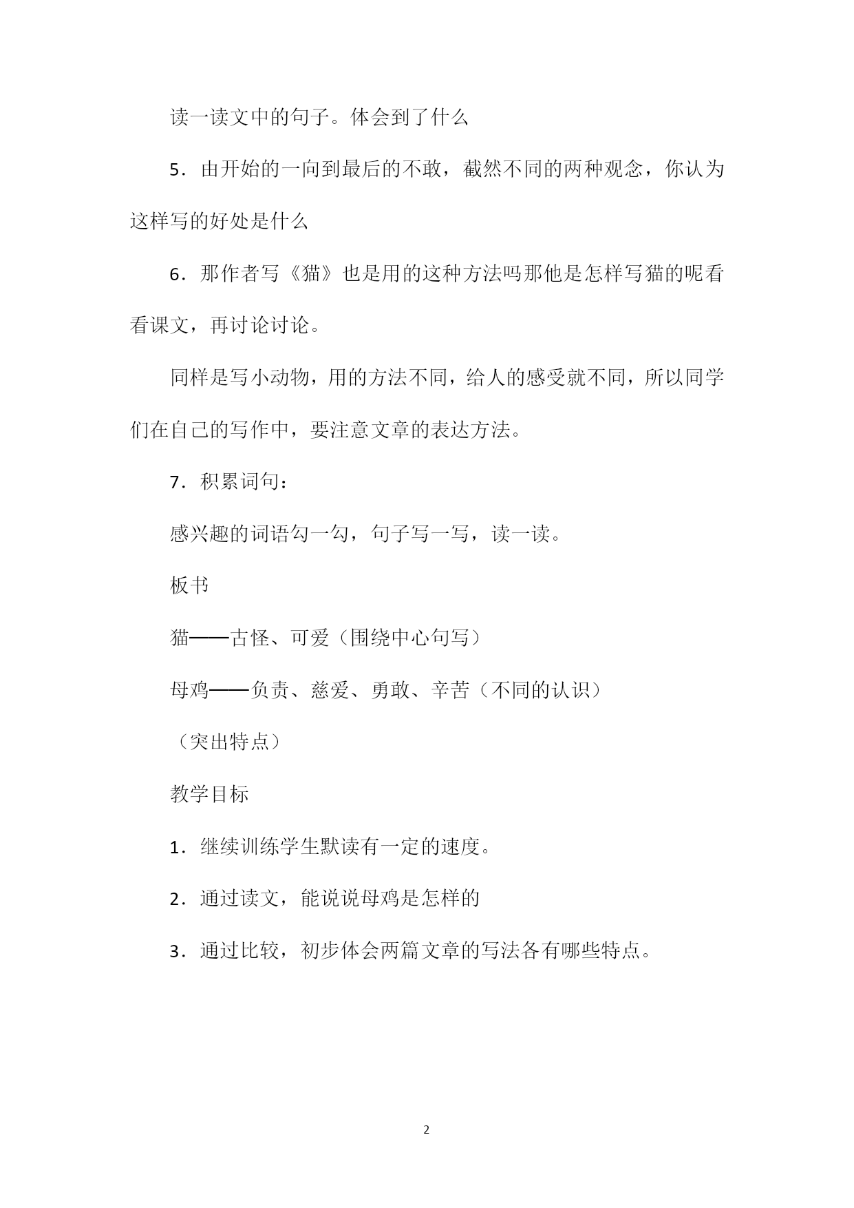 PAGEPAGE2《母鸡》教学教学课时一课时教学过程一、质疑引入1.关于这篇课文你了解些什么你还想了解些什么2.同学们回家是认真读了书的,非常好,下面就让我们一起走进老舍先生的文章里,看看作家是怎样描写我们身边熟悉的事物的二、学习新课1.默读课文,给自然段标序,勾画出生字并读一读。把自己喜欢的自然段多读几遍,再读给全班听一听。2.课文写出作者两种截然不同的观点,再次读文,找出反映这两种观点的句子。──我一向讨厌母鸡。我不敢再讨厌母鸡了。3.把这两句话读一读,体会一向、不敢。4.讨论:是什么让作者不敢讨厌母鸡读一读文中的句子。体会到了什么5.由开始的一向到最后的不敢,截然不同的两种观念,你认为这样写的好处是什么6.那作者写《猫》也是用的这种方法吗那他是怎样写猫的呢看看课文,再讨论讨论。同样是写小动物,用的方法不同,给人的感受就不同,所以同学们在自己的写作中,要注意文章的表达方法。7.积累词句:感兴趣的词语勾一勾,句子写一写,读一读。板书猫──古怪、可爱(围绕中心句写)母鸡──负责、慈爱、勇敢、辛苦(不同的认识)(突出特点)教学目标1.继续训练学生默读有一定的速度。2.通过读文,能说说母鸡是怎样的3.通过比较,初步体会两篇文章的写法各有哪些特点。