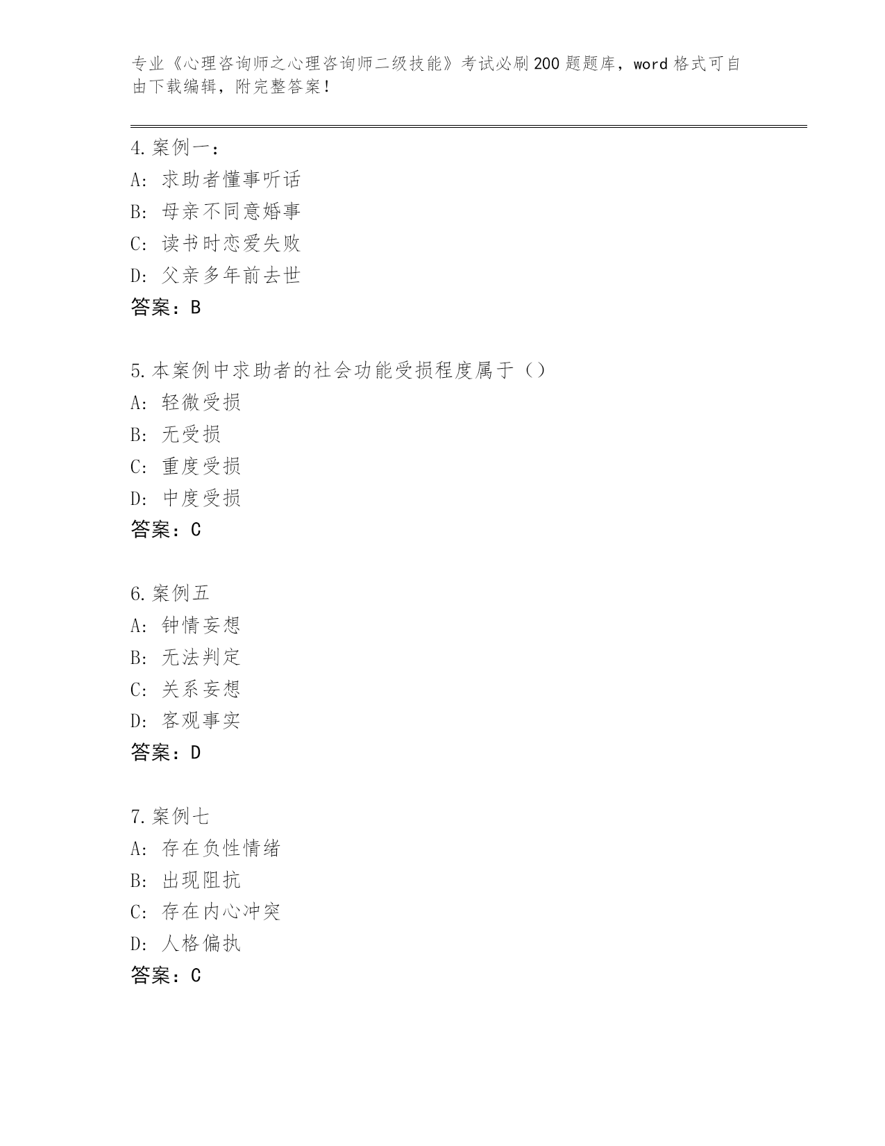 黑龙江省内部使用《心理咨询师之心理咨询师二级技能》资格考试必刷200题内部题库(含答案)