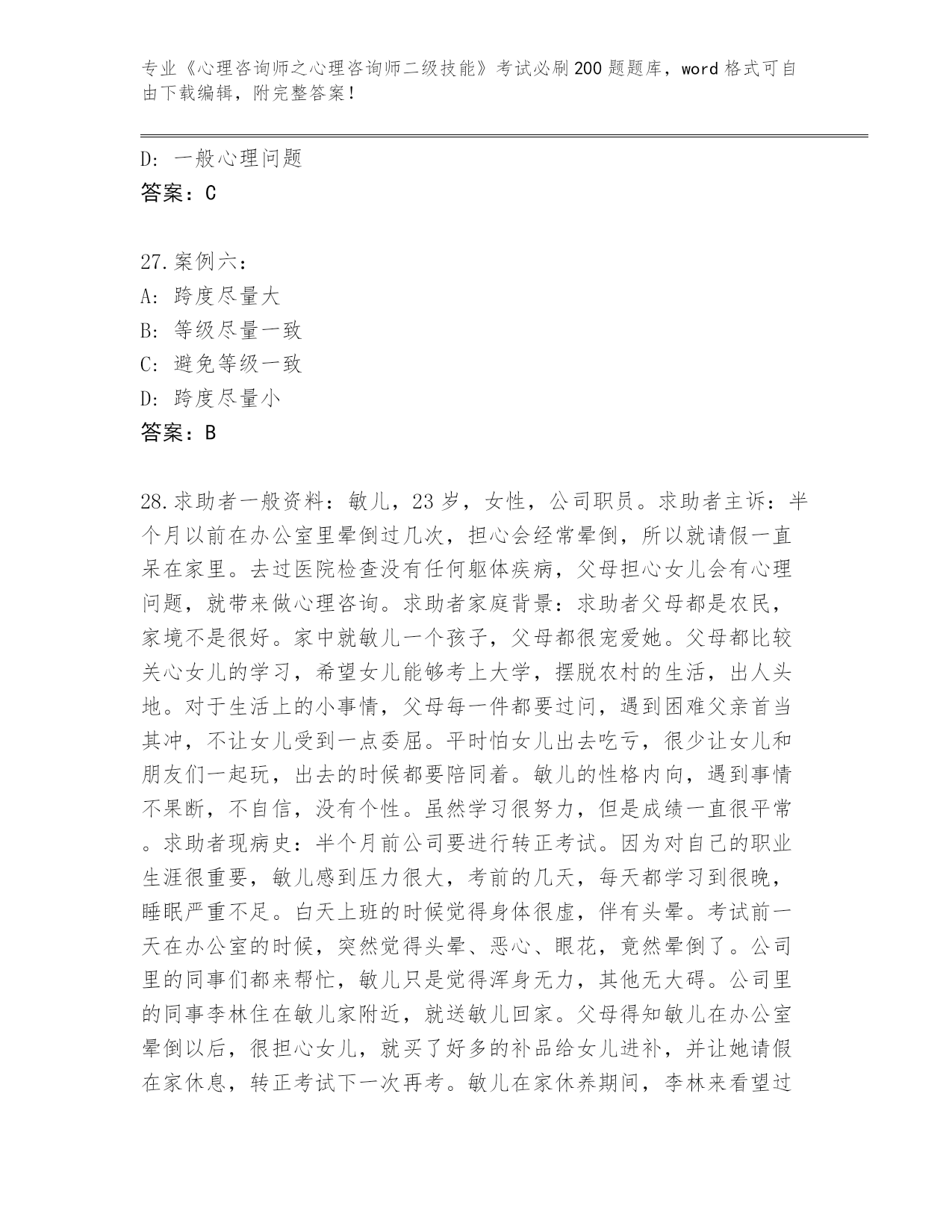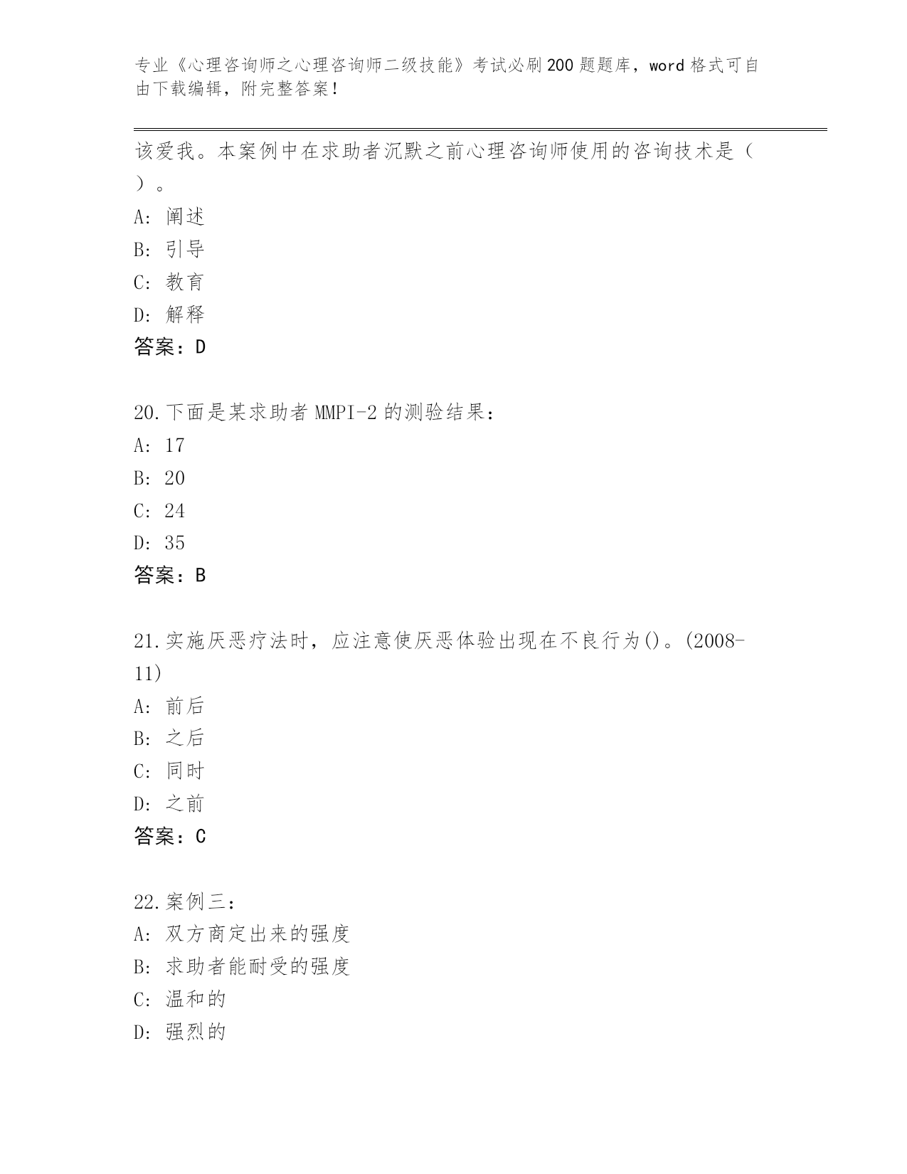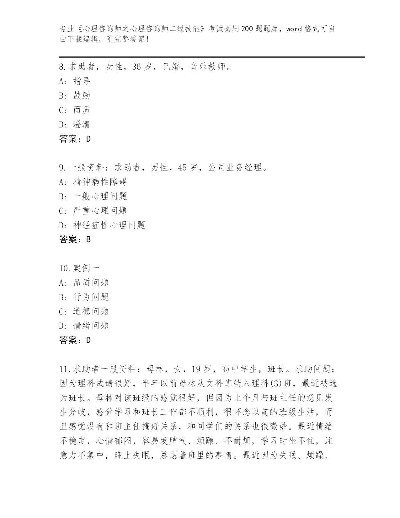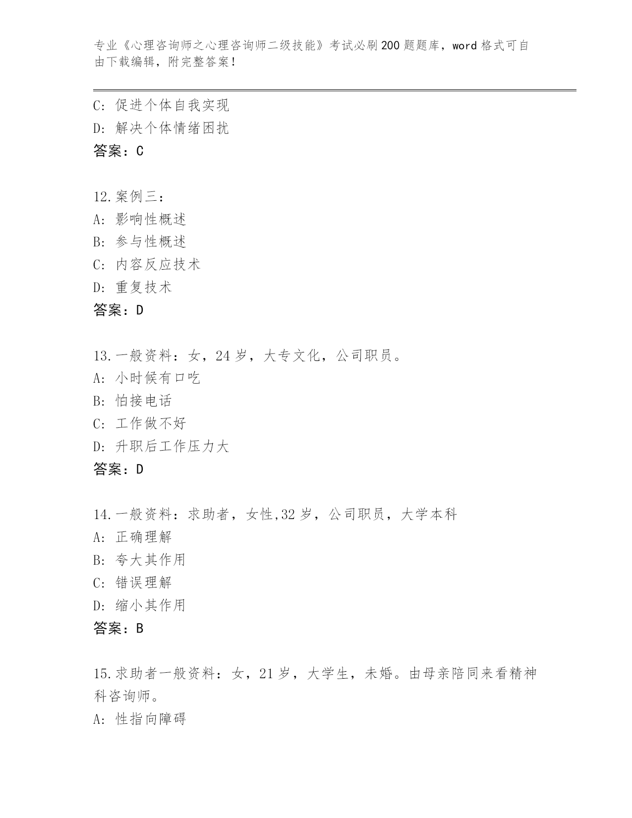 内部使用河南省林州市《心理咨询师之心理咨询师二级技能》资格考试必刷200题题库及答案(考点梳理)