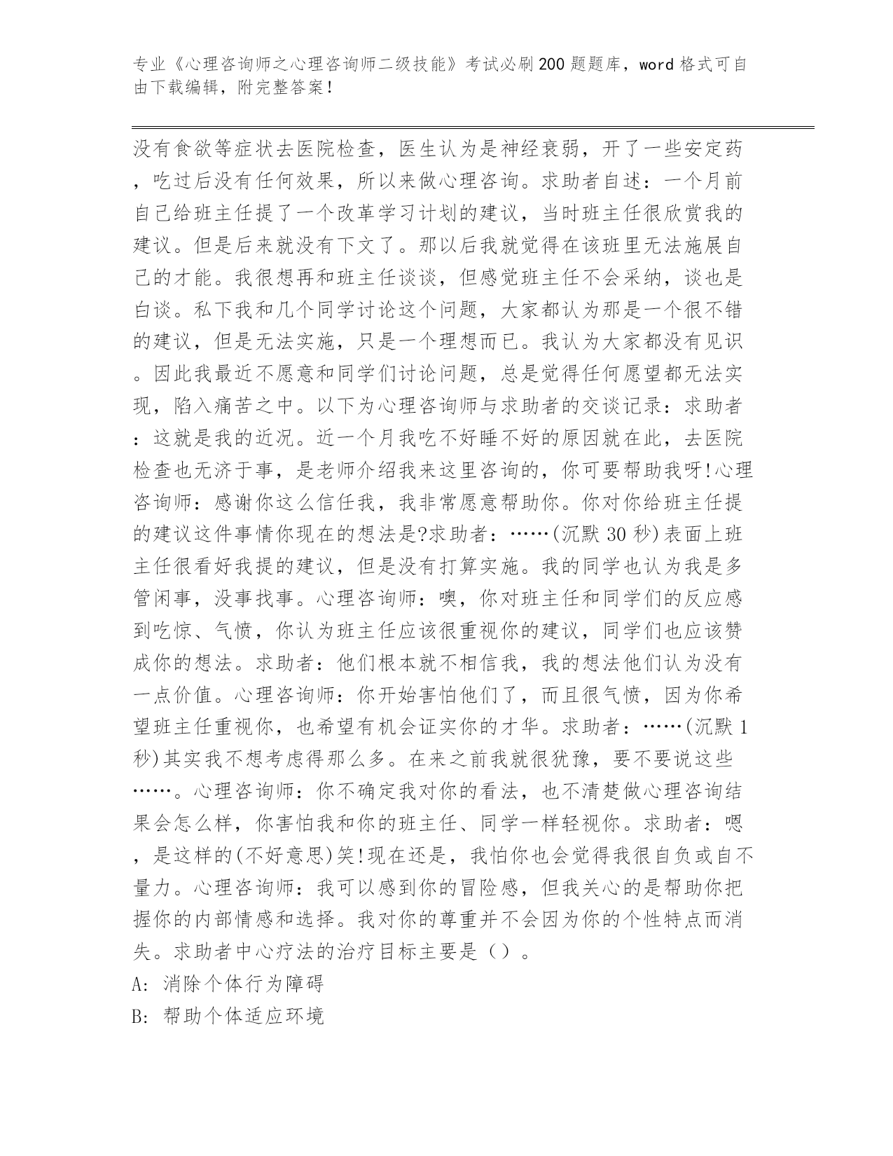 黑龙江省依兰县内部使用《心理咨询师之心理咨询师二级技能》考试必刷200题大全【含答案】