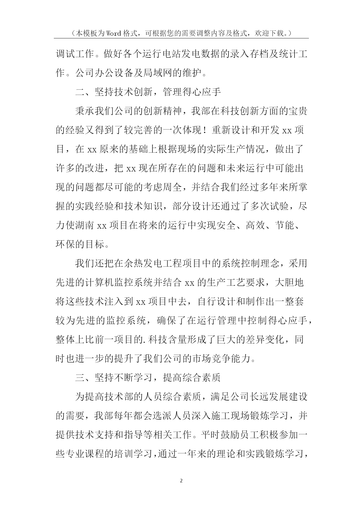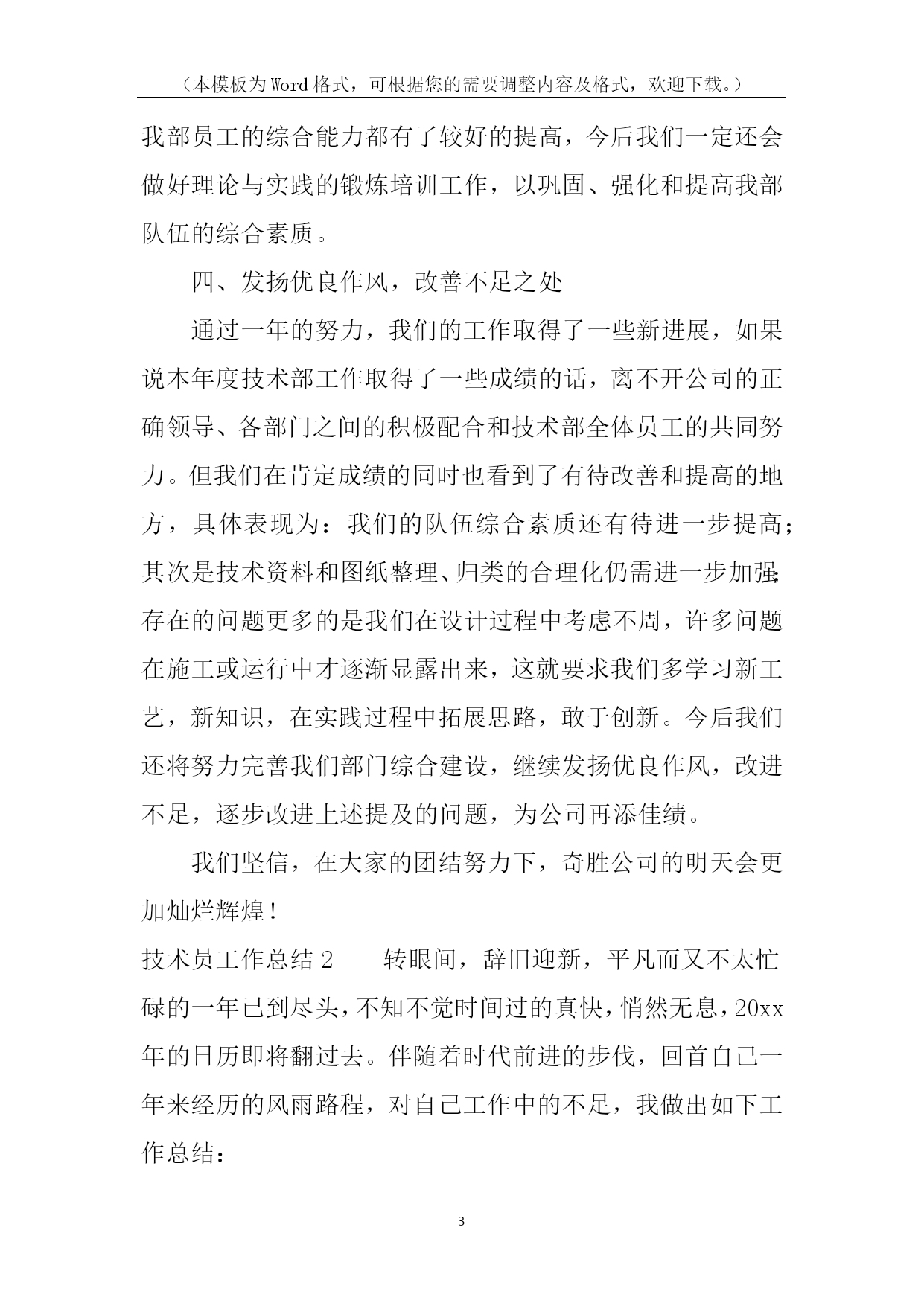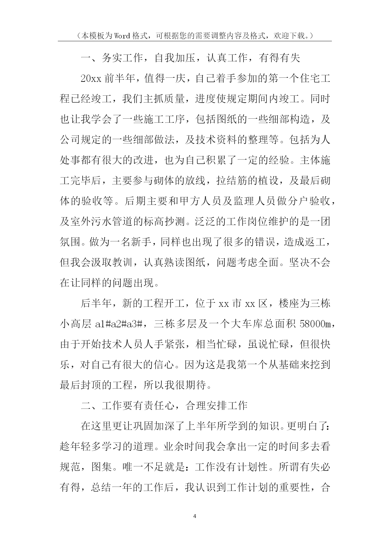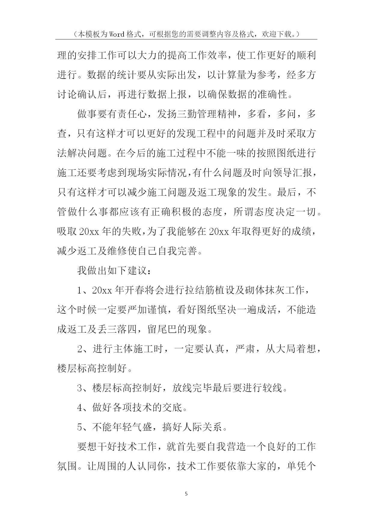 (本模板为Word格式,可根据您的需要调整内容及格式,欢迎下载。)PAGE\*MERGEFORMAT6技术员工作总结技术员工作总结1我们部门认真地回顾近一年来的工作成果及存在的不足,为了能够使今后的工作在质量上、效率上再上一个台阶,现将本年度完成的主要工作进行如下总结。一、人员分工合作,共同完成任务我们技术部是公司的一个重要部门,负责各个工程项目的图纸设计、技术资料编写和整理,以及对各个工程项目的施工进行技术跟踪和技术支持等等。今年,我部组织相关技术人员,将各项工作任务落实到每一个人,分工合作、加班加点,最终能按时完成设计任务,从而确保了每项工程都能按质按量地完成。为了给设计人员提供实践学习的机会,我们部门有计划地在一定时期内组织设计人员到生产工地的第一线,参加实践锻炼学习,从而进一步提高设计人员的设计水平以及做好对各个工程项目的技术跟踪和技术支持工作。配合生产部、工程部做好余热电站、水电站及xx项目的各种设备、工艺等大小型维修与改造。完成xx项目的图纸设计工作。跟进和做好xx项目的建设工作。做好其他项目的前期方案图纸设计工作。参与新产品、新设备的研发和调试工作。做好各个运行电站发电数据的录入存档及统计工作。公司办公设备及局域网的维护。二、坚持技术创新,管理得心应手秉承我们公司的创新精神,我部在科技创新方面的宝贵的经验又得到了较完善的一次体现!重新设计和开发xx项目,在xx原来的基础上根据现场的实际生产情况,做出了许多的改进,把xx现在所存在的问题和未来运行中可能出现的问题都尽可能的考虑周全,并结合我们经过多年来所掌握的实践经验和技术知识,部分设计还通过了多次试验,尽力使湖南xx项目在将来的运行中实现安全、高效、节能、环保的目标。我们还把在余热发电工程项目中的系统控制理念,采用先进的计算机监控系统并结合xx的生产工艺要求,大胆地将这些技术注入到xx项目中去,自行设计和制作出一整套较为先进的监控系统,确保了在运行管理中控制得心应手,整体上比前一项目的.科技含量形成了巨大的差异变化,同时也进一步的提升了我们公司的市场竞争能力。三、坚持不断学习,提高综合素质为提高技术部的人员综合素质,满足公司长远发展建设的需要,我部每年都会选派人员深入施工现场锻炼学习,并提供技术支持和指导等相关工作。平时鼓励员工积极参加一些专业课程的培训学习,通过一年来的理论和实践锻炼学习,我部员工的综合能力都有了较好的提高,今后我们一定还会做好理论与实践的锻炼培训工作,以巩固、强化和提高我部队伍的综合素质。四、发扬优良作风,改善不足之处通过一年的努力,我们的工作取得了一些新进展,如果说本年度技术部工作取得了一些成绩的话,离不开公司的正确领导、各部门之间的积极配合和技术部全体员工的共同努力。但我们在肯定成绩的同时也看到了有待改善和提高的地方,具体表现为:我们的队伍综合素质还有待进一步提高;其次是技术资料和图纸整理、归类的合理化仍需进一步加强;存在的问题更多的是我们在设计过程中考虑不周,许多问题在施工或运行中才逐渐显露出来,这就要求我们多学习新工艺,新知识,在实践过程中拓展思路,敢于创新。今后我们还将努力完善我们部门综合建设,继续发扬优良作风,改进不足,逐步改进上述提及的问题,为公司再添佳绩。我们坚信,在大家的团结努力下,奇胜公司的明天会更加灿烂辉煌!技术员工作总结2转眼间,辞旧迎新,平凡而又不太忙碌的一年已到尽头,不知不觉时间过的真快,悄然无息,20xx年的日历即将翻过去。伴随着时代前进的步伐,回首自己一年来经历的风雨路程,对自己工作中的不足,我做出如下工作总结:一、务实工作,自我加压,认真工作,有得有失20xx前半年,值得一庆,自己着手参加的第一个住宅工程已经竣工,我们主抓质量,进度使规定期间内竣工。同时也让我学会了一些施工工序,包括图纸的一些细部构造,及公司规定的一些细部做法,及技术资料的整理等。包括为人处事都有很大的改进,也为自己积累了一定的经验。主体施工完毕后,主要参与砌体的放线,拉结筋的植设,及最后砌体的验收等。后期主要和甲方人员及监理人员做分户验收,及室外污水管道的标高抄测。泛泛的工作岗位维护的是一团氛围。做为一名新手,同样也出现了很多的错误,造成返工,但我会汲取教训,认真熟读图纸,问题考虑全面。坚决不会在让同样的问题出现。后半年,新的工程开工,位于xx市xx区,楼座为三栋小高层a1#a2#a3#,三栋多层及一个大车库总面积58000m,由于开始技术人员人手紧张,相当忙碌,虽说忙碌,但很快乐,对自己有很大的信心。因为这是我第一个从基础来挖到最后封顶的工程,所以我很期待。二、工作要有责任心,合理安排工作在这里更让巩固加深了上半年所学到的知识。更明白了:趁年轻多学习的道理。业余时间我会拿出一定的时间多去看规范,图集。唯一不足就是:工作没有