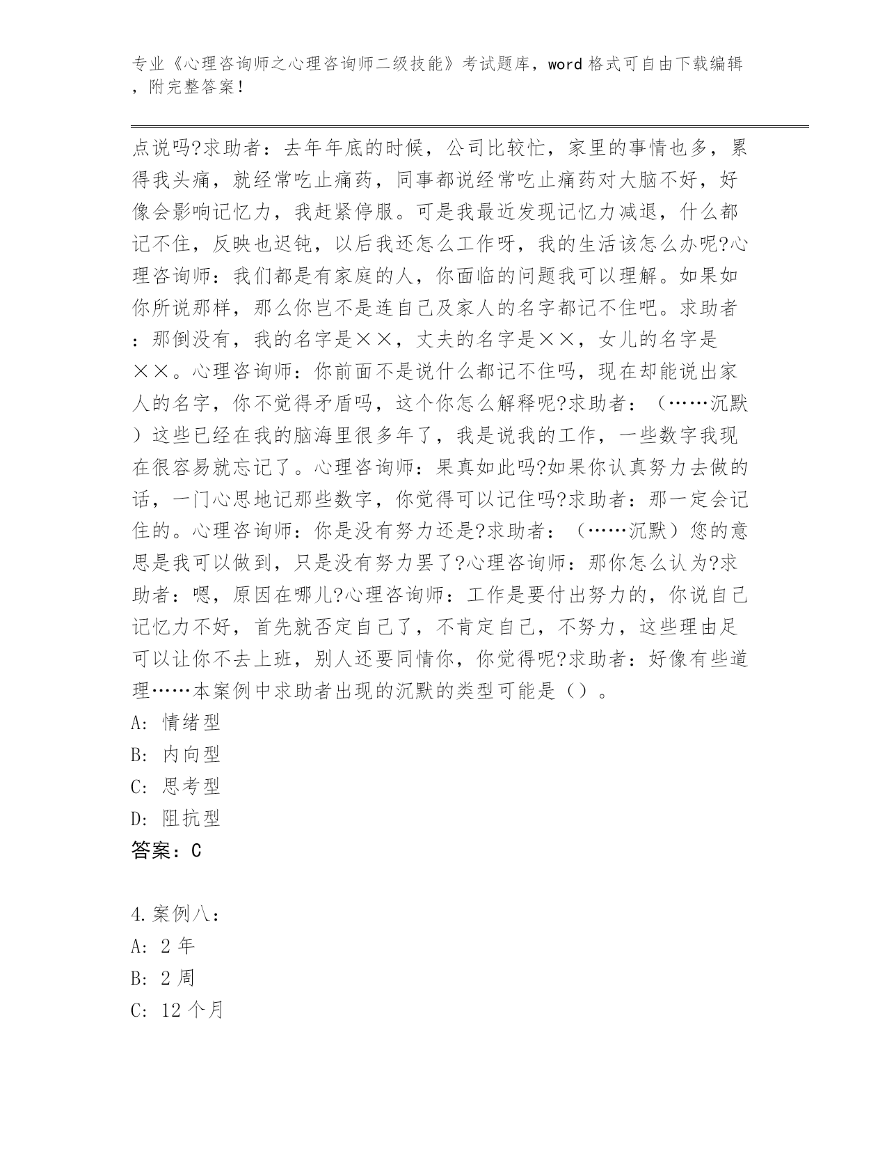 陕西省2024《心理咨询师之心理咨询师二级技能》考试必考200题通关秘籍题库及答案【名师系列】