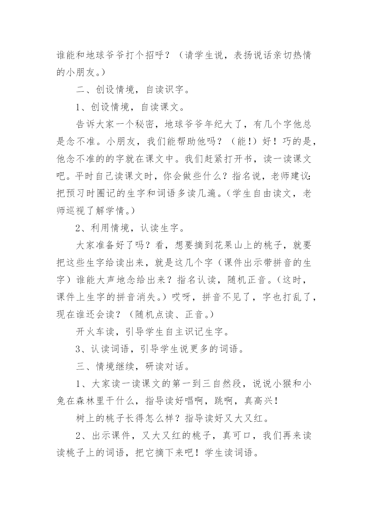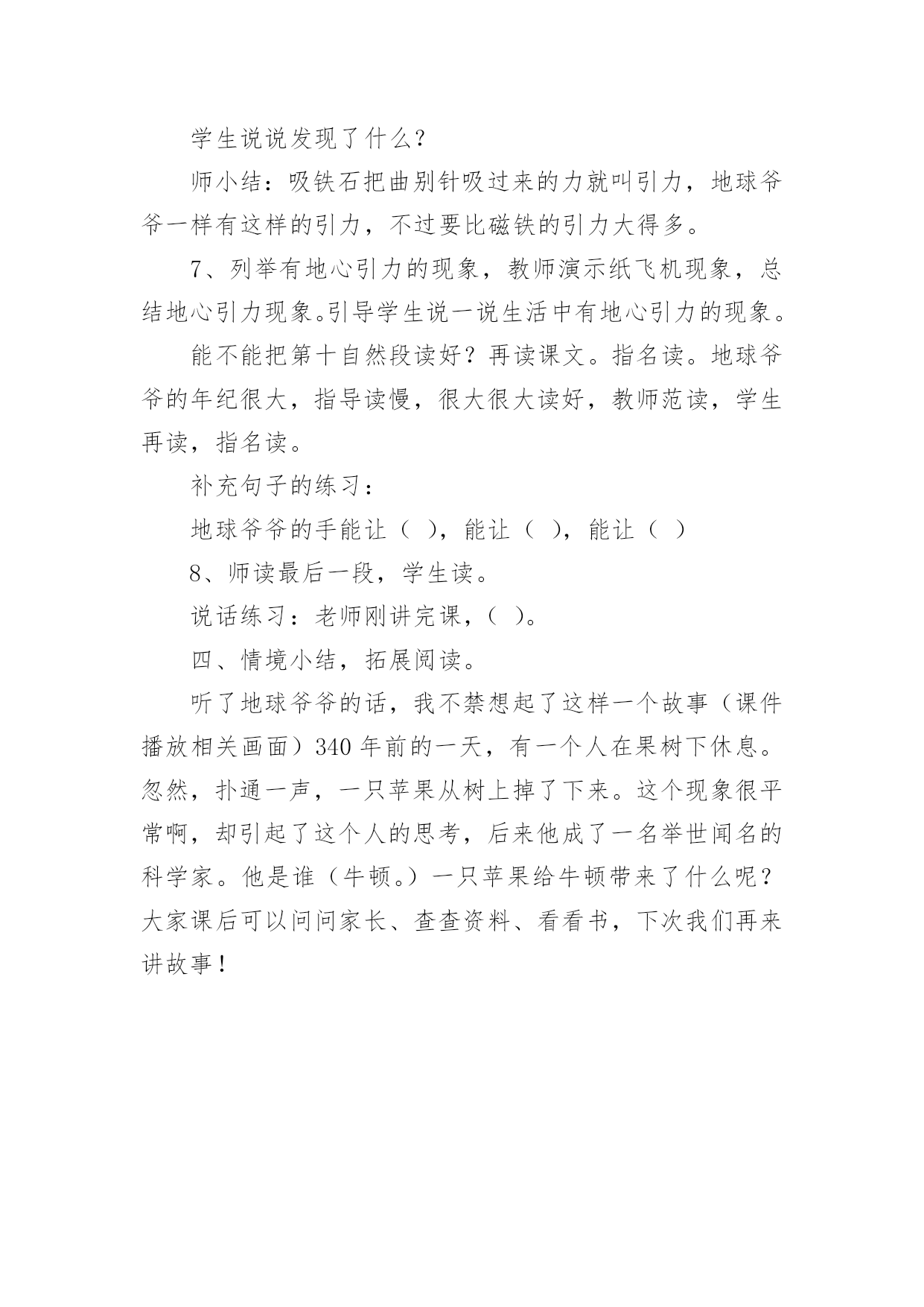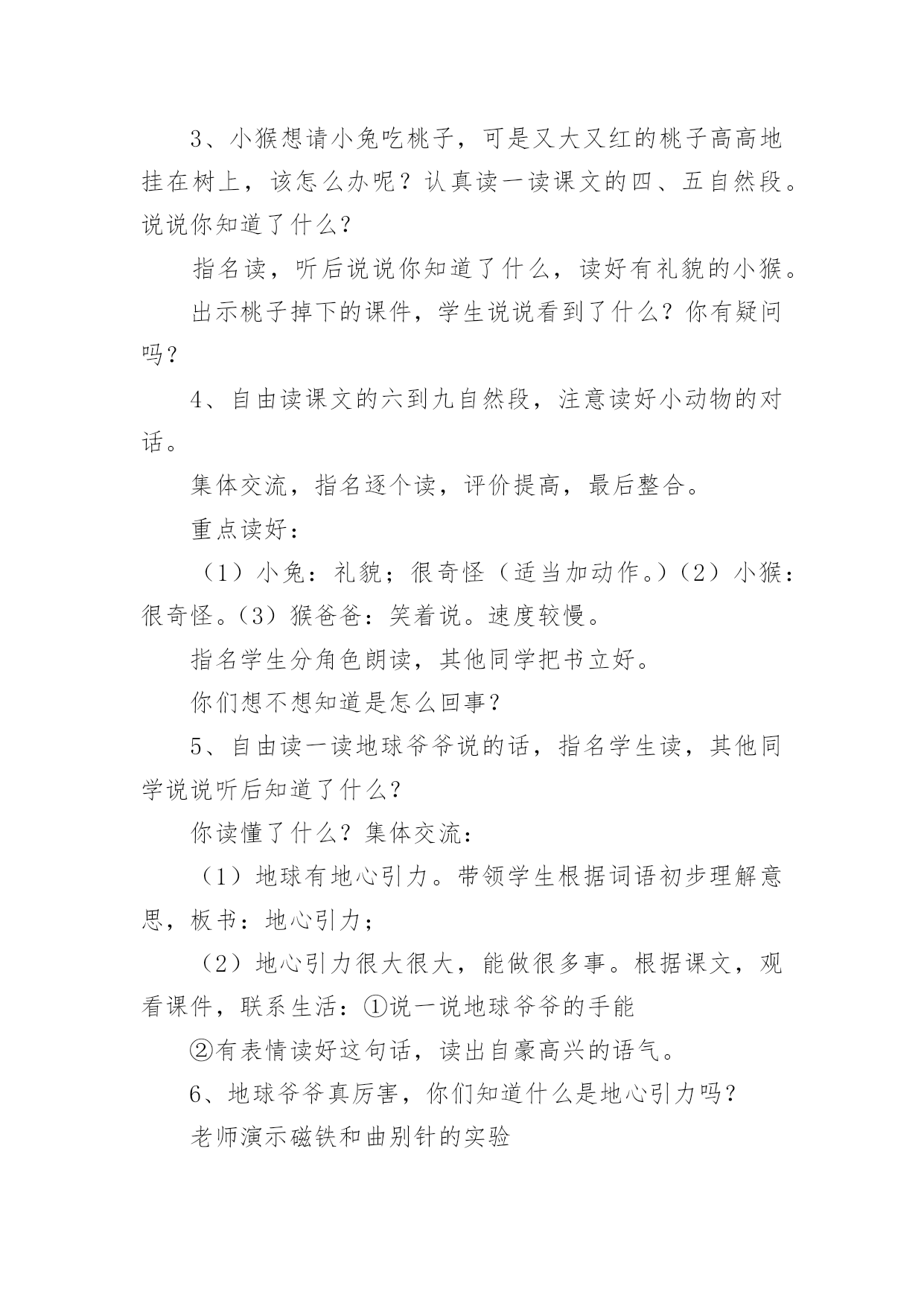 爷爷的地球教学设计爷爷的地球教学设计教学目标:1、认识俩、摘等7个生字,正确书写球这个生字。2、能正确、流利地朗读课文,能有感情朗读文中角色对话。3、初步了解地心引力的知识,鼓励学生留心身边的科学,培养爱科学用科学的积极情感。教学重点:了解地心引力的知识。读好课文。课前准备:学生预习新课。教师制作课件。教学过程:一、创设情境,激趣导入1、花果山的桃子熟了,小猴子请他的好朋友小白兔一起吃桃子,可今天他们不用自己动手摘桃子了,地球爷爷已经用他的大手替他们把桃子摘下来了。地球爷爷的手是什么样的?今天大家一起来学习课文。(板书课题)。2、齐读课题,认读生字球。3、学写球字:(课件出示在田字格中的球字)怎样才能把球字写漂亮呢?请学生回答,引导学生发现王变成王字旁后的区别。老师范写,学生书空。4、根据科学家的研究,地球的年纪已经很大很大了,他从形成到现在已经有45亿年了,所以我们称他是地球爷爷。(板书:爷爷。)让我们一起来亲切地读一读。(齐读。)谁能和地球爷爷打个招呼?(请学生说,表扬说话亲切热情的小朋友。)二、创设情境,自读识字。1、创设情境,自读课文。告诉大家一个秘密,地球爷爷年纪大了,有几个字他总是念不准。小朋友,我们能帮助他吗?(能!)好!巧的是,他念不准的的字就在课文中。我们赶紧打开书,读一读课文吧。平时自己读课文时,你会做些什么?指名说,老师建议:把预习时圈记的生字和词语多读几遍。(学生自由读文,老师巡视了解学情。)2、利用情境,认读生字。大家准备好了吗?看,想要摘到花果山上的桃子,就要把这些生字给读出来,就是这几个字(课件出示带拼音的生字)谁能大声地念给出来?指名认读,随机正音。(这时,课件上生字的拼音消失。)哎呀,拼音不见了,字也打乱了,现在谁还会读?(随机点读、正音。)开火车读,引导学生自主识记生字。3、认读词语,引导学生说更多的词语。三、情境继续,研读对话。1、大家读一读课文的第一到三自然段,说说小猴和小兔在森林里干什么,指导读好唱啊,跳啊,真高兴!树上的桃子长得怎么样?指导读好又大又红。2、出示课件,又大又红的桃子,真可口,我们再来读读桃子上的词语,把它摘下来吧!学生读词语。3、小猴想请小兔吃桃子,可是又大又红的桃子高高地挂在树上,该怎么办呢?认真读一读课文的四、五自然段。说说你知道了什么?指名读,听后说说你知道了什么,读好有礼貌的小猴。出示桃子掉下的课件,学生说说看到了什么?你有疑问吗?4、自由读课文的六到九自然段,注意读好小动物的对话。集体交流,指名逐个读,评价提高,最后整合。重点读好:(1)小兔:礼貌;很奇怪(适当加动作。)(2)小猴:很奇怪。(3)猴爸爸:笑着说。速度较慢。指名学生分角色朗读,其他同学把书立好。你们想不想知道是怎么回事?5、自由读一读地球爷爷说的话,指名学生读,其他同学说说听后知道了什么?你读懂了什么?集体交流:(1)地球有地心引力。带领学生根据词语初步理解意思,板书:地心引力;(2)地心引力很大很大,能做很多事。根据课文,观看课件,联系生活:①说一说地球爷爷的手能②有表情读好这句话,读出自豪高兴的语气。6、地球爷爷真厉害,你们知道什么是地心引力吗?老师演示磁铁和曲别针的实验学生说说发现了什么?师小结:吸铁石把曲别针吸过来的力就叫引力,地球爷爷一样有这样的引力,不过要比磁铁的引力大得多。7、列举有地心引力的现象,教师演示纸飞机现象,总结地心引力现象。引导学生说一说生活中有地心引力的现象。能不能把第十自然段读好?再读课文。指名读。地球爷爷的年纪很大,指导读慢,很大很大读好,教师范读,学生再读,指名读。补充句子的练习:地球爷爷的手能让(),能让(),能让()8、师读最后一段,学生读。说话练习:老师刚讲完课,()。四、情境小结,拓展阅读。听了地球爷爷的话,我不禁想起了这样一个故事(课件播放相关画面)340年前的一天,有一个人在果树下休息。忽然,扑通一声,一只苹果从树上掉了下来。这个现象很平常啊,却引起了这个人的思考,后来他成了一名举世闻名的科学家。他是谁(牛顿。)一只苹果给牛顿带来了什么呢?大家课后可以问问家长、查查资料、看看书,下次我们再来讲故事!