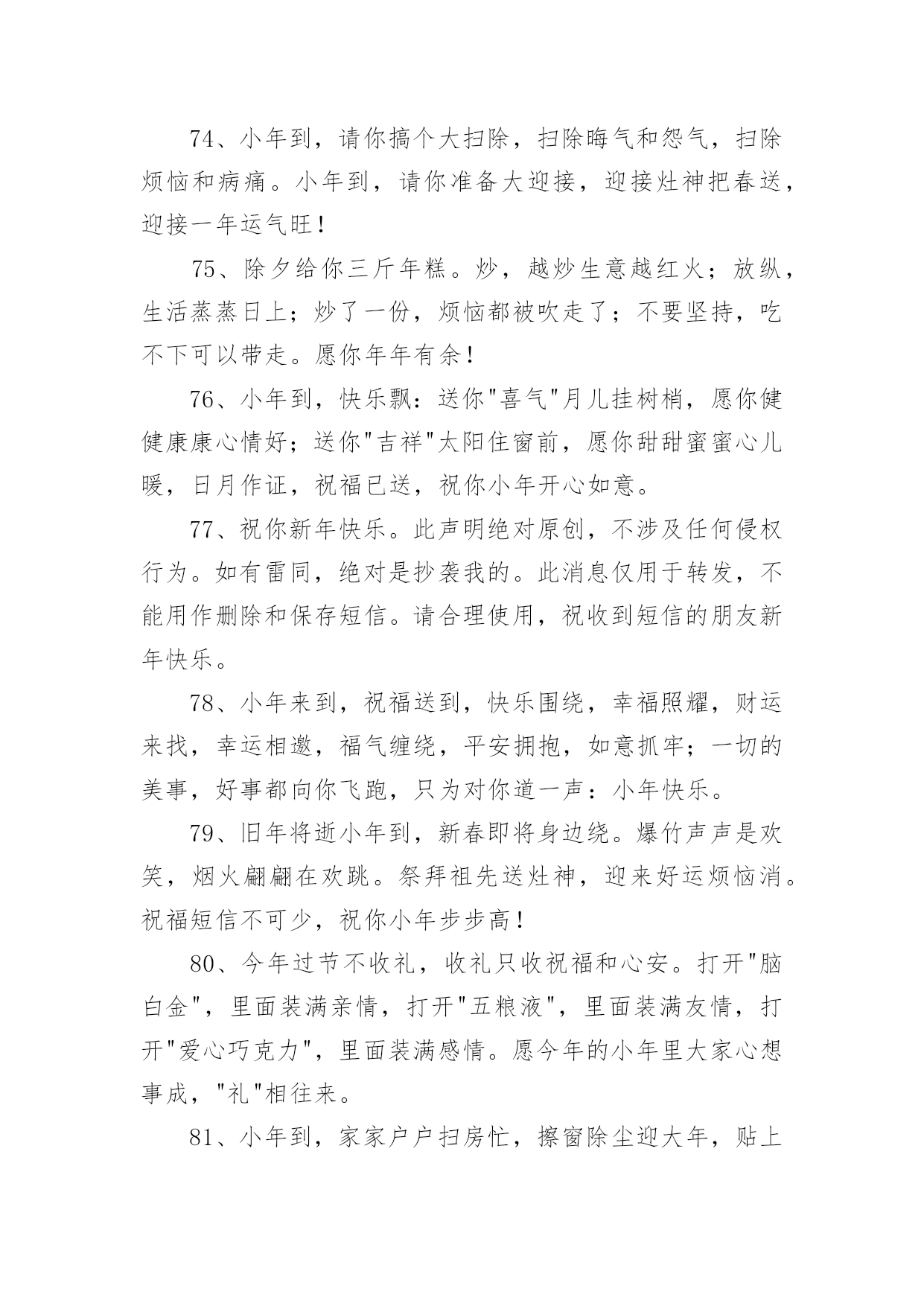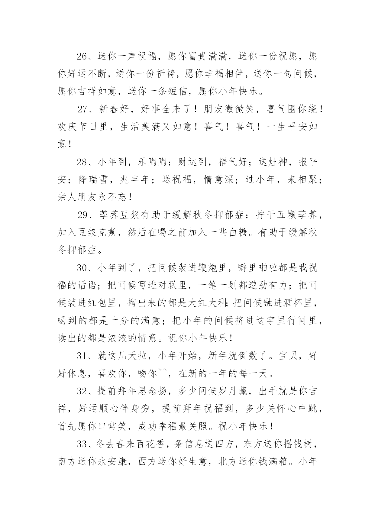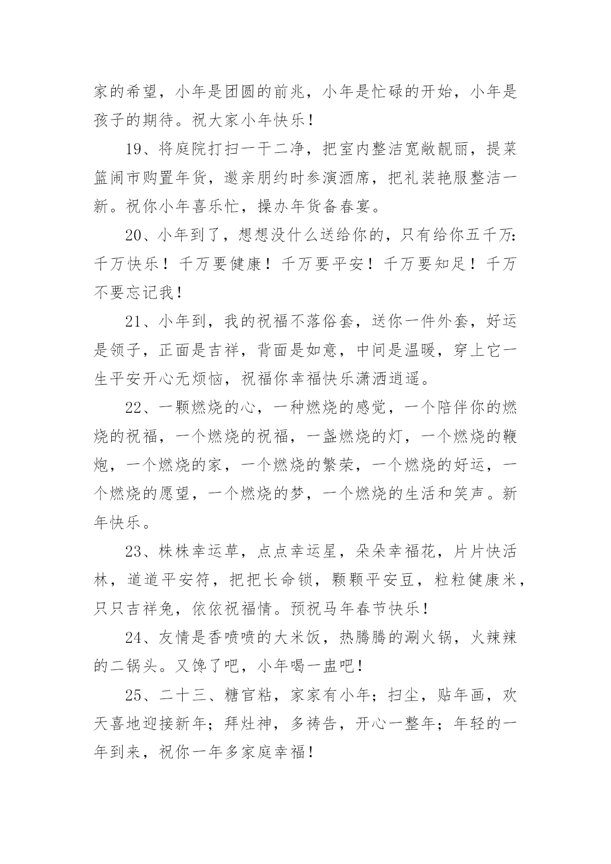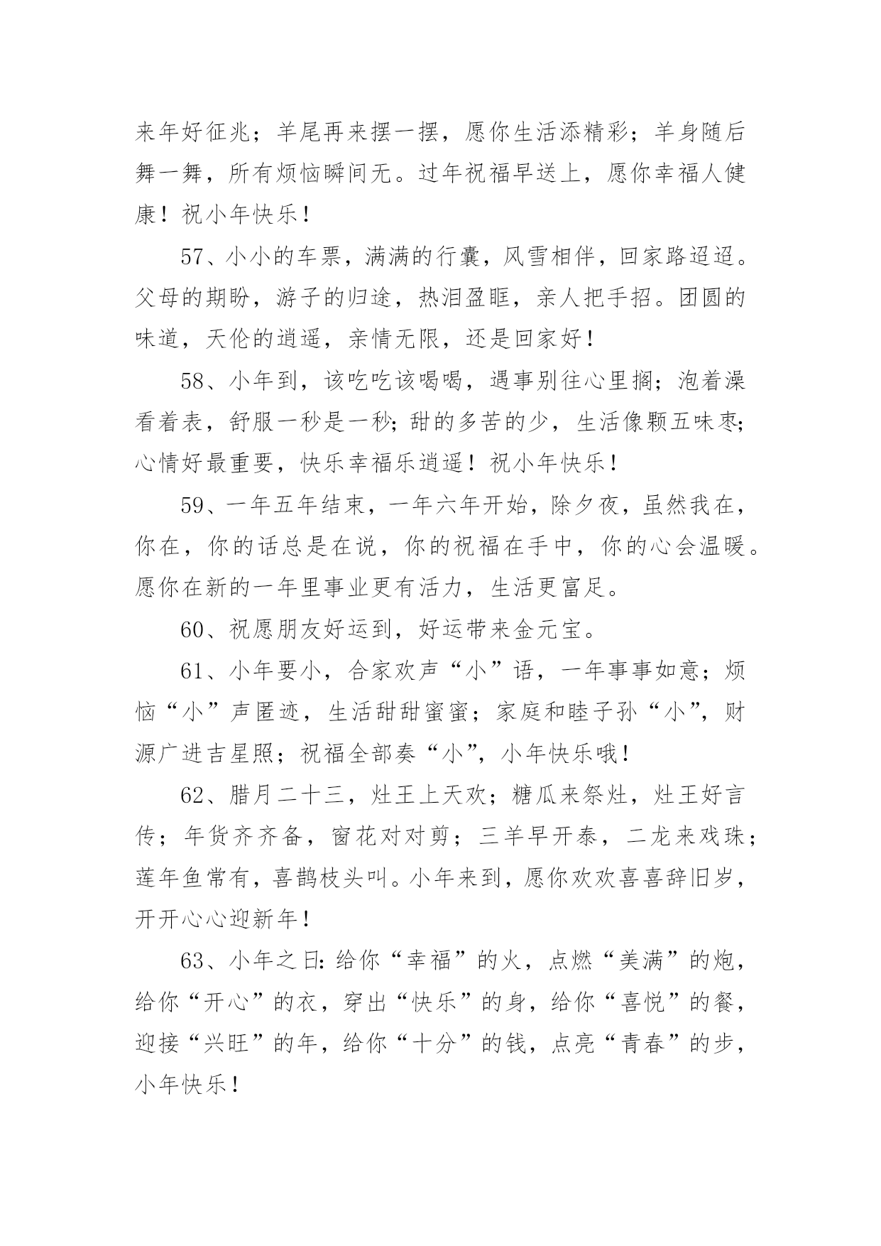 小年发表独特文案在日常学习、工作或生活中,大家一定没少看到过文案吧,文案具有文字简练、意义鲜明的特点。究竟什么样的文案才是好的文案呢?以下是小编整理的小年发表独特文案,供大家参考借鉴,希望可以帮助到有需要的朋友。1、小年随着喜庆跑,灶神财神都来到,把忙碌忧愁忘掉,让欢乐将你围绕,除夕春节跟着笑,欢聚是何等的奇妙,朋友祝福前来报到:愿你小年乐淘淘!2、二十三,糖官粘,家家户户过小年;扫灰尘,贴年画,欢欢喜喜迎新年;拜灶神,多祈福,幸幸福福一整年;小年到,愿你合家欢乐,年年有余!3、冬去春来百花香,一条信息送四方,东方送你摇钱树,南方送你永安康,西方送你好生意,北方送你钱满箱。小年快乐!4、放弃回乡的艰辛,紧握小年团圆的美好。5、送你一杯吉祥酒,来年生活乐悠悠。6、小年来到,愿你幸福乐逍遥!7、送你绿色春的盎然活力;送你赤色夏的奔放热情;送你黄色秋的沉静关怀;送你白色冬的暖心问候。春节快到了,愿你在新的一个四季,平安幸福!春节祝福短信8、日出东海落西山,愁也一天,喜也一天;遇事不钻牛角尖,人也舒坦,心也舒坦;常与朋友聊聊天,古也谈谈,今也谈谈,不是神仙胜似神仙;愿你快乐一。小年祝福祝语贺语小年寄语祝词问候语9、幸福美满,快乐小年!10、小年恭祝你:大财小财意外财,财源滚滚;亲情友情爱情,情情如意;官运财运桃花运,运运亨通;爱人亲人友人,人人平安。11、腊月二十三,小年这一天,问候在心间,祝福送不完。愿你快乐每一天,幸福总绵绵。祝你新年里的每一天好运总不断,永远健康和平安!12、腊月二三是小年,小年送你小祝愿。祝你:小小愿望都实现,小小烦恼全不见,小小微笑都香甜,小小红包装满钱,小小手机多微信,小小语句都思念。祝你小年快乐哦!13、用吉祥的红纸,包一个好运的红包;用舒爽的心情,酿一瓶甜蜜的红酒;用团聚的快乐,圆一个温馨的小年;用真诚的祝福,送一个美好的心愿;朋友,祝你小年团圆快乐,幸福温馨常伴!14、愿你小年多如意,快快乐乐迎新年!15、酒越久越醇,朋友相交越久越真;水越流越清,世间沧桑越流越淡。祝小年快乐,时时好心情!16、小年快乐!万事大吉!合家欢乐!财源广进!吉祥如意!花开富贵!金玉满堂!福禄寿禧!恭喜发财!17、放下浮躁,丢掉烦恼,让心灵在繁华三千中绽放微笑;快乐小憩,休闲随意,让时光在短暂放松里飘荡甜蜜。小年到,愿你安享静好,自在逍遥,心情美妙!18、小年是春节的开始,小年是灶王的来到,小年是回家的希望,小年是团圆的前兆,小年是忙碌的开始,小年是孩子的期待。祝大家小年快乐!19、将庭院打扫一干二净,把室内整洁宽敞靓丽,提菜篮闹市购置年货,邀亲朋约时参演酒席,把礼装艳服整洁一新。祝你小年喜乐忙,操办年货备春宴。20、小年到了,想想没什么送给你的,只有给你五千万:千万快乐!千万要健康!千万要平安!千万要知足!千万不要忘记我!21、小年到,我的祝福不落俗套,送你一件外套,好运是领子,正面是吉祥,背面是如意,中间是温暖,穿上它一生平安开心无烦恼,祝福你幸福快乐潇洒逍遥。22、一颗燃烧的心,一种燃烧的感觉,一个陪伴你的燃烧的祝福,一个燃烧的祝福,一盏燃烧的灯,一个燃烧的鞭炮,一个燃烧的家,一个燃烧的繁荣,一个燃烧的好运,一个燃烧的愿望,一个燃烧的梦,一个燃烧的生活和笑声。新年快乐。23、株株幸运草,点点幸运星,朵朵幸福花,片片快活林,道道平安符,把把长命锁,颗颗平安豆,粒粒健康米,只只吉祥兔,依依祝福情。预祝马年春节快乐!24、友情是香喷喷的大米饭,热腾腾的涮火锅,火辣辣的二锅头。又馋了吧,小年喝一盅吧!25、二十三、糖官粘,家家有小年;扫尘,贴年画,欢天喜地迎接新年;拜灶神,多祷告,开心一整年;年轻的一年到来,祝你一年多家庭幸福!26、送你一声祝福,愿你富贵满满,送你一份祝愿,愿你好运不断,送你一份祈祷,愿你幸福相伴,送你一句问候,愿你吉祥如意,送你一条短信,愿你小年快乐。27、新春好,好事全来了!朋友微微笑,喜气围你绕!欢庆节日里,生活美满又如意!喜气!喜气!一生平安如意!28、小年到,乐陶陶;财运到,福气好;送灶神,报平安;降瑞雪,兆丰年;送祝福,情意深;过小年,来相聚;亲人朋友永不忘!29、荸荠豆浆有助于缓解秋冬抑郁症:拧干五颗荸荠,加入豆浆克煮,然后在喝之前加入一些白糖。有助于缓解秋冬抑郁症。30、小年到了,把问候装进鞭炮里,噼里啪啦都是我祝福的话语;把问候写进对联里,一笔一划都遒劲有力;把问候装进红包里,掏出来的都是大红大利;把问候融进酒杯里,喝到的都是十分的满意;把小年的问候挤进这字里行间里,读出的都是浓浓的情意。祝你小年快乐!31、就这几天拉,小年开始,新年就倒数了。宝贝,好好休息,喜欢你,吻你~~,在新的一年的每一天。32、提前拜年思念扬,多少问候岁月藏,出手就是你吉祥,好运顺心伴身旁,提前拜年祝福到,多少关怀