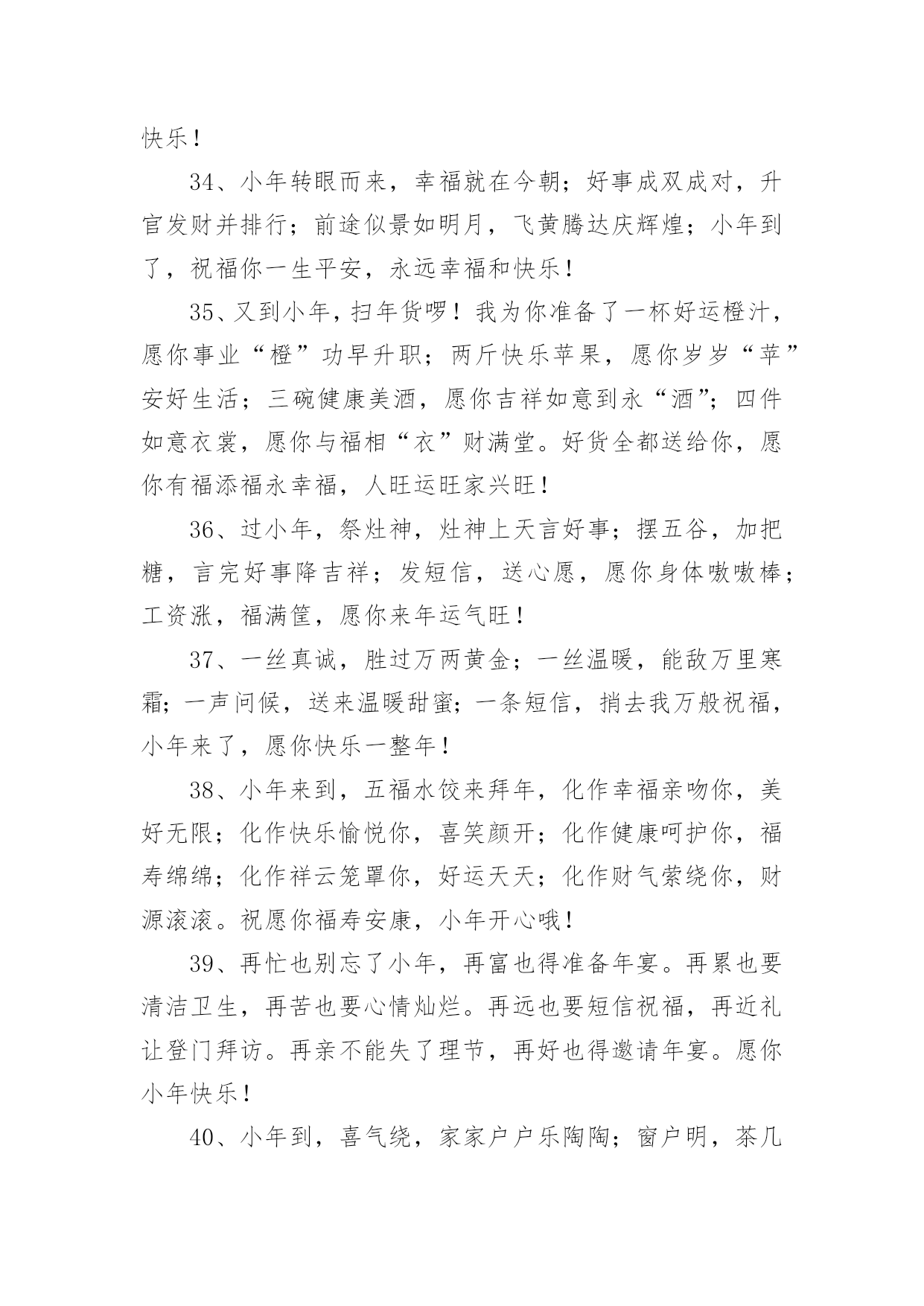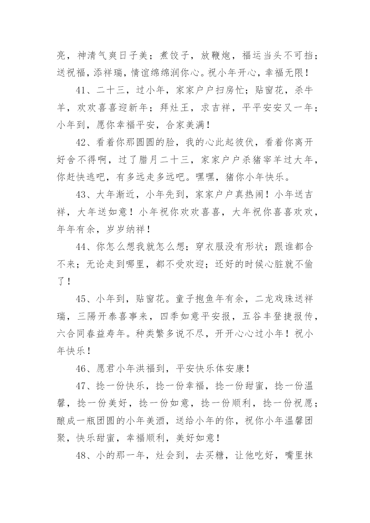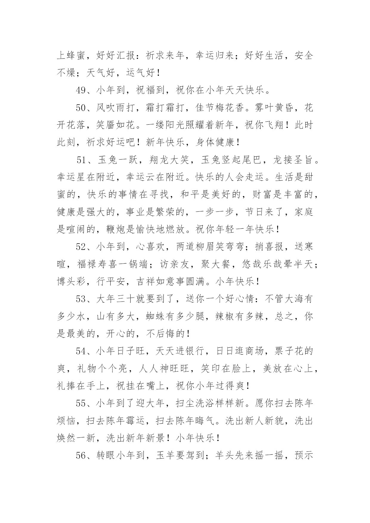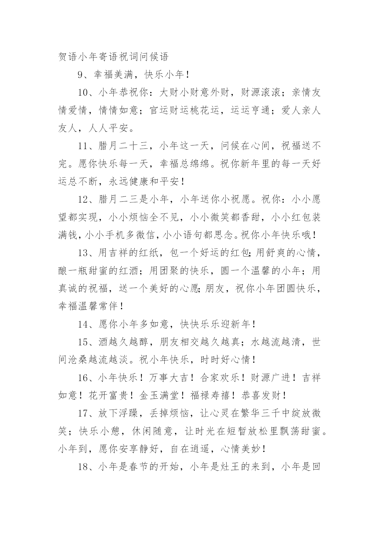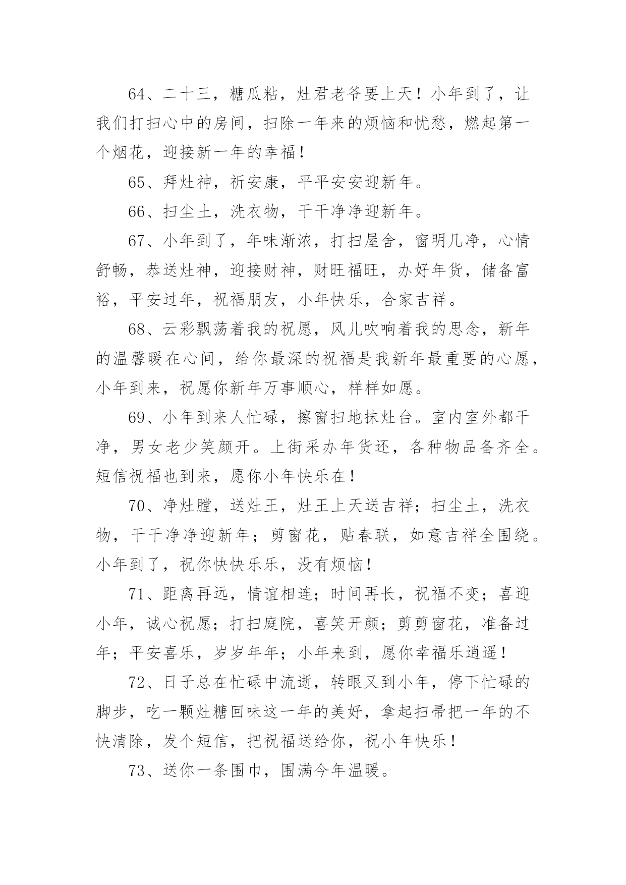 小年发表独特文案在日常学习、工作或生活中,大家一定没少看到过文案吧,文案具有文字简练、意义鲜明的特点。究竟什么样的文案才是好的文案呢?以下是小编整理的小年发表独特文案,供大家参考借鉴,希望可以帮助到有需要的朋友。1、小年随着喜庆跑,灶神财神都来到,把忙碌忧愁忘掉,让欢乐将你围绕,除夕春节跟着笑,欢聚是何等的奇妙,朋友祝福前来报到:愿你小年乐淘淘!2、二十三,糖官粘,家家户户过小年;扫灰尘,贴年画,欢欢喜喜迎新年;拜灶神,多祈福,幸幸福福一整年;小年到,愿你合家欢乐,年年有余!3、冬去春来百花香,一条信息送四方,东方送你摇钱树,南方送你永安康,西方送你好生意,北方送你钱满箱。小年快乐!4、放弃回乡的艰辛,紧握小年团圆的美好。5、送你一杯吉祥酒,来年生活乐悠悠。6、小年来到,愿你幸福乐逍遥!7、送你绿色春的盎然活力;送你赤色夏的奔放热情;送你黄色秋的沉静关怀;送你白色冬的暖心问候。春节快到了,愿你在新的一个四季,平安幸福!春节祝福短信8、日出东海落西山,愁也一天,喜也一天;遇事不钻牛角尖,人也舒坦,心也舒坦;常与朋友聊聊天,古也谈谈,今也谈谈,不是神仙胜似神仙;愿你快乐一。小年祝福祝语贺语小年寄语祝词问候语9、幸福美满,快乐小年!10、小年恭祝你:大财小财意外财,财源滚滚;亲情友情爱情,情情如意;官运财运桃花运,运运亨通;爱人亲人友人,人人平安。11、腊月二十三,小年这一天,问候在心间,祝福送不完。愿你快乐每一天,幸福总绵绵。祝你新年里的每一天好运总不断,永远健康和平安!12、腊月二三是小年,小年送你小祝愿。祝你:小小愿望都实现,小小烦恼全不见,小小微笑都香甜,小小红包装满钱,小小手机多微信,小小语句都思念。祝你小年快乐哦!13、用吉祥的红纸,包一个好运的红包;用舒爽的心情,酿一瓶甜蜜的红酒;用团聚的快乐,圆一个温馨的小年;用真诚的祝福,送一个美好的心愿;朋友,祝你小年团圆快乐,幸福温馨常伴!14、愿你小年多如意,快快乐乐迎新年!15、酒越久越醇,朋友相交越久越真;水越流越清,世间沧桑越流越淡。祝小年快乐,时时好心情!16、小年快乐!万事大吉!合家欢乐!财源广进!吉祥如意!花开富贵!金玉满堂!福禄寿禧!恭喜发财!17、放下浮躁,丢掉烦恼,让心灵在繁华三千中绽放微笑;快乐小憩,休闲随意,让时光在短暂放松里飘荡甜蜜。小年到,愿你安享静好,自在逍遥,心情美妙!18、小年是春节的开始,小年是灶王的来到,小年是回家的希望,小年是团圆的前兆,小年是忙碌的开始,小年是孩子的期待。祝大家小年快乐!19、将庭院打扫一干二净,把室内整洁宽敞靓丽,提菜篮闹市购置年货,邀亲朋约时参演酒席,把礼装艳服整洁一新。祝你小年喜乐忙,操办年货备春宴。20、小年到了,想想没什么送给你的,只有给你五千万:千万快乐!千万要健康!千万要平安!千万要知足!千万不要忘记我!21、小年到,我的祝福不落俗套,送你一件外套,好运是领子,正面是吉祥,背面是如意,中间是温暖,穿上它一生平安开心无烦恼,祝福你幸福快乐潇洒逍遥。22、一颗燃烧的心,一种燃烧的感觉,一个陪伴你的燃烧的祝福,一个燃烧的祝福,一盏燃烧的灯,一个燃烧的鞭炮,一个燃烧的家,一个燃烧的繁荣,一个燃烧的好运,一个燃烧的愿望,一个燃烧的梦,一个燃烧的生活和笑声。新年快乐。23、株株幸运草,点点幸运星,朵朵幸福花,片片快活林,道道平安符,把把长命锁,颗颗平安豆,粒粒健康米,只只吉祥兔,依依祝福情。预祝马年春节快乐!24、友情是香喷喷的大米饭,热腾腾的涮火锅,火辣辣的二锅头。又馋了吧,小年喝一盅吧!25、二十三、糖官粘,家家有小年;扫尘,贴年画,欢天喜地迎接新年;拜灶神,多祷告,开心一整年;年轻的一年到来,祝你一年多家庭幸福!26、送你一声祝福,愿你富贵满满,送你一份祝愿,愿你好运不断,送你一份祈祷,愿你幸福相伴,送你一句问候,愿你吉祥如意,送你一条短信,愿你小年快乐。27、新春好,好事全来了!朋友微微笑,喜气围你绕!欢庆节日里,生活美满又如意!喜气!喜气!一生平安如意!28、小年到,乐陶陶;财运到,福气好;送灶神,报平安;降瑞雪,兆丰年;送祝福,情意深;过小年,来相聚;亲人朋友永不忘!29、荸荠豆浆有助于缓解秋冬抑郁症:拧干五颗荸荠,加入豆浆克煮,然后在喝之前加入一些白糖。有助于缓解秋冬抑郁症。30、小年到了,把问候装进鞭炮里,噼里啪啦都是我祝福的话语;把问候写进对联里,一笔一划都遒劲有力;把问候装进红包里,掏出来的都是大红大利;把问候融进酒杯里,喝到的都是十分的满意;把小年的问候挤进这字里行间里,读出的都是浓浓的情意。祝你小年快乐!31、就这几天拉,小年开始,新年就倒数了。宝贝,好好休息,喜欢你,吻你~~,在新的一年的每一天。32、提前拜年思念扬,多少问候岁月藏,出手就是你吉祥,好运顺心伴身旁,提前拜年祝福到,多少关怀