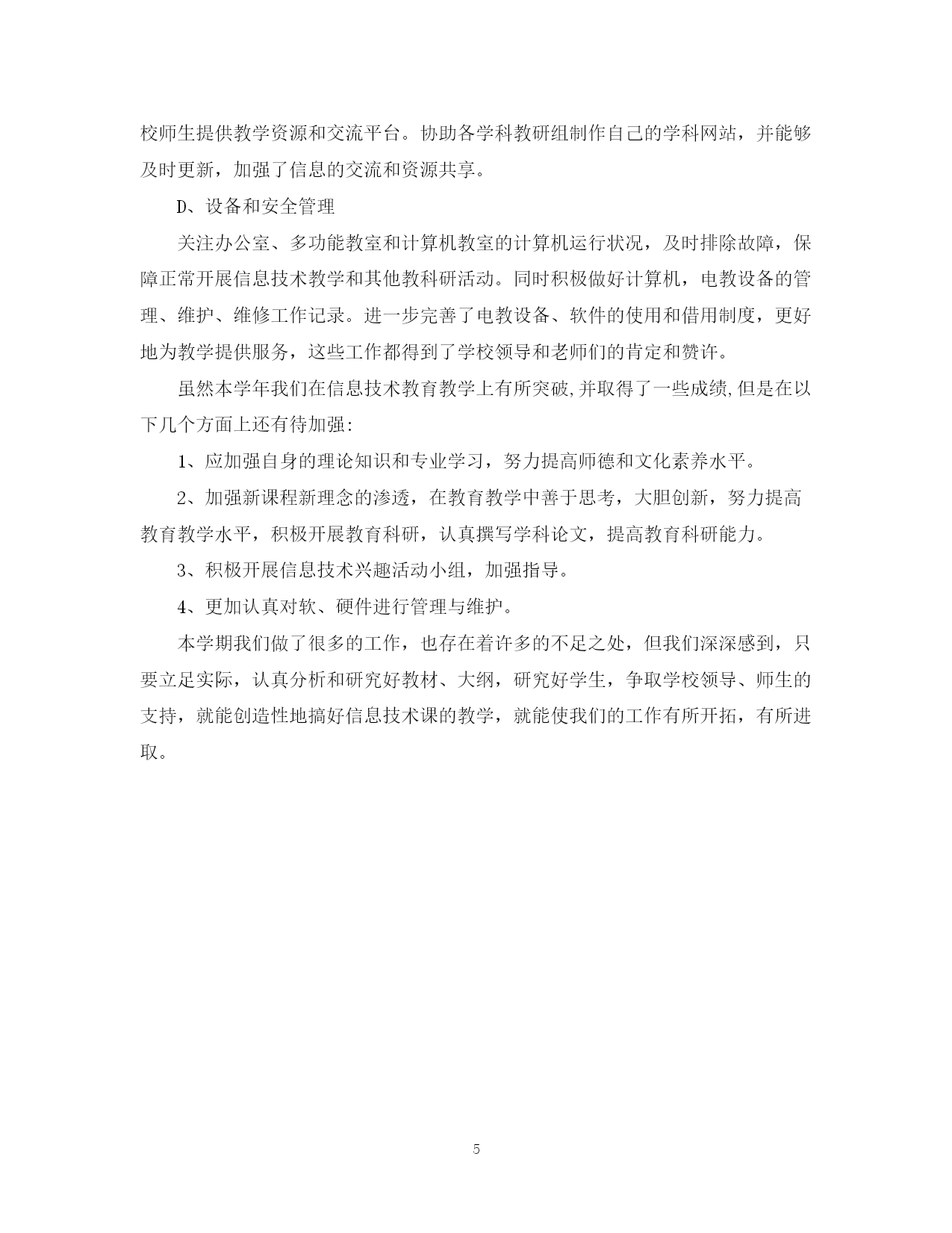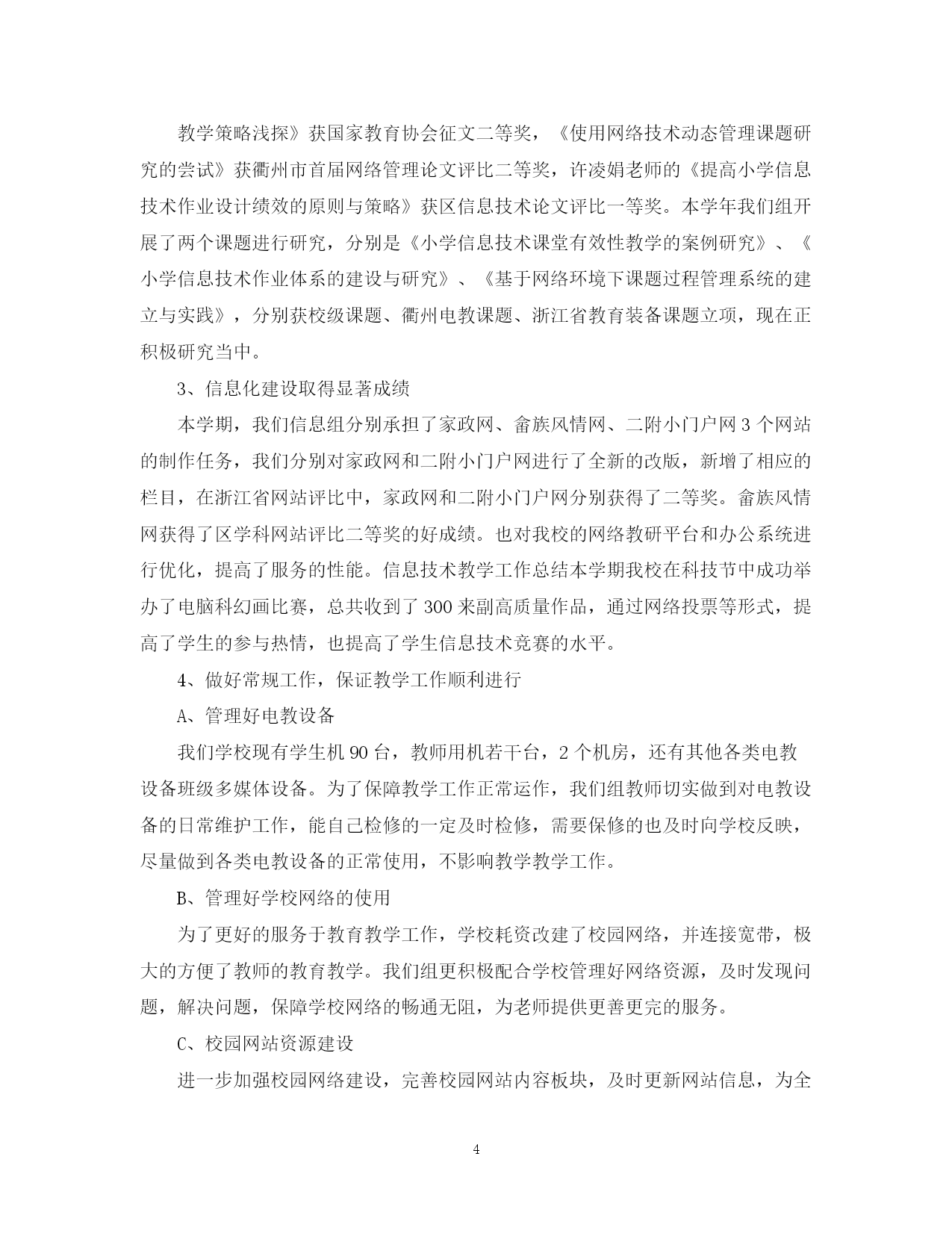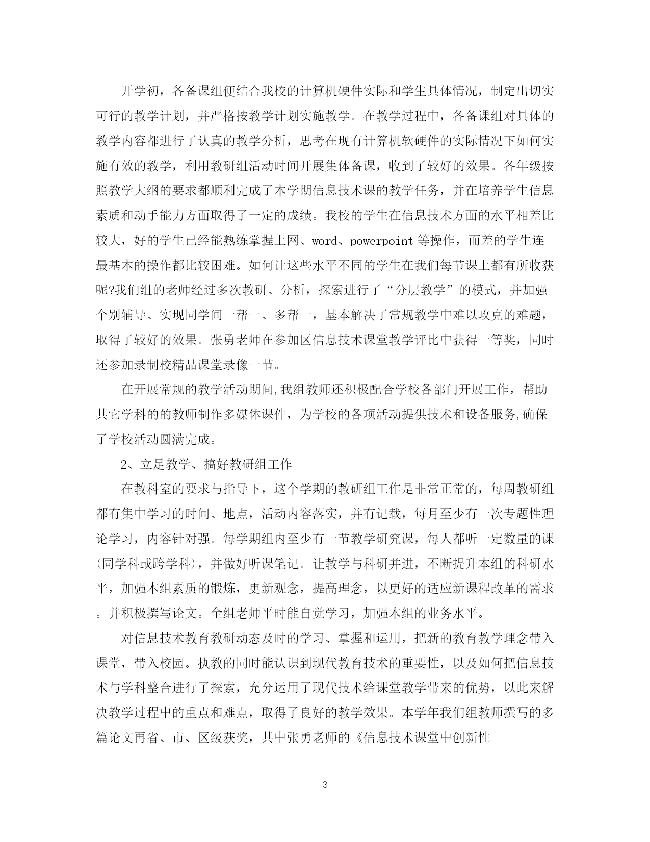 此资料由网络收集而来,如有侵权请告知上传者立即删除。资料共分享,我们负责传递知识。PAGEPAGE520XX年最新信息技术教研组工作总结一年时间真的是过得飞快,你今年的年度工作总结开始写了没?下面是小编搜集整理的2019最新信息技术教研组工作总结,欢迎阅读,供大家参考和借鉴!【信息技术教研组工作总结(一)】学期第二学期信息技术教研组工作总结一学期来,我们信息技术组,在上级主管部门和学校领导的正确指导下,全体组员团结合作,在完成规定的信息技术学科的教学工作外,认真负责地做好学校信息技术相关各方面管理工作,包括校园网络、微机室和多媒体教室的管理,学生数据处理等。现将一学期来的工作总结如下:一、加强政治学习,促进科组建设本学期来,全体组员认真贯彻依法治校、依法执教的各项工作,认真学习《教师法》、《教育法》等法律法规,不断增强科组成员的师德修养,认真学习贯彻学校的各种教学管理制度,切实落实好各项规章制度的执行工作,增强组成员的凝聚力和工作热情,积极探索开展各项工作的方法措施,为本组各项工作的顺利开展提供了根本保证。二、加强课堂教学,注重培养学生信息技术素质。积极开发教学资源,认真研究我校学生的情况和教学设备的情况,针对信息技术课教学内容变化大、经验少、学生基础差别大等特点,认真探讨,制定教学计划、课时计划、教学组织管理方法、设备合理使用方法,充分发掘我校现有教学设备资源,积极使用现代教学手段,认真进行备课,使课程教学得以顺利进行,并为今后的教学积累了一定的经验。针对信息技术课堂纪律管理困难的具体情况,认真讨论研究课堂管理方法,加强课堂管理,提高教学质量。教师之间互相听课,从而增强教师之间互相学习、互相促进,不断改进和完善教学方法,提高教学质量。还积极参与各级各类的业务竞赛,金国平老师在6月份的基本功比赛中,获苏州市一等奖。三、充分发挥我们的优势,提高学校办学的信息化发展的水平。作为信息技术教师,应走在学校信息技术发展的前沿,除了搞好信息技术教育教学外,我们还担负着许多其它的任务。我们主动帮助其他学科老师制作课件,管理和维护学校的计算机硬件、网络设备、各种电教设备的维护、摄影、摄像;学校网站的升级维护、电教软件的征订、保管、借用;学校闭路电视系统、广播系统的维护、使用;都能不折不扣地完成,受到一致好评。同时服从学校领导的安排,为教务处、校办公室认真做好学校文件和数据的录入处理等非课务工作,其中包括中考报名信息的录入处理、学生档案等。还参与了初三英语听力、口语的人机对话,网上志愿的填报,网上中招等工作。四、积极组织学生参加各级各类信息技术竞赛及各种科技竞赛。本学期我们教研组还承担了参加市级科技模型比赛的训练和参赛任务,通过第二课堂和其它课余时间对参赛学生进行辅导,并组织好学生参加市航模、风筝、赛车模型、快艇比赛等。组织学生参与的“网上安全知识竞赛”获得了2个二等奖和8个三等奖。五、积极参与学校教科研活动本组的2名教师都是学校课题组的成员,平时注重教科研活动,有一篇论文送“蓝天杯”参评。常熟市的微型课题:提高农村初中电教设备使用率和使用效果的研究,在正常开展中。信息技术教学工作总结随着信息技术软硬件的发展,作为一名信息技术教师,不仅仅要搞好教学,还必需跟上信息技术发展形势,我们经常钻研各种软硬件知识和技术,切实掌握包括各种软件使用、网页设计、程序设计、网络系统技术,努力提高自己业务水平,为学校信息化发展作出应有的贡献。总之,我校信息技术教研工作在本学年中,做了很具体的一些工作,起到了把现代信息技术运用到教育教学中的作用。在今后的工作中,还要不断努力,及时获取外地的一些先进科学的管理经验,把我校的现代教育技术推向一个新的起点。【信息技术教研组工作总结(二)】忙忙碌碌,一学年的工作即将结束,本学期,我们信息技术组的三位老师在这个学期,立足岗位,团结协作,求真求实,教书育人,顺利而圆满地完成了各项教育教学任务,并且不断更新知识、提高自身素质。现将这个学期教研组工作总结如下:1、立足实际、搞好教学。开学初,各备课组便结合我校的计算机硬件实际和学生具体情况,制定出切实可行的教学计划,并严格按教学计划实施教学。在教学过程中,各备课组对具体的教学内容都进行了认真的教学分析,思考在现有计算机软硬件的实际情况下如何实施有效的教学,利用教研组活动时间开展集体备课,收到了较好的效果。各年级按照教学大纲的要求都顺利完成了本学期信息技术课的教学任务,并在培养学生信息素质和动手能力方面取得了一定的成绩。我校的学生在信息技术方面的水平相差比较大,好的学生已经能熟练掌握上网、word、powerpoint等操作,而差的学生连最基本的操作都比较困难。如何让这些水平不同的学生在我们每节课上都有所收获呢?我们组的老师经过多