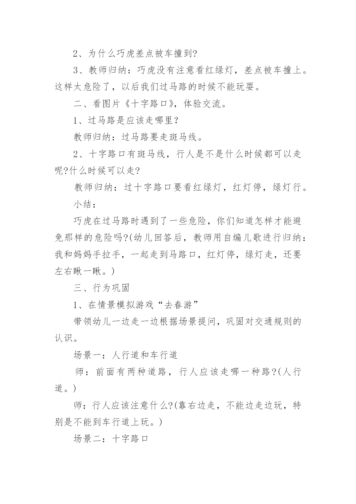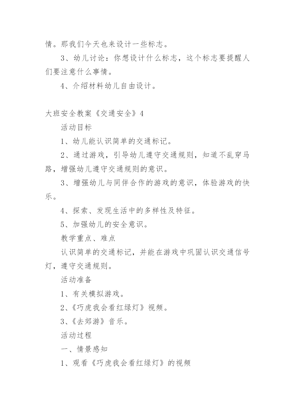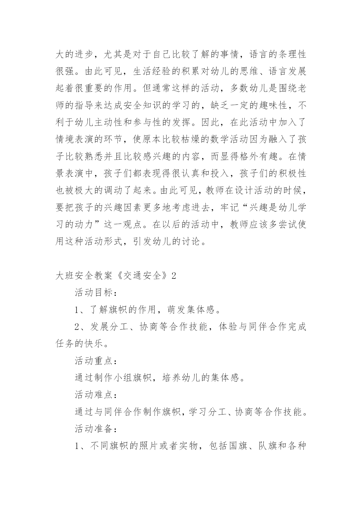 大班安全教案《交通安全》在教学工作者实际的教学活动中,通常会被要求编写教案,教案是实施教学的主要依据,有着至关重要的作用。教案应该怎么写才好呢?下面是小编为大家收集的大班安全教案《交通安全》,欢迎阅读,希望大家能够喜欢。大班安全教案《交通安全》1活动目标:1、让幼儿在交流活动中认识一些常见的交通标志。2、让幼儿在游戏活动中体验交通规则的重要性,从而自觉地遵守交通规则。3、让幼儿在合作学习中学得一些基本的学习方法。4、增强安全意识,克制自己的好奇心,不去危险的地方玩耍。5、知道哪些地方存在危险,不能去玩耍。活动准备:1、精心布置活动场景。2、收集各种交通标志(照片或图片)。3、字卡:交通安全、红灯停,绿灯行、人行道、非机动车道、汽车道。活动过程:(一)展开联想,揭示活动主题1、出示交通事故图片,请幼儿仔细观察。提问:孩子们,刚才你们看到了什么?想到了什么?2、多么可怕的车祸,为了不让这样的事情再发生,我们一定要注意交通安全。(出示字卡“交通安全”)(二)在活动中体会交通规则的重要性1、孩子们,看看我们坐的队形像什么?十字路口的学问可多了,现在我们就在十字路口做个游戏。老师请出三个司机,三个骑车的以及五个行人。参加游戏活动的孩子听到老师说完“开始”之后,立即向自己的对面出发。其他孩子仔细观察,看看会发生什么事情?(1)孩子们,刚才你们看到了什么?你们想说什么?(2)如果生活中也是这样可不行啊!为什么会发生这种情况呢?(3)(教师拿出信号灯标志)这是什么?谁能编句儿歌来说说信号灯的作用。(将标志贴在黑板上)幼儿回答后出示字卡“红灯停,绿灯行”。2、认识了红绿灯,我们还要知道自己应该走哪条路,这就要知道每条路的名称。孩子们,看看这个十字路口,你认识这些道路吗?(人行道、非机动车道、汽车道)(三)初步了解常见交通标志的作用(出示交通标志)在车辆穿梭的马路上,除了信号灯这个交通标志外,还有很多交通标志,这些交通标志都有什么用呢?(四)现场指挥1、刚才我们认识的交通标志对维护交通安全起着重要的作用。车辆的顺畅,人们的生命安全,更离不开交通警察。老师向交警叔叔学了一些指挥交通的本领,请小朋友仔细看,猜一猜是什么意思。2、老师来当交通警察,请小朋友站在这个十字路口,听警察叔叔的指挥,一起动一动吧!(五)评价幼儿游戏情况,结束。儿童安全小知识:1.增强红绿灯意识.红绿灯是设在街道路口的交通信号装置.`红灯停,绿灯行'按信号灯的指示通行,起步时向左右两边看是否有来车,然后从人行横道横过马路.自觉地接受交通信号的指挥.2.学龄前儿童过马路要让大人牵引.不要让儿童单独上街.他们如在街道或公路上行走,必须有成年人带领.3.不要在车辆临近时突然横过马路.人的大脑从接受外界信号到是否决定停步到最后停下来有一个过程.汽车也是这样,当紧急制动时也有一个过程;再加上行驶的汽车有惯性,不能一刹即停.最安全之策,只能是:不要在汽车临近时突然横穿马路.4.不要扒车.一些小孩出于好奇,常常利用车辆起步、上坡、减速时扒车,或作游戏或以扒车代步.这样很容易跌倒或摔伤.甚至造成生命危险.活动反思:孩子们对交通安全有一定的认知,能较客观的认定其他人行为的对与错。在活动中,幼儿的`语言表达能力有了很大的进步,尤其是对于自己比较了解的事情,语言的条理性很强。由此可见,生活经验的积累对幼儿的思维、语言发展起着很重要的作用。但通常这样的活动,多数幼儿是围绕老师的指导来达成安全知识的学习的,缺乏一定的趣味性,不利于幼儿主动性和参与性的发挥。因此,在此活动中加入了情境表演的环节,使原本比较枯燥的数学活动因为融入了孩子比较熟悉并且比较感兴趣的内容,而显得格外有趣。在情景表演中,孩子们都表现得很认真和投入,孩子们的积极性也被极大的调动了起来。由此可见,教师在设计活动的时候,要把孩子的兴趣因素更多地考虑进去,牢记“兴趣是幼儿学习的动力”这一观点。在以后的活动中,教师应该多尝试使用这种活动形式,引发幼儿的讨论。大班安全教案《交通安全》2活动目标:1、了解旗帜的作用,萌发集体感。2、发展分工、协商等合作技能,体验与同伴合作完成任务的快乐。活动重点:通过制作小组旗帜,培养幼儿的集体感。活动难点:通过与同伴合作制作旗帜,学习分工、协商等合作技能。活动准备:1、不同旗帜的照片或者实物,包括国旗、队旗和各种彩旗。2、活动前已带幼儿参观过挂在广场、机关等处的旗帜。3、以小组为单位进行比赛的场地及比赛项目。4、废旧纸板、白纸、彩笔、剪刀、胶水等工具和材料。活动过程:1、出示各种气质的实物或照片,引发幼儿的兴趣。教师出示国旗、少先队队旗以及收集到的其他国家的国旗、运动会的彩旗等实物或照片,请幼儿欣赏。教师:你知道这是什么旗吗?你在什么地方见过它?教师:小朋友还看见过什么样的旗帜?是在什么地方见到的?让幼儿结合生