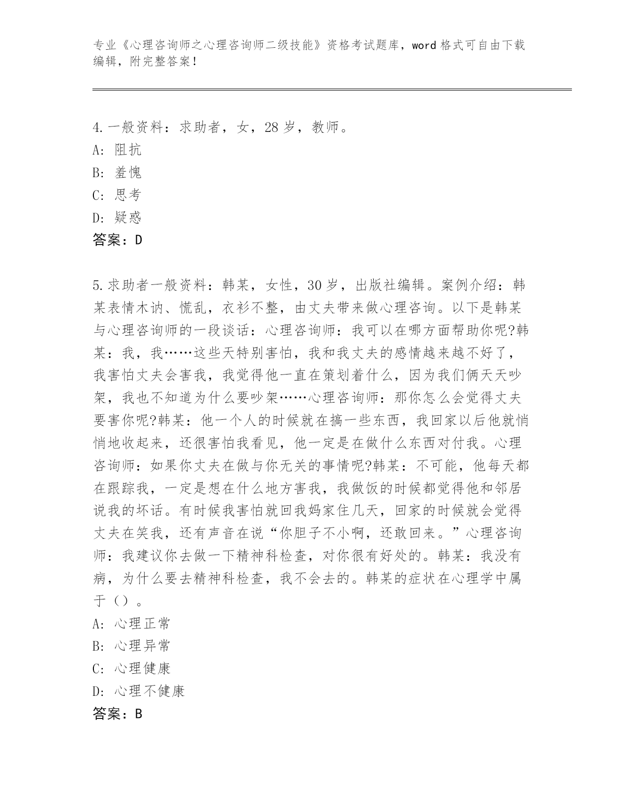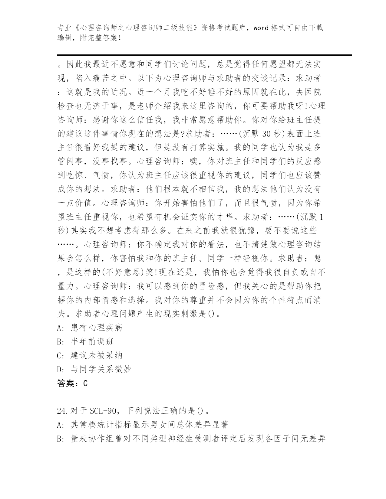 河南省范县2024《心理咨询师之心理咨询师二级技能》资格考试完整版(名校卷)
