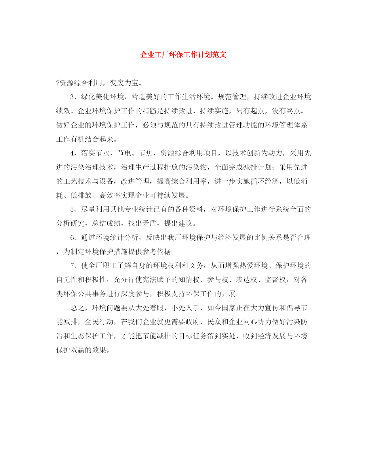 此资料由网络收集而来,如有侵权请告知上传者立即删除。资料共分享,我们负责传递知识。企业工厂环保工作计划范文?资源综合利用,变废为宝。3、绿化美化环境,营造美好的工作生活环境。规范管理,持续改进企业环境绩效。企业环境保护工作的精髓是持续改进、持续实施,只有起点,没有终点。做好企业的环境保护工作,必须与规范的具有持续改进管理功能的环境管理体系工作有机结合起来。4、落实节水、节电、节焦、资源综合利用项目,以技术创新为动力,采用先进的污染治理技术,治理生产过程排放的污染物,全面完成减排计划;采用先进的工艺技术与设备,改进管理,提高综合利用率,进一步实施循环经济,以低消耗、低排放、高效率实现企业可持续发展。5、尽量利用其他专业统计已有的各种资料,对环境保护工作进行系统全面的分析研究,总结成绩,找出矛盾,提出建议。6、通过环境统计分析,反映出我厂环境保护与经济发展的比例关系是否合理,为制定环境保护措施提供参考依据。7、使全厂职工了解自身的环境权利和义务,从而增强热爱环境、保护环境的自觉性和积极性,充分行使宪法赋予的知情权、参与权、表达权、监督权,对各类环保公共事务进行深度参与,积极支持环保工作的开展。总之,环境问题要从大处着眼,小处入手,如今国家正在大力宣传和倡导节能减排,全民行动,在我们企业就更需要政府、民众和企业同心协力做好污染防治和生态保护工作,才能把节能减排的目标任务落到实处,收到经济发展与环境保护双赢的效果。