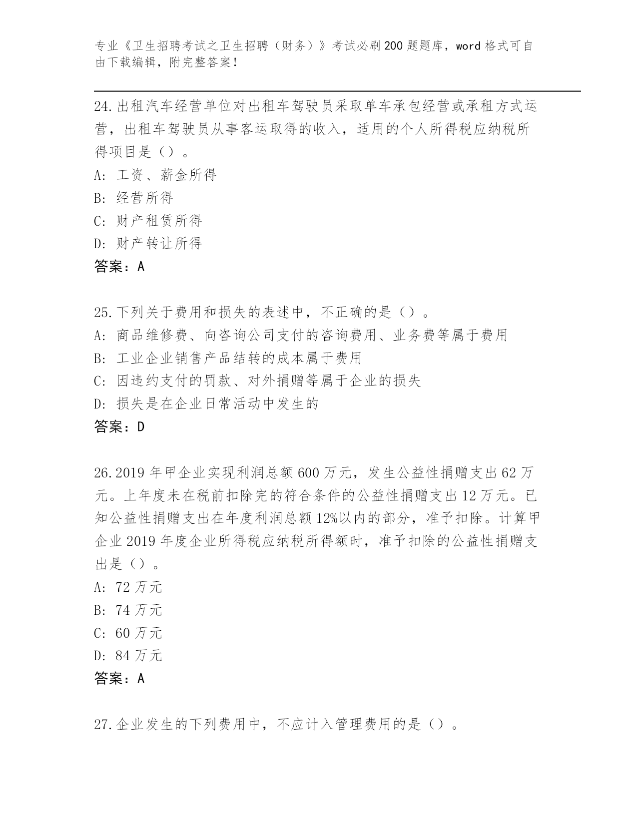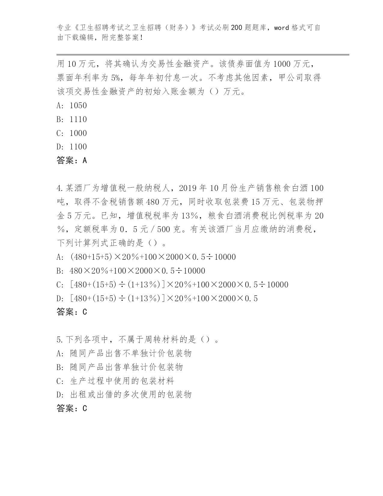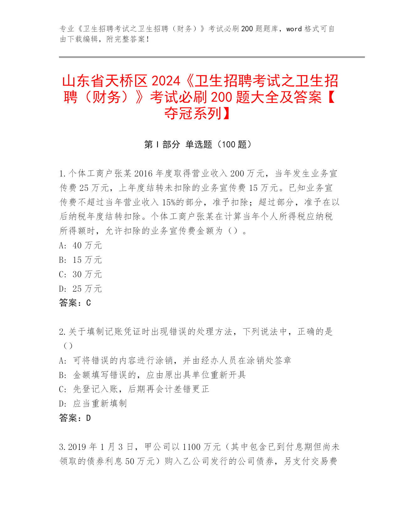 山东省天桥区2024《卫生招聘考试之卫生招聘(财务)》考试必刷200题大全及答案【夺冠系列】