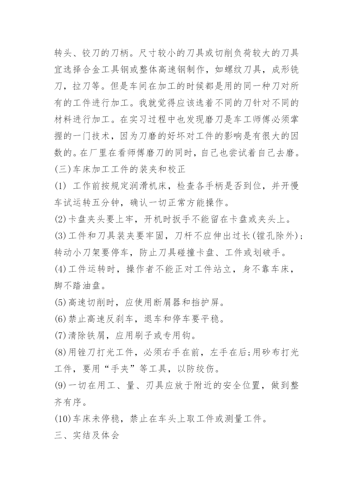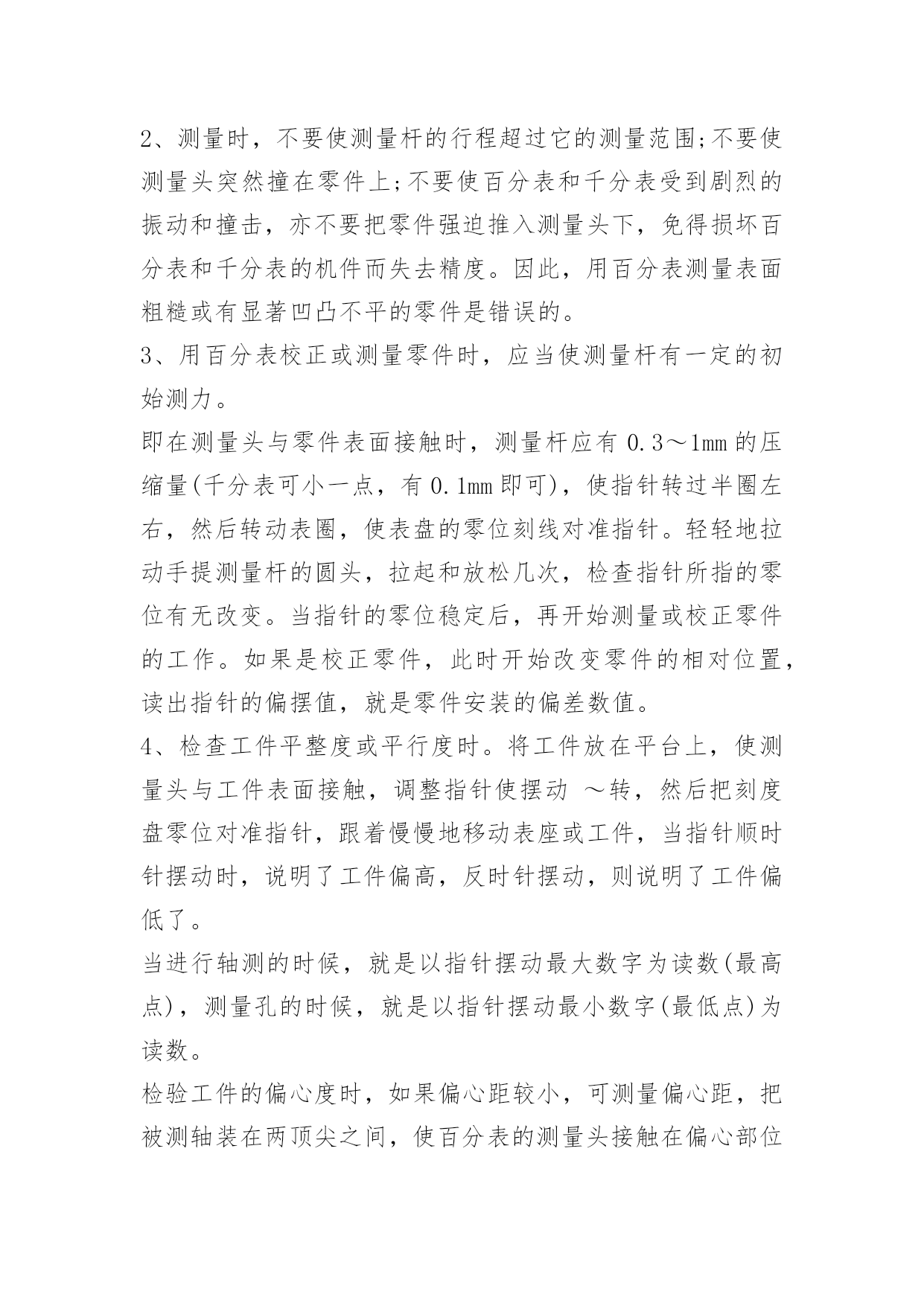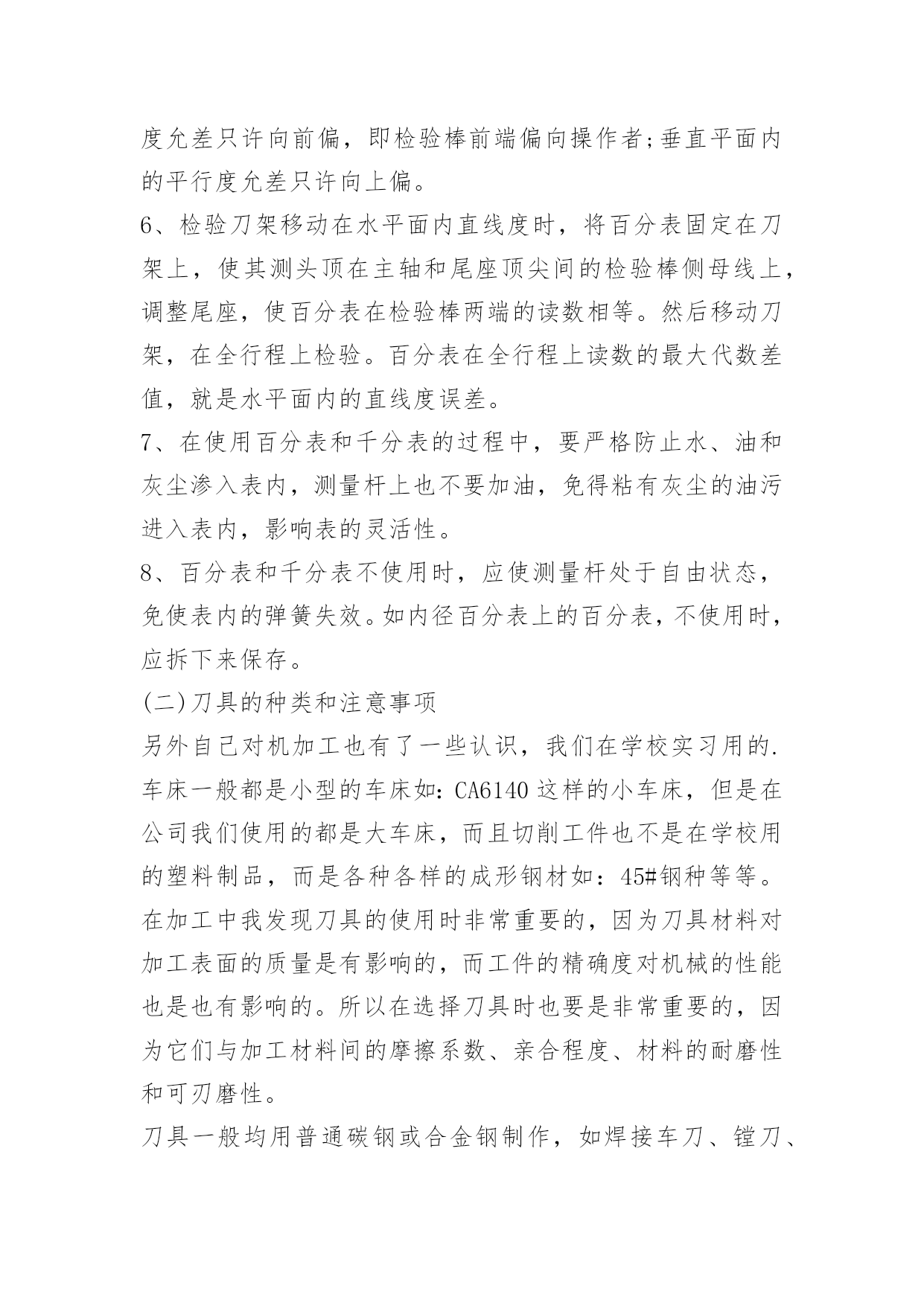 机电一体化认知实习小结机电一体化认知实习小结时间飞快,还有四个月我就要大学毕业了,我的大学生活也就要结束了。回想昨日仿佛就在眼前,但是时间在我们指尖如流水悄悄的流走!而我们也即将踏上社会,走上自己的工作岗位!我们知道机械制造业是一个国家最基础的行业,也决定了一个国家制造业的整体水平,起步早,但发展又最令人担忧,比如现在中国的汽车工业相比机械制造业来说无论是产品质量还是生产效率都要高得多,当然这也是因为机械行业的特性起了决定性的因素。对于我们机电一体化专业的学生们来说,或对于作为将来从事机械,机电制造方面业务的我们来说,去机械制造公司实习对我们来说非常重要。一、实习目的通过在重冶的实习,可以使我们在实践中接触与本专业相关的一些实际工作,培养和锻炼我们综合运用所学的基础理论、基本技能和专业知识,去独立分析和解决实际问题的能力,把理论和实践结合起来,提高我们的实际动手能力,为将来我们毕业后走上工作岗位打下一定的基础。二、实习内容(一)量具当中百分表、千分尺在机加工中的使用1、使用前,应检查测量杆活动的灵活性。即轻轻推动测量杆时,测量杆在套筒内的移动要灵活,没有任何轧卡现象,且每次放松后,指针能回复到原来的刻度位置。2、测量时,不要使测量杆的行程超过它的测量范围;不要使测量头突然撞在零件上;不要使百分表和千分表受到剧烈的振动和撞击,亦不要把零件强迫推入测量头下,免得损坏百分表和千分表的机件而失去精度。因此,用百分表测量表面粗糙或有显著凹凸不平的零件是错误的。3、用百分表校正或测量零件时,应当使测量杆有一定的初始测力。即在测量头与零件表面接触时,测量杆应有0.3~1mm的压缩量(千分表可小一点,有0.1mm即可),使指针转过半圈左右,然后转动表圈,使表盘的零位刻线对准指针。轻轻地拉动手提测量杆的圆头,拉起和放松几次,检查指针所指的零位有无改变。当指针的零位稳定后,再开始测量或校正零件的工作。如果是校正零件,此时开始改变零件的相对位置,读出指针的偏摆值,就是零件安装的偏差数值。4、检查工件平整度或平行度时。将工件放在平台上,使测量头与工件表面接触,调整指针使摆动~转,然后把刻度盘零位对准指针,跟着慢慢地移动表座或工件,当指针顺时针摆动时,说明了工件偏高,反时针摆动,则说明了工件偏低了。当进行轴测的时候,就是以指针摆动最大数字为读数(最高点),测量孔的时候,就是以指针摆动最小数字(最低点)为读数。检验工件的偏心度时,如果偏心距较小,可测量偏心距,把被测轴装在两顶尖之间,使百分表的测量头接触在偏心部位上(最高点),用手转动轴,百分表上指示出的最大数字和最小数字(最低点)之差的就等于偏心距的实际尺寸。偏心套的偏心距也可用上述方法来测量,但必须将偏心套装在心轴上进行测量。偏心距较大的工件,因受到百分表测量范围的限制,就不能用上述方法测量。这时可用间接测量偏心距的方法。测量时,把V形铁放在平板上,并把工件放在V形铁中,转动偏心轴,用百分表测量出偏心轴的最高点,找出最高点后,工件固定不动。再用百分表水平移动,测出偏心轴外圆到基准外圆之间的距离a,然后用下式计算出偏心距e:偏心距的间接测量方法式中e——偏心距(mm);D——基准轴外径(mm);d——偏心轴直径(mm);a——基准轴外圆到偏心轴外圆之间最小距离(mm)。用上述方法,必须把基准轴直径和偏心轴直径用百分尺测量出正确的实际尺寸,否则计算时会产生误差。5、检验车床主轴轴线对刀架移动平行度时,在主轴锥孔中插入一检验棒,把百分表固定在刀架上,使百分表测头触及检验棒表面。移动刀架,分别对侧母线A和上母线B进行检验,记录百分表读数的最大差值。为消除检验棒轴线与旋转轴线不重合对测量的影响,必须旋转主轴180o,再同样检验一次A、B的误差分别计算,两次测量结果的代数和之半就是主轴轴线对刀架移动的平行度误差。要求水平面内的平行度允差只许向前偏,即检验棒前端偏向操作者;垂直平面内的平行度允差只许向上偏。6、检验刀架移动在水平面内直线度时,将百分表固定在刀架上,使其测头顶在主轴和尾座顶尖间的检验棒侧母线上,调整尾座,使百分表在检验棒两端的读数相等。然后移动刀架,在全行程上检验。百分表在全行程上读数的最大代数差值,就是水平面内的直线度误差。7、在使用百分表和千分表的过程中,要严格防止水、油和灰尘渗入表内,测量杆上也不要加油,免得粘有灰尘的油污进入表内,影响表的灵活性。8、百分表和千分表不使用时,应使测量杆处于自由状态,免使表内的弹簧失效。如内径百分表上的百分表,不使用时,应拆下来保存。(二)刀具的种类和注意事项另外自己对机加工也有了一些认识,我们在学校实习用的.车床一般都是小型的车床如:CA6140这样的小车床,但是在公司我们使用的都是大车床,而且切削工件也不是在学校用的塑料制品,而是各种各样的成形钢材如:45