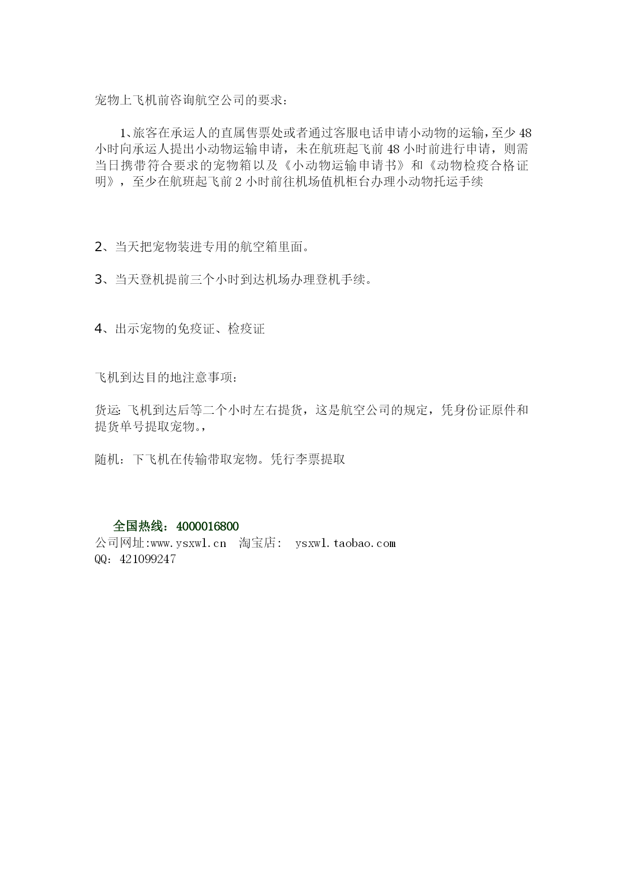 现在宠物越来越宝贵了,宠物也是一家子的成员,带宠物旅游、出县、移民的人越来越多,很多人出县的同时,也想把自己心爱的宠物带到自己身边。宠物出县,宠物移民是一个长期甚至'艰苦'的过程,你需要不厌其烦地准备到宠物医院、航空公司的要求和资料,而且每个城市的要求往往都不尽相同。一、运输方式要求:宠物托运一般有两种方式:航空托运和火车托运。火车托运要求必须有人跟车方可办理;航空托运较火车托运安全、快捷,一般狗狗主人都选择航空托运。航空托运又分为两种方式:单独货运和随机行李托运,单独货运可以不要求主人随机,只需收货人到目的地凭身份证及货运单号提取即可。二、运输容器要求既要便于装卸又要适合动物特性和航空运输的要求,能防止动物破坏、逃逸和接触外界,保证通风,防止动物窒息。包装底部应有防止粪便外溢的设施。一般情况下:南航航班必须使用塑胶航空箱,规格有:48*33*33cm、61*41*40cm、67*51*47cm、79*59*58cm、100*68*82cm;其它航空公司可使用铁丝笼,规格有:46.5*30.5*39cm、59.5*43*51cm、75.5*46.5*55cm、90*57*66cm。按航空公司要求:狗狗在笼或箱内必须能直立,且能自由转身。三、证件要求航空托运和火车托运均需办理证件:动物健康免疫证明、动物检疫证明、运输器械消毒证明。免疫证在当地宠物医院办理,检疫证和消毒证在当地所在区动物检疫所办理。动物检疫所要求:需托运的狗狗必须打完疫苗(开动物健康免疫证明)半个月后,以检疫无不良反应后才能开取后两个证明。四、登机前要求因部分狗狗会晕机,故托运当天,不要给狗狗进食,只需喂水即可;如在秋冬季节托运狗狗到北方,记得登机前给狗狗们穿好衣服,防止北方天气突然变冷,狗狗不适。五、提货要求飞机起飞后,我们会立即将航班号\货运单号\抵达时间等相关信息告知狗狗主人和收货人。飞机落地后2小时左右,收货人凭本人身份证及收到的货运单号到机场货运窗口即可.宠物上飞机前咨询航空公司的要求:1、旅客在承运人的直属售票处或者通过客服电话申请小动物的运输,至少48小时向承运人提出小动物运输申请,未在航班起飞前48小时前进行申请,则需当日携带符合要求的宠物箱以及《小动物运输申请书》和《动物检疫合格证明》,至少在航班起飞前2小时前往机场值机柜台办理小动物托运手续2、当天把宠物装进专用的航空箱里面。3、当天登机提前三个小时到达机场办理登机手续。4、出示宠物的免疫证、检疫证飞机到达目的地注意事项:货运:飞机到达后等二个小时左右提货,这是航空公司的规定,凭身份证原件和提货单号提取宠物。,随机:下飞机在传输带取宠物。凭行李票提取全国热线:4000016800公司网址:www.ysxwl.cn淘宝店:ysxwl.taobao.comQQ:421099247