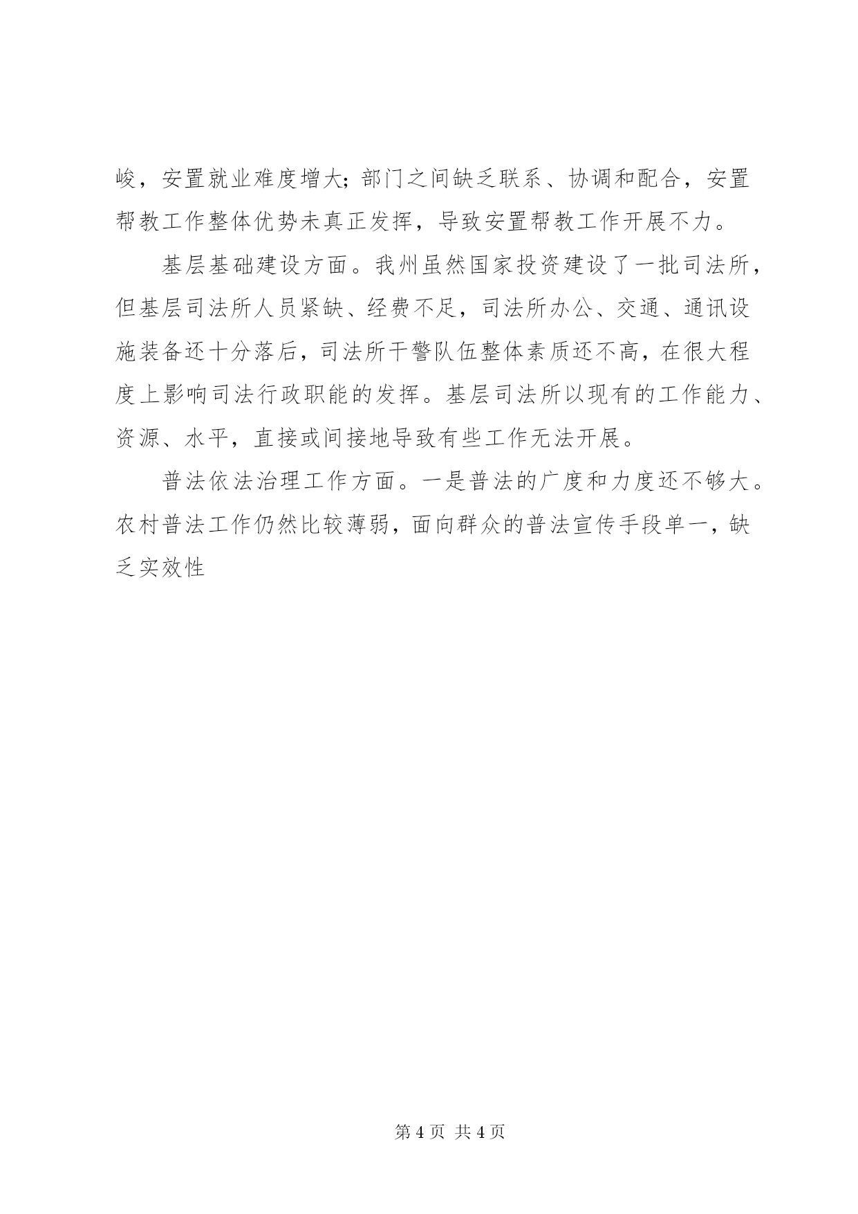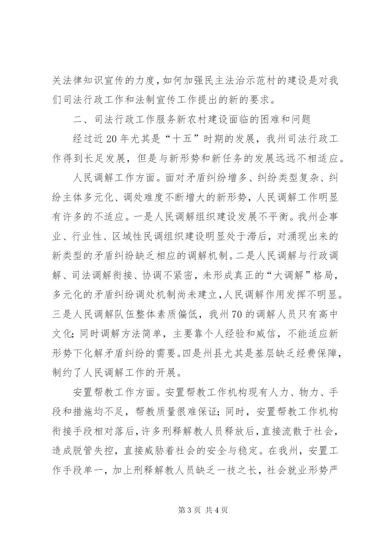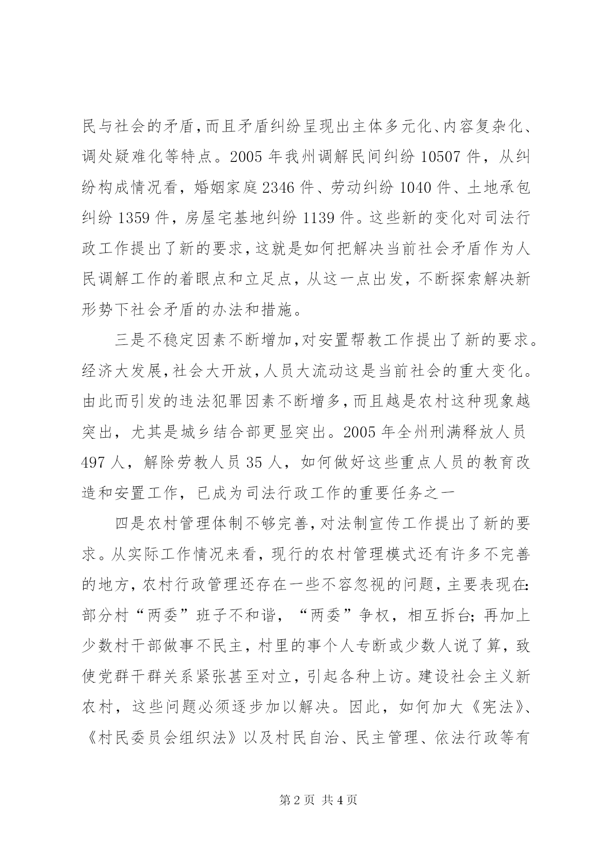 第PAGE\*Arabic\*MERGEFORMAT4页共NUMPAGES\*MERGEFORMAT4页发挥司法行政职能服务新农村建设党的十六届五中全会把建设社会主义新农村作为全面建设小康社会的重大战略部署,意义非同一般。湘西州司法行政机关要发挥自身的优势,按照生产发展、生活宽裕、乡风文明、村容整洁、管理民主的要求,致力于全州新农村建设。一、农村的社会变化对司法行政工作提出新的要求一是改革发展的力度加大,对法律服务工作提出了新的要求。随着市场经济体制的逐步完善和社会转型的深化,城乡差距逐步扩大,农村社会经济发展较城市相比相对缓慢,社会各项事业和基础建设与城市相比相对薄弱。因此,党中央的一系列决议都把农村的经济发展作为重中之重。从中央的决策看,整个“十一五”期间,国家对“三农问题”的投入不断扩大,这些投入将主要集中在村以下,农村各项建设将不断升温,社会主义新农村建设将全面展开。因此,律师、公证等法律服务工作如何面向基层发展,找准服务的位置,为基层建设服务,为新农村建设服务,已成为司法行政工作需要进一步研究和探讨的新课题。二是人民内部矛盾已成为影响社会稳定的突出问题。当前正处于社会转型期,随着改革开放的不断深化,特别是农村生产方式、农民从业方式的转变,农村的矛盾和问题与过去相比出现了较大差异。由原来的村民之间、村民与集体之间的矛盾扩展到村民与社会的矛盾,而且矛盾纠纷呈现出主体多元化、内容复杂化、调处疑难化等特点。2005年我州调解民间纠纷10507件,从纠纷构成情况看,婚姻家庭2346件、劳动纠纷1040件、土地承包纠纷1359件,房屋宅基地纠纷1139件。这些新的变化对司法行政工作提出了新的要求,这就是如何把解决当前社会矛盾作为人民调解工作的着眼点和立足点,从这一点出发,不断探索解决新形势下社会矛盾的办法和措施。三是不稳定因素不断增加,对安置帮教工作提出了新的要求。经济大发展,社会大开放,人员大流动这是当前社会的重大变化。由此而引发的违法犯罪因素不断增多,而且越是农村这种现象越突出,尤其是城乡结合部更显突出。2005年全州刑满释放人员497人,解除劳教人员35人,如何做好这些重点人员的教育改造和安置工作,已成为司法行政工作的重要任务之一四是农村管理体制不够完善,对法制宣传工作提出了新的要求。从实际工作情况来看,现行的农村管理模式还有许多不完善的地方,农村行政管理还存在一些不容忽视的问题,主要表现在:部分村“两委”班子不和谐,“两委”争权,相互拆台;再加上少数村干部做事不民主,村里的事个人专断或少数人说了算,致使党群干群关系紧张甚至对立,引起各种上访。建设社会主义新农村,这些问题必须逐步加以解决。因此,如何加大《宪法》、《村民委员会组织法》以及村民自治、民主管理、依法行政等有关法律知识宣传的力度,如何加强民主法治示范村的建设是对我们司法行政工作和法制宣传工作提出的新的要求。二、司法行政工作服务新农村建设面临的困难和问题经过近20年尤其是“十五”时期的发展,我州司法行政工作得到长足发展,但是与新形势和新任务的发展远远不相适应。人民调解工作方面。面对矛盾纠纷增多、纠纷类型复杂、纠纷主体多元化、调处难度不断增大的新形势,人民调解工作明显有许多的不适应。一是人民调解组织建设发展不平衡。我州企事业、行业性、区域性民调组织建设明显处于滞后,对涌现出来的新类型的矛盾纠纷缺乏相应的调解机制。二是人民调解与行政调解、司法调解衔接、协调不紧密,未形成真正的“大调解”格局,多元化的矛盾纠纷调处机制尚未建立,人民调解作用发挥不明显。三是人民调解队伍整体素质偏低,我州70的调解人员只有高中文化;同时调解方法简单,主要靠个人经验和威信,不能适应新形势下化解矛盾纠纷的需要。四是州县尤其是基层缺乏经费保障,制约了人民调解工作的开展。安置帮教工作方面。安置帮教工作机构现有人力、物力、手段和措施均不足,帮教质量很难保证;同时,安置帮教工作机构衔接手段相对落后,许多刑释解教人员释放后,直接流散于社会,造成脱管失控,直接威胁着社会的安全与稳定。在我州,安置工作手段单一,加上刑释解教人员缺乏一技之长,社会就业形势严峻,安置就业难度增大;部门之间缺乏联系、协调和配合,安置帮教工作整体优势未真正发挥,导致安置帮教工作开展不力。基层基础建设方面。我州虽然国家投资建设了一批司法所,但基层司法所人员紧缺、经费不足,司法所办公、交通、通讯设施装备还十分落后,司法所干警队伍整体素质还不高,在很大程度上影响司法行政职能的发挥。基层司法所以现有的工作能力、资源、水平,直接或间接地导致有些工作无法开展。普法依法治理工作方面。一是普法的广度和力度还不够大。农村普法工作仍然比较薄弱,面向群众的普法宣传手段单一,缺乏实效性