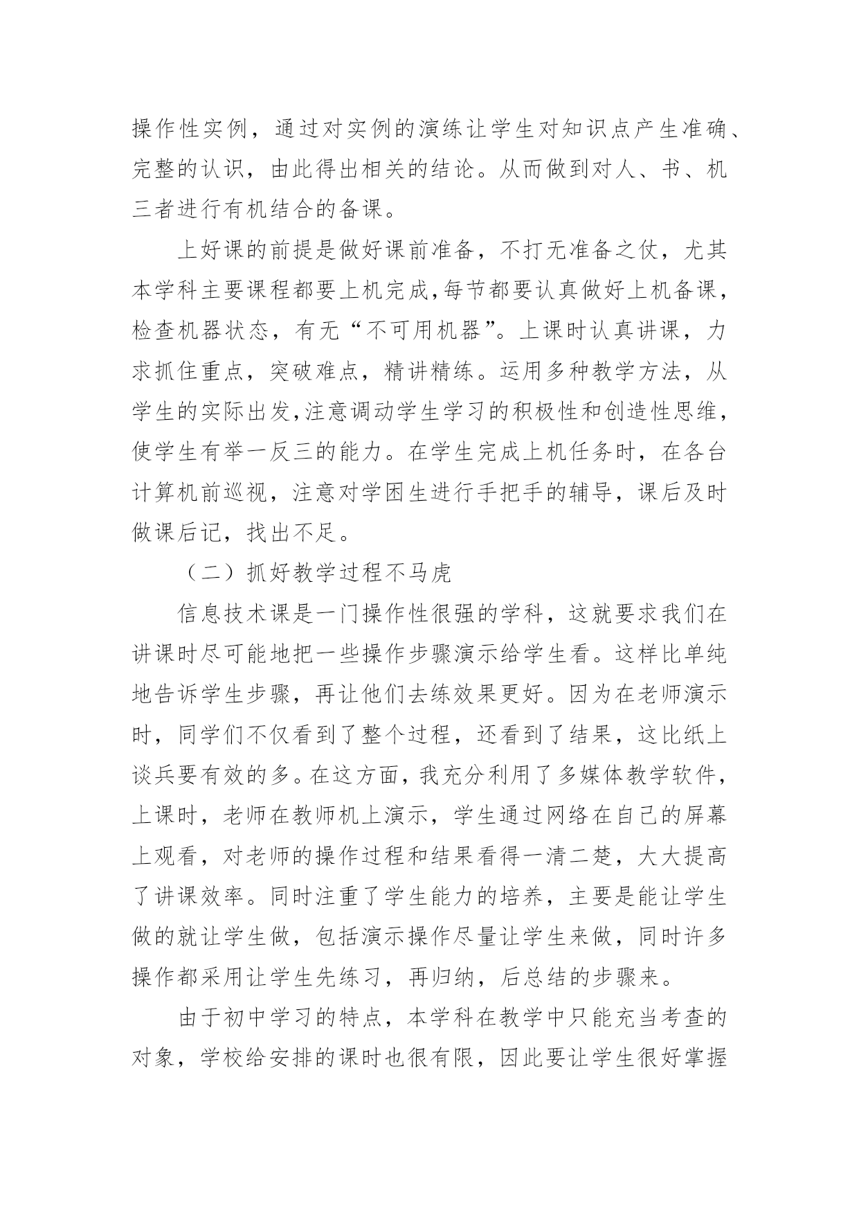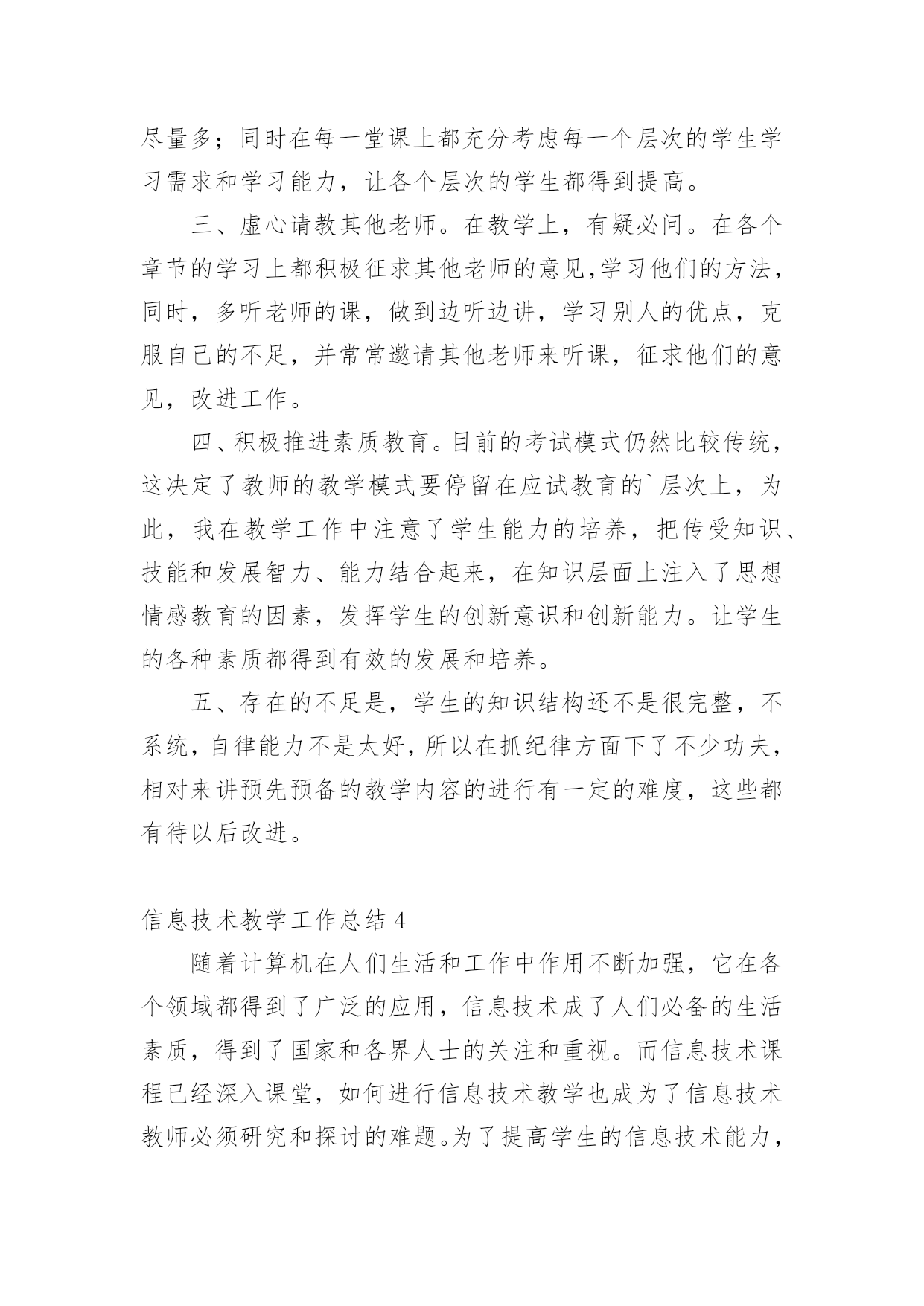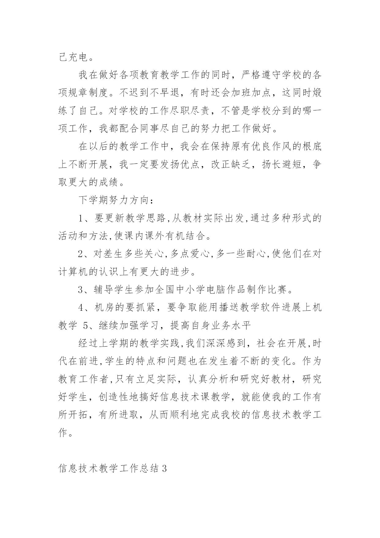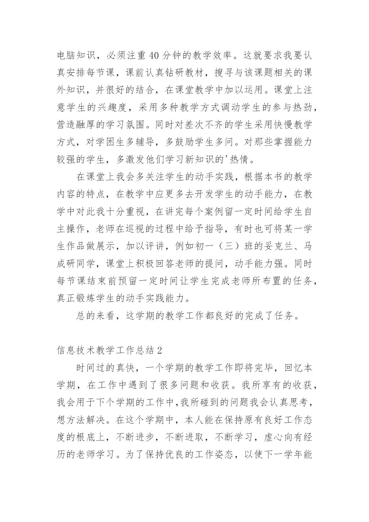 信息技术教学工作总结总结是把一定阶段内的有关情况分析研究,做出有指导性的经验方法以及结论的书面材料,它是增长才干的一种好办法,因此,让我们写一份总结吧。我们该怎么去写总结呢?下面是小编为大家收集的信息技术教学工作总结,仅供参考,大家一起来看看吧。信息技术教学工作总结1一、思想政治方面积极参加政治学习,提高自己的政治素质和理论素养,注重自己思想道德水平的提高。平时积极参加学校组织的各类会议及本组开展的教研活动,积极参加升旗仪式。遵守教师职业道德,时刻注意自己的一言一行,维护教师形象,为人师表。在日常生活中,以真诚与人交往,和其他老师们团结协作,愉快的开展工作。二、教学工作,一丝不苟(一)搞好备课备课对于每门课程的教学而言,都是必不可少的环节,信息技术学科教学也不例外。在备课的过程中,我首先对所要教授的知识进行全面的研究、归纳、总结,并根据教授对象的不同特点找到教授的最佳方法与方式。在此基础上将所备内容在计算机上进行逐一推敲、验证、演练,以使一些空洞的知识具有可操作性;同时,还将每个知识点构造成一个操作性实例,通过对实例的演练让学生对知识点产生准确、完整的认识,由此得出相关的结论。从而做到对人、书、机三者进行有机结合的备课。上好课的前提是做好课前准备,不打无准备之仗,尤其本学科主要课程都要上机完成,每节都要认真做好上机备课,检查机器状态,有无“不可用机器”。上课时认真讲课,力求抓住重点,突破难点,精讲精练。运用多种教学方法,从学生的实际出发,注意调动学生学习的积极性和创造性思维,使学生有举一反三的能力。在学生完成上机任务时,在各台计算机前巡视,注意对学困生进行手把手的辅导,课后及时做课后记,找出不足。(二)抓好教学过程不马虎信息技术课是一门操作性很强的学科,这就要求我们在讲课时尽可能地把一些操作步骤演示给学生看。这样比单纯地告诉学生步骤,再让他们去练效果更好。因为在老师演示时,同学们不仅看到了整个过程,还看到了结果,这比纸上谈兵要有效的多。在这方面,我充分利用了多媒体教学软件,上课时,老师在教师机上演示,学生通过网络在自己的屏幕上观看,对老师的操作过程和结果看得一清二楚,大大提高了讲课效率。同时注重了学生能力的培养,主要是能让学生做的就让学生做,包括演示操作尽量让学生来做,同时许多操作都采用让学生先练习,再归纳,后总结的步骤来。由于初中学习的特点,本学科在教学中只能充当考查的对象,学校给安排的课时也很有限,因此要让学生很好掌握电脑知识,必须注重40分钟的教学效率。这就要求我要认真安排每节课,课前认真钻研教材,搜寻与该课题相关的课外知识,并很好的结合,在课堂教学中加以运用。课堂上注意学生的兴趣度,采用多种教学方式调动学生的参与热劲,营造融厚的学习氛围。同时对差次不齐的学生采用快慢教学方式,对学困生多辅导,多鼓励学生多问。对那些掌握能力较强的学生,多激发他们学习新知识的'热情。在课堂上我会多关注学生的动手实践,根据本书的教学内容的特点,在教学中应更多去开发学生的动手能力,在教学中对此我十分重视,在讲完每个案例留一定时间给学生自主操作,老师在巡视的过程中给予指导,有时也可将某一学生作品做展示,加以评讲,例如初一(三)班的妥克兰、马成研同学,课堂上积极回答老师的提问,动手能力强。同时每节课结束前预留一定时间让学生完成老师所布置的任务,真正锻炼学生的动手实践能力。总的来看,这学期的教学工作都良好的完成了任务。信息技术教学工作总结2时间过的真快,一个学期的教学工作即将完毕,回忆本学期,在工作中遇到了很多问题和收获。我所享有的收获,我会用于下个学期的工作中,我所碰到的问题我会认真思考,想方法解决。在这个学期中,本人能在保持原有良好工作态度的根底上,不断进步,不断进取,不断学习,虚心向有经历的老师学习。为了保持优良的工作姿态,以使下一学年能以更优秀的面貌去继续工作。将本人这学期的工作情况进展全面的`总结,总结如下:在这学期里,我从思想上,利用师德师风教育活动端正自己;从行动上学电脑技术,学教学技能等;在生活上注意形象,为人师表。一学期来,我积极参加各种学习,努力提高自身的思想觉悟,服从学校的工作安排,默默无闻地配合领导和老师们做好校内外的各项工作,得到了领导和同事的肯定。这些肯定使我在以后的工作中变得更有信心、有动力去做好每一样工作。这学期主要的工作主要担任六年级共8个班的信息技术课的教学。作为一名信息技术老师,应具有比别人更超前的目光,及时掌握最新的科技资讯。为此,我平时还虚心请教有经历的老师,经常上网浏览新课程教学及信息技术教学等资料,学习更多、更好、更新的知识。同时积极参加教研活动,多争取时机听评课,从中学习别人的长处,领悟其中的教学艺术,努力使自己向一名科研型教师看齐。通过学校组织的听、评课活动,让我在学习中实践,在实践中提高,不断反