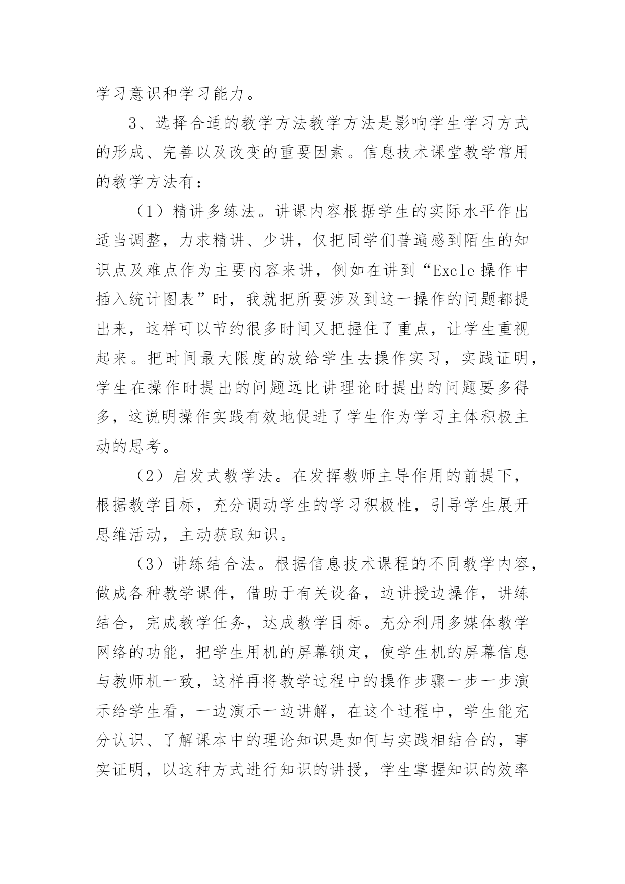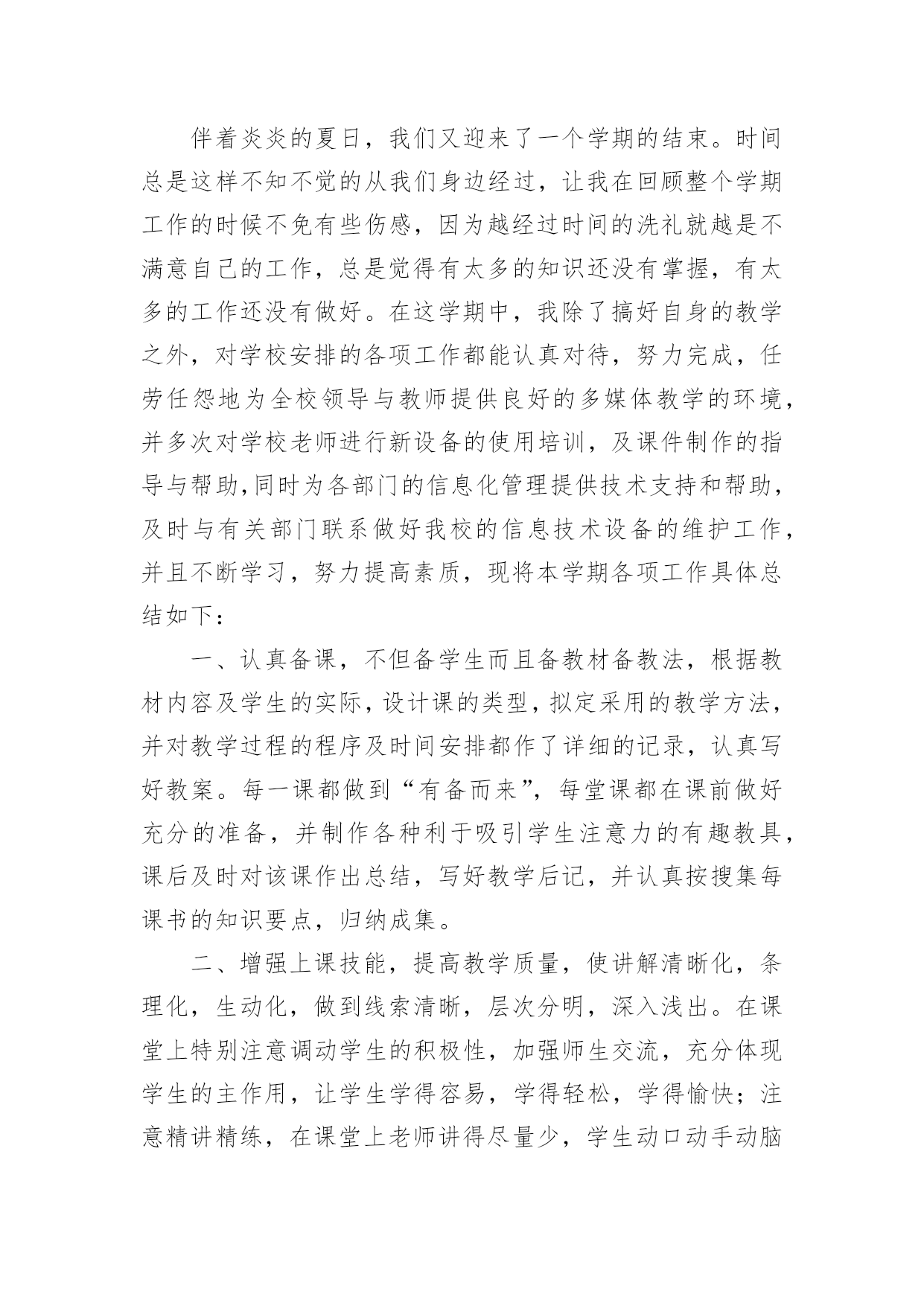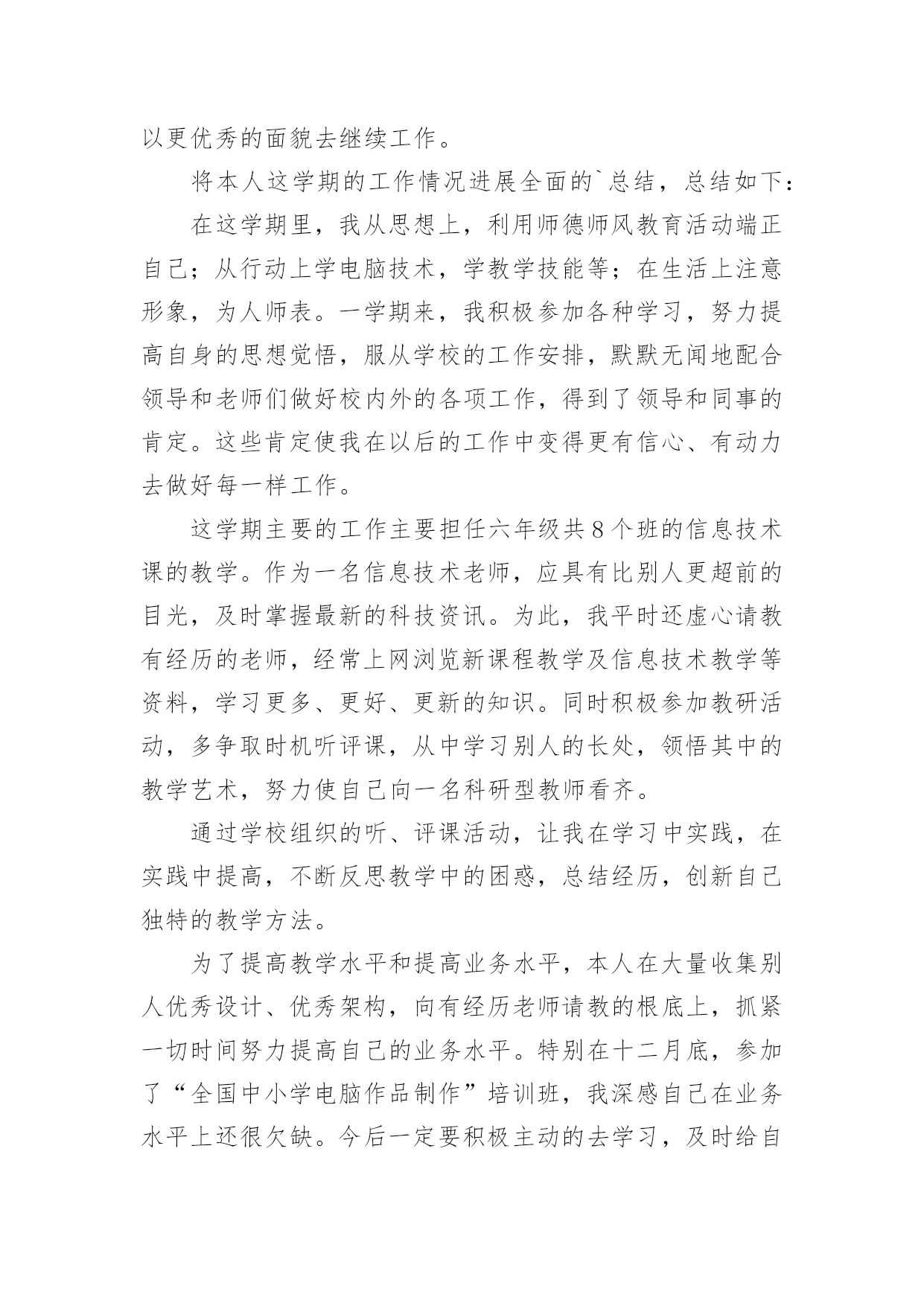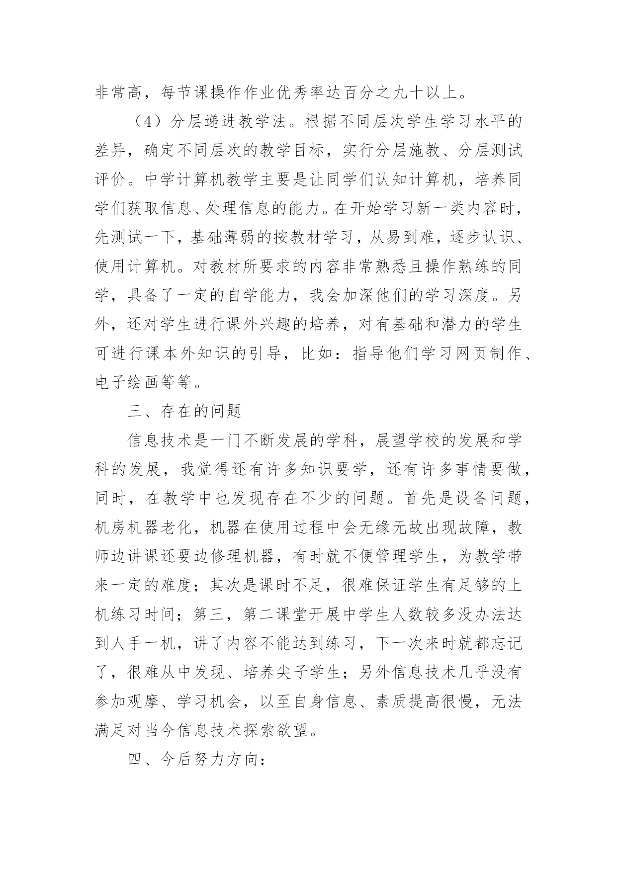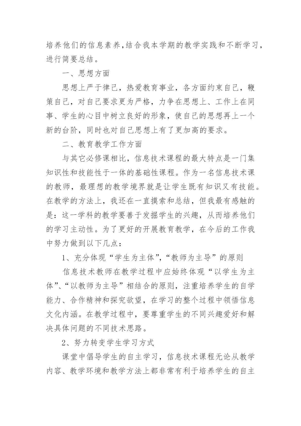 信息技术教学工作总结总结是把一定阶段内的有关情况分析研究,做出有指导性的经验方法以及结论的书面材料,它是增长才干的一种好办法,因此,让我们写一份总结吧。我们该怎么去写总结呢?下面是小编为大家收集的信息技术教学工作总结,仅供参考,大家一起来看看吧。信息技术教学工作总结1一、思想政治方面积极参加政治学习,提高自己的政治素质和理论素养,注重自己思想道德水平的提高。平时积极参加学校组织的各类会议及本组开展的教研活动,积极参加升旗仪式。遵守教师职业道德,时刻注意自己的一言一行,维护教师形象,为人师表。在日常生活中,以真诚与人交往,和其他老师们团结协作,愉快的开展工作。二、教学工作,一丝不苟(一)搞好备课备课对于每门课程的教学而言,都是必不可少的环节,信息技术学科教学也不例外。在备课的过程中,我首先对所要教授的知识进行全面的研究、归纳、总结,并根据教授对象的不同特点找到教授的最佳方法与方式。在此基础上将所备内容在计算机上进行逐一推敲、验证、演练,以使一些空洞的知识具有可操作性;同时,还将每个知识点构造成一个操作性实例,通过对实例的演练让学生对知识点产生准确、完整的认识,由此得出相关的结论。从而做到对人、书、机三者进行有机结合的备课。上好课的前提是做好课前准备,不打无准备之仗,尤其本学科主要课程都要上机完成,每节都要认真做好上机备课,检查机器状态,有无“不可用机器”。上课时认真讲课,力求抓住重点,突破难点,精讲精练。运用多种教学方法,从学生的实际出发,注意调动学生学习的积极性和创造性思维,使学生有举一反三的能力。在学生完成上机任务时,在各台计算机前巡视,注意对学困生进行手把手的辅导,课后及时做课后记,找出不足。(二)抓好教学过程不马虎信息技术课是一门操作性很强的学科,这就要求我们在讲课时尽可能地把一些操作步骤演示给学生看。这样比单纯地告诉学生步骤,再让他们去练效果更好。因为在老师演示时,同学们不仅看到了整个过程,还看到了结果,这比纸上谈兵要有效的多。在这方面,我充分利用了多媒体教学软件,上课时,老师在教师机上演示,学生通过网络在自己的屏幕上观看,对老师的操作过程和结果看得一清二楚,大大提高了讲课效率。同时注重了学生能力的培养,主要是能让学生做的就让学生做,包括演示操作尽量让学生来做,同时许多操作都采用让学生先练习,再归纳,后总结的步骤来。由于初中学习的特点,本学科在教学中只能充当考查的对象,学校给安排的课时也很有限,因此要让学生很好掌握电脑知识,必须注重40分钟的教学效率。这就要求我要认真安排每节课,课前认真钻研教材,搜寻与该课题相关的课外知识,并很好的结合,在课堂教学中加以运用。课堂上注意学生的兴趣度,采用多种教学方式调动学生的参与热劲,营造融厚的学习氛围。同时对差次不齐的学生采用快慢教学方式,对学困生多辅导,多鼓励学生多问。对那些掌握能力较强的学生,多激发他们学习新知识的'热情。在课堂上我会多关注学生的动手实践,根据本书的教学内容的特点,在教学中应更多去开发学生的动手能力,在教学中对此我十分重视,在讲完每个案例留一定时间给学生自主操作,老师在巡视的过程中给予指导,有时也可将某一学生作品做展示,加以评讲,例如初一(三)班的妥克兰、马成研同学,课堂上积极回答老师的提问,动手能力强。同时每节课结束前预留一定时间让学生完成老师所布置的任务,真正锻炼学生的动手实践能力。总的来看,这学期的教学工作都良好的完成了任务。信息技术教学工作总结2时间过的真快,一个学期的教学工作即将完毕,回忆本学期,在工作中遇到了很多问题和收获。我所享有的收获,我会用于下个学期的工作中,我所碰到的问题我会认真思考,想方法解决。在这个学期中,本人能在保持原有良好工作态度的根底上,不断进步,不断进取,不断学习,虚心向有经历的老师学习。为了保持优良的工作姿态,以使下一学年能以更优秀的面貌去继续工作。将本人这学期的工作情况进展全面的`总结,总结如下:在这学期里,我从思想上,利用师德师风教育活动端正自己;从行动上学电脑技术,学教学技能等;在生活上注意形象,为人师表。一学期来,我积极参加各种学习,努力提高自身的思想觉悟,服从学校的工作安排,默默无闻地配合领导和老师们做好校内外的各项工作,得到了领导和同事的肯定。这些肯定使我在以后的工作中变得更有信心、有动力去做好每一样工作。这学期主要的工作主要担任六年级共8个班的信息技术课的教学。作为一名信息技术老师,应具有比别人更超前的目光,及时掌握最新的科技资讯。为此,我平时还虚心请教有经历的老师,经常上网浏览新课程教学及信息技术教学等资料,学习更多、更好、更新的知识。同时积极参加教研活动,多争取时机听评课,从中学习别人的长处,领悟其中的教学艺术,努力使自己向一名科研型教师看齐。通过学校组织的听、评课活动,让我在学习中实践,在实践中提高,不断反