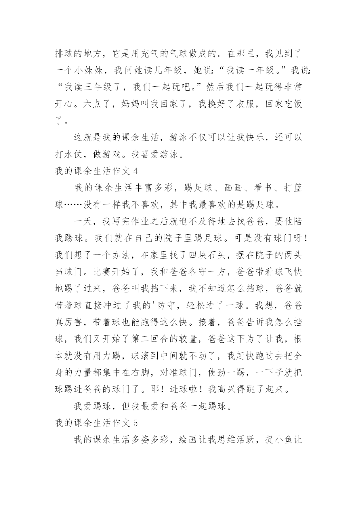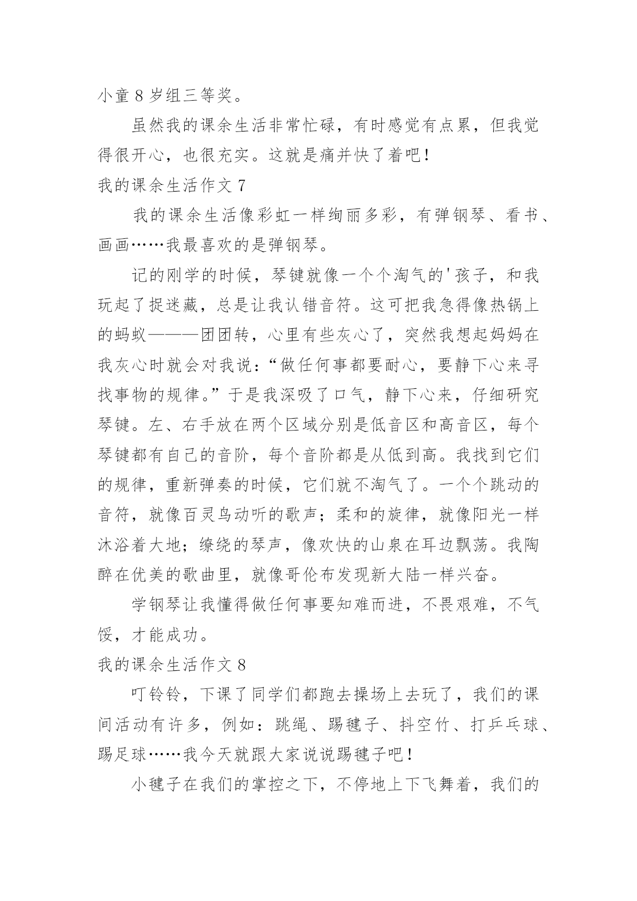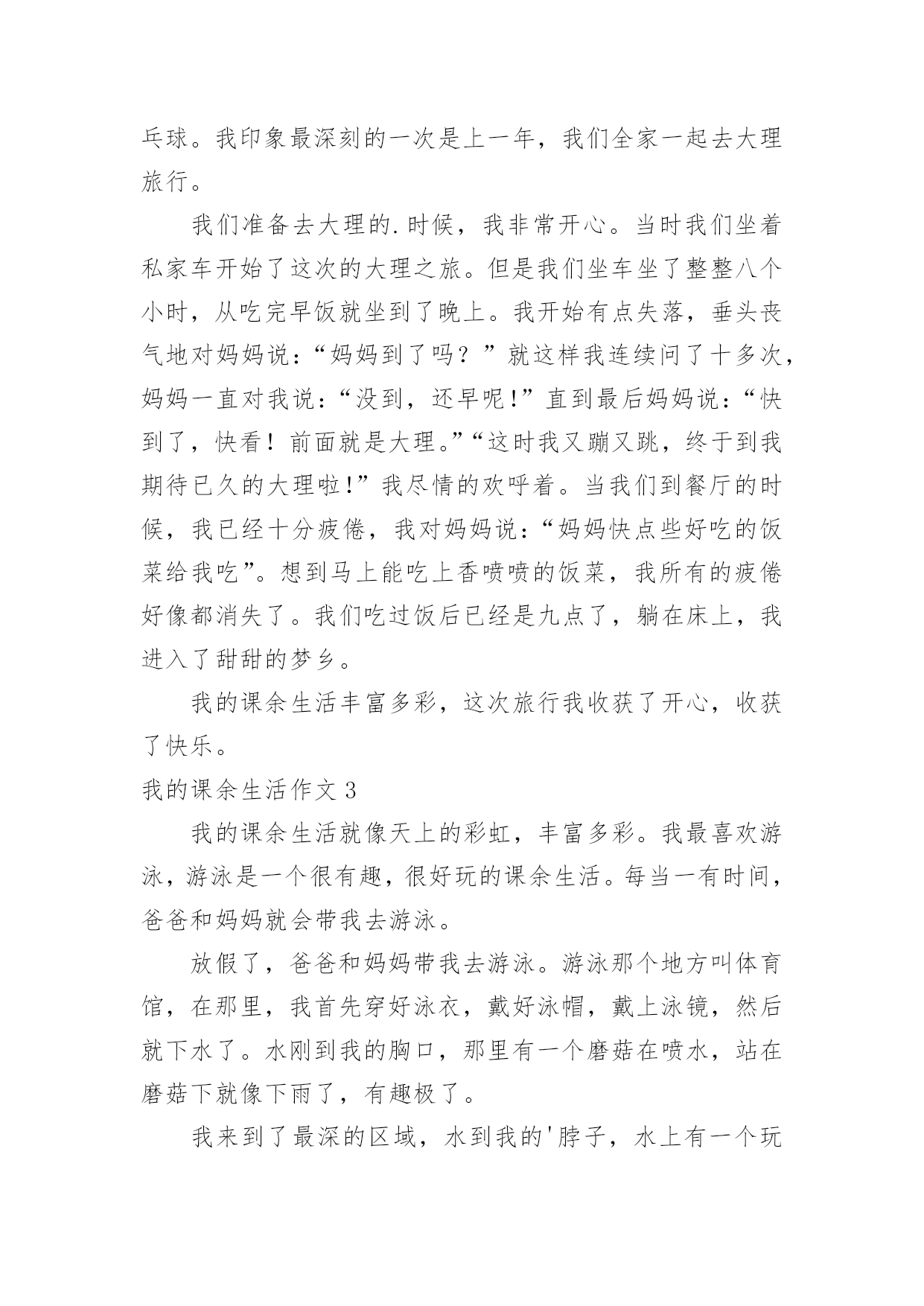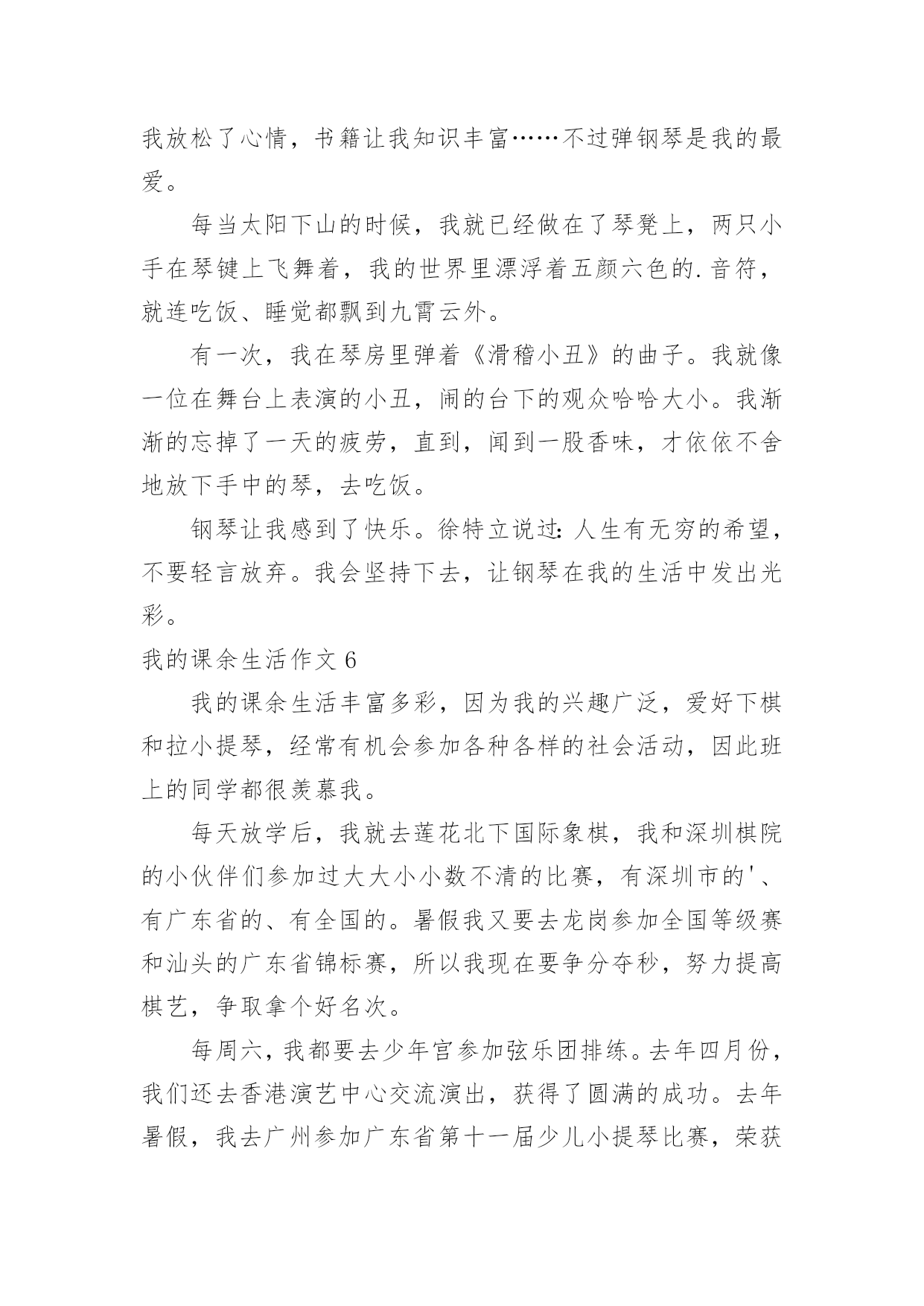 我的课余生活作文我的课余生活作文在学习、工作、生活中,大家最不陌生的就是作文了吧,借助作文人们可以实现文化交流的目的。还是对作文一筹莫展吗?下面是小编精心整理的我的课余生活作文,欢迎大家借鉴与参考,希望对大家有所帮助。我的课余生活作文1我的课余生活丰富多彩,我喜欢画画,看书,做手工······这些都是我课外喜欢的事情。看书是我最喜欢的事。告诉你吧,有时间我会让妈妈带我去读书俱乐部借书看,那里是书的海洋。现在我已经养成了不看书睡不着觉的习惯,那怕只看一眼也不会放过。我喜欢的书可多了,有《百科全书》,《十万个为什么》,《绿野仙踪》还有漫画书。画画也是我喜欢的事情。每个周六都是我爸爸送我去张鸿飞画室学国画,在哪里我学会了很多东西,如:山鸡,斗鸡老鹰。我最喜欢的还是画牡丹,因为它是粉红色的,中间还有点点的黄芯做点缀,画出来栩栩如生,特别好看。我还喜欢做手工,机器人,抽水机都是我的杰作。我的`课余生活是不是非常的丰富多彩?我的课余生活作文2我的课余生活丰富多彩,我会吹葫芦丝、打篮球、打乒乓球。我印象最深刻的一次是上一年,我们全家一起去大理旅行。我们准备去大理的.时候,我非常开心。当时我们坐着私家车开始了这次的大理之旅。但是我们坐车坐了整整八个小时,从吃完早饭就坐到了晚上。我开始有点失落,垂头丧气地对妈妈说:“妈妈到了吗?”就这样我连续问了十多次,妈妈一直对我说:“没到,还早呢!”直到最后妈妈说:“快到了,快看!前面就是大理。”“这时我又蹦又跳,终于到我期待已久的大理啦!”我尽情的欢呼着。当我们到餐厅的时候,我已经十分疲倦,我对妈妈说:“妈妈快点些好吃的饭菜给我吃”。想到马上能吃上香喷喷的饭菜,我所有的疲倦好像都消失了。我们吃过饭后已经是九点了,躺在床上,我进入了甜甜的梦乡。我的课余生活丰富多彩,这次旅行我收获了开心,收获了快乐。我的课余生活作文3我的课余生活就像天上的彩虹,丰富多彩。我最喜欢游泳,游泳是一个很有趣,很好玩的课余生活。每当一有时间,爸爸和妈妈就会带我去游泳。放假了,爸爸和妈妈带我去游泳。游泳那个地方叫体育馆,在那里,我首先穿好泳衣,戴好泳帽,戴上泳镜,然后就下水了。水刚到我的胸口,那里有一个磨菇在喷水,站在磨菇下就像下雨了,有趣极了。我来到了最深的区域,水到我的'脖子,水上有一个玩排球的地方,它是用充气的气球做成的。在那里,我见到了一个小妹妹,我问她读几年级,她说:“我读一年级。”我说:“我读三年级了,我们一起玩吧。”然后我们一起玩得非常开心。六点了,妈妈叫我回家了,我换好了衣服,回家吃饭了。这就是我的课余生活,游泳不仅可以让我快乐,还可以打水仗,做游戏。我喜爱游泳。我的课余生活作文4我的课余生活丰富多彩,踢足球、画画、看书、打篮球……没有一样我不喜欢,其中我最喜欢的是踢足球。一天,我写完作业之后就迫不及待地去找爸爸,要他陪我踢球。我们就在自己的院子里踢足球。可是没有球门呀!我们想了一个办法,在家里找了四块石头,摆在院子的两头当球门。比赛开始了,我和爸爸各守一方,爸爸带着球飞快地踢了过来,爸爸叫我挡下来,我不知道怎么挡球,爸爸就带着球直接冲过了我的'防守,轻松进了一球。我想,爸爸真厉害,带着球也能跑得这么快。接着,爸爸告诉我怎么挡球,我们又开始了第二回合的较量,爸爸这下为了让我,根本就没有用力踢,球滚到中间就不动了,我赶快跑过去把全身的力量都集中在右脚,对准球门,使劲一踢,一下子就把球踢进爸爸的球门了。耶!进球啦!我高兴得跳了起来。我爱踢球,但我最爱和爸爸一起踢球。我的课余生活作文5我的课余生活多姿多彩,绘画让我思维活跃,捉小鱼让我放松了心情,书籍让我知识丰富……不过弹钢琴是我的最爱。每当太阳下山的时候,我就已经做在了琴凳上,两只小手在琴键上飞舞着,我的世界里漂浮着五颜六色的.音符,就连吃饭、睡觉都飘到九霄云外。有一次,我在琴房里弹着《滑稽小丑》的曲子。我就像一位在舞台上表演的小丑,闹的台下的观众哈哈大小。我渐渐的忘掉了一天的疲劳,直到,闻到一股香味,才依依不舍地放下手中的琴,去吃饭。钢琴让我感到了快乐。徐特立说过:人生有无穷的希望,不要轻言放弃。我会坚持下去,让钢琴在我的生活中发出光彩。我的课余生活作文6我的课余生活丰富多彩,因为我的兴趣广泛,爱好下棋和拉小提琴,经常有机会参加各种各样的社会活动,因此班上的同学都很羡慕我。每天放学后,我就去莲花北下国际象棋,我和深圳棋院的小伙伴们参加过大大小小数不清的比赛,有深圳市的'、有广东省的、有全国的。暑假我又要去龙岗参加全国等级赛和汕头的广东省锦标赛,所以我现在要争分夺秒,努力提高棋艺,争取拿个好名次。每周六,我都要去少年宫参加弦乐团排练。去年四月份,我们还去香港演艺中心交流演出,获得了圆满的成功。去年暑假,我去广州参加广东省第十一届少儿小提琴比赛,荣获小童8岁组三等奖。虽然