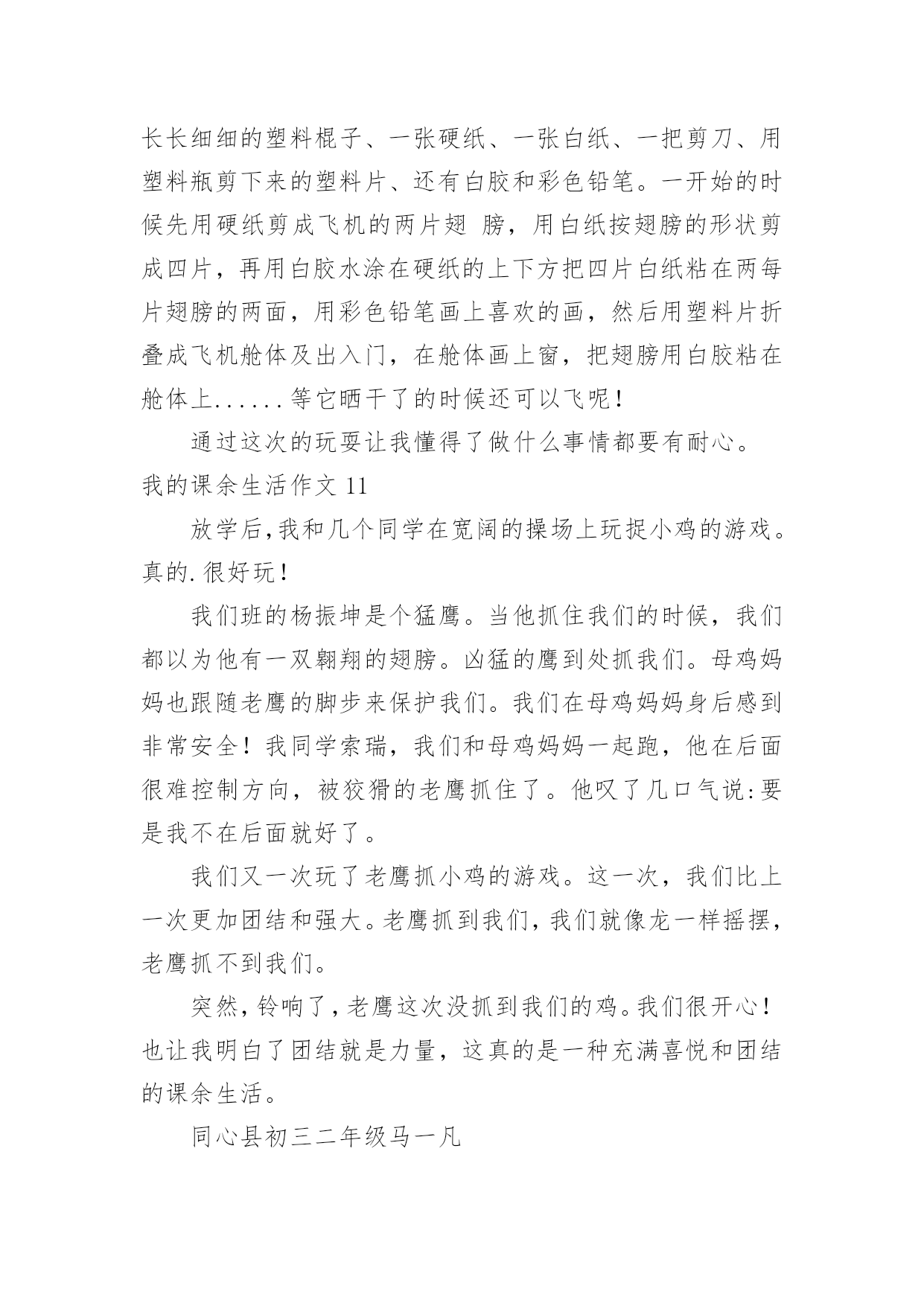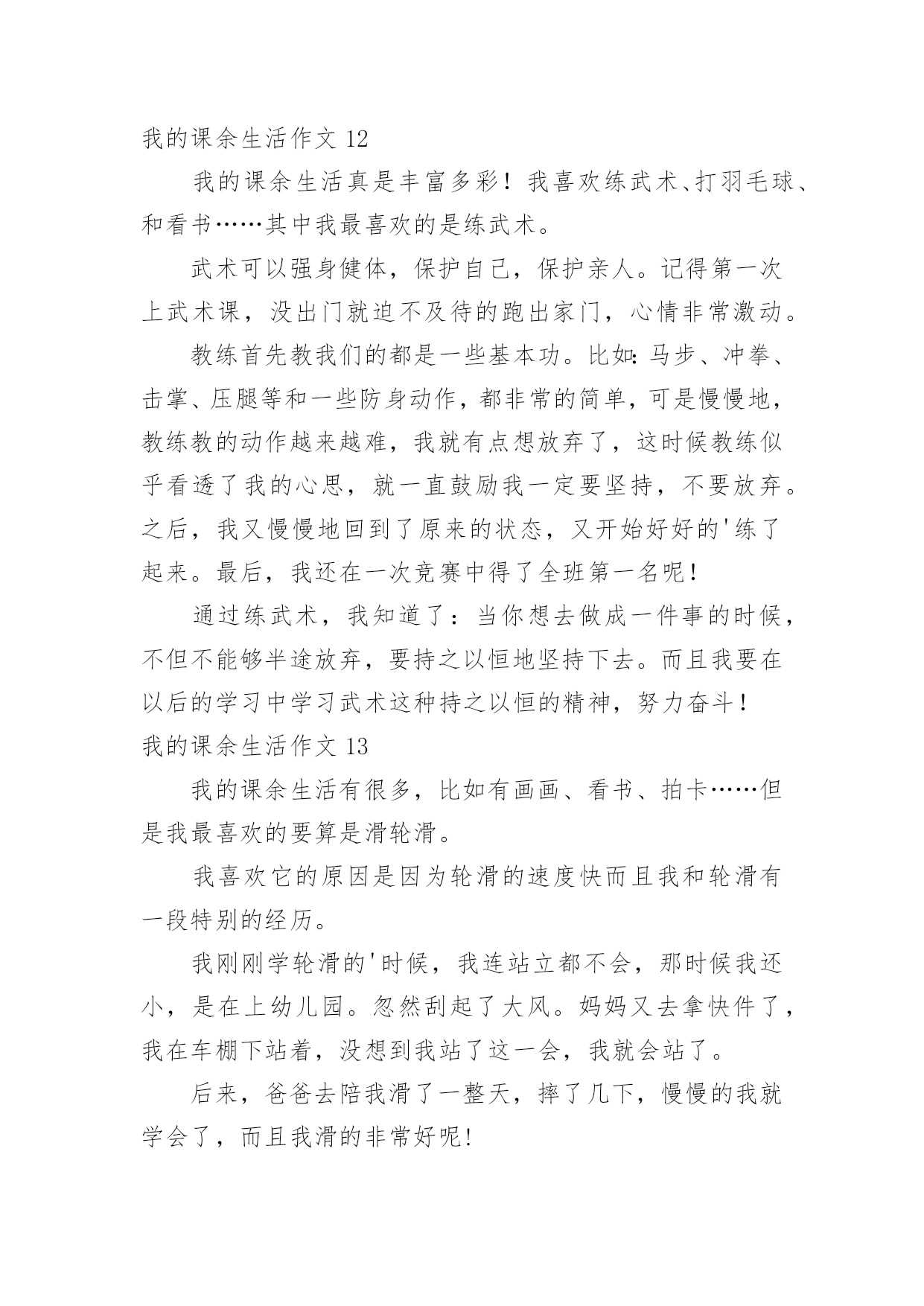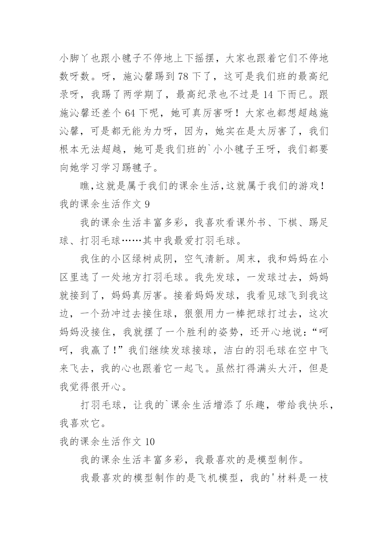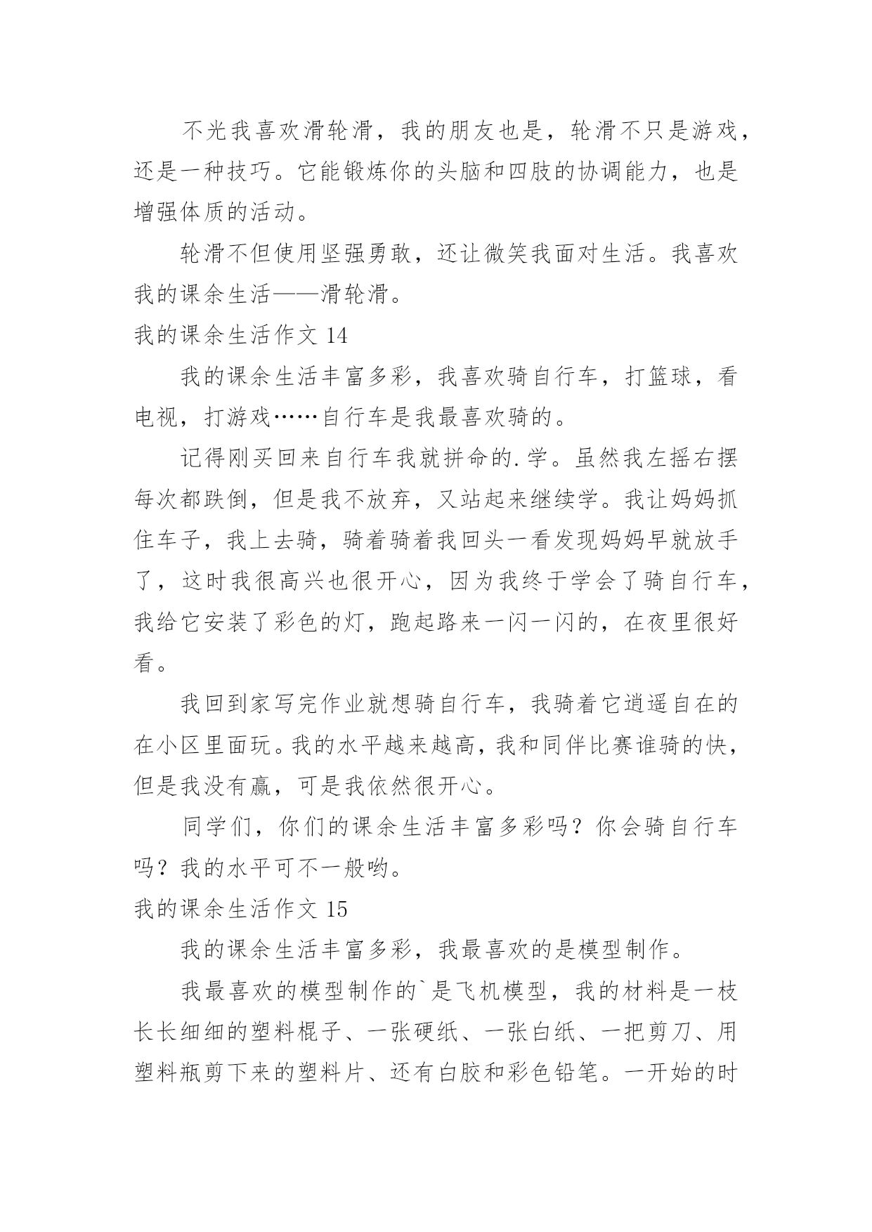 我的课余生活作文我的课余生活作文在学习、工作、生活中,大家最不陌生的就是作文了吧,借助作文人们可以实现文化交流的目的。还是对作文一筹莫展吗?下面是小编精心整理的我的课余生活作文,欢迎大家借鉴与参考,希望对大家有所帮助。我的课余生活作文1我的课余生活丰富多彩,我喜欢画画,看书,做手工······这些都是我课外喜欢的事情。看书是我最喜欢的事。告诉你吧,有时间我会让妈妈带我去读书俱乐部借书看,那里是书的海洋。现在我已经养成了不看书睡不着觉的习惯,那怕只看一眼也不会放过。我喜欢的书可多了,有《百科全书》,《十万个为什么》,《绿野仙踪》还有漫画书。画画也是我喜欢的事情。每个周六都是我爸爸送我去张鸿飞画室学国画,在哪里我学会了很多东西,如:山鸡,斗鸡老鹰。我最喜欢的还是画牡丹,因为它是粉红色的,中间还有点点的黄芯做点缀,画出来栩栩如生,特别好看。我还喜欢做手工,机器人,抽水机都是我的杰作。我的`课余生活是不是非常的丰富多彩?我的课余生活作文2我的课余生活丰富多彩,我会吹葫芦丝、打篮球、打乒乓球。我印象最深刻的一次是上一年,我们全家一起去大理旅行。我们准备去大理的.时候,我非常开心。当时我们坐着私家车开始了这次的大理之旅。但是我们坐车坐了整整八个小时,从吃完早饭就坐到了晚上。我开始有点失落,垂头丧气地对妈妈说:“妈妈到了吗?”就这样我连续问了十多次,妈妈一直对我说:“没到,还早呢!”直到最后妈妈说:“快到了,快看!前面就是大理。”“这时我又蹦又跳,终于到我期待已久的大理啦!”我尽情的欢呼着。当我们到餐厅的时候,我已经十分疲倦,我对妈妈说:“妈妈快点些好吃的饭菜给我吃”。想到马上能吃上香喷喷的饭菜,我所有的疲倦好像都消失了。我们吃过饭后已经是九点了,躺在床上,我进入了甜甜的梦乡。我的课余生活丰富多彩,这次旅行我收获了开心,收获了快乐。我的课余生活作文3我的课余生活就像天上的彩虹,丰富多彩。我最喜欢游泳,游泳是一个很有趣,很好玩的课余生活。每当一有时间,爸爸和妈妈就会带我去游泳。放假了,爸爸和妈妈带我去游泳。游泳那个地方叫体育馆,在那里,我首先穿好泳衣,戴好泳帽,戴上泳镜,然后就下水了。水刚到我的胸口,那里有一个磨菇在喷水,站在磨菇下就像下雨了,有趣极了。我来到了最深的区域,水到我的'脖子,水上有一个玩排球的地方,它是用充气的气球做成的。在那里,我见到了一个小妹妹,我问她读几年级,她说:“我读一年级。”我说:“我读三年级了,我们一起玩吧。”然后我们一起玩得非常开心。六点了,妈妈叫我回家了,我换好了衣服,回家吃饭了。这就是我的课余生活,游泳不仅可以让我快乐,还可以打水仗,做游戏。我喜爱游泳。我的课余生活作文4我的课余生活丰富多彩,踢足球、画画、看书、打篮球……没有一样我不喜欢,其中我最喜欢的是踢足球。一天,我写完作业之后就迫不及待地去找爸爸,要他陪我踢球。我们就在自己的院子里踢足球。可是没有球门呀!我们想了一个办法,在家里找了四块石头,摆在院子的两头当球门。比赛开始了,我和爸爸各守一方,爸爸带着球飞快地踢了过来,爸爸叫我挡下来,我不知道怎么挡球,爸爸就带着球直接冲过了我的'防守,轻松进了一球。我想,爸爸真厉害,带着球也能跑得这么快。接着,爸爸告诉我怎么挡球,我们又开始了第二回合的较量,爸爸这下为了让我,根本就没有用力踢,球滚到中间就不动了,我赶快跑过去把全身的力量都集中在右脚,对准球门,使劲一踢,一下子就把球踢进爸爸的球门了。耶!进球啦!我高兴得跳了起来。我爱踢球,但我最爱和爸爸一起踢球。我的课余生活作文5我的课余生活多姿多彩,绘画让我思维活跃,捉小鱼让我放松了心情,书籍让我知识丰富……不过弹钢琴是我的最爱。每当太阳下山的时候,我就已经做在了琴凳上,两只小手在琴键上飞舞着,我的世界里漂浮着五颜六色的.音符,就连吃饭、睡觉都飘到九霄云外。有一次,我在琴房里弹着《滑稽小丑》的曲子。我就像一位在舞台上表演的小丑,闹的台下的观众哈哈大小。我渐渐的忘掉了一天的疲劳,直到,闻到一股香味,才依依不舍地放下手中的琴,去吃饭。钢琴让我感到了快乐。徐特立说过:人生有无穷的希望,不要轻言放弃。我会坚持下去,让钢琴在我的生活中发出光彩。我的课余生活作文6我的课余生活丰富多彩,因为我的兴趣广泛,爱好下棋和拉小提琴,经常有机会参加各种各样的社会活动,因此班上的同学都很羡慕我。每天放学后,我就去莲花北下国际象棋,我和深圳棋院的小伙伴们参加过大大小小数不清的比赛,有深圳市的'、有广东省的、有全国的。暑假我又要去龙岗参加全国等级赛和汕头的广东省锦标赛,所以我现在要争分夺秒,努力提高棋艺,争取拿个好名次。每周六,我都要去少年宫参加弦乐团排练。去年四月份,我们还去香港演艺中心交流演出,获得了圆满的成功。去年暑假,我去广州参加广东省第十一届少儿小提琴比赛,荣获小童8岁组三等奖。虽然