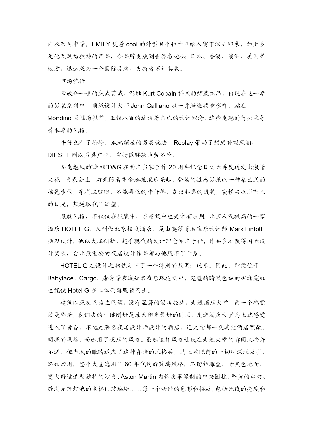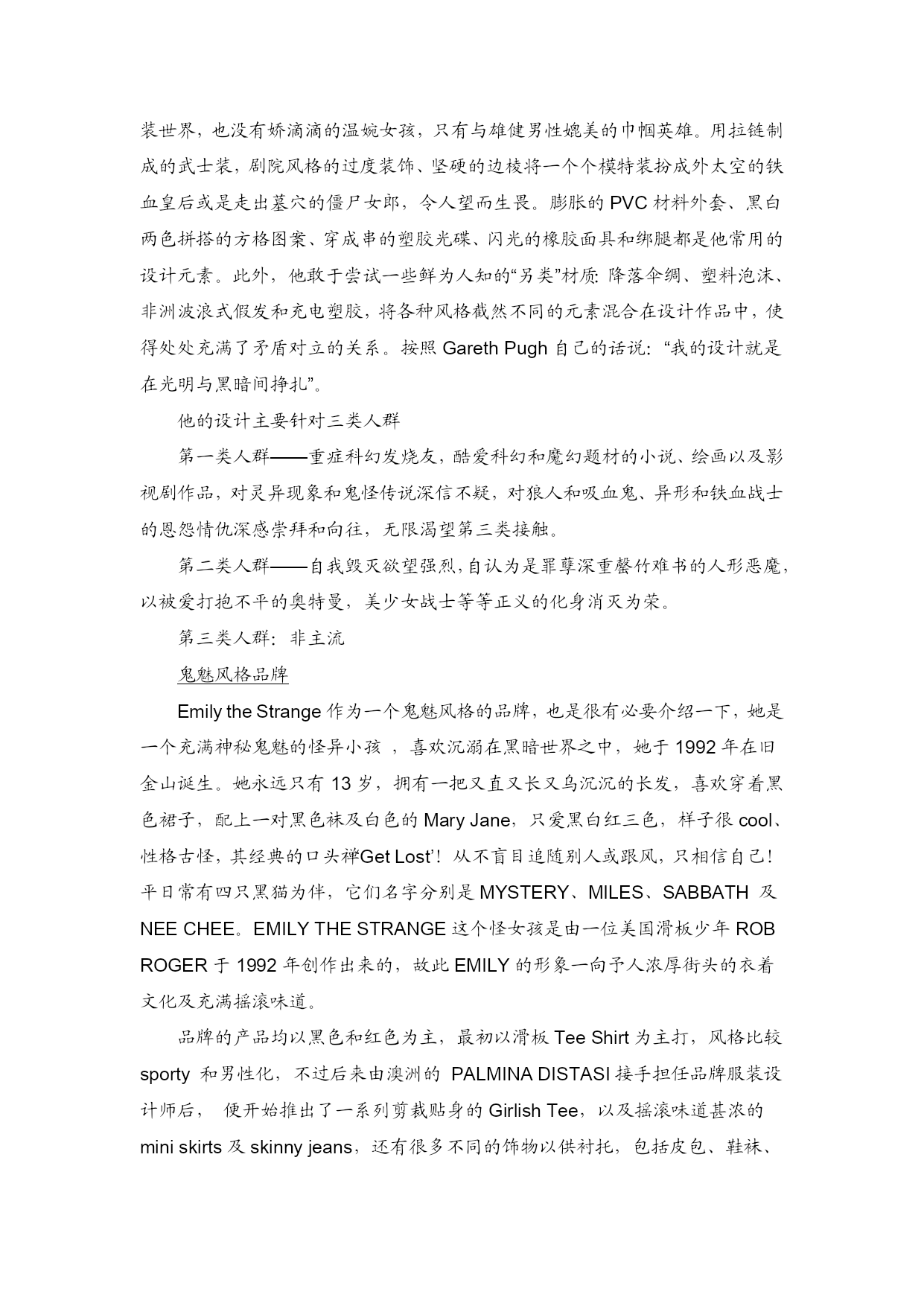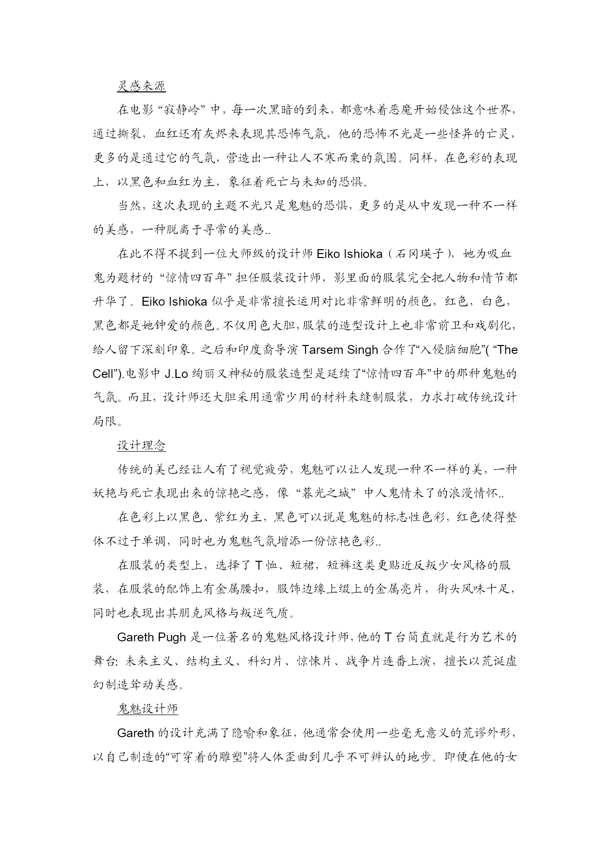 设计报告鬼魅浪漫06040408-王旭这次我的主题是鬼魅浪漫,第一次真正意义上做一个设计,才发现真的不如头脑想象中简单,要把自己的想法变为现实,还是需要很多的积累,对服装本身的感悟、理解。起初构思这个主题的时候,脑子里的想法很模糊,鬼魅给我的定义也就是那种又神秘又惊艳的感觉,不知道怎样才能表现到纸上,尤其是服装上。在网络上、图书馆看了很多服装的图片,许多设计的作品,再不断的对自己的作品做修改,才慢慢的出来了现在的定稿。虽然整个过程进展很慢,屡屡碰壁,但最后的成果出来还是十分让人开心..主题阐述鬼魅这个词可以让人立即联想到很多:朋克、哥特、鲜血、死亡、灵异..既有美艳的一面又有让人感到恐惧的一面,让人想窥探却又害怕靠近。像罂粟,娇艳欲滴但有毒,但人接触久了便欲罢不能..市场定位系列针对的群体是18-25岁少女,她们不盲目追随潮流,有自己的叛逆和街头风格。服装类型以T恤和短裙为主,风格偏于摇滚和中性化。流行预测根据色彩主要把此次的设计分为三个部分偏哥特式的配色,哥特最为经典的颜色单配就是红黑,夸张的黑色口红,黑色指甲,演绎出另类的时尚与性感。偏朋克街头风的配色,朋克向来与摇滚乐是分不开的,因此在这一类配色中,主要采用重金属的颜色,在适当搭配一些女性化的颜色配饰,在面料材质上,皮革仍旧是主流,皮革搭配金属色复古的铆钉,蕾丝的女性材质,亮面的布料..在妆容上,烟熏眼妆为主,搭配复古的粗黑色眼线,唇补一般使用裸色或是夸张的鲜红..偏灵异风的配色,在这一个小分类中,我们可以发现,鬼魅感觉的表现,不一定非要使用重色浓厚的颜色元素来表现,最为基本的黑白,搭配人物的妆容发型,服装的剪裁版式,灯光的搭配..也一样可以很好的表现出鬼魅的感觉..灵感来源在电影“寂静岭”中,每一次黑暗的到来,都意味着恶魔开始侵蚀这个世界,通过撕裂,血红还有灰烬来表现其恐怖气氛,他的恐怖不光是一些怪异的亡灵,更多的是通过它的气氛,营造出一种让人不寒而栗的氛围。同样,在色彩的表现上,以黑色和血红为主,象征着死亡与未知的恐惧。当然,这次表现的主题不光只是鬼魅的恐惧,更多的是从中发现一种不一样的美感,一种脱离于寻常的美感..在此不得不提到一位大师级的设计师EikoIshioka(石冈瑛子),她为吸血鬼为题材的“惊情四百年”担任服装设计师,影里面的服装完全把人物和情节都升华了。EikoIshioka似乎是非常擅长运用对比非常鲜明的颜色,红色,白色,黑色都是她钟爱的颜色。不仅用色大胆,服装的造型设计上也非常前卫和戏剧化,给人留下深刻印象。之后和印度裔导演TarsemSingh合作了“入侵脑细胞”(“TheCell”).电影中J.Lo绚丽又神秘的服装造型是延续了“惊情四百年”中的那种鬼魅的气氛。而且,设计师还大胆采用通常少用的材料来缝制服装,力求打破传统设计局限。设计理念传统的美已经让人有了视觉疲劳,鬼魅可以让人发现一种不一样的美,一种妖艳与死亡表现出来的惊艳之感,像“暮光之城”中人鬼情未了的浪漫情怀..在色彩上以黑色、紫红为主,黑色可以说是鬼魅的标志性色彩,红色使得整体不过于单调,同时也为鬼魅气氛增添一份惊艳色彩..在服装的类型上,选择了T恤、短裙,短裤这类更贴近反叛少女风格的服装,在服装的配饰上有金属腰扣,服饰边缘上缀上的金属亮片,街头风味十足,同时也表现出其朋克风格与叛逆气质。GarethPugh是一位著名的鬼魅风格设计师,他的T台简直就是行为艺术的舞台:未来主义、结构主义、科幻片、惊悚片、战争片连番上演,擅长以荒诞虚幻制造耸动美感。鬼魅设计师Gareth的设计充满了隐喻和象征,他通常会使用一些毫无意义的荒谬外形,以自己制造的“可穿着的雕塑”将人体歪曲到几乎不可辨认的地步。即便在他的女装世界,也没有娇滴滴的温婉女孩,只有与雄健男性媲美的巾帼英雄。用拉链制成的武士装,剧院风格的过度装饰、坚硬的边棱将一个个模特装扮成外太空的铁血皇后或是走出墓穴的僵尸女郎,令人望而生畏。膨胀的PVC材料外套、黑白两色拼搭的方格图案、穿成串的塑胶光碟、闪光的橡胶面具和绑腿都是他常用的设计元素。此外,他敢于尝试一些鲜为人知的“另类”材质:降落伞绸、塑料泡沫、非洲波浪式假发和充电塑胶,将各种风格截然不同的元素混合在设计作品中,使得处处充满了矛盾对立的关系。按照GarethPugh自己的话说:“我的设计就是在光明与黑暗间挣扎”。他的设计主要针对三类人群第一类人群——重症科幻发烧友,酷爱科幻和魔幻题材的小说、绘画以及影视剧作品,对灵异现象和鬼怪传说深信不疑,对狼人和吸血鬼、异形和铁血战士的恩怨情仇深感崇拜和向往,无限渴望第三类接触。第二类人群——自我毁灭欲望强烈,自认为是罪孽深重罄竹难书的人形恶魔,以被爱打抱不平的奥特曼,美少女战士等等正义的化身消灭为荣。