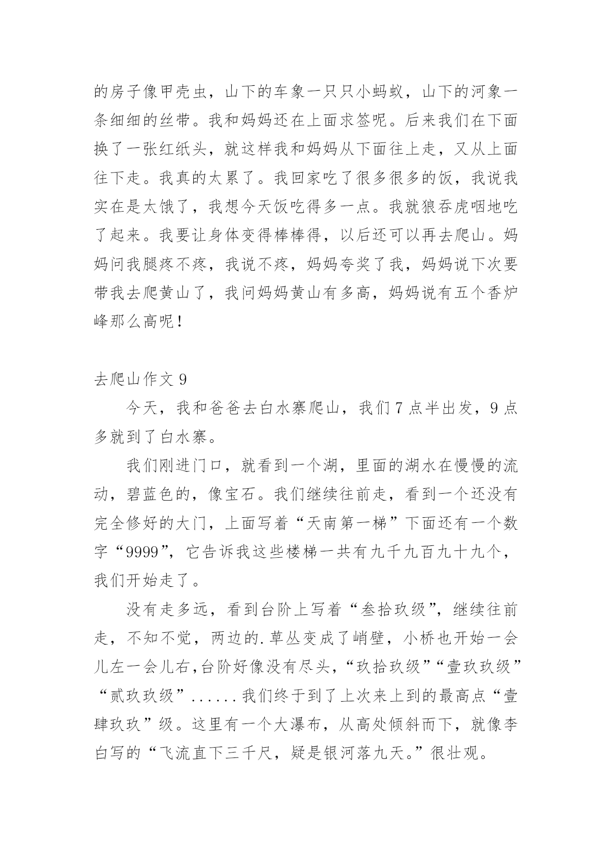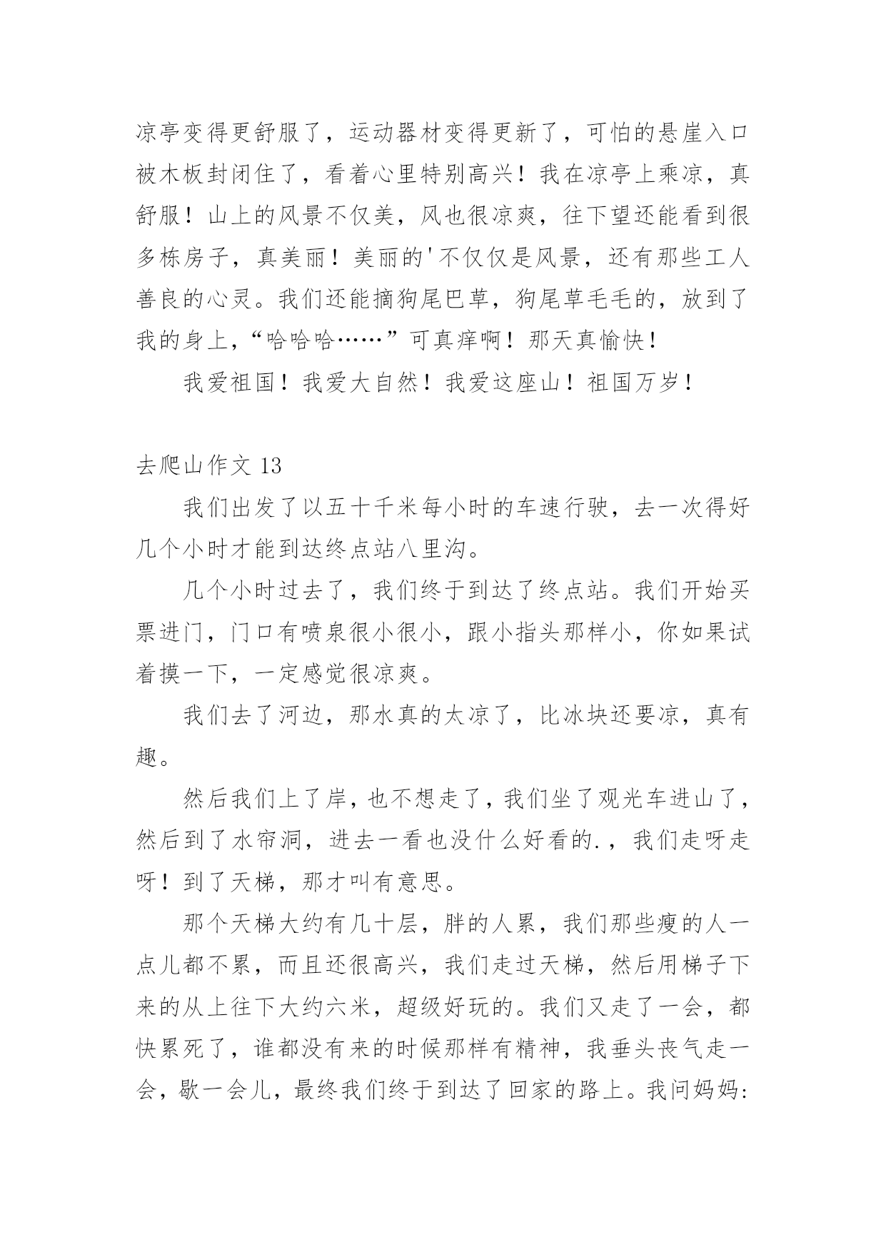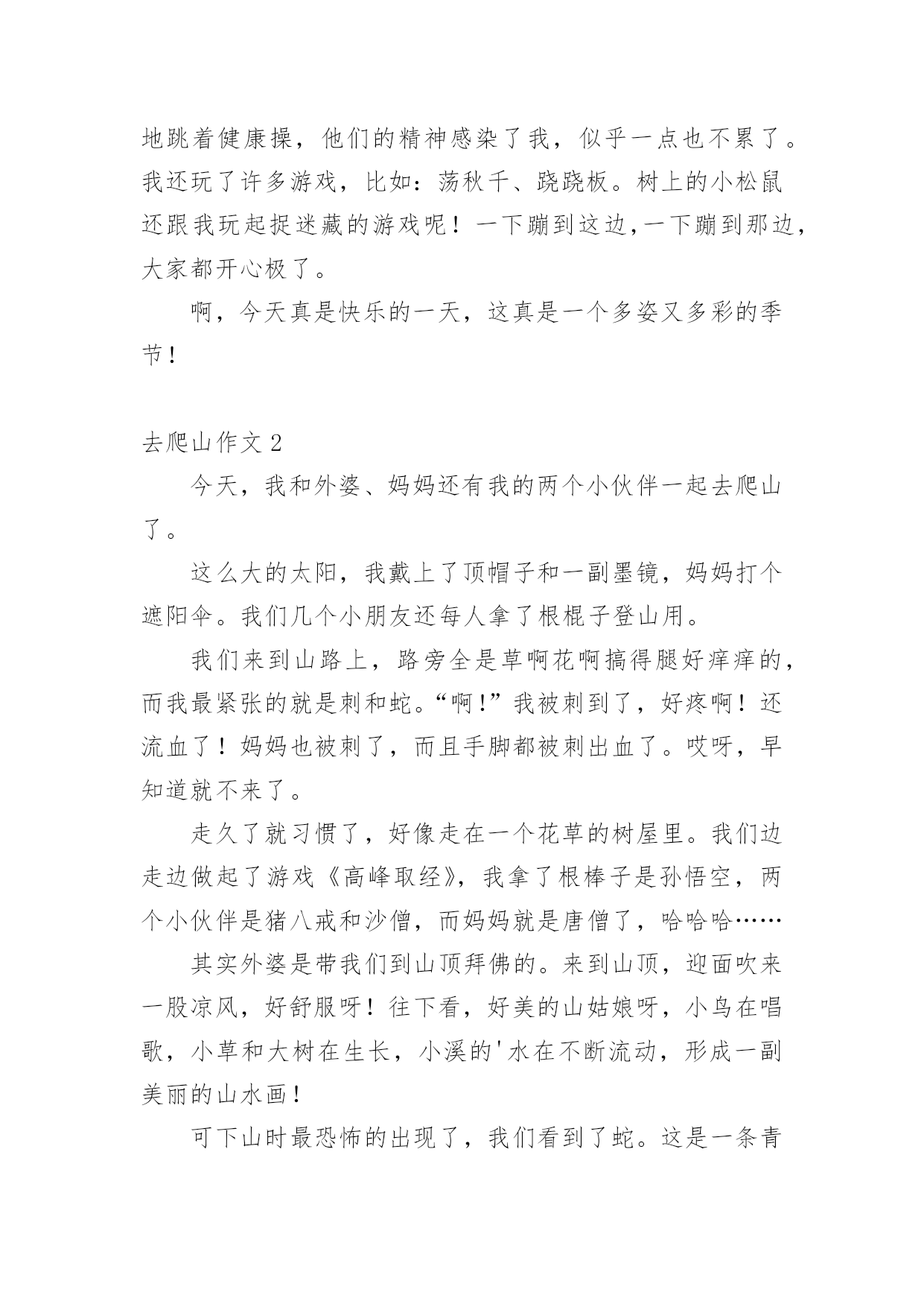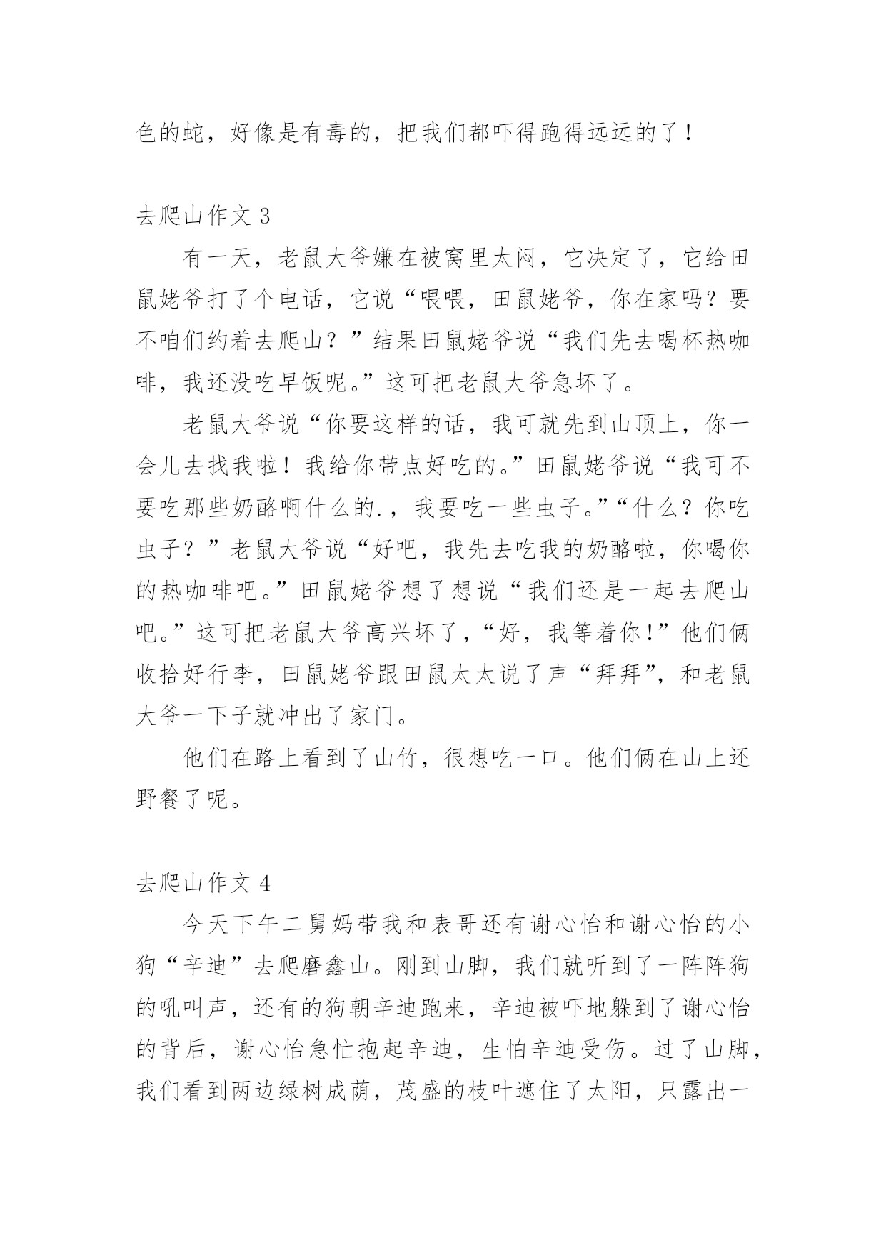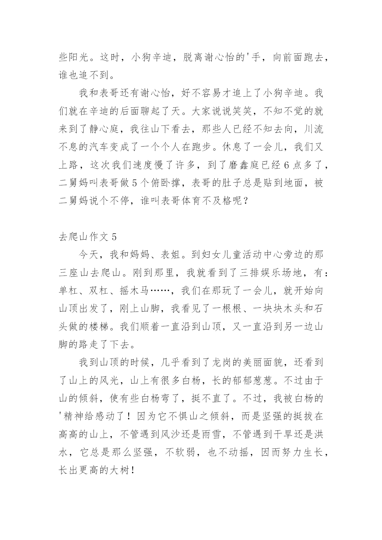 去爬山作文去爬山作文汇编15篇在日常学习、工作和生活中,许多人都有过写作文的经历,对作文都不陌生吧,作文是通过文字来表达一个主题意义的记叙方法。相信很多朋友都对写作文感到非常苦恼吧,以下是小编为大家整理的去爬山作文,欢迎阅读,希望大家能够喜欢。去爬山作文1今天阳光明媚,蔚蓝的天空中朵朵白云慢慢地飘动着,云宝宝正跟我打招呼呢!我早早起了床,全家决定去爬山。我兴奋极了,高兴得一蹦三尺高,一路上,我们有说有笑。不一会儿,我们就来到白云山的山脚下。爬山的人络绎不绝,有的人往下走;有的人正走向石阶,似乎很轻松;还有的人累得筋疲力尽……长长的山道向一条长龙似的欢迎我们。可是我们刚刚到半山腰就累得气喘吁吁了。这时,我好像听到有人在我耳边说:“瑶瑶,是不是爬累了?坐在我背上我”飞“你上去。”我抬头看看山顶的凉亭,似乎听懂了长龙爷爷的'话,像快乐的小鸟一样飞快地向前冲。终于,到达了山顶。山顶上一阵微风吹来,让我们都感到非常舒服。又看到这边的老爷爷们整齐地打着太极拳,那边的叔叔阿姨们快乐地跳着健康操,他们的精神感染了我,似乎一点也不累了。我还玩了许多游戏,比如:荡秋千、跷跷板。树上的小松鼠还跟我玩起捉迷藏的游戏呢!一下蹦到这边,一下蹦到那边,大家都开心极了。啊,今天真是快乐的一天,这真是一个多姿又多彩的季节!去爬山作文2今天,我和外婆、妈妈还有我的两个小伙伴一起去爬山了。这么大的太阳,我戴上了顶帽子和一副墨镜,妈妈打个遮阳伞。我们几个小朋友还每人拿了根棍子登山用。我们来到山路上,路旁全是草啊花啊搞得腿好痒痒的,而我最紧张的就是刺和蛇。“啊!”我被刺到了,好疼啊!还流血了!妈妈也被刺了,而且手脚都被刺出血了。哎呀,早知道就不来了。走久了就习惯了,好像走在一个花草的树屋里。我们边走边做起了游戏《高峰取经》,我拿了根棒子是孙悟空,两个小伙伴是猪八戒和沙僧,而妈妈就是唐僧了,哈哈哈……其实外婆是带我们到山顶拜佛的。来到山顶,迎面吹来一股凉风,好舒服呀!往下看,好美的山姑娘呀,小鸟在唱歌,小草和大树在生长,小溪的'水在不断流动,形成一副美丽的山水画!可下山时最恐怖的出现了,我们看到了蛇。这是一条青色的蛇,好像是有毒的,把我们都吓得跑得远远的了!去爬山作文3有一天,老鼠大爷嫌在被窝里太闷,它决定了,它给田鼠姥爷打了个电话,它说“喂喂,田鼠姥爷,你在家吗?要不咱们约着去爬山?”结果田鼠姥爷说“我们先去喝杯热咖啡,我还没吃早饭呢。”这可把老鼠大爷急坏了。老鼠大爷说“你要这样的话,我可就先到山顶上,你一会儿去找我啦!我给你带点好吃的。”田鼠姥爷说“我可不要吃那些奶酪啊什么的.,我要吃一些虫子。”“什么?你吃虫子?”老鼠大爷说“好吧,我先去吃我的奶酪啦,你喝你的热咖啡吧。”田鼠姥爷想了想说“我们还是一起去爬山吧。”这可把老鼠大爷高兴坏了,“好,我等着你!”他们俩收拾好行李,田鼠姥爷跟田鼠太太说了声“拜拜”,和老鼠大爷一下子就冲出了家门。他们在路上看到了山竹,很想吃一口。他们俩在山上还野餐了呢。去爬山作文4今天下午二舅妈带我和表哥还有谢心怡和谢心怡的小狗“辛迪”去爬磨鑫山。刚到山脚,我们就听到了一阵阵狗的吼叫声,还有的狗朝辛迪跑来,辛迪被吓地躲到了谢心怡的背后,谢心怡急忙抱起辛迪,生怕辛迪受伤。过了山脚,我们看到两边绿树成荫,茂盛的枝叶遮住了太阳,只露出一些阳光。这时,小狗辛迪,脱离谢心怡的'手,向前面跑去,谁也追不到。我和表哥还有谢心怡,好不容易才追上了小狗辛迪。我们就在辛迪的后面聊起了天。大家说说笑笑,不知不觉的就来到了静心庭,我往山下看去,那些人已经不知去向,川流不息的汽车变成了一个个人在跑步。休息了一会儿,我们又上路,这次我们速度慢了许多,到了磨鑫庭已经6点多了,二舅妈叫表哥做5个俯卧撑,表哥的肚子总是贴到地面,被二舅妈说个不停,谁叫表哥体育不及格呢?去爬山作文5今天,我和妈妈、表姐。到妇女儿童活动中心旁边的那三座山去爬山。刚到那里,我就看到了三排娱乐场地,有:单杠、双杠、摇木马……,我们在那玩了一会儿,就开始向山顶出发了,刚上山脚,我看见了一根根、一块块木头和石头做的楼梯。我们顺着一直沿到山顶,又一直沿到另一边山脚的路走了下去。我到山顶的时候,几乎看到了龙岗的美丽面貌,还看到了山上的风光,山上有很多白杨,长的郁郁葱葱。不过由于山的倾斜,使有些白杨弯了,挺不直了。不过,我被白杨的'精神给感动了!因为它不惧山之倾斜,而是坚强的挺拔在高高的山上,不管遇到风沙还是雨雪,不管遇到干旱还是洪水,它总是那么坚强,不软弱,也不动摇,因而努力生长,长出更高的大树!我记得我在五年级(第十册)时候读过一篇,是《白杨》,但是,它那里面并不是讲我看到的景物,而是用心去想出来的知识,文章写的是爸爸在通向新疆的车上所发生的事,在车上,爸爸因为在车上看到了白杨树而陷入沉思,因为他想的事