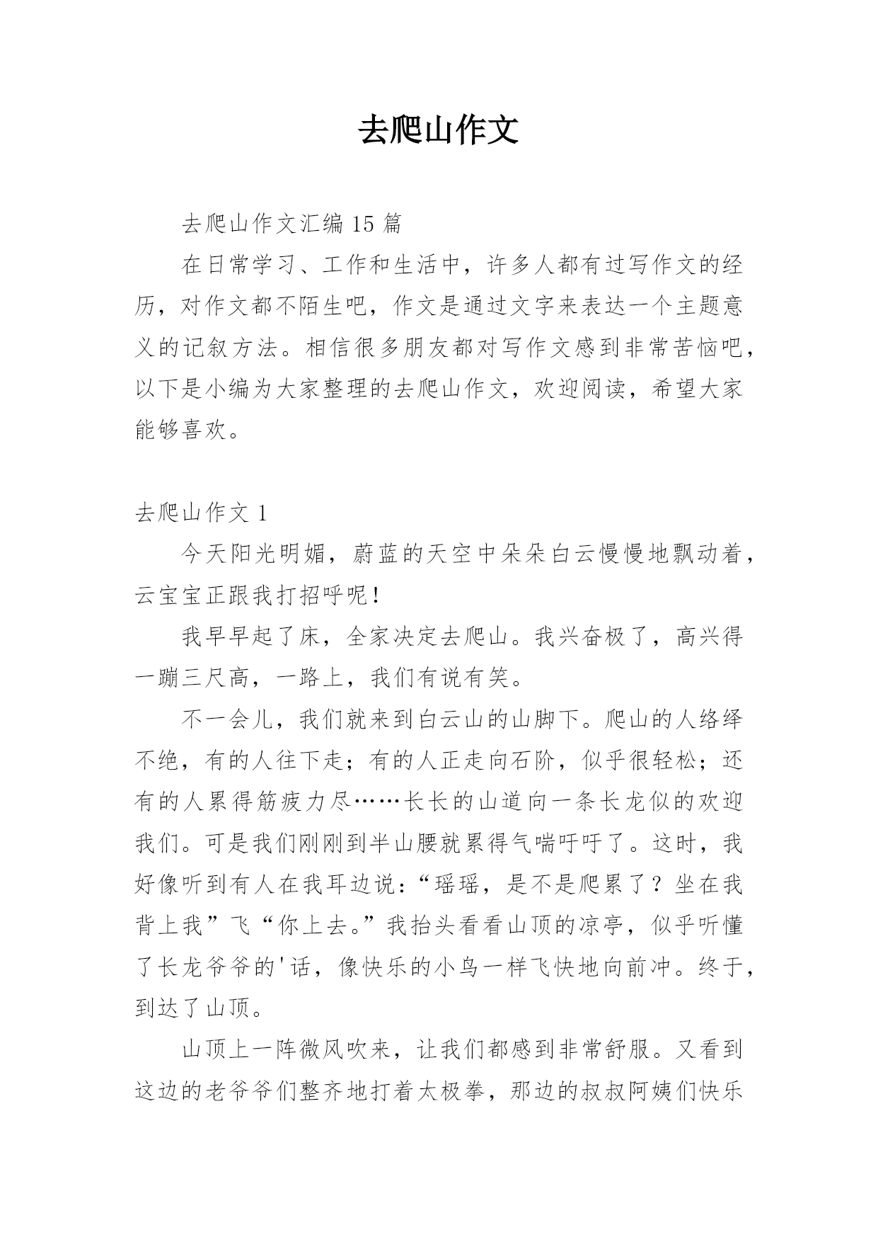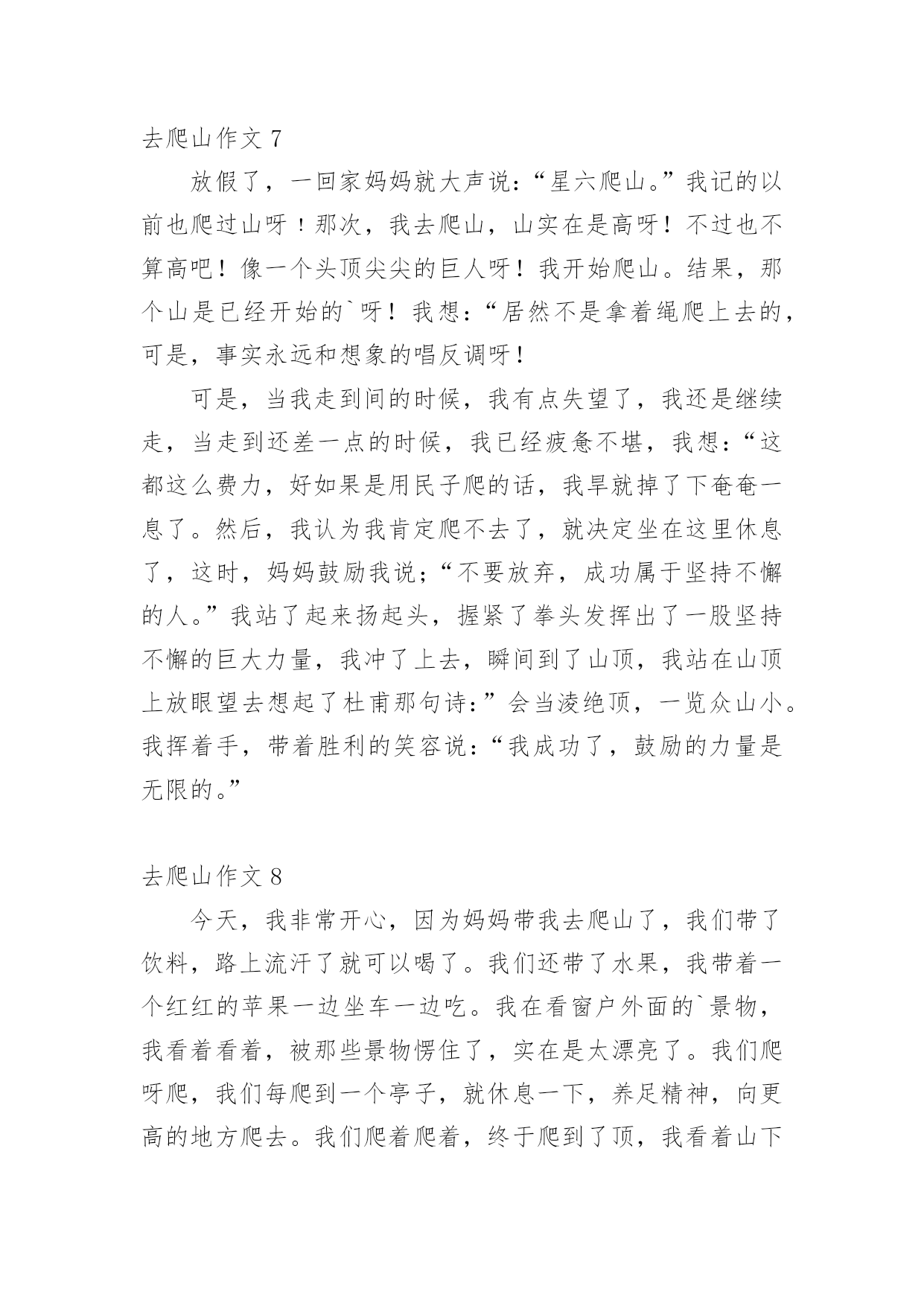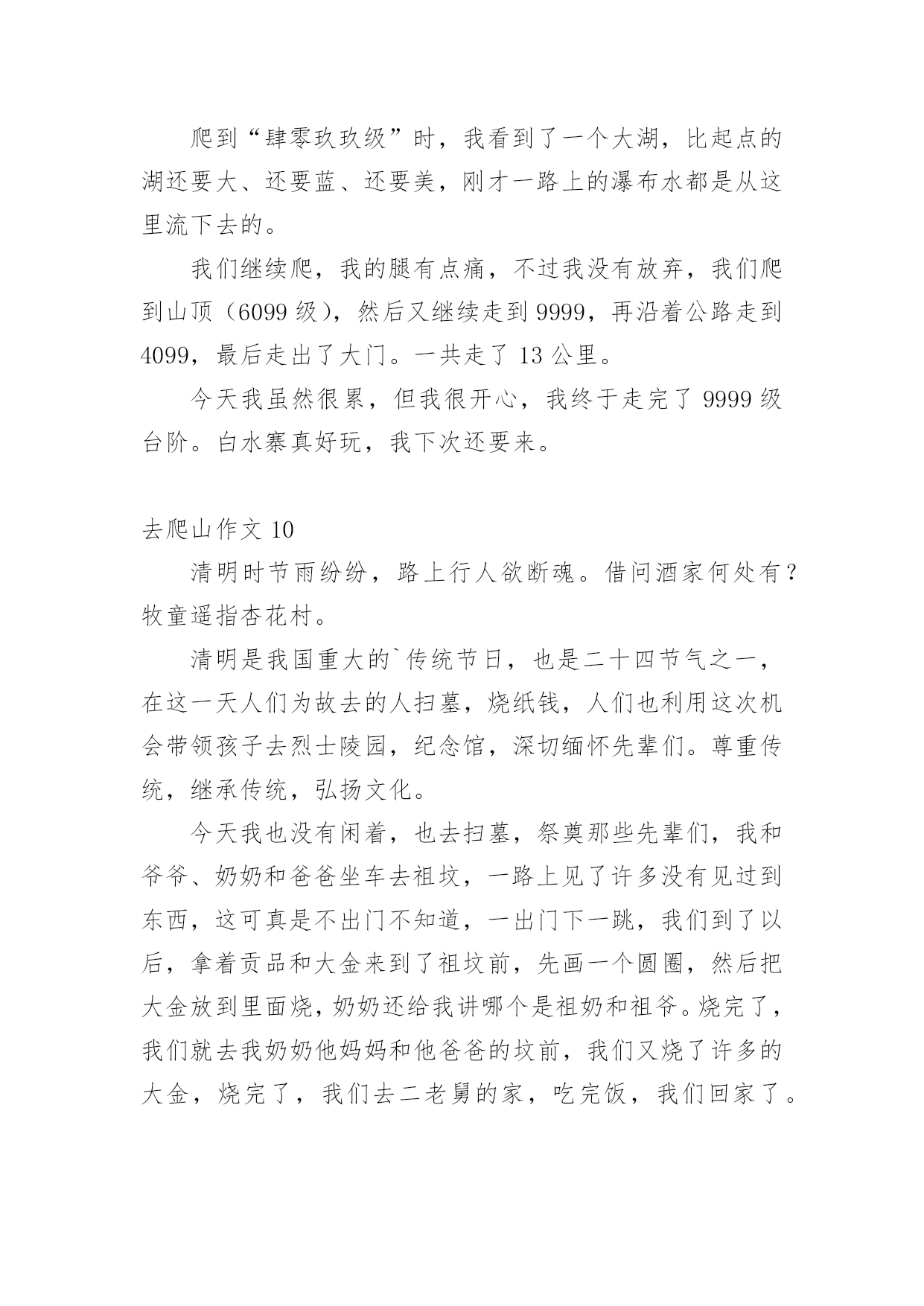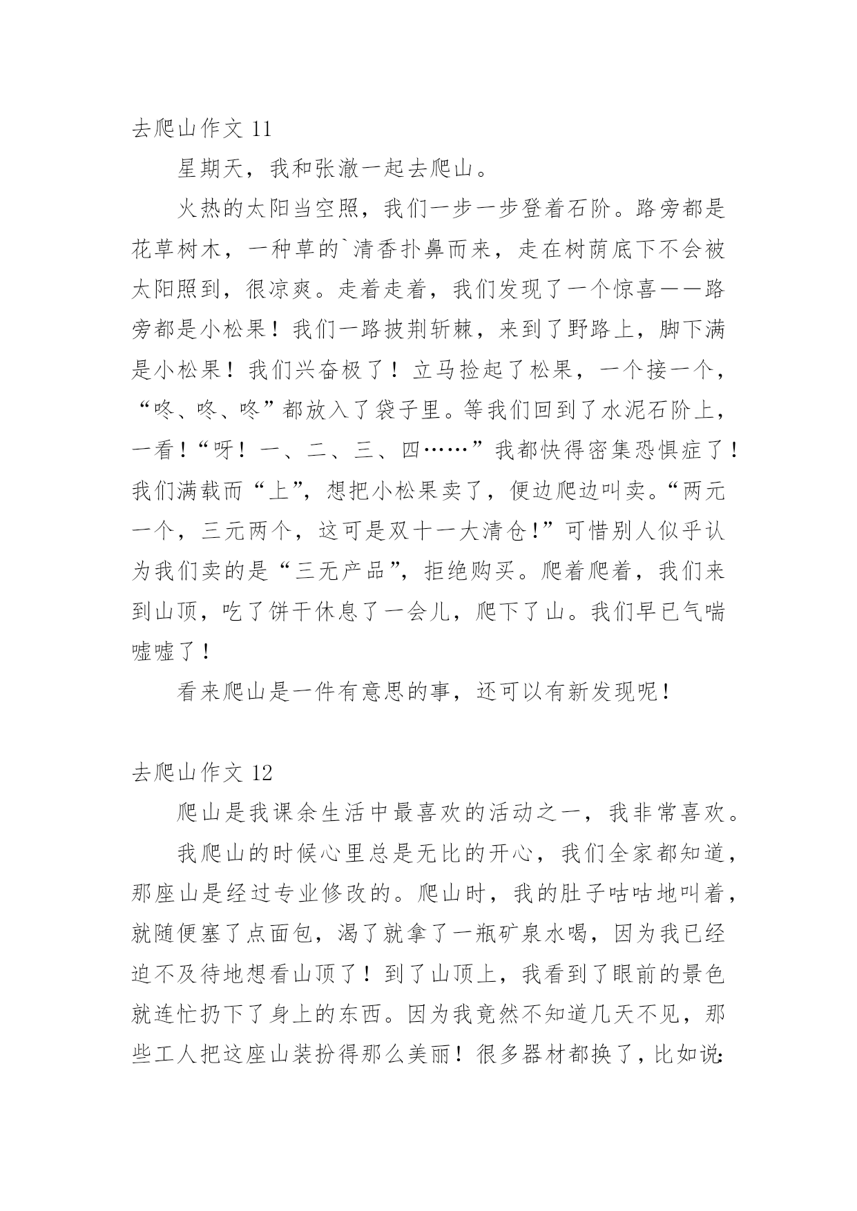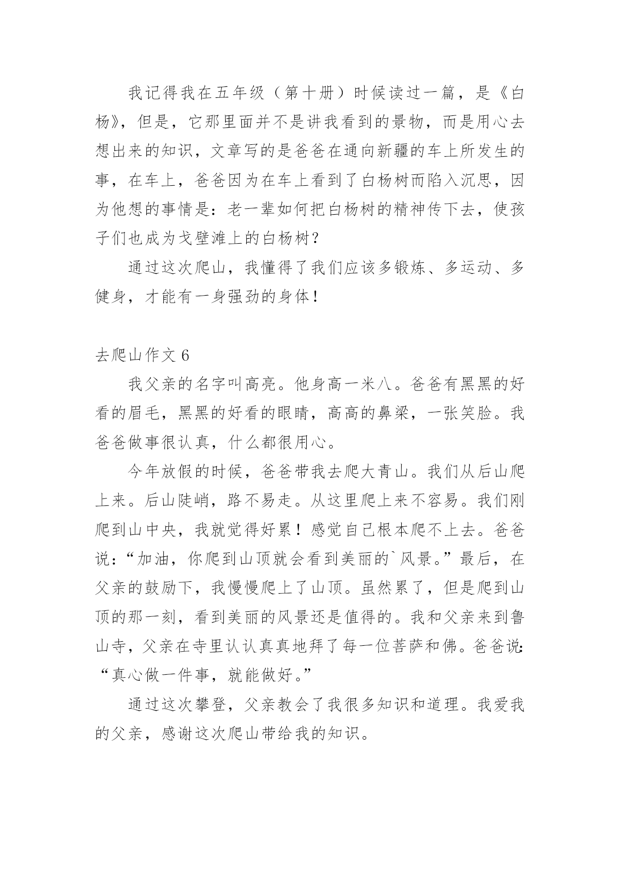 去爬山作文去爬山作文汇编15篇在日常学习、工作和生活中,许多人都有过写作文的经历,对作文都不陌生吧,作文是通过文字来表达一个主题意义的记叙方法。相信很多朋友都对写作文感到非常苦恼吧,以下是小编为大家整理的去爬山作文,欢迎阅读,希望大家能够喜欢。去爬山作文1今天阳光明媚,蔚蓝的天空中朵朵白云慢慢地飘动着,云宝宝正跟我打招呼呢!我早早起了床,全家决定去爬山。我兴奋极了,高兴得一蹦三尺高,一路上,我们有说有笑。不一会儿,我们就来到白云山的山脚下。爬山的人络绎不绝,有的人往下走;有的人正走向石阶,似乎很轻松;还有的人累得筋疲力尽……长长的山道向一条长龙似的欢迎我们。可是我们刚刚到半山腰就累得气喘吁吁了。这时,我好像听到有人在我耳边说:“瑶瑶,是不是爬累了?坐在我背上我”飞“你上去。”我抬头看看山顶的凉亭,似乎听懂了长龙爷爷的'话,像快乐的小鸟一样飞快地向前冲。终于,到达了山顶。山顶上一阵微风吹来,让我们都感到非常舒服。又看到这边的老爷爷们整齐地打着太极拳,那边的叔叔阿姨们快乐地跳着健康操,他们的精神感染了我,似乎一点也不累了。我还玩了许多游戏,比如:荡秋千、跷跷板。树上的小松鼠还跟我玩起捉迷藏的游戏呢!一下蹦到这边,一下蹦到那边,大家都开心极了。啊,今天真是快乐的一天,这真是一个多姿又多彩的季节!去爬山作文2今天,我和外婆、妈妈还有我的两个小伙伴一起去爬山了。这么大的太阳,我戴上了顶帽子和一副墨镜,妈妈打个遮阳伞。我们几个小朋友还每人拿了根棍子登山用。我们来到山路上,路旁全是草啊花啊搞得腿好痒痒的,而我最紧张的就是刺和蛇。“啊!”我被刺到了,好疼啊!还流血了!妈妈也被刺了,而且手脚都被刺出血了。哎呀,早知道就不来了。走久了就习惯了,好像走在一个花草的树屋里。我们边走边做起了游戏《高峰取经》,我拿了根棒子是孙悟空,两个小伙伴是猪八戒和沙僧,而妈妈就是唐僧了,哈哈哈……其实外婆是带我们到山顶拜佛的。来到山顶,迎面吹来一股凉风,好舒服呀!往下看,好美的山姑娘呀,小鸟在唱歌,小草和大树在生长,小溪的'水在不断流动,形成一副美丽的山水画!可下山时最恐怖的出现了,我们看到了蛇。这是一条青色的蛇,好像是有毒的,把我们都吓得跑得远远的了!去爬山作文3有一天,老鼠大爷嫌在被窝里太闷,它决定了,它给田鼠姥爷打了个电话,它说“喂喂,田鼠姥爷,你在家吗?要不咱们约着去爬山?”结果田鼠姥爷说“我们先去喝杯热咖啡,我还没吃早饭呢。”这可把老鼠大爷急坏了。老鼠大爷说“你要这样的话,我可就先到山顶上,你一会儿去找我啦!我给你带点好吃的。”田鼠姥爷说“我可不要吃那些奶酪啊什么的.,我要吃一些虫子。”“什么?你吃虫子?”老鼠大爷说“好吧,我先去吃我的奶酪啦,你喝你的热咖啡吧。”田鼠姥爷想了想说“我们还是一起去爬山吧。”这可把老鼠大爷高兴坏了,“好,我等着你!”他们俩收拾好行李,田鼠姥爷跟田鼠太太说了声“拜拜”,和老鼠大爷一下子就冲出了家门。他们在路上看到了山竹,很想吃一口。他们俩在山上还野餐了呢。去爬山作文4今天下午二舅妈带我和表哥还有谢心怡和谢心怡的小狗“辛迪”去爬磨鑫山。刚到山脚,我们就听到了一阵阵狗的吼叫声,还有的狗朝辛迪跑来,辛迪被吓地躲到了谢心怡的背后,谢心怡急忙抱起辛迪,生怕辛迪受伤。过了山脚,我们看到两边绿树成荫,茂盛的枝叶遮住了太阳,只露出一些阳光。这时,小狗辛迪,脱离谢心怡的'手,向前面跑去,谁也追不到。我和表哥还有谢心怡,好不容易才追上了小狗辛迪。我们就在辛迪的后面聊起了天。大家说说笑笑,不知不觉的就来到了静心庭,我往山下看去,那些人已经不知去向,川流不息的汽车变成了一个个人在跑步。休息了一会儿,我们又上路,这次我们速度慢了许多,到了磨鑫庭已经6点多了,二舅妈叫表哥做5个俯卧撑,表哥的肚子总是贴到地面,被二舅妈说个不停,谁叫表哥体育不及格呢?去爬山作文5今天,我和妈妈、表姐。到妇女儿童活动中心旁边的那三座山去爬山。刚到那里,我就看到了三排娱乐场地,有:单杠、双杠、摇木马……,我们在那玩了一会儿,就开始向山顶出发了,刚上山脚,我看见了一根根、一块块木头和石头做的楼梯。我们顺着一直沿到山顶,又一直沿到另一边山脚的路走了下去。我到山顶的时候,几乎看到了龙岗的美丽面貌,还看到了山上的风光,山上有很多白杨,长的郁郁葱葱。不过由于山的倾斜,使有些白杨弯了,挺不直了。不过,我被白杨的'精神给感动了!因为它不惧山之倾斜,而是坚强的挺拔在高高的山上,不管遇到风沙还是雨雪,不管遇到干旱还是洪水,它总是那么坚强,不软弱,也不动摇,因而努力生长,长出更高的大树!我记得我在五年级(第十册)时候读过一篇,是《白杨》,但是,它那里面并不是讲我看到的景物,而是用心去想出来的知识,文章写的是爸爸在通向新疆的车上所发生的事,在车上,爸爸因为在车上看到了白杨树而陷入沉思,因为他想的事