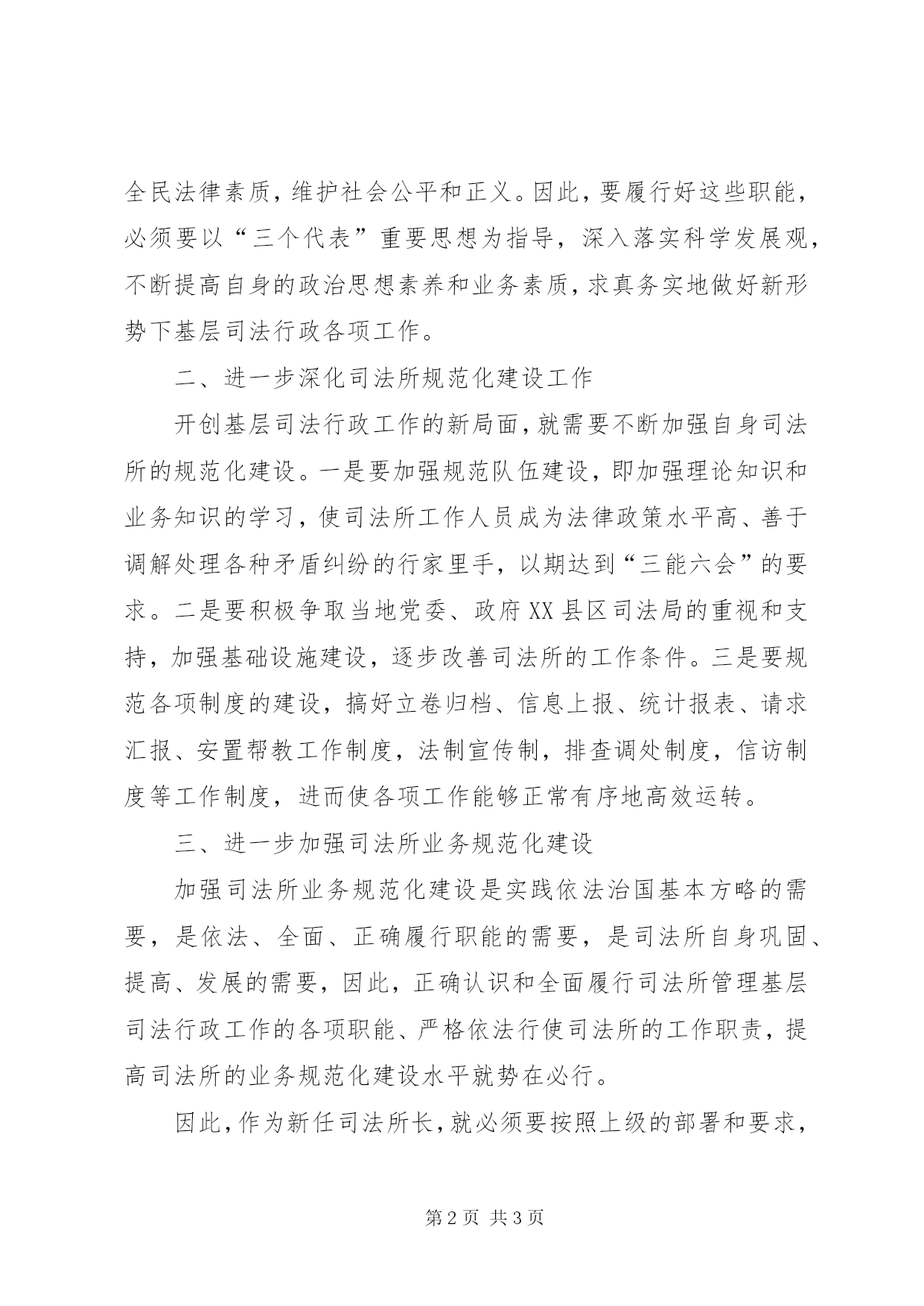 第PAGE\*Arabic\*MERGEFORMAT3页共NUMPAGES\*MERGEFORMAT3页新任司法所长业务培训学习心得夯实理论基础提升业务水平扎实开展新形势下基层司法行政工作在组织的关怀、培养和信任下,让我有幸能够加入司法行政工作者的行列中来,并参加了此次新任司法所长培训班的培训学习,聆听了县委领导、司法局领导以及党校教授的授课,使刚开始从事司法行政工作的我从政治思想素质和业务素质等方面都有了一定的提高,受益匪浅,为我即将在××乡开展的司法行政工作指明了“围绕中心、服务大局”的工作方向,使我明确了工作目标,从千头万绪的工作中理清了思路,确定了工作重点,特别是让我这名新任司法所长树立了“忠诚、为民、公正、廉洁”的政法干警核心价值观,更加坚定了爱岗敬业、服务一方百姓的信念。具体学习心得体会有如下三点:一、坚持以“三个代表”重要思想为指导,深入落实科学发展观,不断加强自身的政治素养作为基层司法行政机关是国家政法机关的组成部分,担负着法律保障、法制宣传教育、法律服务三大职能和依法治理、人民调解、安置帮教等九项工作任务,其职能作用就是要着力解决好关系人民群众切身利益的突出问题,保障广大群众生命财产安全,维护社会秩序和社会稳定,促进社会和谐健康发展。同时,还要加大力度推进依法治国方略,扎实而有效地开展普法教育,提高全民法律素质,维护社会公平和正义。因此,要履行好这些职能,必须要以“三个代表”重要思想为指导,深入落实科学发展观,不断提高自身的政治思想素养和业务素质,求真务实地做好新形势下基层司法行政各项工作。二、进一步深化司法所规范化建设工作开创基层司法行政工作的新局面,就需要不断加强自身司法所的规范化建设。一是要加强规范队伍建设,即加强理论知识和业务知识的学习,使司法所工作人员成为法律政策水平高、善于调解处理各种矛盾纠纷的行家里手,以期达到“三能六会”的要求。二是要积极争取当地党委、政府XX县区司法局的重视和支持,加强基础设施建设,逐步改善司法所的工作条件。三是要规范各项制度的建设,搞好立卷归档、信息上报、统计报表、请求汇报、安置帮教工作制度,法制宣传制,排查调处制度,信访制度等工作制度,进而使各项工作能够正常有序地高效运转。三、进一步加强司法所业务规范化建设加强司法所业务规范化建设是实践依法治国基本方略的需要,是依法、全面、正确履行职能的需要,是司法所自身巩固、提高、发展的需要,因此,正确认识和全面履行司法所管理基层司法行政工作的各项职能、严格依法行使司法所的工作职责,提高司法所的业务规范化建设水平就势在必行。因此,作为新任司法所长,就必须要按照上级的部署和要求,从实际出发,高标准、严要求,制定切实可行的规范化建设的方案、目标和计划,积极探索加强司法所业务规范化建设的有效途径,扎实开展新形势下基层司法行政工作,从而把司法所建设推上一个新台阶,更好地按照科学发展观的要求,促进社会环境的和谐稳定,促进当地经济发展、社会进步,努力打造人民满意的××司法所。