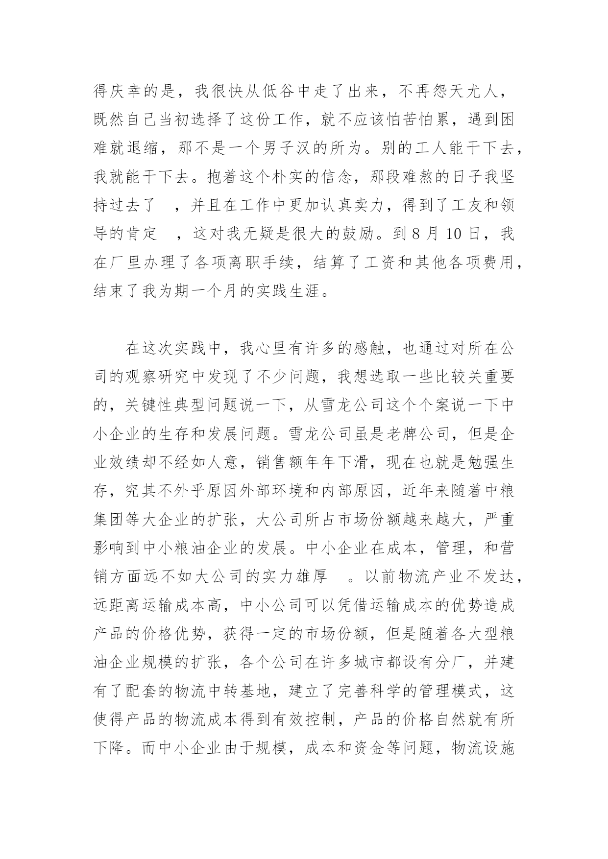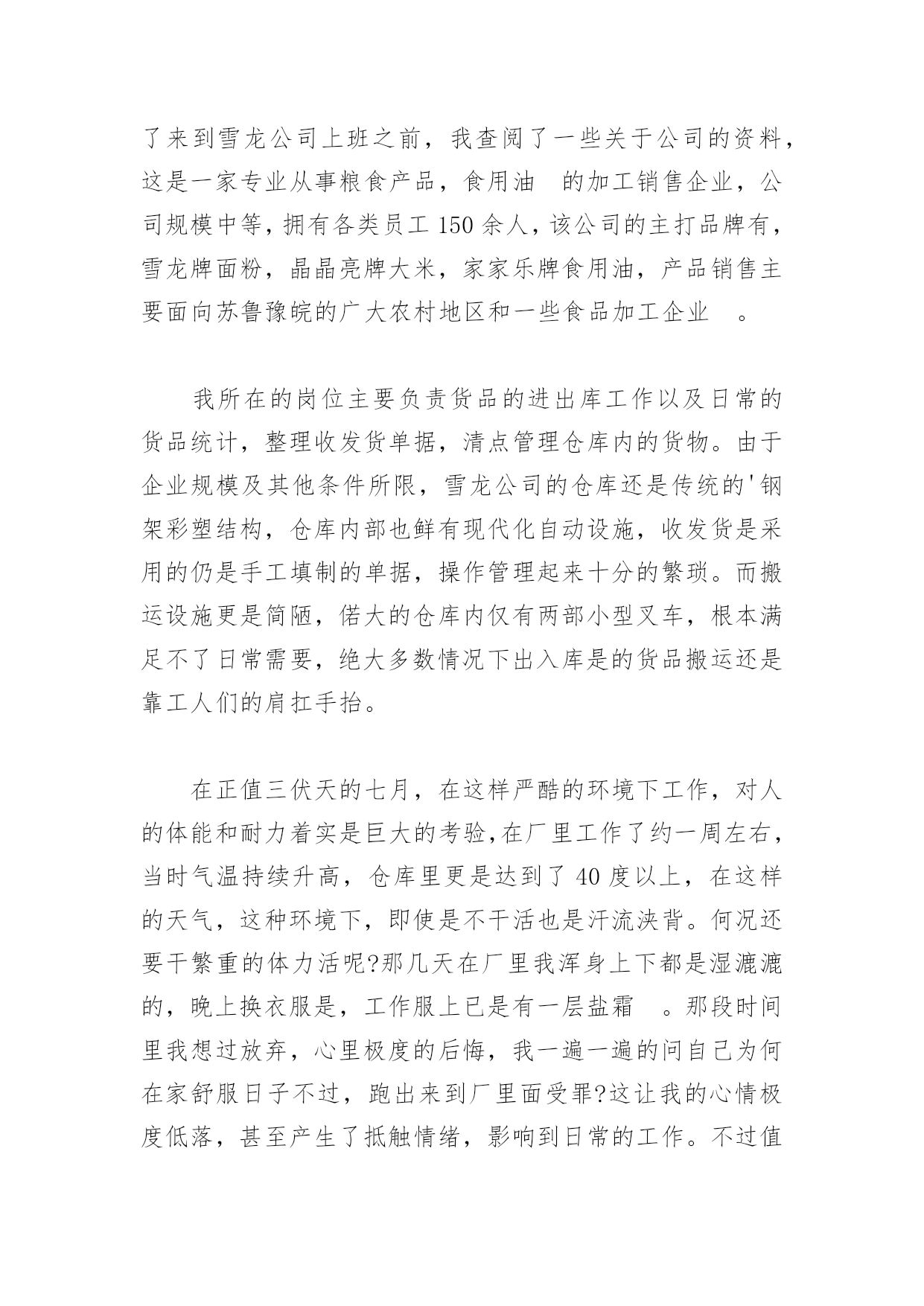 物流管理专业社会实践报告物流管理专业社会实践报告实践时间:xx年x月xx日至x月xx日实践地点:宿迁雪龙粮油有限公司实践报告正文:炎炎夏日,苏北的天气异常炎热,许多学生都选择在家中吹着空调,玩着游戏,享受着假期的乐趣。而我想暑假时间这么长,不应该贪图安闲在家里悠忽过日,高温酷热虽然难忍,丹也恰能磨练自己的意志。暑假社会实践正是锻炼自己能力的好机会。如何把学校学习的理论知识和具体的工作衔接到一起,是每个学生在今后要面临的重要问题,它一定程度上反映了一个人的适应能力,关乎到个人的前途和发展。为了以后在工作中更好的将自己所学的知识贡献给社会,提升自我价值,完善自我素质,实现自我理想,参加社会实践是必要的,也是十分有意义的。x月x日,经他人介绍我来到位于宿豫区经济开发区的雪龙粮油有限公司。当日公司领导就安排我到与专业相关的岗位上,从事仓储管理工作,当天下午正式上班。在正式了来到雪龙公司上班之前,我查阅了一些关于公司的资料,这是一家专业从事粮食产品,食用油的加工销售企业,公司规模中等,拥有各类员工150余人,该公司的主打品牌有,雪龙牌面粉,晶晶亮牌大米,家家乐牌食用油,产品销售主要面向苏鲁豫皖的广大农村地区和一些食品加工企业。我所在的岗位主要负责货品的进出库工作以及日常的货品统计,整理收发货单据,清点管理仓库内的货物。由于企业规模及其他条件所限,雪龙公司的仓库还是传统的'钢架彩塑结构,仓库内部也鲜有现代化自动设施,收发货是采用的仍是手工填制的单据,操作管理起来十分的繁琐。而搬运设施更是简陋,偌大的仓库内仅有两部小型叉车,根本满足不了日常需要,绝大多数情况下出入库是的货品搬运还是靠工人们的肩扛手抬。在正值三伏天的七月,在这样严酷的环境下工作,对人的体能和耐力着实是巨大的考验,在厂里工作了约一周左右,当时气温持续升高,仓库里更是达到了40度以上,在这样的天气,这种环境下,即使是不干活也是汗流浃背。何况还要干繁重的体力活呢?那几天在厂里我浑身上下都是湿漉漉的,晚上换衣服是,工作服上已是有一层盐霜。那段时间里我想过放弃,心里极度的后悔,我一遍一遍的问自己为何在家舒服日子不过,跑出来到厂里面受罪?这让我的心情极度低落,甚至产生了抵触情绪,影响到日常的工作。不过值得庆幸的是,我很快从低谷中走了出来,不再怨天尤人,既然自己当初选择了这份工作,就不应该怕苦怕累,遇到困难就退缩,那不是一个男子汉的所为。别的工人能干下去,我就能干下去。抱着这个朴实的信念,那段难熬的日子我坚持过去了,并且在工作中更加认真卖力,得到了工友和领导的肯定,这对我无疑是很大的鼓励。到8月10日,我在厂里办理了各项离职手续,结算了工资和其他各项费用,结束了我为期一个月的实践生涯。在这次实践中,我心里有许多的感触,也通过对所在公司的观察研究中发现了不少问题,我想选取一些比较关重要的,关键性典型问题说一下,从雪龙公司这个个案说一下中小企业的生存和发展问题。雪龙公司虽是老牌公司,但是企业效绩却不经如人意,销售额年年下滑,现在也就是勉强生存,究其不外乎原因外部环境和内部原因,近年来随着中粮集团等大企业的扩张,大公司所占市场份额越来越大,严重影响到中小粮油企业的发展。中小企业在成本,管理,和营销方面远不如大公司的实力雄厚。以前物流产业不发达,远距离运输成本高,中小公司可以凭借运输成本的优势造成产品的价格优势,获得一定的市场份额,但是随着各大型粮油企业规模的扩张,各个公司在许多城市都设有分厂,并建有了配套的物流中转基地,建立了完善科学的管理模式,这使得产品的物流成本得到有效控制,产品的价格自然就有所下降。而中小企业由于规模,成本和资金等问题,物流设施仍停留在90年代的发展阶段,由于库存成本增加,管理模式落后,原本由于运输成本低所产生的价格优势现在就显得不明显了,再加上大企业的品牌效应和产品营销优势,中小企业的产品市场份额变得越来越少,其生存也越来越困难。另一方面中小企业有个致命的难题就是融资困难,许多时候当企业的资金周转出现困难时,因为银行担心中小企业的信用和还款能力害怕产生不良贷款,很少发放贷款给企业,这就容易造成企业的资金链断裂,继而影响到生产经营,严重情况下甚至会让企业陷入无法生存的窘境,为此不少中小企业企业甚至面临着破产倒闭的窘境。