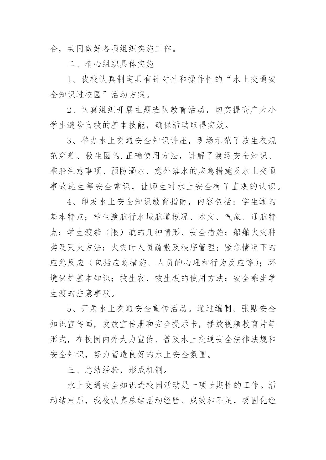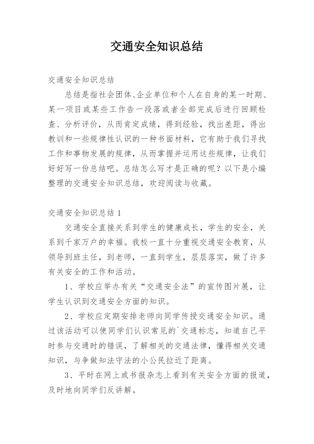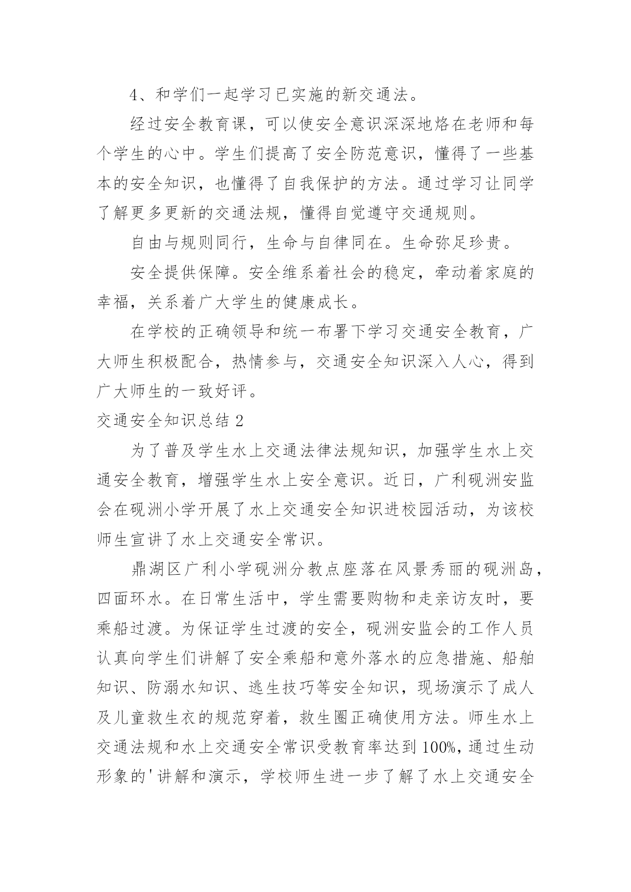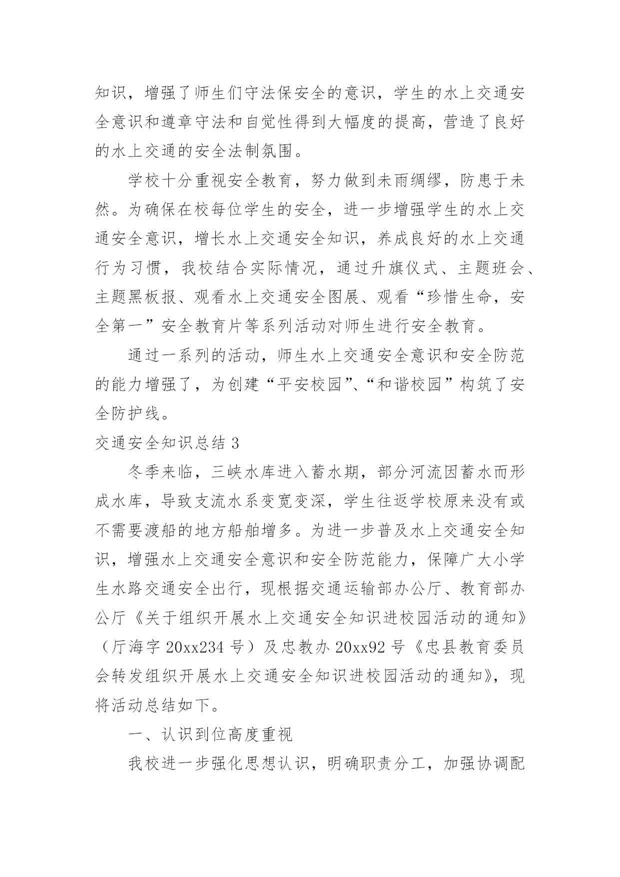 交通安全知识总结交通安全知识总结总结是指社会团体、企业单位和个人在自身的某一时期、某一项目或某些工作告一段落或者全部完成后进行回顾检查、分析评价,从而肯定成绩,得到经验,找出差距,得出教训和一些规律性认识的一种书面材料,它有助于我们寻找工作和事物发展的规律,从而掌握并运用这些规律,让我们好好写一份总结吧。总结怎么写才是正确的呢?以下是小编整理的交通安全知识总结,欢迎阅读与收藏。交通安全知识总结1交通安全直接关系到学生的健康成长,学生的安全,关系到千家万户的幸福。我校一直十分重视交通安全教育,从领导到班主任,到老师,一直到学生,层层落实,做了许多有关安全的工作和活动。1、学校应举办有关“交通安全法”的宣传图片展,让学生认识到交通安全方面的知识。2、学校应定期安排老师向同学传授交通安全知识。通过该活动可以使同学们认识常见的`交通标志,知道自己平时参与交通时的错误,了解相关的交通法律,懂得相关交通知识,与争做知法守法的小公民拉近了距离。3、平时在网上或书报杂志上看到有关安全方面的报道,及时地向同学们反讲解。4、和学们一起学习已实施的新交通法。经过安全教育课,可以使安全意识深深地烙在老师和每个学生的心中。学生们提高了安全防范意识,懂得了一些基本的安全知识,也懂得了自我保护的方法。通过学习让同学了解更多更新的交通法规,懂得自觉遵守交通规则。自由与规则同行,生命与自律同在。生命弥足珍贵。安全提供保障。安全维系着社会的稳定,牵动着家庭的幸福,关系着广大学生的健康成长。在学校的正确领导和统一布署下学习交通安全教育,广大师生积极配合,热情参与,交通安全知识深入人心,得到广大师生的一致好评。交通安全知识总结2为了普及学生水上交通法律法规知识,加强学生水上交通安全教育,增强学生水上安全意识。近日,广利砚洲安监会在砚洲小学开展了水上交通安全知识进校园活动,为该校师生宣讲了水上交通安全常识。鼎湖区广利小学砚洲分教点座落在风景秀丽的砚洲岛,四面环水。在日常生活中,学生需要购物和走亲访友时,要乘船过渡。为保证学生过渡的安全,砚洲安监会的工作人员认真向学生们讲解了安全乘船和意外落水的应急措施、船舶知识、防溺水知识、逃生技巧等安全知识,现场演示了成人及儿童救生衣的规范穿着,救生圈正确使用方法。师生水上交通法规和水上交通安全常识受教育率达到100%,通过生动形象的'讲解和演示,学校师生进一步了解了水上交通安全知识,增强了师生们守法保安全的意识,学生的水上交通安全意识和遵章守法和自觉性得到大幅度的提高,营造了良好的水上交通的安全法制氛围。学校十分重视安全教育,努力做到未雨绸缪,防患于未然。为确保在校每位学生的安全,进一步增强学生的水上交通安全意识,增长水上交通安全知识,养成良好的水上交通行为习惯,我校结合实际情况,通过升旗仪式、主题班会、主题黑板报、观看水上交通安全图展、观看“珍惜生命,安全第一”安全教育片等系列活动对师生进行安全教育。通过一系列的活动,师生水上交通安全意识和安全防范的能力增强了,为创建“平安校园”、“和谐校园”构筑了安全防护线。交通安全知识总结3冬季来临,三峡水库进入蓄水期,部分河流因蓄水而形成水库,导致支流水系变宽变深,学生往返学校原来没有或不需要渡船的地方船舶增多。为进一步普及水上交通安全知识,增强水上交通安全意识和安全防范能力,保障广大小学生水路交通安全出行,现根据交通运输部办公厅、教育部办公厅《关于组织开展水上交通安全知识进校园活动的通知》(厅海字20xx234号)及忠教办20xx92号《忠县教育委员会转发组织开展水上交通安全知识进校园活动的通知》,现将活动总结如下。一、认识到位高度重视我校进一步强化思想认识,明确职责分工,加强协调配合,共同做好各项组织实施工作。二、精心组织具体实施1、我校认真制定具有针对性和操作性的“水上交通安全知识进校园”活动方案。2、认真组织开展主题班队教育活动,切实提高广大小学生避险自救的基本技能,确保活动取得实效。3、举办水上交通安全知识讲座,现场示范了救生衣规范穿着、救生圈的.正确使用方法,讲解了渡运安全知识、乘船注意事项、预防溺水、意外落水的应急措施及水上交通事故逃生等安全常识,让师生对水上安全有了直观的认识。4、印发水上安全知识教育指南,内容包括:学生渡的基本特点;学生渡航行水域航道概况、水文、气象、通航特点;学生渡禁(限)航的几种情形、安全措施;船舶火灾种类及灭火方法;火灾时人员疏散及秩序管理;紧急情况下的应急反应(包括应急措施、人员的心理和行为反应等);环境保护基本知识;救生衣、救生板的使用方法;安全乘坐学生渡的注意事项。5、开展水上交通安全宣传活动。通过编制、张贴安全知识宣传画,发放宣传册和安全提示卡,播放视频教育片等形式,在校园内外大力宣传、普及水上交通安全法律法规和安全知识,努力营造良好的水