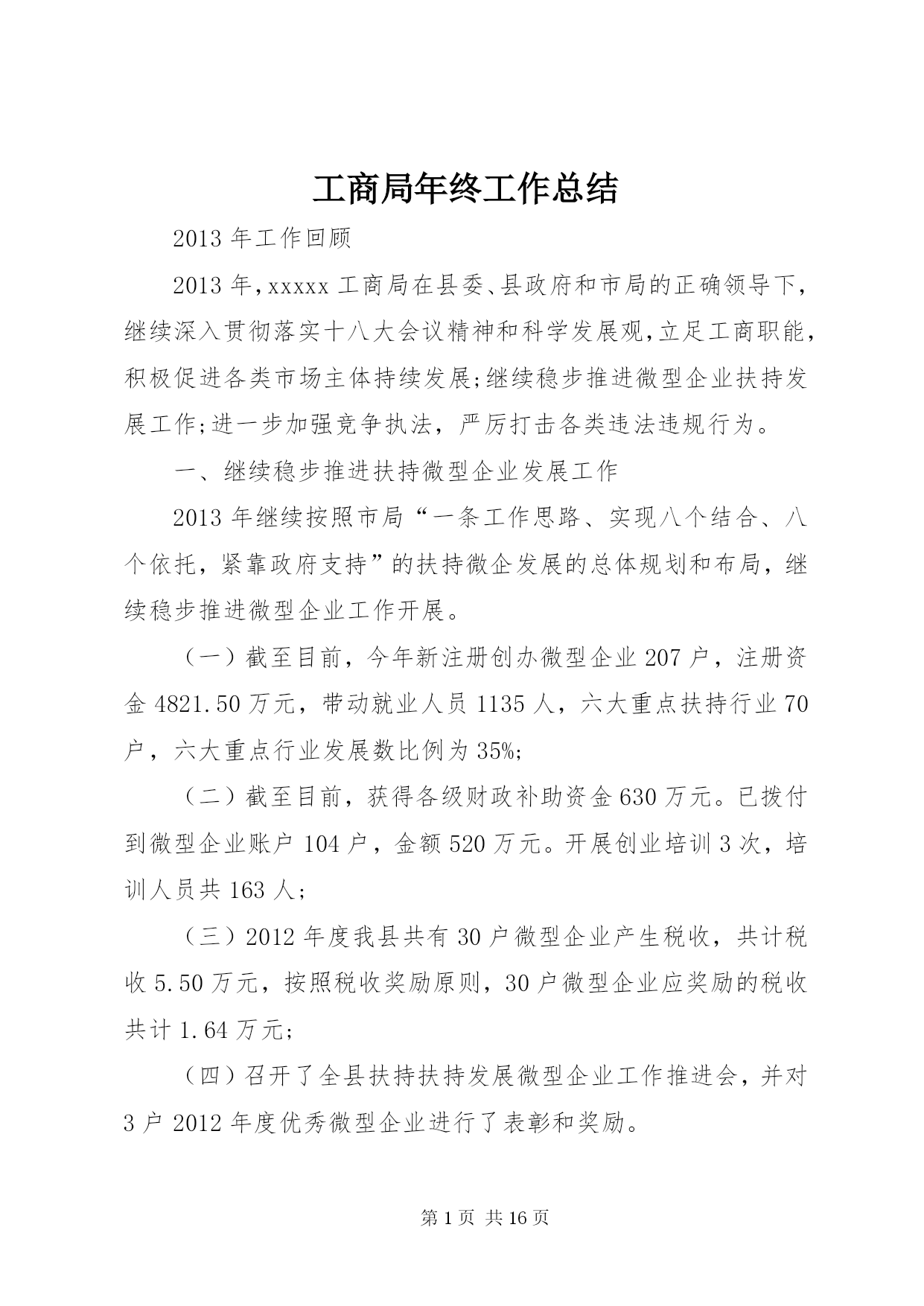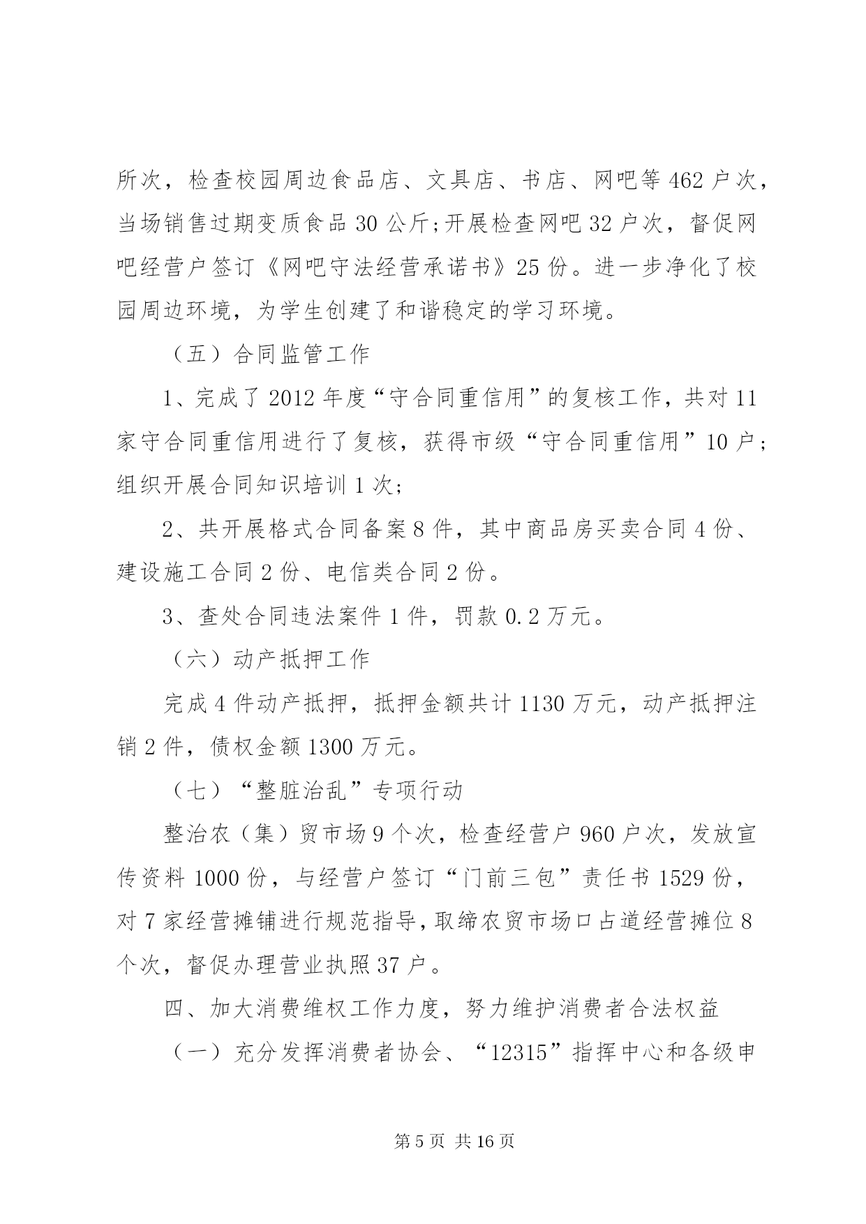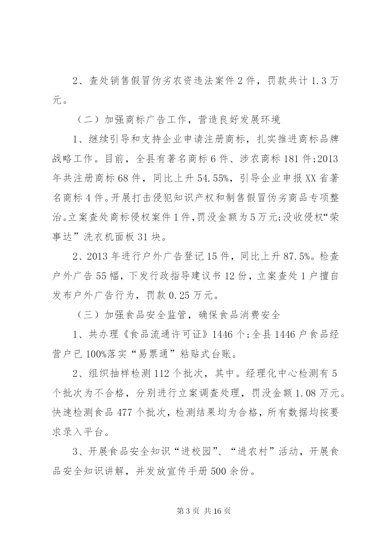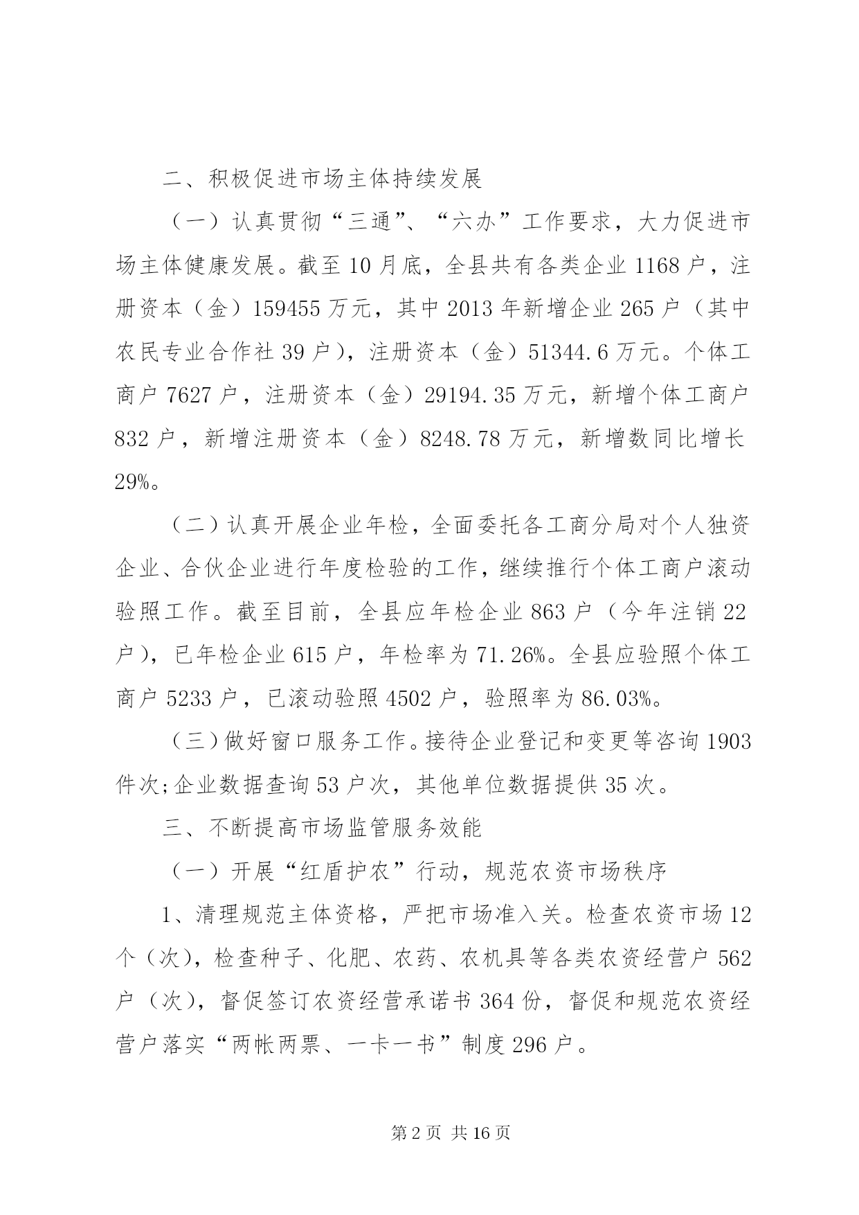 第PAGE\*Arabic\*MERGEFORMAT16页共NUMPAGES\*MERGEFORMAT16页工商局年终工作总结2013年工作回顾2013年,xxxxx工商局在县委、县政府和市局的正确领导下,继续深入贯彻落实十八大会议精神和科学发展观,立足工商职能,积极促进各类市场主体持续发展;继续稳步推进微型企业扶持发展工作;进一步加强竞争执法,严厉打击各类违法违规行为。一、继续稳步推进扶持微型企业发展工作2013年继续按照市局“一条工作思路、实现八个结合、八个依托,紧靠政府支持”的扶持微企发展的总体规划和布局,继续稳步推进微型企业工作开展。(一)截至目前,今年新注册创办微型企业207户,注册资金4821.50万元,带动就业人员1135人,六大重点扶持行业70户,六大重点行业发展数比例为35%;(二)截至目前,获得各级财政补助资金630万元。已拨付到微型企业账户104户,金额520万元。开展创业培训3次,培训人员共163人;(三)2012年度我县共有30户微型企业产生税收,共计税收5.50万元,按照税收奖励原则,30户微型企业应奖励的税收共计1.64万元;(四)召开了全县扶持扶持发展微型企业工作推进会,并对3户2012年度优秀微型企业进行了表彰和奖励。二、积极促进市场主体持续发展(一)认真贯彻“三通”、“六办”工作要求,大力促进市场主体健康发展。截至10月底,全县共有各类企业1168户,注册资本(金)159455万元,其中2013年新增企业265户(其中农民专业合作社39户),注册资本(金)51344.6万元。个体工商户7627户,注册资本(金)29194.35万元,新增个体工商户832户,新增注册资本(金)8248.78万元,新增数同比增长29%。(二)认真开展企业年检,全面委托各工商分局对个人独资企业、合伙企业进行年度检验的工作,继续推行个体工商户滚动验照工作。截至目前,全县应年检企业863户(今年注销22户),已年检企业615户,年检率为71.26%。全县应验照个体工商户5233户,已滚动验照4502户,验照率为86.03%。(三)做好窗口服务工作。接待企业登记和变更等咨询1903件次;企业数据查询53户次,其他单位数据提供35次。三、不断提高市场监管服务效能(一)开展“红盾护农”行动,规范农资市场秩序1、清理规范主体资格,严把市场准入关。检查农资市场12个(次),检查种子、化肥、农药、农机具等各类农资经营户562户(次),督促签订农资经营承诺书364份,督促和规范农资经营户落实“两帐两票、一卡一书”制度296户。2、查处销售假冒伪劣农资违法案件2件,罚款共计1.3万元。(二)加强商标广告工作,营造良好发展环境1、继续引导和支持企业申请注册商标,扎实推进商标品牌战略工作。目前,全县有著名商标6件、涉农商标181件;2013年共注册商标68件,同比上升54.55%,引导企业申报XX省著名商标4件。开展打击侵犯知识产权和制售假冒伪劣商品专项整治。立案查处商标侵权案件1件,罚没金额为5万元;没收侵权“荣事达”洗衣机面板31块。2、2013年进行户外广告登记15件,同比上升87.5%。检查户外广告55幅,下发行政指导建议书12份,立案查处1户擅自发布户外广告行为,罚款0.25万元。(三)加强食品安全监管,确保食品消费安全1、共办理《食品流通许可证》1446个;全县1446户食品经营户已100%落实“易票通”粘贴式台账。2、组织抽样检测112个批次,其中。经理化中心检测有5个批次为不合格,分别进行立案调查处理,罚没金额1.08万元。快速检测食品477个批次,检测结果均为合格,所有数据均按要求录入平台。3、开展食品安全知识“进校园”、“进农村”活动,开展食品安全知识讲解,并发放宣传手册500余份。4、开展节日市场、学校营养早餐、食品添加剂等各类食品安全专项检查,共没收不合格称6把,下柜无qs标志食品16公斤,责令当事人当场销毁过期食品102公斤,责令下柜无“qs”标识波波糖、茶叶等食品36公斤。(四)抓好各类市场专项整治工作1、节日市场监管截止目前,共检查各类经营主体1028户(次),其中食品经营户898户(次)、家电经营户31户(次)、旅游商品经营户9户(次)、其他经营户67户(次),共开展行政指导95件,下达责令改正通知书500份。2、切实做好安全生产工作。检查烟花爆竹生产、批发企业2户次,检查烟花爆竹零售经营户367户(次),检查加油站等检查危化物品经营户21户(次),规范主体资格1户,下达责令改正通知书5份。3、旅游市场监管。检查景区市场3个次,检查旅店、餐饮、摄影等各类经营户12户次,取缔无照经营1户、乱摆摊设点8个,劝散兜售人员5人(次),拆除破损户外广告18幅。4、猪肉市场监管。检查屠宰企业1