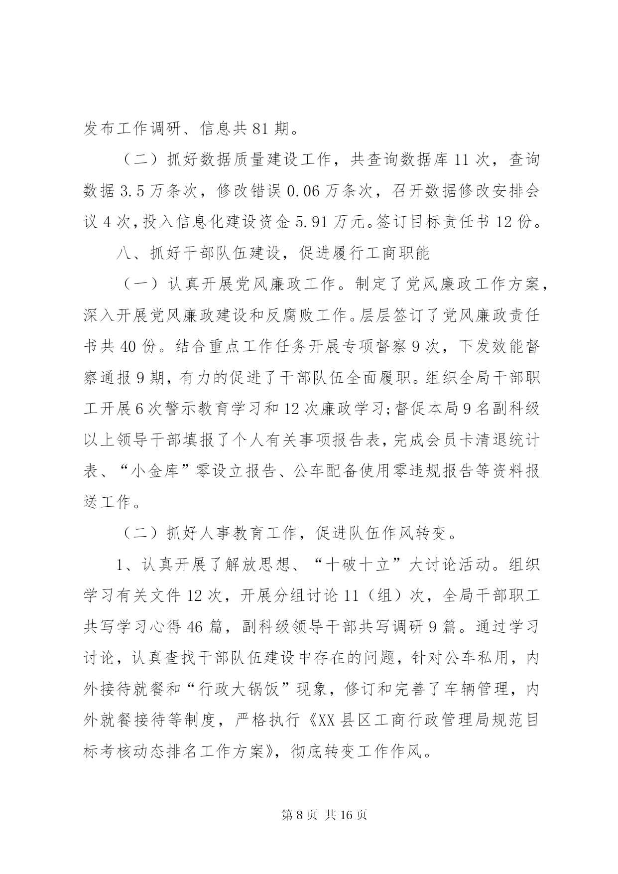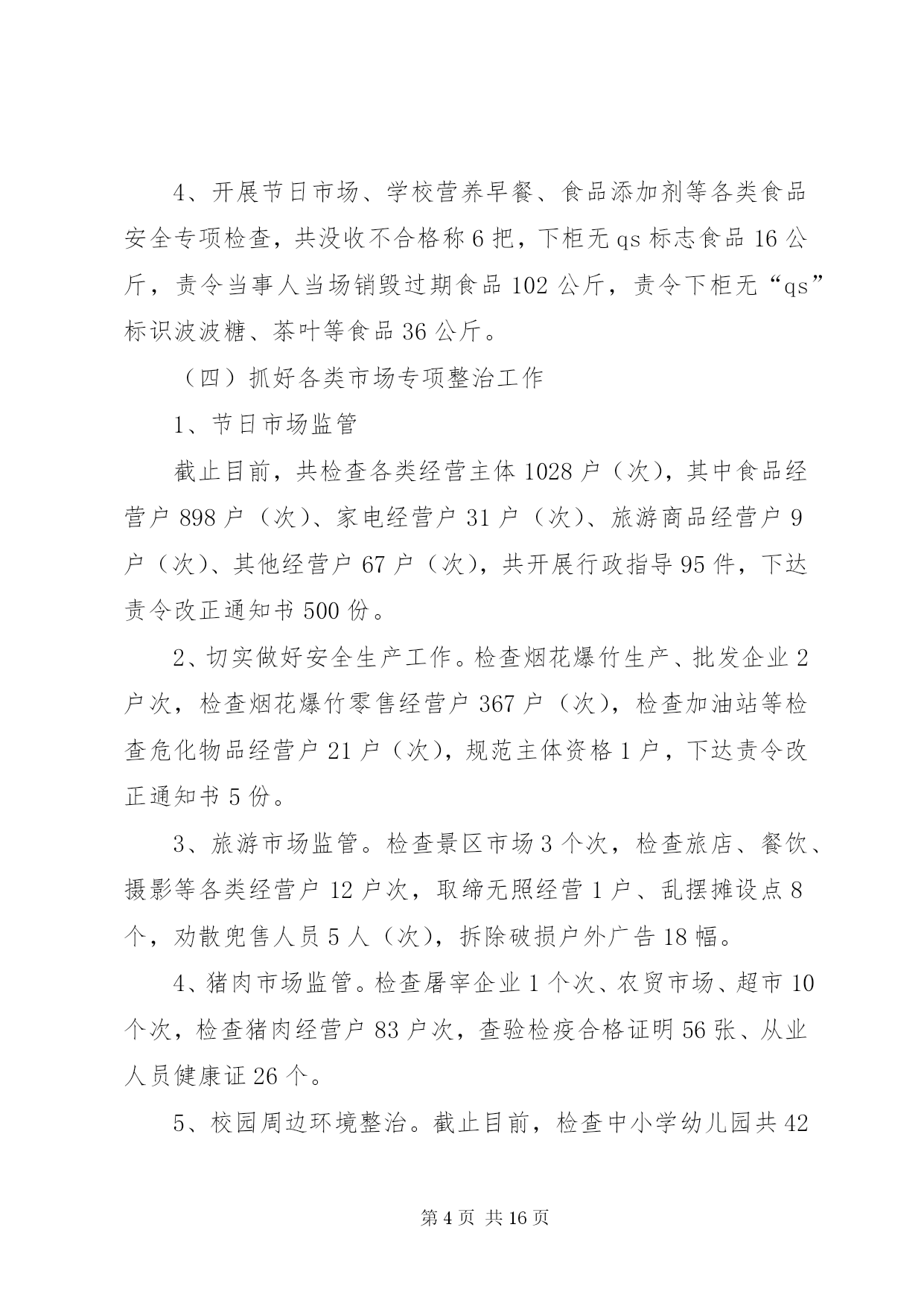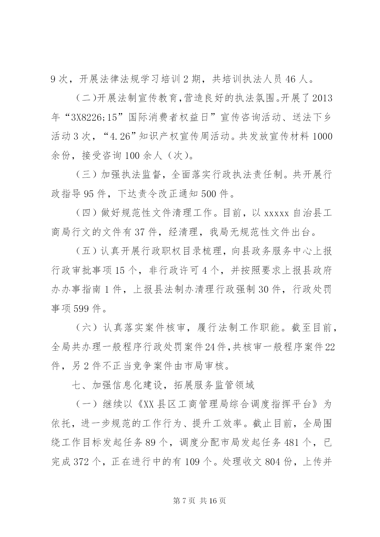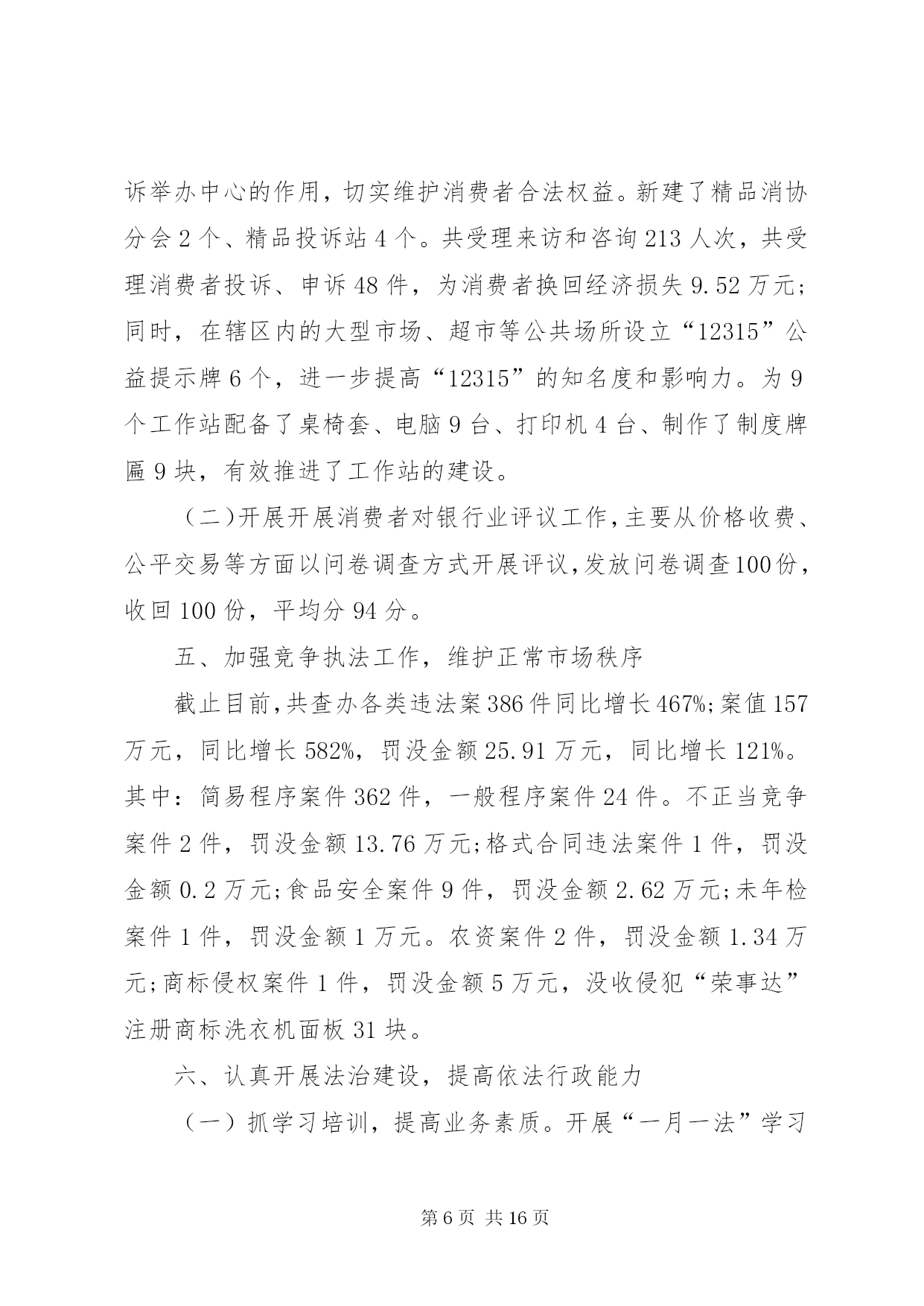 第PAGE\*Arabic\*MERGEFORMAT16页共NUMPAGES\*MERGEFORMAT16页工商局年终工作总结2013年工作回顾2013年,xxxxx工商局在县委、县政府和市局的正确领导下,继续深入贯彻落实十八大会议精神和科学发展观,立足工商职能,积极促进各类市场主体持续发展;继续稳步推进微型企业扶持发展工作;进一步加强竞争执法,严厉打击各类违法违规行为。一、继续稳步推进扶持微型企业发展工作2013年继续按照市局“一条工作思路、实现八个结合、八个依托,紧靠政府支持”的扶持微企发展的总体规划和布局,继续稳步推进微型企业工作开展。(一)截至目前,今年新注册创办微型企业207户,注册资金4821.50万元,带动就业人员1135人,六大重点扶持行业70户,六大重点行业发展数比例为35%;(二)截至目前,获得各级财政补助资金630万元。已拨付到微型企业账户104户,金额520万元。开展创业培训3次,培训人员共163人;(三)2012年度我县共有30户微型企业产生税收,共计税收5.50万元,按照税收奖励原则,30户微型企业应奖励的税收共计1.64万元;(四)召开了全县扶持扶持发展微型企业工作推进会,并对3户2012年度优秀微型企业进行了表彰和奖励。二、积极促进市场主体持续发展(一)认真贯彻“三通”、“六办”工作要求,大力促进市场主体健康发展。截至10月底,全县共有各类企业1168户,注册资本(金)159455万元,其中2013年新增企业265户(其中农民专业合作社39户),注册资本(金)51344.6万元。个体工商户7627户,注册资本(金)29194.35万元,新增个体工商户832户,新增注册资本(金)8248.78万元,新增数同比增长29%。(二)认真开展企业年检,全面委托各工商分局对个人独资企业、合伙企业进行年度检验的工作,继续推行个体工商户滚动验照工作。截至目前,全县应年检企业863户(今年注销22户),已年检企业615户,年检率为71.26%。全县应验照个体工商户5233户,已滚动验照4502户,验照率为86.03%。(三)做好窗口服务工作。接待企业登记和变更等咨询1903件次;企业数据查询53户次,其他单位数据提供35次。三、不断提高市场监管服务效能(一)开展“红盾护农”行动,规范农资市场秩序1、清理规范主体资格,严把市场准入关。检查农资市场12个(次),检查种子、化肥、农药、农机具等各类农资经营户562户(次),督促签订农资经营承诺书364份,督促和规范农资经营户落实“两帐两票、一卡一书”制度296户。2、查处销售假冒伪劣农资违法案件2件,罚款共计1.3万元。(二)加强商标广告工作,营造良好发展环境1、继续引导和支持企业申请注册商标,扎实推进商标品牌战略工作。目前,全县有著名商标6件、涉农商标181件;2013年共注册商标68件,同比上升54.55%,引导企业申报XX省著名商标4件。开展打击侵犯知识产权和制售假冒伪劣商品专项整治。立案查处商标侵权案件1件,罚没金额为5万元;没收侵权“荣事达”洗衣机面板31块。2、2013年进行户外广告登记15件,同比上升87.5%。检查户外广告55幅,下发行政指导建议书12份,立案查处1户擅自发布户外广告行为,罚款0.25万元。(三)加强食品安全监管,确保食品消费安全1、共办理《食品流通许可证》1446个;全县1446户食品经营户已100%落实“易票通”粘贴式台账。2、组织抽样检测112个批次,其中。经理化中心检测有5个批次为不合格,分别进行立案调查处理,罚没金额1.08万元。快速检测食品477个批次,检测结果均为合格,所有数据均按要求录入平台。3、开展食品安全知识“进校园”、“进农村”活动,开展食品安全知识讲解,并发放宣传手册500余份。4、开展节日市场、学校营养早餐、食品添加剂等各类食品安全专项检查,共没收不合格称6把,下柜无qs标志食品16公斤,责令当事人当场销毁过期食品102公斤,责令下柜无“qs”标识波波糖、茶叶等食品36公斤。(四)抓好各类市场专项整治工作1、节日市场监管截止目前,共检查各类经营主体1028户(次),其中食品经营户898户(次)、家电经营户31户(次)、旅游商品经营户9户(次)、其他经营户67户(次),共开展行政指导95件,下达责令改正通知书500份。2、切实做好安全生产工作。检查烟花爆竹生产、批发企业2户次,检查烟花爆竹零售经营户367户(次),检查加油站等检查危化物品经营户21户(次),规范主体资格1户,下达责令改正通知书5份。3、旅游市场监管。检查景区市场3个次,检查旅店、餐饮、摄影等各类经营户12户次,取缔无照经营1户、乱摆摊设点8个,劝散兜售人员5人(次),拆除破损户外广告18幅。4、猪肉市场监管。检查屠宰企业1