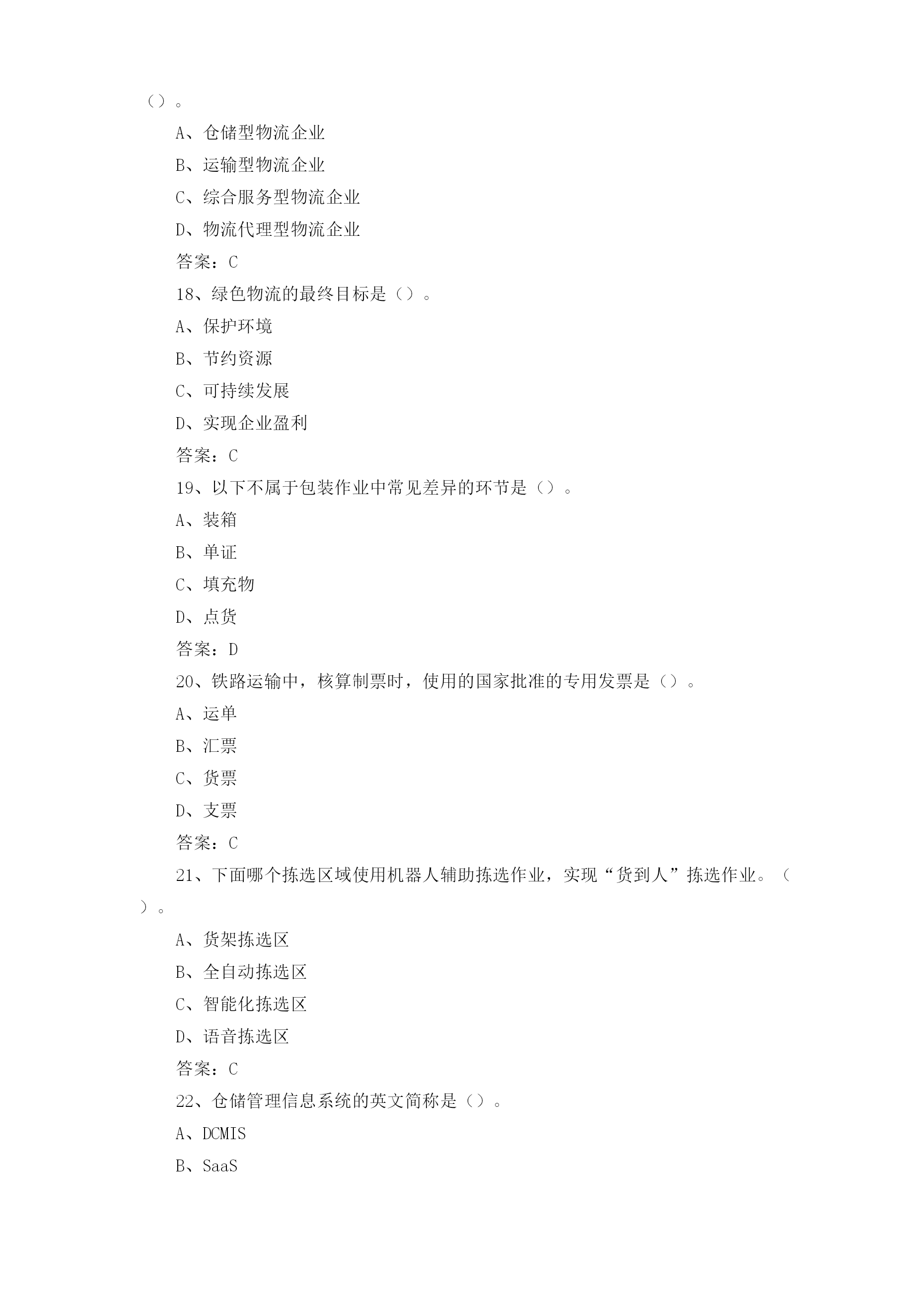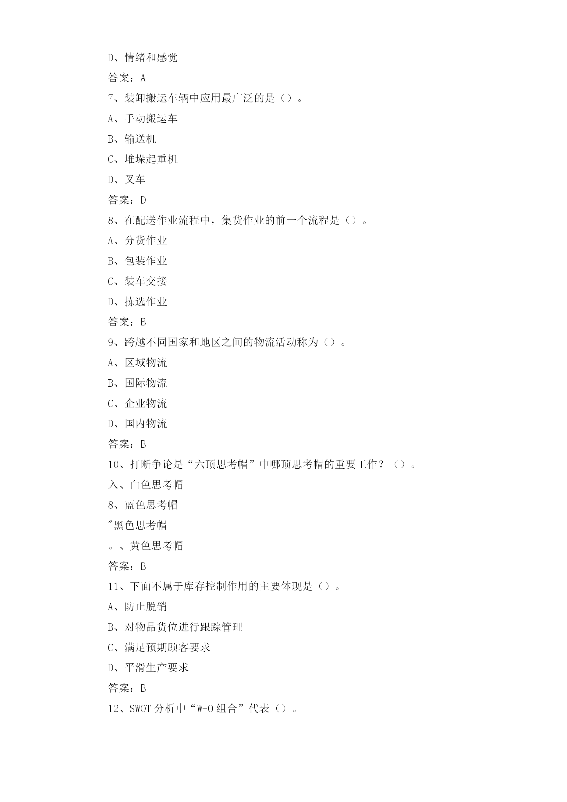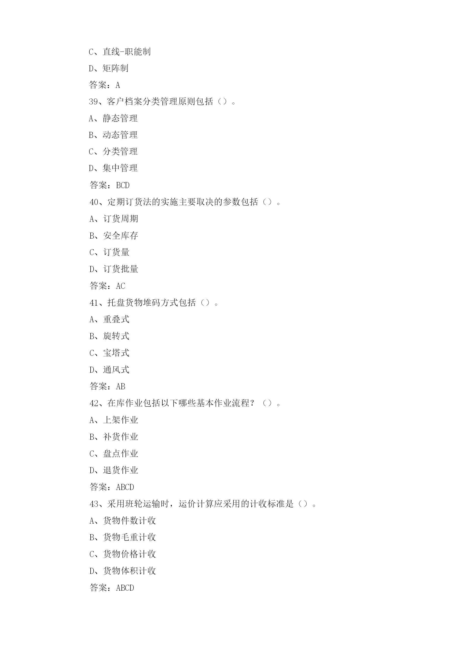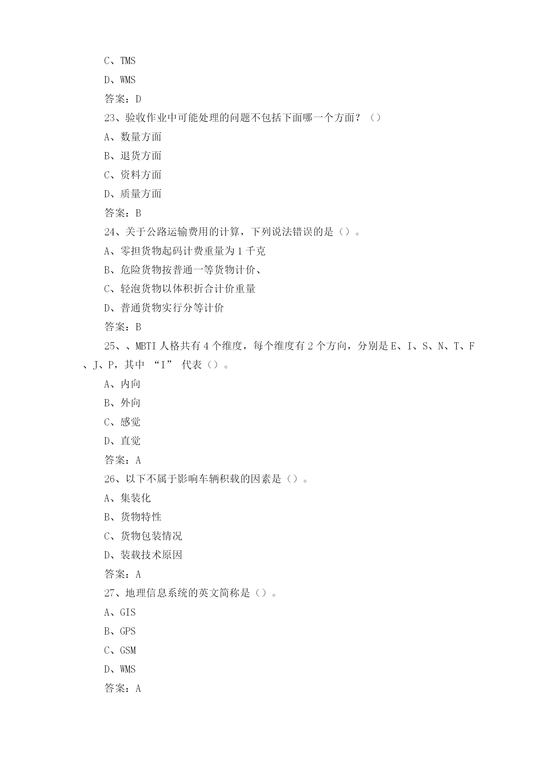 1+X物流管理练习题库及答案1、与物流拣选机器人相比,分拣机器人取消了()。A、托举装置B、托盘货物投放装置C、充电系统D、导航系统答案:A2、从订货到交货所需的时间是()。A、生产日程计划B、库存周期C、供应间隔期D、订货周期答案:D3、下列活动中属于分货作业的是()。A、领取拣选汇总表B、打印发货差异表C、将货物放入分区集货位D、将货物送入客户包装工作站答案:B4、配送作业的最后一个节点是()。A、配送站点B、配送中心C、客户D、中转点答案:A5、四号定位法是用四个号码来表示物资在仓库中的位置的一种物资存储管理方法。某货物的存储编号是:3-4-5-6,请问其中5表示的是()。A、仓位顺序号B、货架层号C、库房号D、货架号答案:B6、“六顶思考帽”中“蓝色思考帽”代表的是()。A、控制和组织B、乐观和肯定C、负面的判断D、情绪和感觉答案:A7、装卸搬运车辆中应用最广泛的是()。A、手动搬运车B、输送机C、堆垛起重机D、叉车答案:D8、在配送作业流程中,集货作业的前一个流程是()。A、分货作业B、包装作业C、装车交接D、拣选作业答案:B9、跨越不同国家和地区之间的物流活动称为()。A、区域物流B、国际物流C、企业物流D、国内物流答案:B10、打断争论是“六顶思考帽”中哪顶思考帽的重要工作?()。入、白色思考帽8、蓝色思考帽"黑色思考帽。、黄色思考帽答案:B11、下面不属于库存控制作用的主要体现是()。A、防止脱销B、对物品货位进行跟踪管理C、满足预期顾客要求D、平滑生产要求答案:B12、SWOT分析中“W-O组合”代表()。A、劣势-机会B、优势-劣势C、优势-机会D、劣势-威胁答案:A13、哪方在托运单上签字后,货物是责任由托运人转至承运人?()。A、托运人B、承运人C、收货人D、保险代表答案:B14、GPS的全称是()。A、地理信息系统B、全球通讯系统C、全球定位系统D、物流信息系统答案:C15、发达国家政府倡导绿色物流配送的对策是在三个方面制定相关的政策,下列不属于这三个方面的是()。A、污染发生源B、交通量C、交通流D、物流系统答案:D16、分拨中心一般使用自动化分拨设备,对到件拆包后,根据目的地进行的作业是()。A、一次集包B、二次集包C、一次分拣D、二次分拣答案:D17、顺丰速运有限公司在速运业务的基础上,坚持以客户需求为核心,积极拓展多元化业务,提供仓储业务及针对电商、食品、电子等不同类型客户开发出一站式供应链解决方案,从以上业务范围可看出顺丰速运有限公司属于()。A、仓储型物流企业B、运输型物流企业C、综合服务型物流企业D、物流代理型物流企业答案:C18、绿色物流的最终目标是()。A、保护环境B、节约资源C、可持续发展D、实现企业盈利答案:C19、以下不属于包装作业中常见差异的环节是()。A、装箱B、单证C、填充物D、点货答案:D20、铁路运输中,核算制票时,使用的国家批准的专用发票是()。A、运单B、汇票C、货票D、支票答案:C21、下面哪个拣选区域使用机器人辅助拣选作业,实现“货到人”拣选作业。()。A、货架拣选区B、全自动拣选区C、智能化拣选区D、语音拣选区答案:C22、仓储管理信息系统的英文简称是()。TOC\o"1-5"\h\zA、DCMISB、SaaSC、TMSD、WMS答案:D23、验收作业中可能处理的问题不包括下面哪一个方面?()A、数量方面B、退货方面C、资料方面D、质量方面答案:B24、关于公路运输费用的计算,下列说法错误的是()。A、零担货物起码计费重量为1千克B、危险货物按普通一等货物计价、C、轻泡货物以体积折合计价重量D、普通货物实行分等计价答案:B25、、MBTI人格共有4个维度,每个维度有2个方向,分别是E、I、S、N、T、F、J、P,其中“I”代表()。A、内向B、外向C、感觉D、直觉答案:A26、以下不属于影响车辆积载的因素是()。A、集装化B、货物特性C、货物包装情况D、装载技术原因答案:A27、地理信息系统的英文简称是()。TOC\o"1-5"\h\zA、GISB、GPSC、GSMD、WMS答案:A28、下列可以作为零担货物办理托运的货品是()。A、活鸡活鸭B、易爆炸品C、电脑主机D、易燃液体答案:C29、资质差的分包商有时会发生因诈骗而导致货物失踪的风险,这种风险是()。A、诈骗风险B、传递性分险C、环境污染风险D、交