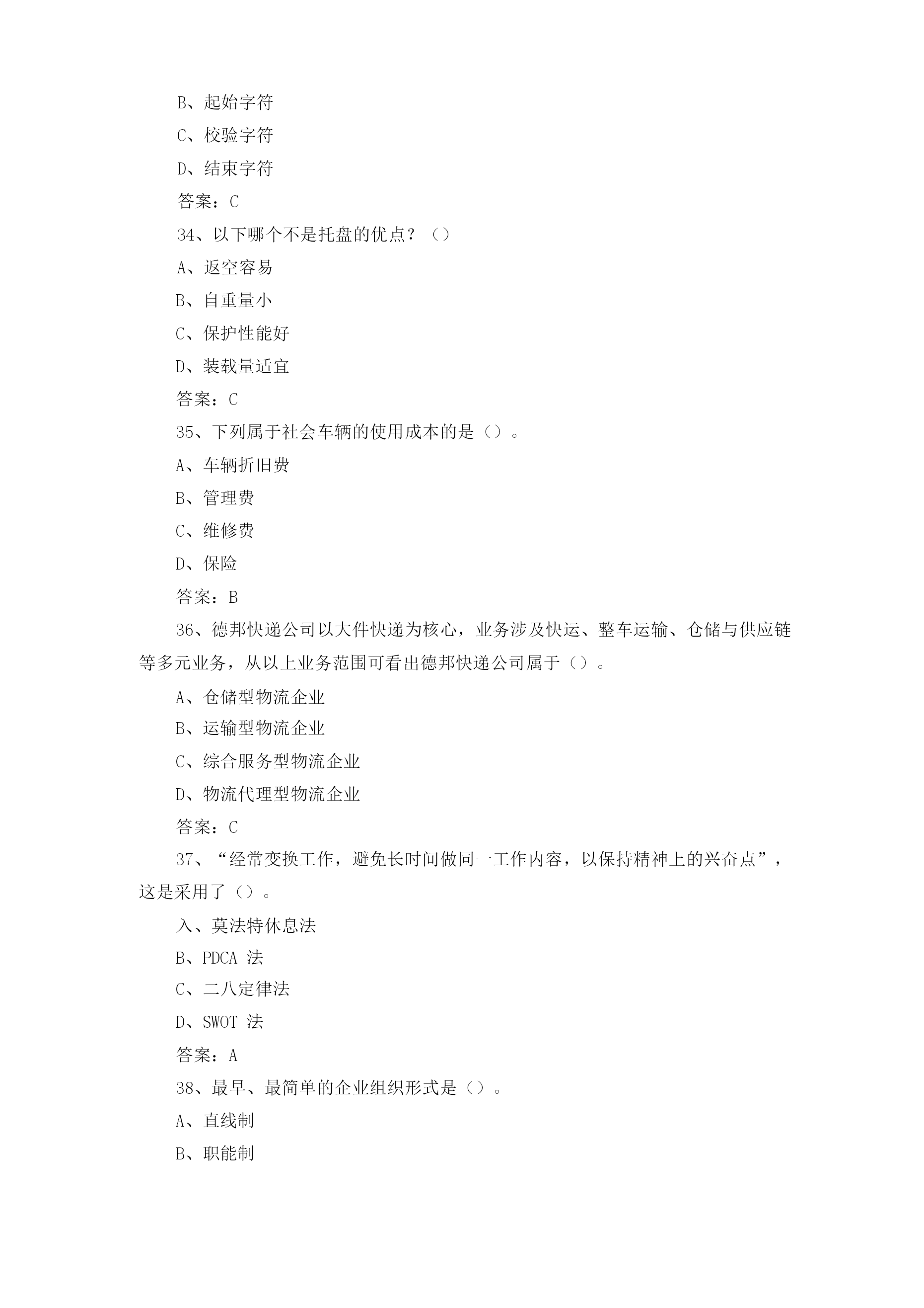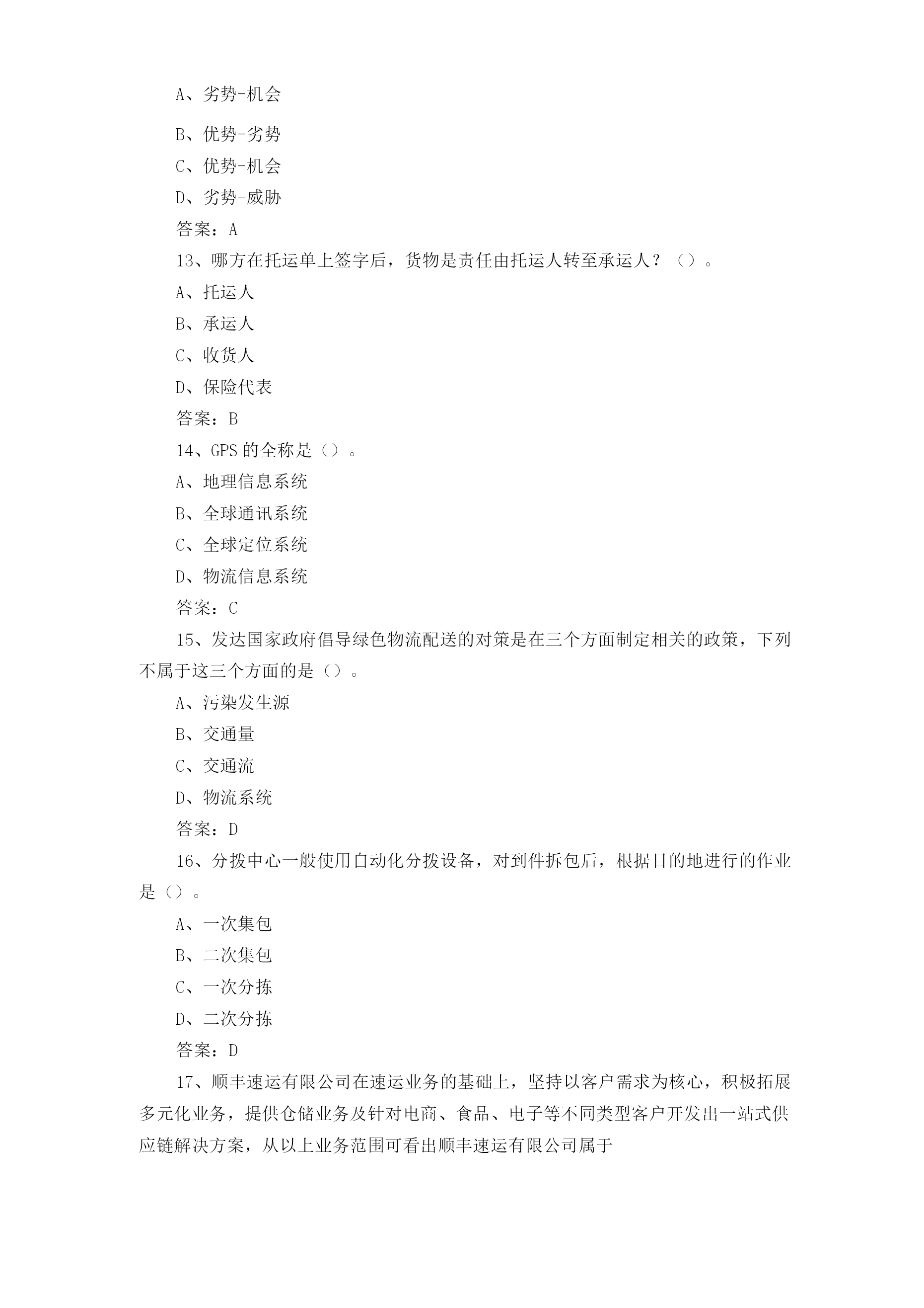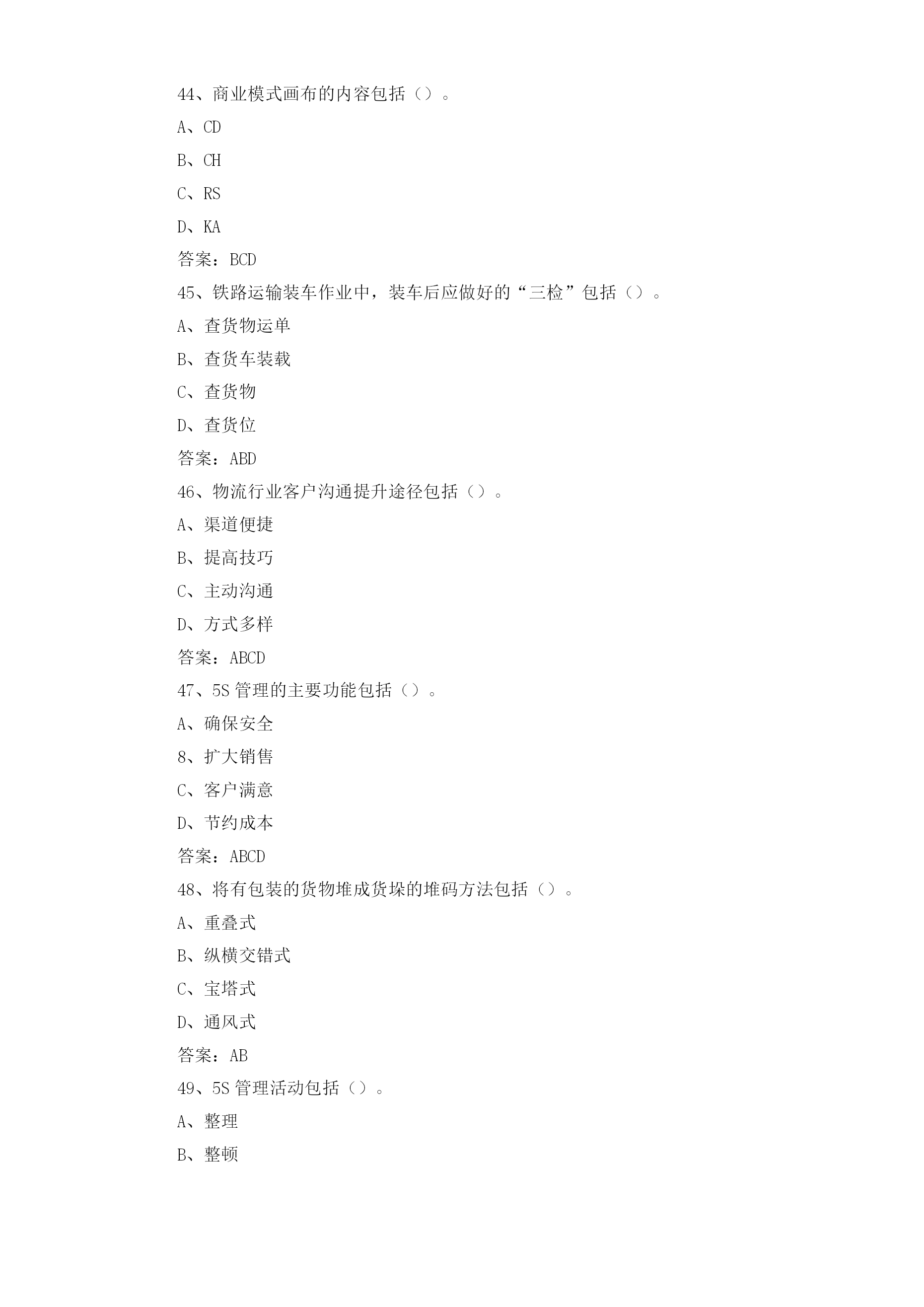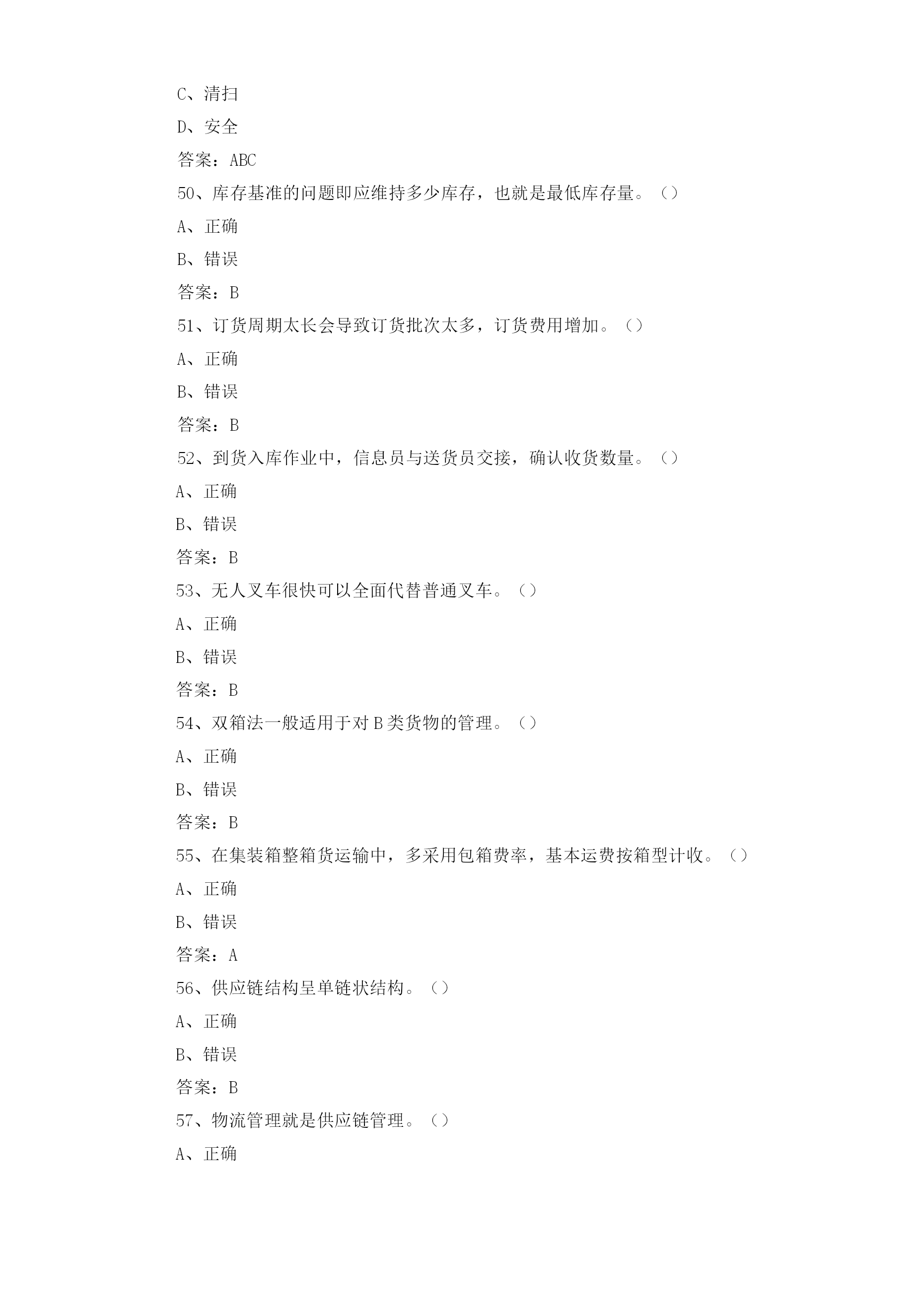 1+X物流管理练习题库及答案1、与物流拣选机器人相比,分拣机器人取消了()。A、托举装置B、托盘货物投放装置C、充电系统D、导航系统答案:A2、从订货到交货所需的时间是()。A、生产日程计划B、库存周期C、供应间隔期D、订货周期答案:D3、下列活动中属于分货作业的是()。A、领取拣选汇总表B、打印发货差异表C、将货物放入分区集货位D、将货物送入客户包装工作站答案:B4、配送作业的最后一个节点是()。A、配送站点B、配送中心C、客户D、中转点答案:A5、四号定位法是用四个号码来表示物资在仓库中的位置的一种物资存储管理方法。某货物的存储编号是:3-4-5-6,请问其中5表示的是()。A、仓位顺序号B、货架层号C、库房号D、货架号答案:B6、“六顶思考帽”中“蓝色思考帽”代表的是()。A、控制和组织B、乐观和肯定C、负面的判断D、情绪和感觉答案:A7、装卸搬运车辆中应用最广泛的是()。A、手动搬运车B、输送机C、堆垛起重机D、叉车答案:D8、在配送作业流程中,集货作业的前一个流程是()。A、分货作业B、包装作业C、装车交接D、拣选作业答案:B9、跨越不同国家和地区之间的物流活动称为()。A、区域物流B、国际物流C、企业物流D、国内物流答案:B10、打断争论是“六顶思考帽”中哪顶思考帽的重要工作?()。入、白色思考帽8、蓝色思考帽"黑色思考帽。、黄色思考帽答案:B11、下面不属于库存控制作用的主要体现是()。A、防止脱销B、对物品货位进行跟踪管理C、满足预期顾客要求D、平滑生产要求答案:B12、SWOT分析中“W-O组合”代表()。A、劣势-机会B、优势-劣势C、优势-机会D、劣势-威胁答案:A13、哪方在托运单上签字后,货物是责任由托运人转至承运人?()。A、托运人B、承运人C、收货人D、保险代表答案:B14、GPS的全称是()。A、地理信息系统B、全球通讯系统C、全球定位系统D、物流信息系统答案:C15、发达国家政府倡导绿色物流配送的对策是在三个方面制定相关的政策,下列不属于这三个方面的是()。A、污染发生源B、交通量C、交通流D、物流系统答案:D16、分拨中心一般使用自动化分拨设备,对到件拆包后,根据目的地进行的作业是()。A、一次集包B、二次集包C、一次分拣D、二次分拣答案:D17、顺丰速运有限公司在速运业务的基础上,坚持以客户需求为核心,积极拓展多元化业务,提供仓储业务及针对电商、食品、电子等不同类型客户开发出一站式供应链解决方案,从以上业务范围可看出顺丰速运有限公司属于()。A、仓储型物流企业B、运输型物流企业C、综合服务型物流企业D、物流代理型物流企业答案:C18、绿色物流的最终目标是()。A、保护环境B、节约资源C、可持续发展D、实现企业盈利答案:C19、以下不属于包装作业中常见差异的环节是()。A、装箱B、单证C、填充物D、点货答案:D20、铁路运输中,核算制票时,使用的国家批准的专用发票是()。A、运单B、汇票C、货票D、支票答案:C21、下面哪个拣选区域使用机器人辅助拣选作业,实现“货到人”拣选作业。()。A、货架拣选区B、全自动拣选区C、智能化拣选区D、语音拣选区答案:C22、仓储管理信息系统的英文简称是()。TOC\o"1-5"\h\zA、DCMISB、SaaSC、TMSD、WMS答案:D23、验收作业中可能处理的问题不包括下面哪一个方面?()A、数量方面B、退货方面C、资料方面D、质量方面答案:B24、关于公路运输费用的计算,下列说法错误的是()。A、零担货物起码计费重量为1千克B、危险货物按普通一等货物计价、C、轻泡货物以体积折合计价重量D、普通货物实行分等计价答案:B25、、MBTI人格共有4个维度,每个维度有2个方向,分别是E、I、S、N、T、F、J、P,其中“I”代表()。A、内向B、外向C、感觉D、直觉答案:A26、以下不属于影响车辆积载的因素是()。A、集装化B、货物特性C、货物包装情况D、装载技术原因答案:A27、地理信息系统的英文简称是()。TOC\o"1-5"\h\zA、GISB、GPSC、GSMD、WMS答案:A28、下列可以作为零担货物办理托运的货品是()。A、活鸡活鸭B、易爆炸品C、电脑主机D、易燃液体答案:C29、资质差的分包商有时会发生因诈骗而导致货物失踪的风险,这种风险是()。A、诈骗风险B、传递性分险C、环境污染风险D、交
