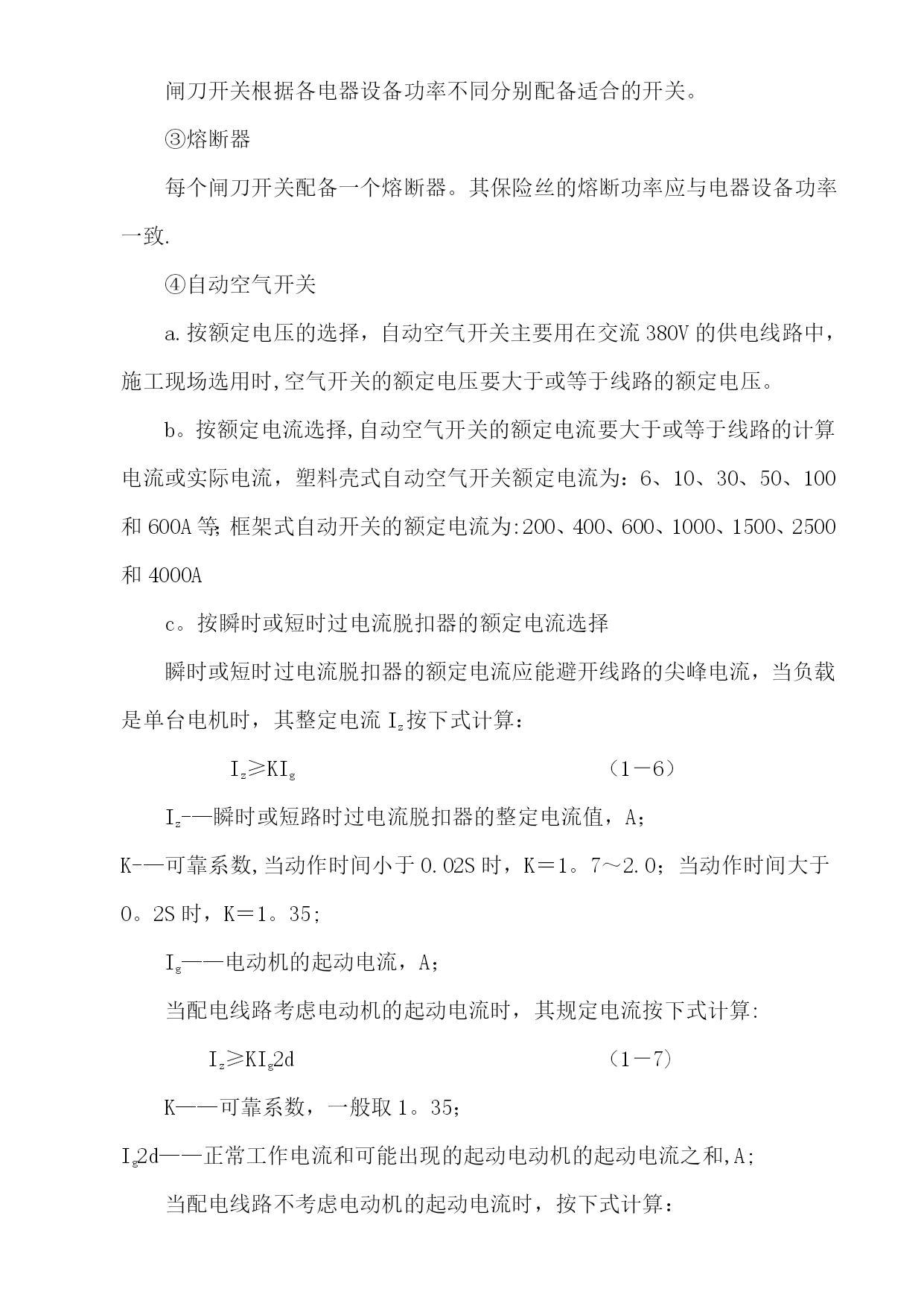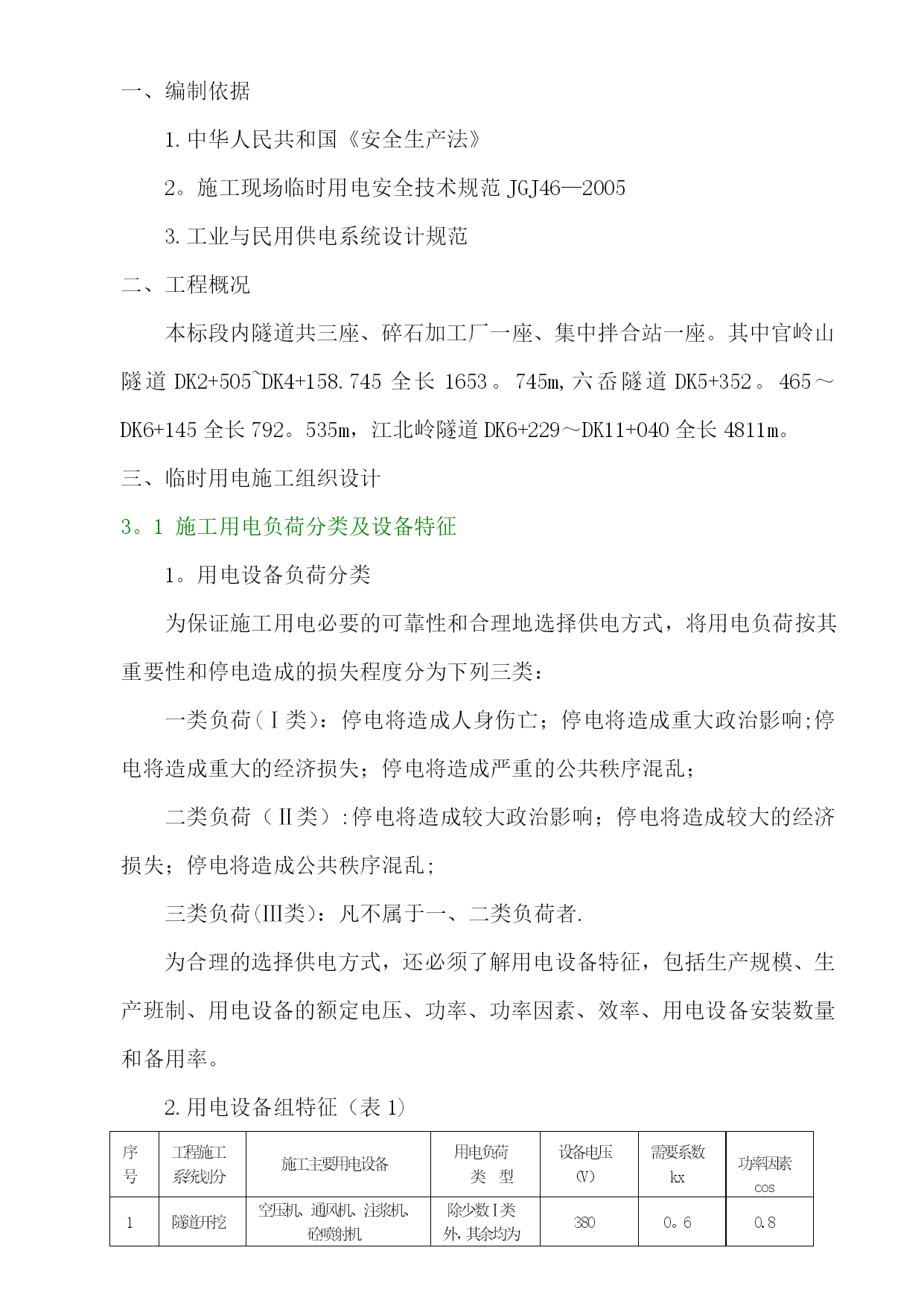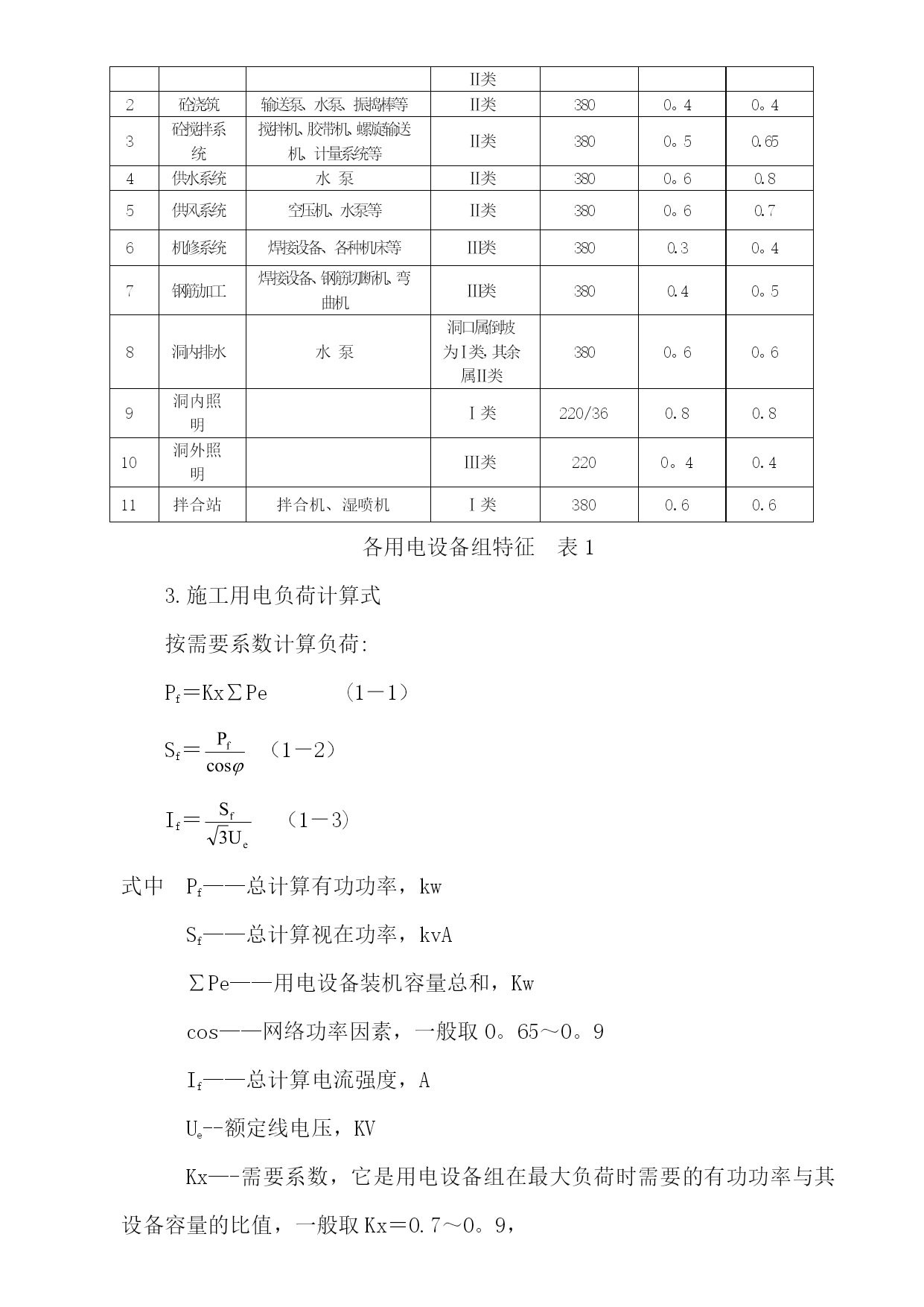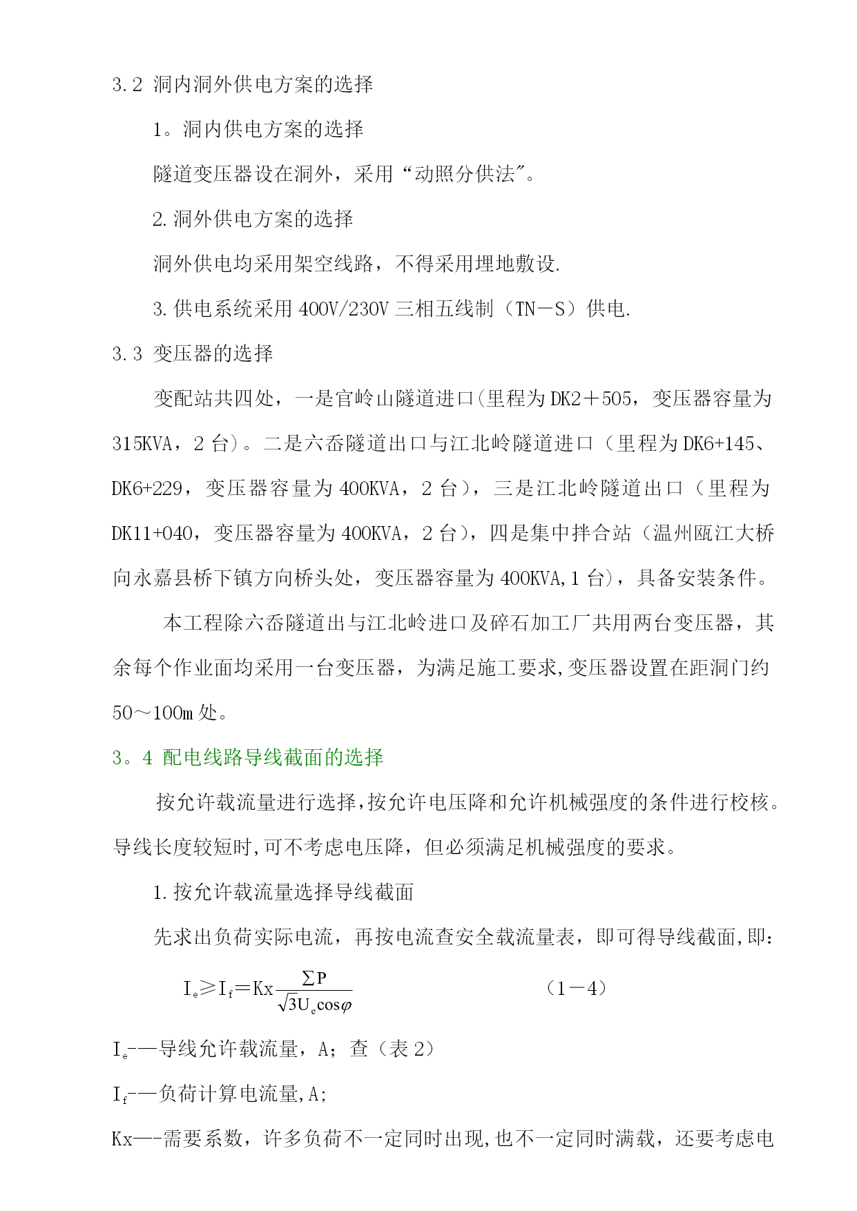 隧道施工临时用电方案实用文档(实用文档,可以直接使用,可编辑优秀版资料,欢迎下载)新建乐清湾港区铁路支线工程SG02标(DK2+505~DK11+040)隧道施工临时用电方案中铁大桥局集团浙江乐清湾铁路SG02标项目经理部二〇一六年三月新建乐清湾港区铁路支线工程SG02标(DK2+505~DK11+040)隧道施工临时用电方案编制:复核:中铁大桥局集团浙江乐清湾铁路SG02标项目经理部二〇一六年三月目录TOC\o"1-3"\h\z\uHYPERLINK\l"_Toc427247514"一、编制依据PAGEREF_Toc427247514\h1HYPERLINK\l”_Toc427247515"二、工程概况PAGEREF_Toc427247515\h1HYPERLINK\l"_Toc427247516”三、临时用电施工组织设计PAGEREF_Toc427247516\h1HYPERLINK\l”_Toc427247517”3。1施工用电负荷分类及设备特征PAGEREF_Toc427247517\h1HYPERLINK\l"_Toc427247518”3。2洞内洞外供电方案的选择PAGEREF_Toc427247518\h3HYPERLINK\l”_Toc427247519”3.3变压器的选择PAGEREF_Toc427247519\h3HYPERLINK\l"_Toc427247520"3.4配电线路导线截面的选择PAGEREF_Toc427247520\h3HYPERLINK\l"_Toc427247521"3。5配电箱及开关箱电器装置的选择PAGEREF_Toc427247521\h6HYPERLINK\l"_Toc427247522”四、供电系统安装作业PAGEREF_Toc427247522\h8HYPERLINK\l”_Toc427247523”4.1配电线路的安装PAGEREF_Toc427247523\h8HYPERLINK\l"_Toc427247524”4.1。1洞外架空配电线路安装PAGEREF_Toc427247524\h8HYPERLINK\l"_Toc427247525"4.1。2洞内配电线路安装PAGEREF_Toc427247525\h9HYPERLINK\l”_Toc427247526”4。2配电箱、开关箱的安装PAGEREF_Toc427247526\h9HYPERLINK\l”_Toc427247527"五、用电设备安装PAGEREF_Toc427247527\h9HYPERLINK\l”_Toc427247528”六、洞内照明PAGEREF_Toc427247528\h10HYPERLINK\l"_Toc427247529”七、使用和维护PAGEREF_Toc427247529\h11HYPERLINK\l”_Toc427247530"八、质量标准PAGEREF_Toc427247530\h12HYPERLINK\l”_Toc427247531"九、安全作业PAGEREF_Toc427247531\h12一、编制依据1.中华人民共和国《安全生产法》2。施工现场临时用电安全技术规范JGJ46—20053.工业与民用供电系统设计规范二、工程概况本标段内隧道共三座、碎石加工厂一座、集中拌合站一座。其中官岭山隧道DK2+505~DK4+158.745全长1653。745m,六岙隧道DK5+352。465~DK6+145全长792。535m,江北岭隧道DK6+229~DK11+040全长4811m。三、临时用电施工组织设计3。1施工用电负荷分类及设备特征1。用电设备负荷分类为保证施工用电必要的可靠性和合理地选择供电方式,将用电负荷按其重要性和停电造成的损失程度分为下列三类:一类负荷(Ⅰ类):停电将造成人身伤亡;停电将造成重大政治影响;停电将造成重大的经济损失;停电将造成严重的公共秩序混乱;二类负荷(Ⅱ类):停电将造成较大政治影响;停电将造成较大的经济损失;停电将造成公共秩序混乱;三类负荷(Ⅲ类):凡不属于一、二类负荷者.为合理的选择供电方式,还必须了解用电设备特征,包括生产规模、生产班制、用电设备的额定电压、功率、功率因素、效率、用电设备安装数量和备用率。2.用电设备组特征(表1)序号工程施工系统划分施工主要用电设备