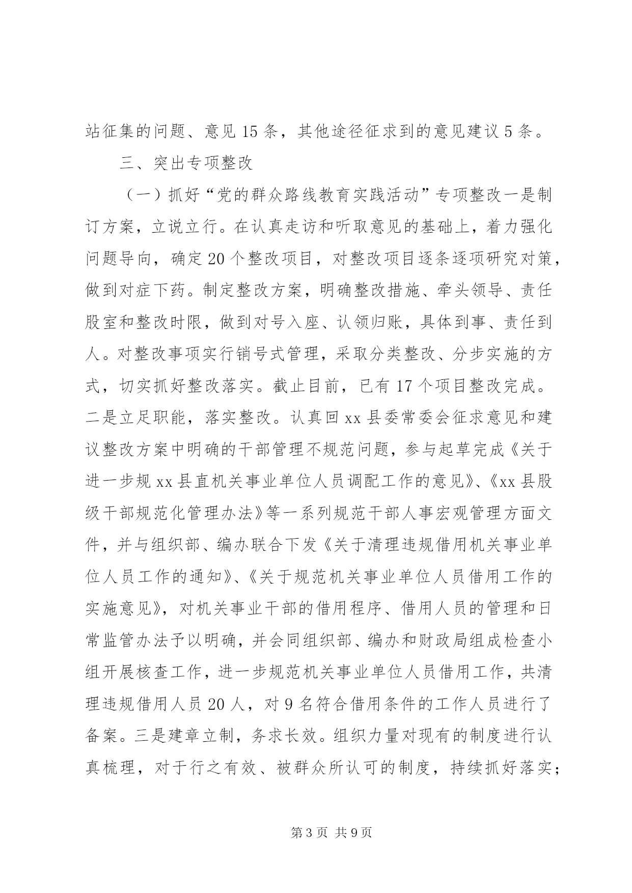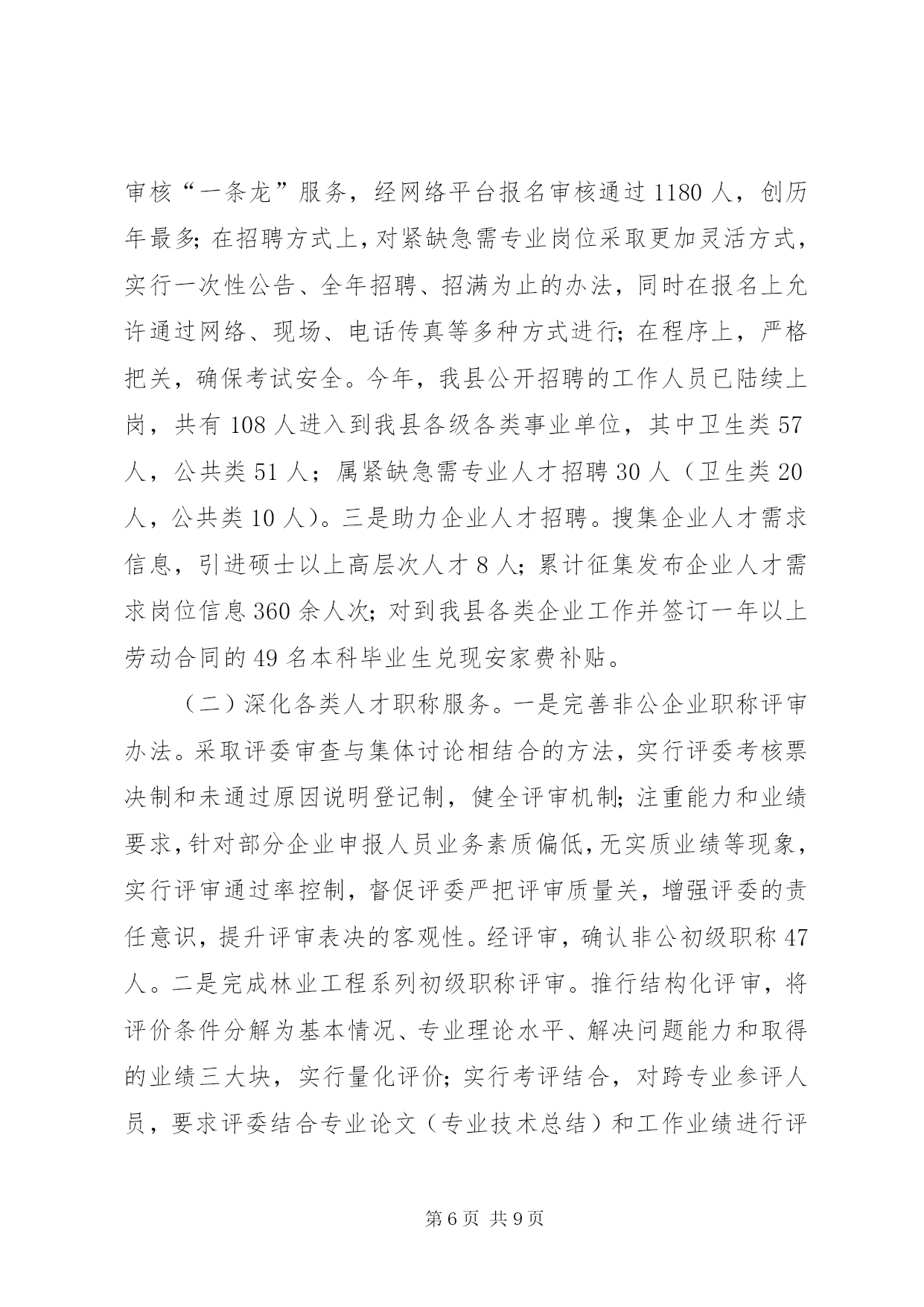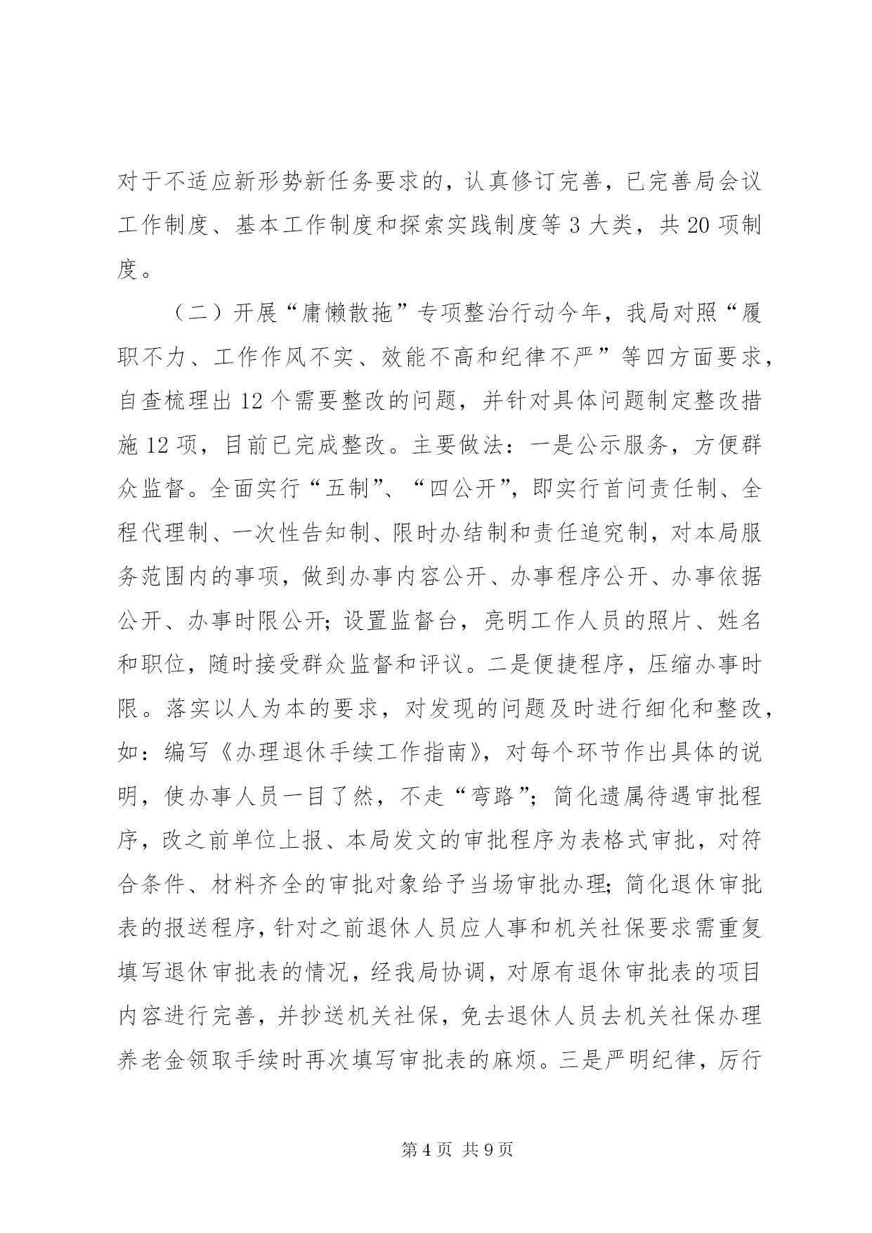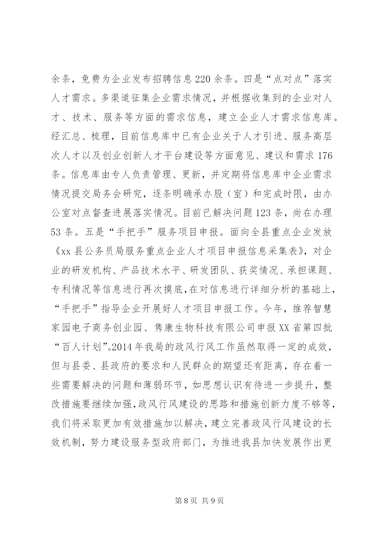 第PAGE\*Arabic\*MERGEFORMAT9页共NUMPAGES\*MERGEFORMAT9页县公务员局工作报告一年来,我局深入贯彻落实党的十八届三中、四中全会和中央“八项规定”精神,围绕着人事人才的工作重点,结合党的群众路线教育实践活动,发扬求真务实的作风,着力解决政风行风建设中存在的问题,不断提高依法行政水平,民主评议政风行风工作得到有效推进,取得一定的成效。一、抓好组织实施(一)加强领导,完善工作机制。健全民主评议政风行风建设领导小组及办公室,把民评工作列入常态工作,摆上重要议事日程,与人事人才工作一起研究部署。召开专题会议,分析局政风行风现状,研究解决存在问题,安排部署评议工作。将工作任务逐项分解到分管领导和相关股室,并将工作开展情况列入党风廉政建设责任制考核内容,形成一级抓一级、互相监督、相互促进的联动机制。(二)制定方案,明确责任主体。根据市公务员局《关于印发2014年全市人事系统民主评议政风行风工作实施方案》(明人发〔2014〕84号)xx县政府纠风办《关于印发xx县2014年民主评议政风行风工作实施方案的通知》(将政纠〔2014〕1号)的要求,结合人事人才工作实际,研究制定《xx县公务员局2014年民主评议政风行风工作方案》,确定专业技术人员管理股、工资福利与退休股、人事人才公共服务中心为重点评议股室,明确评议工作的指导思想、评议内容、方法、步骤和要求,切实把解决实际问题,提升服务水平作为工作重点下大力气抓好抓实。二、广泛征求意见(一)座谈问策。坚持开门搞活动,分别邀请局民主评议政风行风监督员、县中高级职称专业技术人员代表以及政府组成部门人事工作负责人等3场次共37人参加座谈会,听取社会各界对我局机关工作人员在政风行风方面存在问题,并以现场征求意见、当面答疑解惑的方式,着重从职称服务、工资福利、机关事业单位招考(聘)、人事宏观管理等方面,解答与会各方的问题,并征求对人事人才工作的意见建议34条。(二)上门问计。由局一把手亲自率队深入挂钩村开展工作调研,通过与村民代表座谈、入户走访和实地查看等形式,切实摸清挂钩村底子;开展社区大走访活动,全局人员分成四组由分管领导带队挨家逐户走访龙池社区居民,了解群众所思所想;针对离退休党员干部行动不便的情况,主动上门到离退休党员干部家中认真听取他们对支部工作、人事人才工作等方面的建议和意见。今年共走访村(居)民91户,收集到意见建议23条。(三)发函问评。积极拓宽意见征求渠道,发放《公务员局民主评议政风行风征求意见函》56份,收回51份,共征集意见建议6条。此外,我局还通过开通人事人才网局长信箱、开设意见箱、公布征求意见电话等形式不断拓宽征求意见渠道,接收网站征集的问题、意见15条,其他途径征求到的意见建议5条。三、突出专项整改(一)抓好“党的群众路线教育实践活动”专项整改一是制订方案,立说立行。在认真走访和听取意见的基础上,着力强化问题导向,确定20个整改项目,对整改项目逐条逐项研究对策,做到对症下药。制定整改方案,明确整改措施、牵头领导、责任股室和整改时限,做到对号入座、认领归账,具体到事、责任到人。对整改事项实行销号式管理,采取分类整改、分步实施的方式,切实抓好整改落实。截止目前,已有17个项目整改完成。二是立足职能,落实整改。认真回xx县委常委会征求意见和建议整改方案中明确的干部管理不规范问题,参与起草完成《关于进一步规xx县直机关事业单位人员调配工作的意见》、《xx县股级干部规范化管理办法》等一系列规范干部人事宏观管理方面文件,并与组织部、编办联合下发《关于清理违规借用机关事业单位人员工作的通知》、《关于规范机关事业单位人员借用工作的实施意见》,对机关事业干部的借用程序、借用人员的管理和日常监管办法予以明确,并会同组织部、编办和财政局组成检查小组开展核查工作,进一步规范机关事业单位人员借用工作,共清理违规借用人员20人,对9名符合借用条件的工作人员进行了备案。三是建章立制,务求长效。组织力量对现有的制度进行认真梳理,对于行之有效、被群众所认可的制度,持续抓好落实;对于不适应新形势新任务要求的,认真修订完善,已完善局会议工作制度、基本工作制度和探索实践制度等3大类,共20项制度。(二)开展“庸懒散拖”专项整治行动今年,我局对照“履职不力、工作作风不实、效能不高和纪律不严”等四方面要求,自查梳理出12个需要整改的问题,并针对具体问题制定整改措施12项,目前已完成整改。主要做法:一是公示服务,方便群众监督。全面实行“五制”、“四公开”,即实行首问责任制、全程代理制、一次性告知制、限时办结制和责任追究制,对本局服务范围内的事项,做到办事内容公开、办事程序公开、办事依据公开、办事时限公开;设置监督台,亮明工作人员的照片、姓名和职位,随时接受群