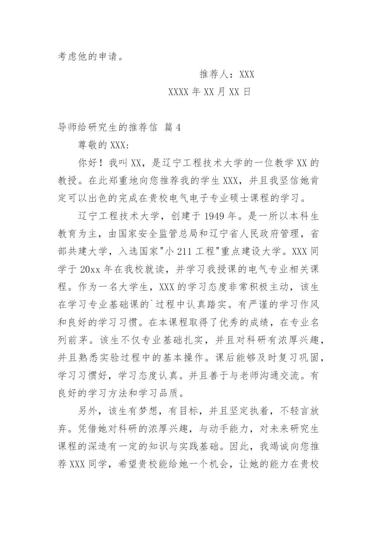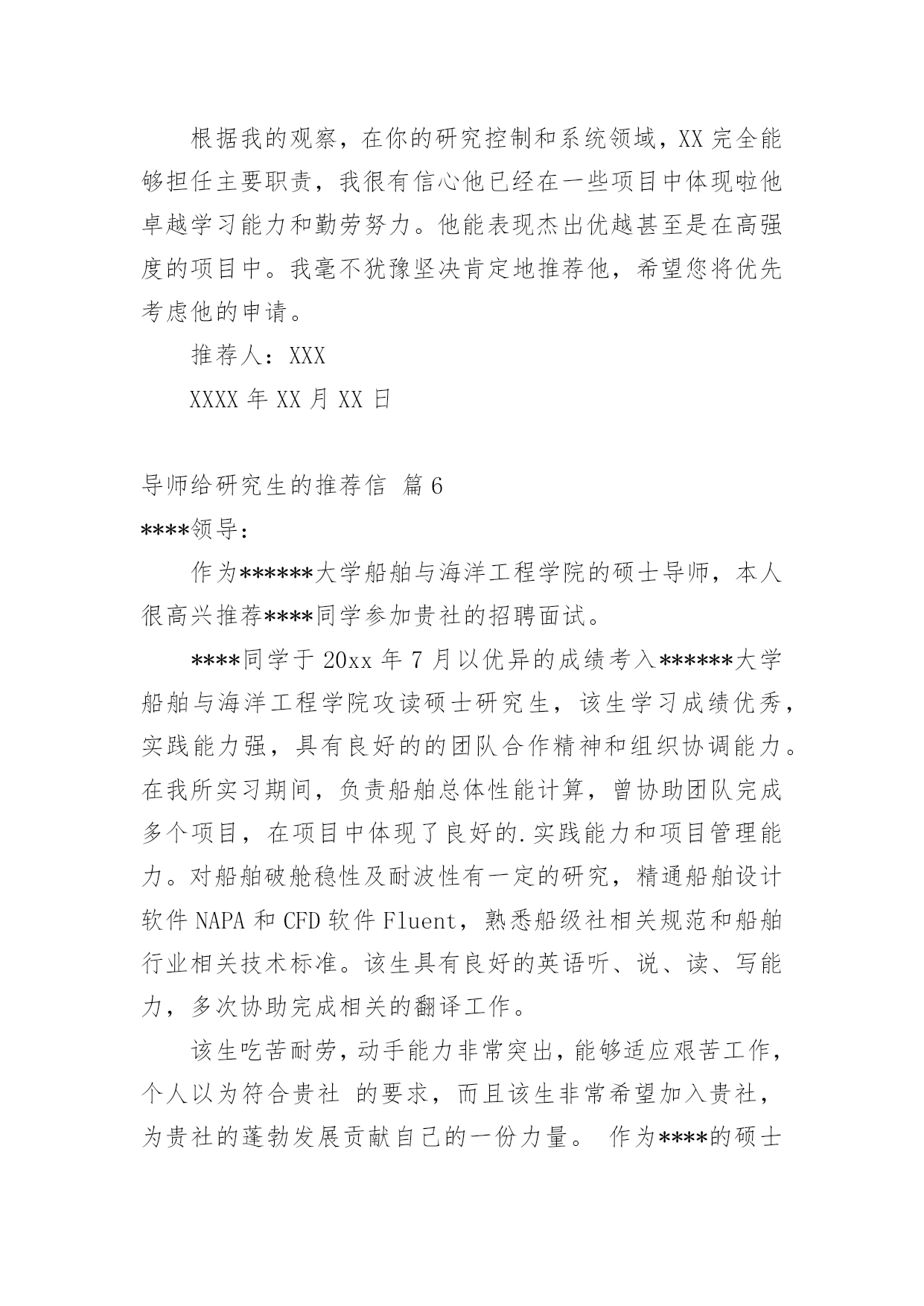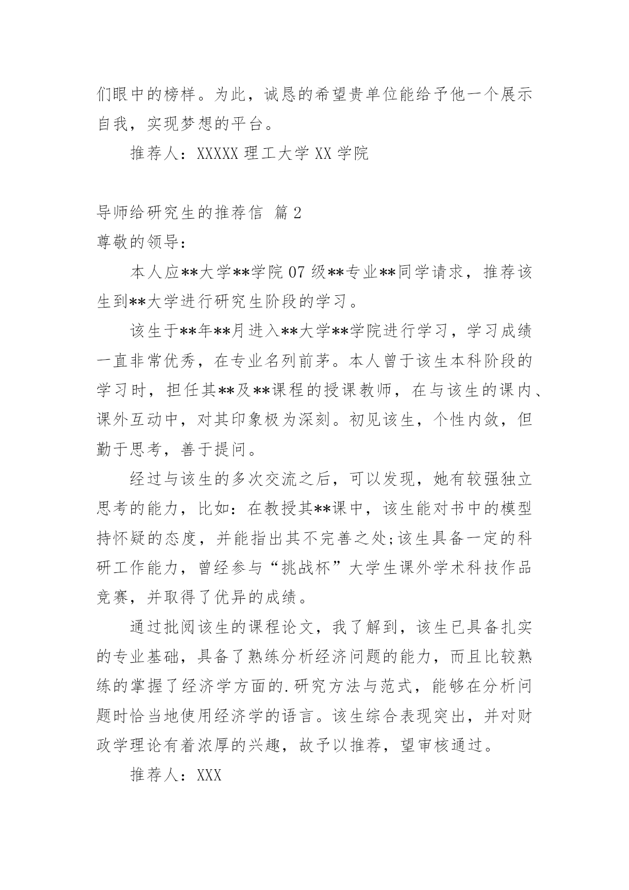 导师给研究生的推荐信导师给研究生的推荐信汇编七篇在日常生活和工作中,我们都跟推荐信有着直接或间接的联系,推荐信有时甚至起到决定性的作用。写起推荐信来就毫无头绪?下面是小编精心整理的导师给研究生的推荐信7篇,欢迎大家分享。导师给研究生的推荐信篇1尊敬的贵单位领导:你好!兹有我院农业机械化及其自动化专业的学生XXX去贵单位应聘,我是XXX的导师XXX,XXX是我最欣赏的学生之一。他学习成绩卓著,人文科学与自然科学同样精通。更为难的是,他不妄自尊大、自以为是,依旧刻苦对待每一项学习任务,力争成为整个团队中的`最佳。体现了他对学习负责的态度。中国有句俗话:“梅花香自苦寒开”,经过他持之以恒的付出,他的语言表达能力、活动的组织能力、与人的沟通能力、独立研究能力都非常突出,连续三年获得优秀奖学金,优秀学生干部,并于20xx年8月,获得了山东省机电大赛省级一等奖。XXX不仅是我的学生,也是我的朋友,因为她的个性与理想深深地吸引力我。他总是无私的为团队奉献自己的聪明才智,主动为大家服务,任劳任怨,不计个人得失,成为我们眼中的榜样。为此,诚恳的希望贵单位能给予他一个展示自我,实现梦想的平台。推荐人:XXXXX理工大学XX学院导师给研究生的推荐信篇2尊敬的领导:本人应**大学**学院07级**专业**同学请求,推荐该生到**大学进行研究生阶段的学习。该生于**年**月进入**大学**学院进行学习,学习成绩一直非常优秀,在专业名列前茅。本人曾于该生本科阶段的学习时,担任其**及**课程的授课教师,在与该生的课内、课外互动中,对其印象极为深刻。初见该生,个性内敛,但勤于思考,善于提问。经过与该生的多次交流之后,可以发现,她有较强独立思考的能力,比如:在教授其**课中,该生能对书中的模型持怀疑的态度,并能指出其不完善之处;该生具备一定的科研工作能力,曾经参与“挑战杯”大学生课外学术科技作品竞赛,并取得了优异的成绩。通过批阅该生的课程论文,我了解到,该生已具备扎实的专业基础,具备了熟练分析经济问题的能力,而且比较熟练的掌握了经济学方面的.研究方法与范式,能够在分析问题时恰当地使用经济学的语言。该生综合表现突出,并对财政学理论有着浓厚的兴趣,故予以推荐,望审核通过。推荐人:XXXXXXX年XX月XX日导师给研究生的推荐信篇3尊敬的领导:作为XX的导师,我很荣幸推荐他申请参加您的研究生项目。XX曾经参加过我的XX项目以及在他高年级期间的XX理论。之前,他获得过XX分和排位在名列前茅X之内。之后,在仅针对研究生开放的课题中,他是参与的仅有三位本科学生之一。在指导他的`期间,我了解到他是一个好学和勤奋的人,他总是积极钻研我的演讲并学习掌握知识。其实有某些任务对一般的学生是有难度的,可他总能出色地解决了他们,这些正是缘于他逻辑和分析思维能力以及对理论的清晰构想。在最后的项目中,他也打动了我。在解决开发项目中自由易变的优选问题,他深思熟虑并且熟练地完成了它,所以项目能够运转良好,甚至是发生一些特殊情况,但是它仍就能够很好的运转和阅读。因此我给了他比其他许多研究生更好的成绩。另外,在中高年级他参与了控制和系统的路线项目群且总是得到的好成绩。根据我的观察,在你的研究控制和系统领域,XX完全能够担任主要职责,我很有信心他已经在一些项目中体现了他卓越学习能力和勤劳努力。他能表现杰出优越甚至是在高强度的项目中。我毫不犹豫坚决肯定地推荐他,希望您将优先考虑他的申请。推荐人:XXXXXXX年XX月XX日导师给研究生的推荐信篇4尊敬的XXX:你好!我叫XX,是辽宁工程技术大学的一位教学XX的教授。在此郑重地向您推荐我的学生XXX,并且我坚信她肯定可以出色的完成在贵校电气电子专业硕士课程的学习。辽宁工程技术大学,创建于1949年。是一所以本科生教育为主,由国家安全监管总局和辽宁省人民政府管理,省部共建大学,入选国家"小211工程"重点建设大学。XXX同学于20xx年在我校就读,并学习我授课的电气专业相关课程。作为一名大学生,XXX的学习态度非常积极主动,该生在学习专业基础课的`过程中认真踏实。有严谨的学习作风和良好的学习习惯。在本课程取得了优秀的成绩,在专业名列前茅。该生不仅专业基础扎实,并且对科研有浓厚兴趣,并且熟悉实验过程中的基本操作。课后能够及时复习巩固,学习习惯好,学习态度认真。并且善于与老师沟通交流。有良好的学习方法和学习品质。另外,该生有梦想,有目标,并且坚定执着,不轻言放弃。凭借她对科研的浓厚兴趣,与动手能力,对未来研究生课程的深造有一定的知识与实践基础。因此,我竭诚向您推荐XXX同学,希望贵校能给她一个机会,让她的能力在贵校宽广的舞台中得到绽放,并且为科研,为人类的进步做出贡献。XXX同学符合贵校的选拔条件,故特此推荐,望审核通过。如需要了解XXX同学的更多的情况