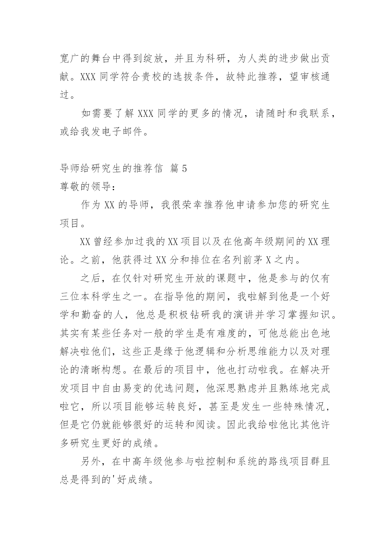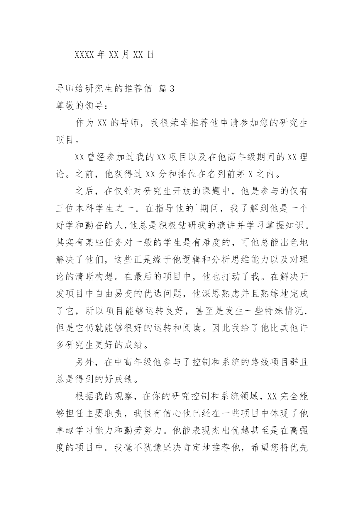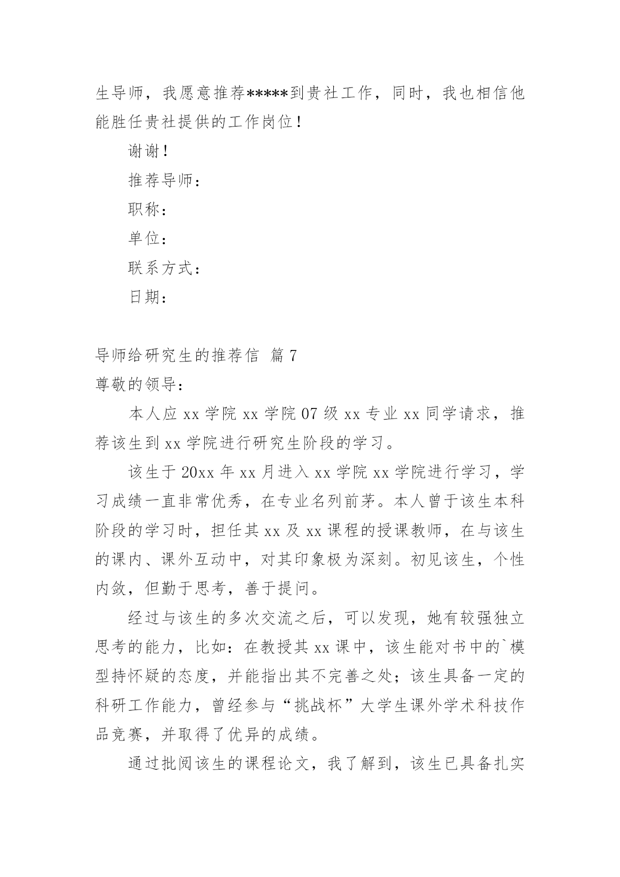 导师给研究生的推荐信导师给研究生的推荐信汇编七篇在日常生活和工作中,我们都跟推荐信有着直接或间接的联系,推荐信有时甚至起到决定性的作用。写起推荐信来就毫无头绪?下面是小编精心整理的导师给研究生的推荐信7篇,欢迎大家分享。导师给研究生的推荐信篇1尊敬的贵单位领导:你好!兹有我院农业机械化及其自动化专业的学生XXX去贵单位应聘,我是XXX的导师XXX,XXX是我最欣赏的学生之一。他学习成绩卓著,人文科学与自然科学同样精通。更为难的是,他不妄自尊大、自以为是,依旧刻苦对待每一项学习任务,力争成为整个团队中的`最佳。体现了他对学习负责的态度。中国有句俗话:“梅花香自苦寒开”,经过他持之以恒的付出,他的语言表达能力、活动的组织能力、与人的沟通能力、独立研究能力都非常突出,连续三年获得优秀奖学金,优秀学生干部,并于20xx年8月,获得了山东省机电大赛省级一等奖。XXX不仅是我的学生,也是我的朋友,因为她的个性与理想深深地吸引力我。他总是无私的为团队奉献自己的聪明才智,主动为大家服务,任劳任怨,不计个人得失,成为我们眼中的榜样。为此,诚恳的希望贵单位能给予他一个展示自我,实现梦想的平台。推荐人:XXXXX理工大学XX学院导师给研究生的推荐信篇2尊敬的领导:本人应**大学**学院07级**专业**同学请求,推荐该生到**大学进行研究生阶段的学习。该生于**年**月进入**大学**学院进行学习,学习成绩一直非常优秀,在专业名列前茅。本人曾于该生本科阶段的学习时,担任其**及**课程的授课教师,在与该生的课内、课外互动中,对其印象极为深刻。初见该生,个性内敛,但勤于思考,善于提问。经过与该生的多次交流之后,可以发现,她有较强独立思考的能力,比如:在教授其**课中,该生能对书中的模型持怀疑的态度,并能指出其不完善之处;该生具备一定的科研工作能力,曾经参与“挑战杯”大学生课外学术科技作品竞赛,并取得了优异的成绩。通过批阅该生的课程论文,我了解到,该生已具备扎实的专业基础,具备了熟练分析经济问题的能力,而且比较熟练的掌握了经济学方面的.研究方法与范式,能够在分析问题时恰当地使用经济学的语言。该生综合表现突出,并对财政学理论有着浓厚的兴趣,故予以推荐,望审核通过。推荐人:XXXXXXX年XX月XX日导师给研究生的推荐信篇3尊敬的领导:作为XX的导师,我很荣幸推荐他申请参加您的研究生项目。XX曾经参加过我的XX项目以及在他高年级期间的XX理论。之前,他获得过XX分和排位在名列前茅X之内。之后,在仅针对研究生开放的课题中,他是参与的仅有三位本科学生之一。在指导他的`期间,我了解到他是一个好学和勤奋的人,他总是积极钻研我的演讲并学习掌握知识。其实有某些任务对一般的学生是有难度的,可他总能出色地解决了他们,这些正是缘于他逻辑和分析思维能力以及对理论的清晰构想。在最后的项目中,他也打动了我。在解决开发项目中自由易变的优选问题,他深思熟虑并且熟练地完成了它,所以项目能够运转良好,甚至是发生一些特殊情况,但是它仍就能够很好的运转和阅读。因此我给了他比其他许多研究生更好的成绩。另外,在中高年级他参与了控制和系统的路线项目群且总是得到的好成绩。根据我的观察,在你的研究控制和系统领域,XX完全能够担任主要职责,我很有信心他已经在一些项目中体现了他卓越学习能力和勤劳努力。他能表现杰出优越甚至是在高强度的项目中。我毫不犹豫坚决肯定地推荐他,希望您将优先考虑他的申请。推荐人:XXXXXXX年XX月XX日导师给研究生的推荐信篇4尊敬的XXX:你好!我叫XX,是辽宁工程技术大学的一位教学XX的教授。在此郑重地向您推荐我的学生XXX,并且我坚信她肯定可以出色的完成在贵校电气电子专业硕士课程的学习。辽宁工程技术大学,创建于1949年。是一所以本科生教育为主,由国家安全监管总局和辽宁省人民政府管理,省部共建大学,入选国家"小211工程"重点建设大学。XXX同学于20xx年在我校就读,并学习我授课的电气专业相关课程。作为一名大学生,XXX的学习态度非常积极主动,该生在学习专业基础课的`过程中认真踏实。有严谨的学习作风和良好的学习习惯。在本课程取得了优秀的成绩,在专业名列前茅。该生不仅专业基础扎实,并且对科研有浓厚兴趣,并且熟悉实验过程中的基本操作。课后能够及时复习巩固,学习习惯好,学习态度认真。并且善于与老师沟通交流。有良好的学习方法和学习品质。另外,该生有梦想,有目标,并且坚定执着,不轻言放弃。凭借她对科研的浓厚兴趣,与动手能力,对未来研究生课程的深造有一定的知识与实践基础。因此,我竭诚向您推荐XXX同学,希望贵校能给她一个机会,让她的能力在贵校宽广的舞台中得到绽放,并且为科研,为人类的进步做出贡献。XXX同学符合贵校的选拔条件,故特此推荐,望审核通过。如需要了解XXX同学的更多的情况