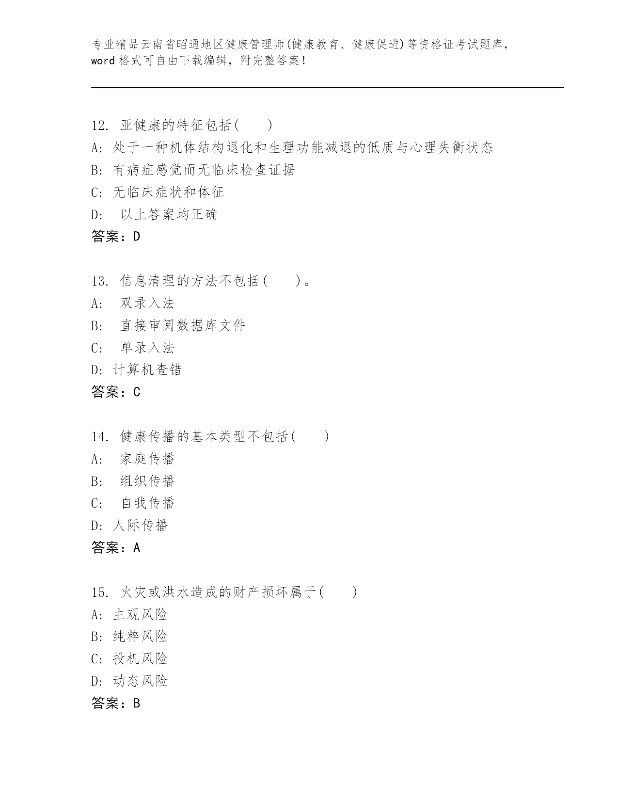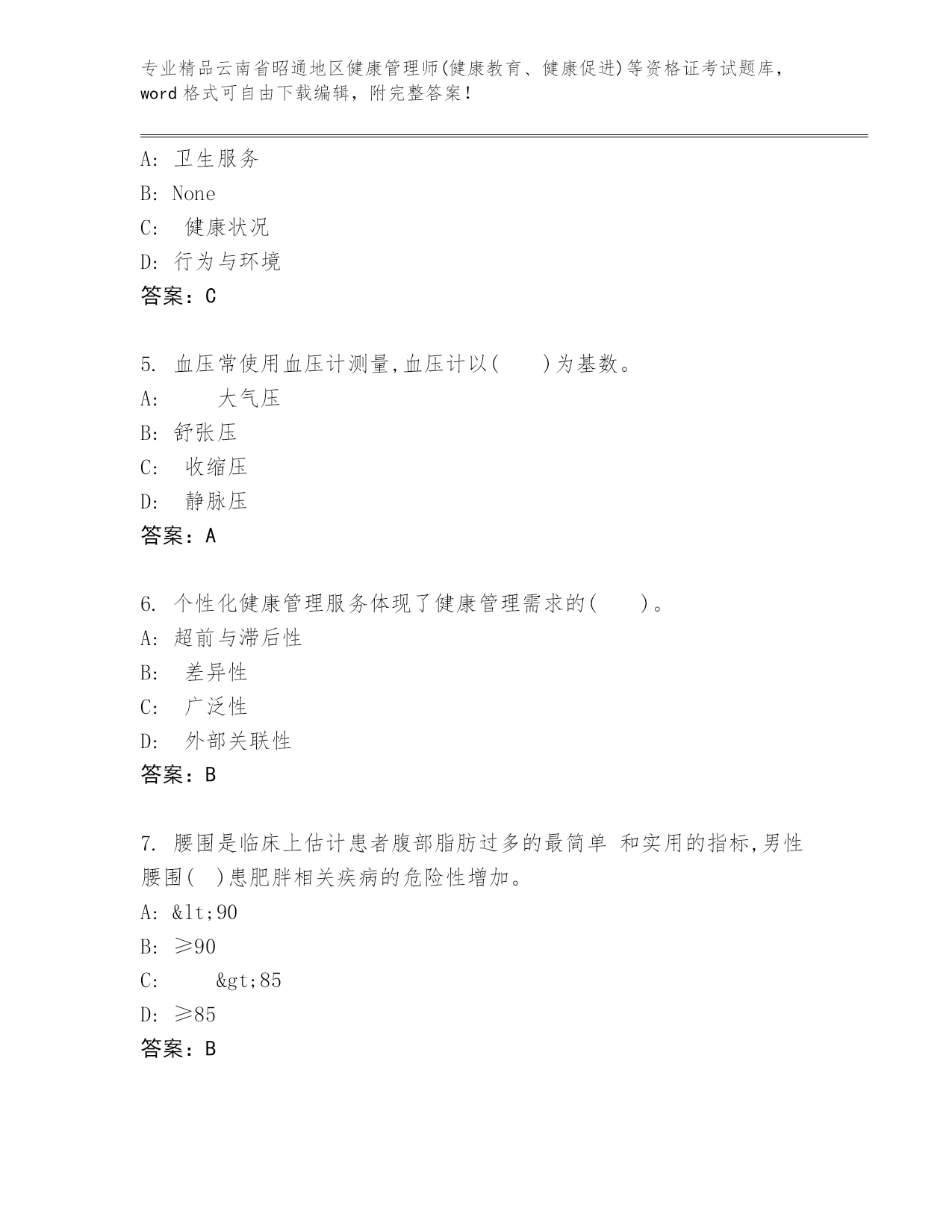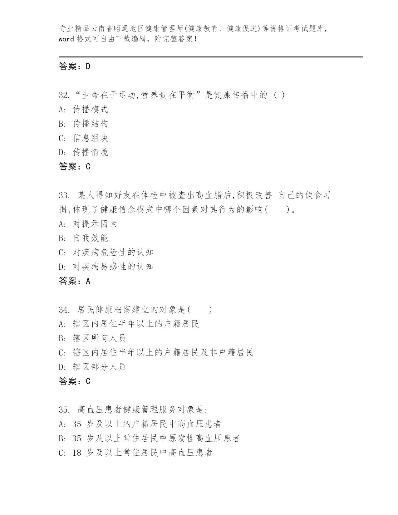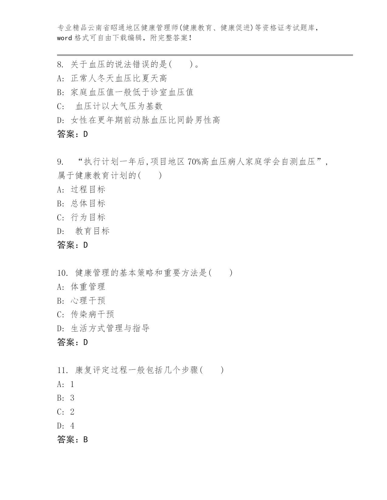 最新云南省昭通地区健康管理师(健康教育、健康促进)等资格证考试内部题库带下载答案