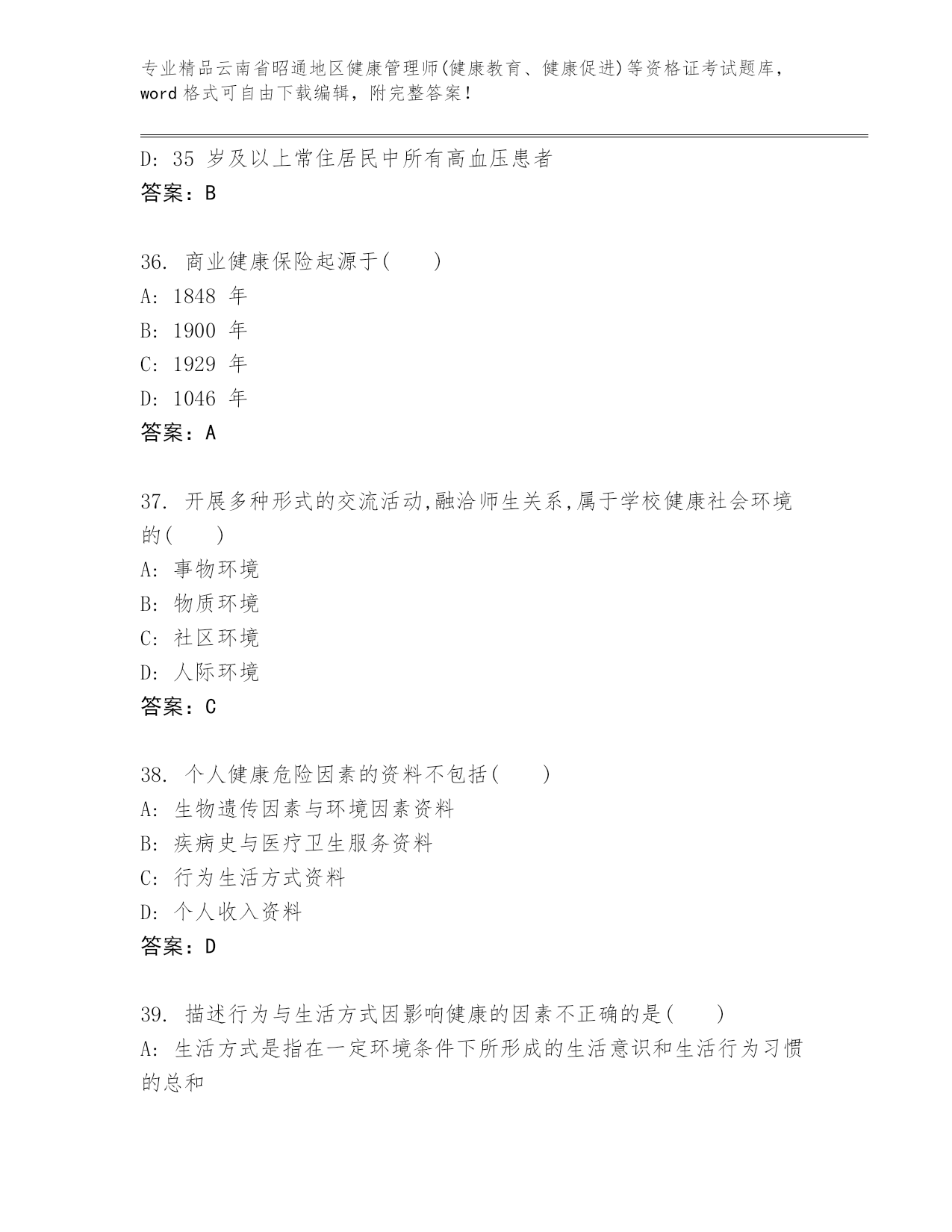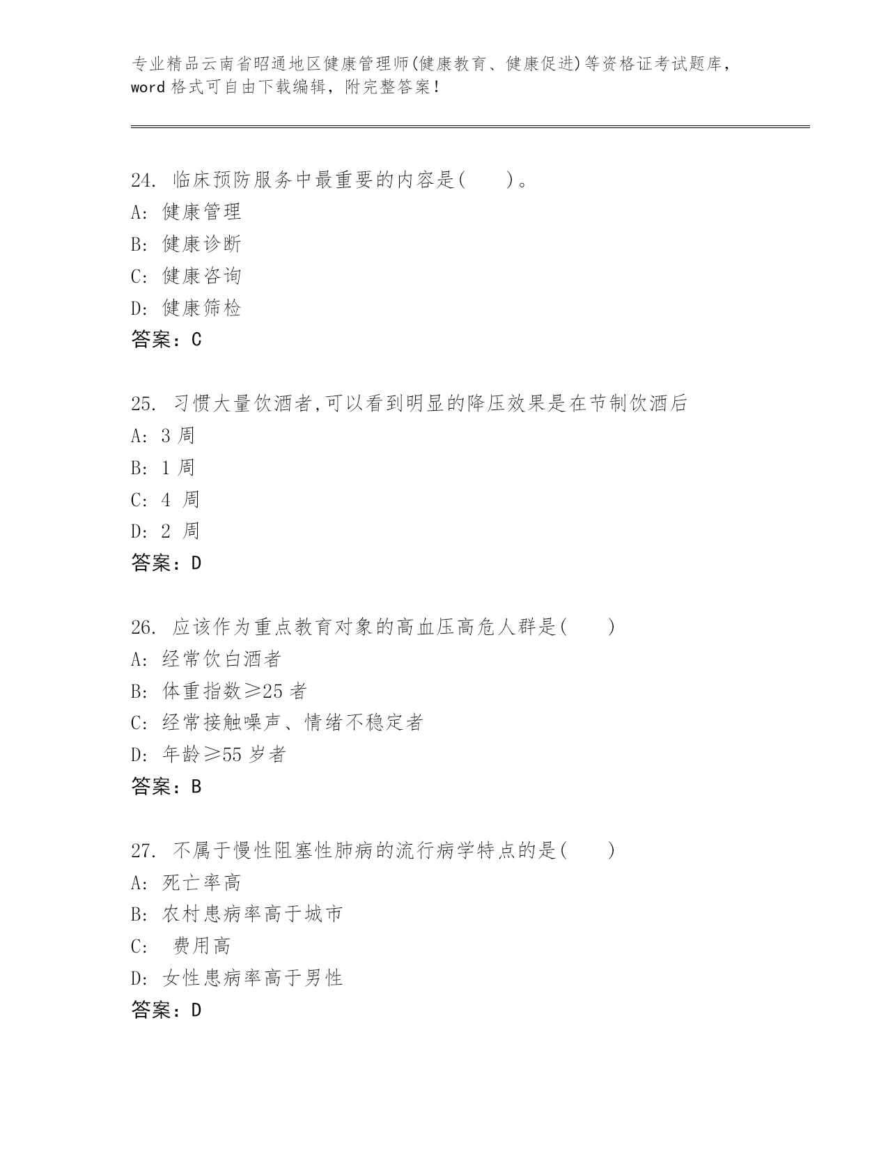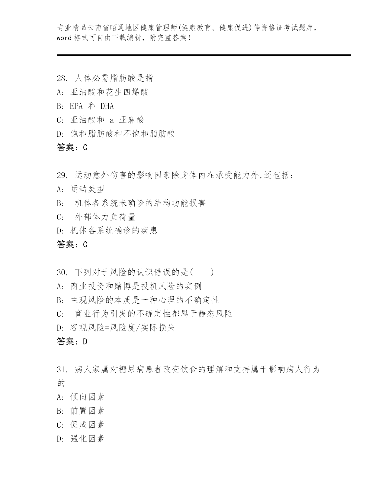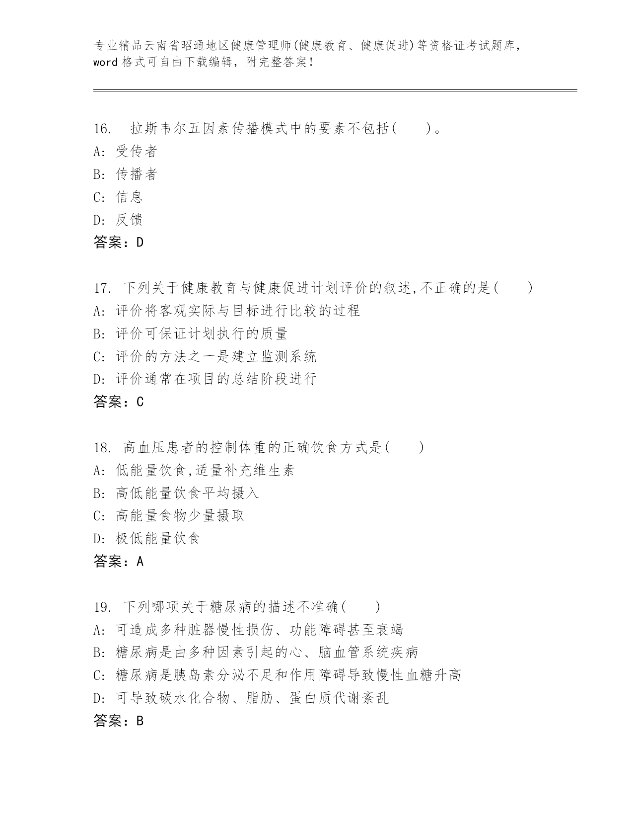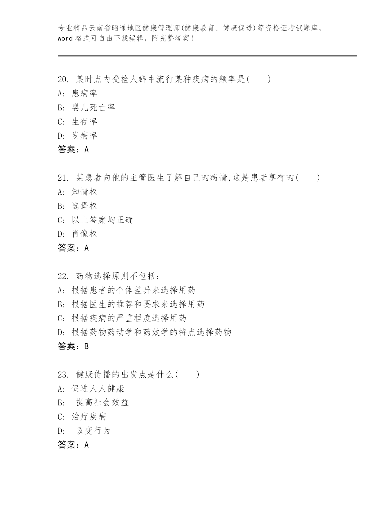 最新云南省昭通地区健康管理师(健康教育、健康促进)等资格证考试内部题库带下载答案