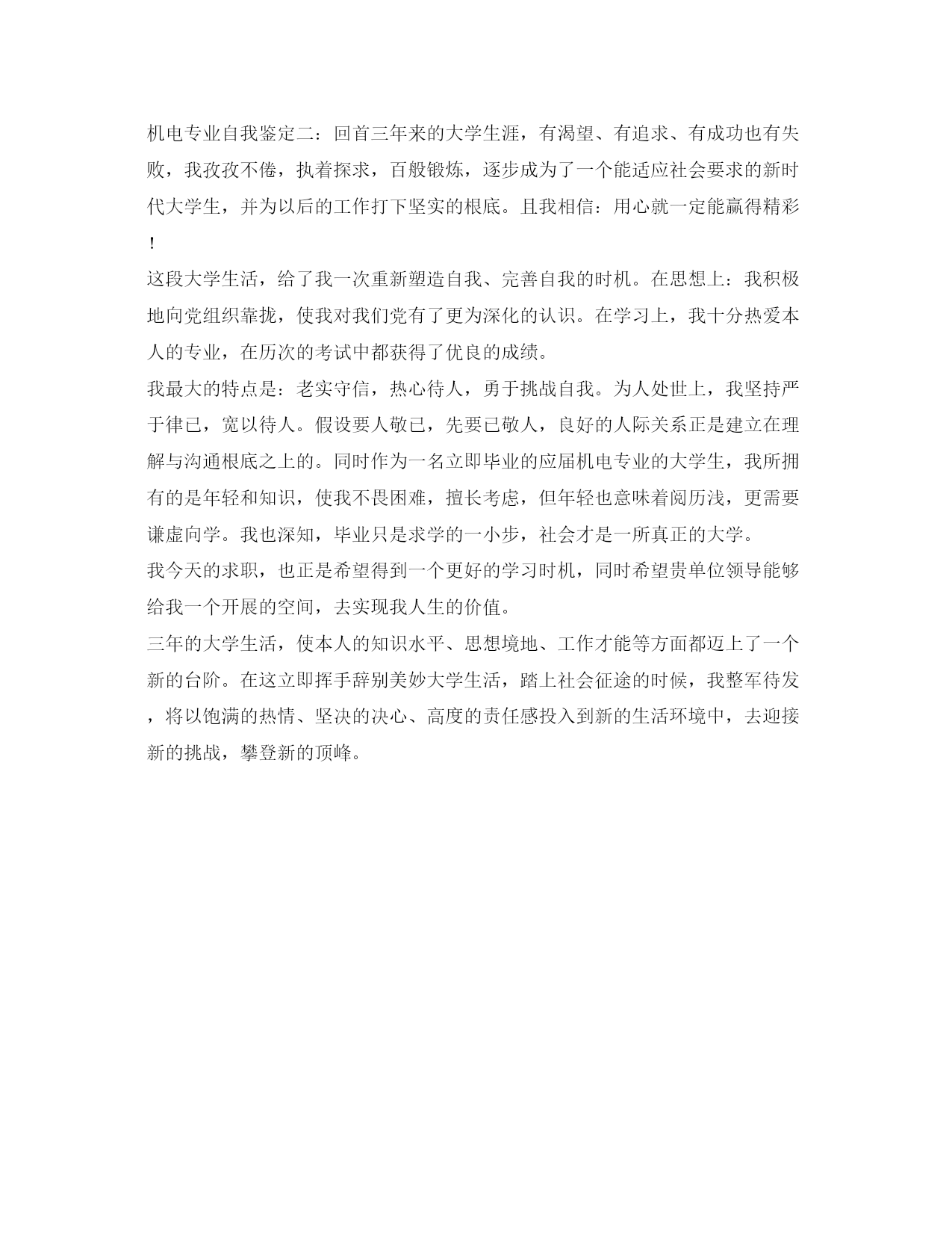 机电专业自我鉴定参考「优秀篇」机电专业自我鉴定一:光阴似箭,大学三年的美丽光阴已近完毕;也是我人生的一大转机点。我以优良的成绩考入XX生物机电职业技术学院。三年的校园生活,使我本身的综合素养、修养、为人处事才能以及交际才能等都有了质的飞跃;让我明白得了除学习以外的个人处事才能的重要性和交际才能的必要性。大学生活与社会生活是互相映射,因此大学阶段的个人综合素养与才能的培养、提高;才是我们作为当代大学生的主题。除此之外,课余时间我经常利用网络带来的便利,关注最新科学技术动态;尤其是有关本专业的知识。使本人不断紧跟世界最新开展潮流和时代的步伐。因此我学习纯熟掌握Windows、Office等软件的操作和安装系统,熟悉网页设计;不断以“一专多能,全面开展”来严格要求本人,勤奋拼搏、刻苦好学。踏实并系统地学习所开的课程知识,并获得了优良成绩。在校期间,我谦虚求学、刻苦认真、吃苦耐劳,工作兢兢业业,及时总结;注重理论联络实际,培养本人的自学才能以及分析、处理征询题的才能。在丰富多彩的大学生活中,为了扩大知识面和培养本人的业余爱好;积极参加校内外的实践活动,注重团队合作精神;作为系学生会干部的我,有较强的组织、宣传、治理和应变才能;有高度的责任心和良好的人际关系。在出色地完成上级交予的任务外,还在校内组织和开展一些有意义的活动,能有力地组织同学及调动同学们的积极性;从中也锻炼和提高了本人的组织和领导才能。表现出较强的与人亲切合作的才能和良好的环境适应才能;同时深受同学们和老师以及领导的认可。在日常生活中以积极的态度和与同学们的相处极为融洽,遭到同学们的欢迎;同时本身的交际才能随之加强,作为一名有志青年,我坚决拥护中国党的领导;坚持四项根本原则。认真学习马列主义、毛泽东思想、邓小平理论和全面贯彻“三个代表”的重要思想,同时已向党组织靠拢。总之,三年的大学生涯是我人生路上的一小段,同时通过系统化、理论化的学习;学到了特别多的知识,更重要的是如何以较快速度掌握一种新事物的才能,思想成熟了特别多,性格更坚强了。如今我有决心接受任何新的挑战和考验。机电专业自我鉴定二:回首三年来的大学生涯,有渴望、有追求、有成功也有失败,我孜孜不倦,执着探求,百般锻炼,逐步成为了一个能适应社会要求的新时代大学生,并为以后的工作打下坚实的根底。且我相信:用心就一定能赢得精彩!这段大学生活,给了我一次重新塑造自我、完善自我的时机。在思想上:我积极地向党组织靠拢,使我对我们党有了更为深化的认识。在学习上,我十分热爱本人的专业,在历次的考试中都获得了优良的成绩。我最大的特点是:老实守信,热心待人,勇于挑战自我。为人处世上,我坚持严于律已,宽以待人。假设要人敬已,先要已敬人,良好的人际关系正是建立在理解与沟通根底之上的。同时作为一名立即毕业的应届机电专业的大学生,我所拥有的是年轻和知识,使我不畏困难,擅长考虑,但年轻也意味着阅历浅,更需要谦虚向学。我也深知,毕业只是求学的一小步,社会才是一所真正的大学。我今天的求职,也正是希望得到一个更好的学习时机,同时希望贵单位领导能够给我一个开展的空间,去实现我人生的价值。三年的大学生活,使本人的知识水平、思想境地、工作才能等方面都迈上了一个新的台阶。在这立即挥手辞别美妙大学生活,踏上社会征途的时候,我整军待发,将以饱满的热情、坚决的决心、高度的责任感投入到新的生活环境中,去迎接新的挑战,攀登新的顶峰。