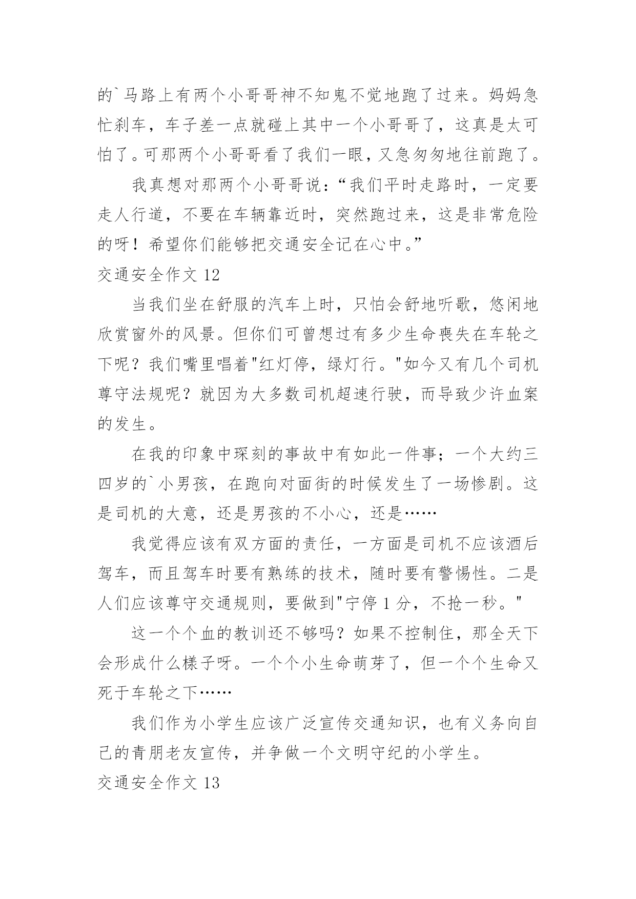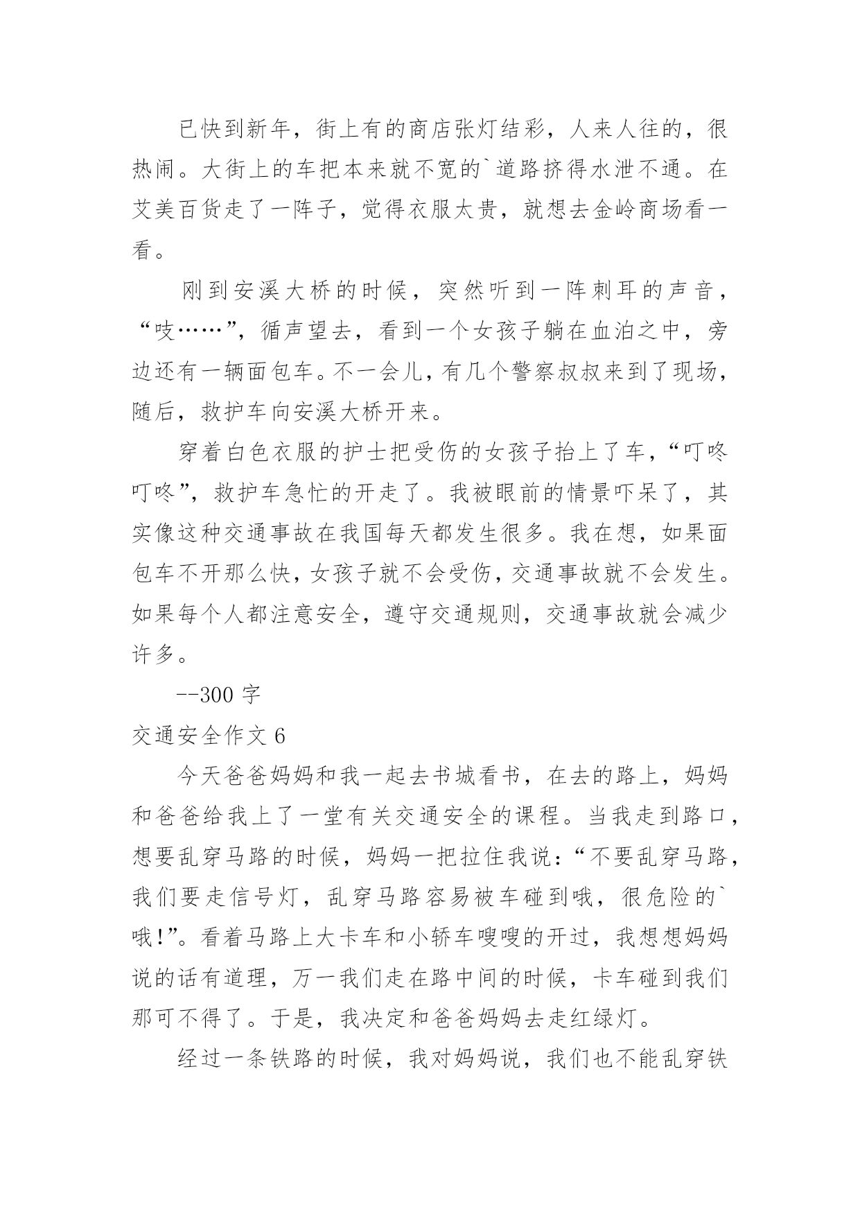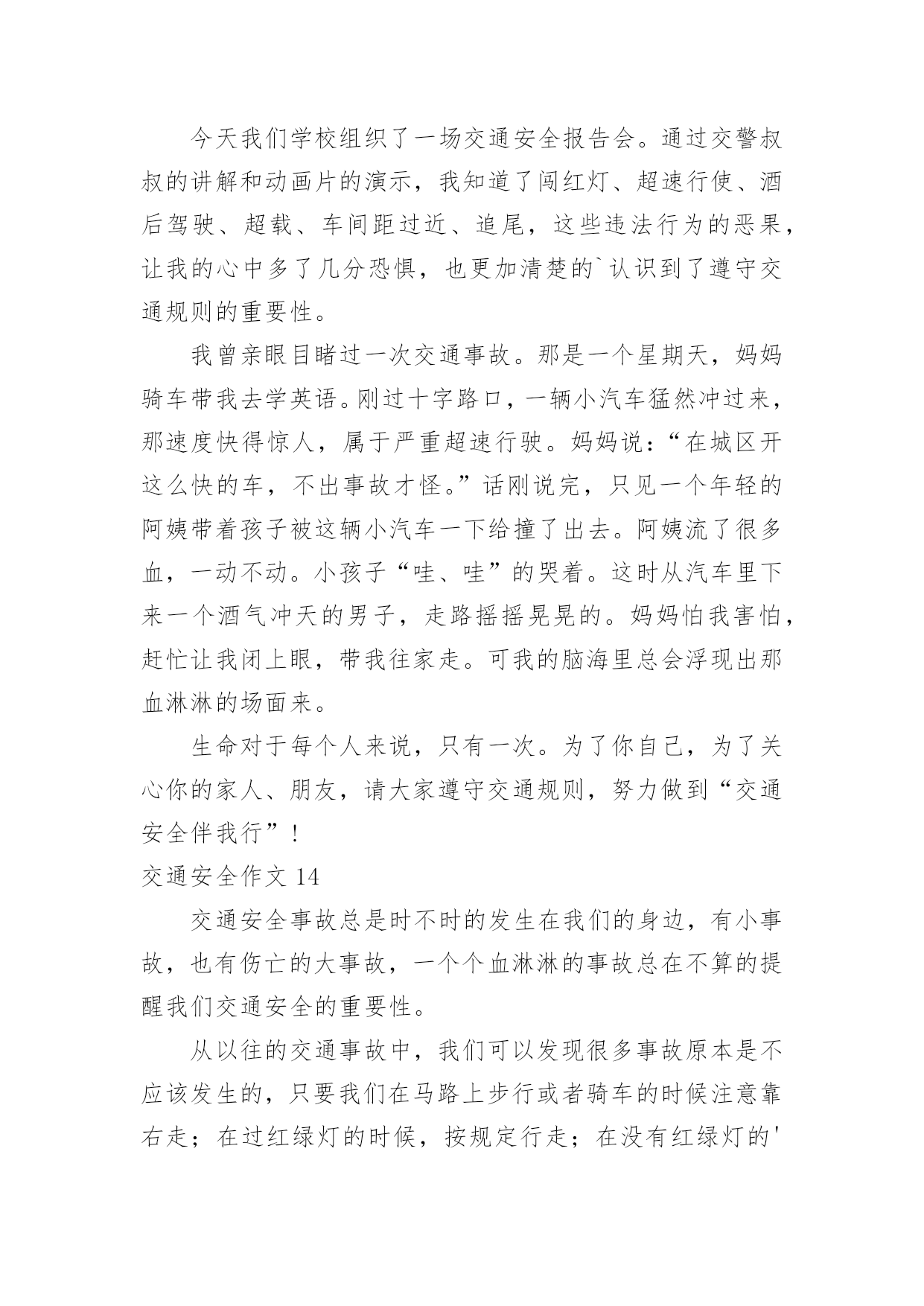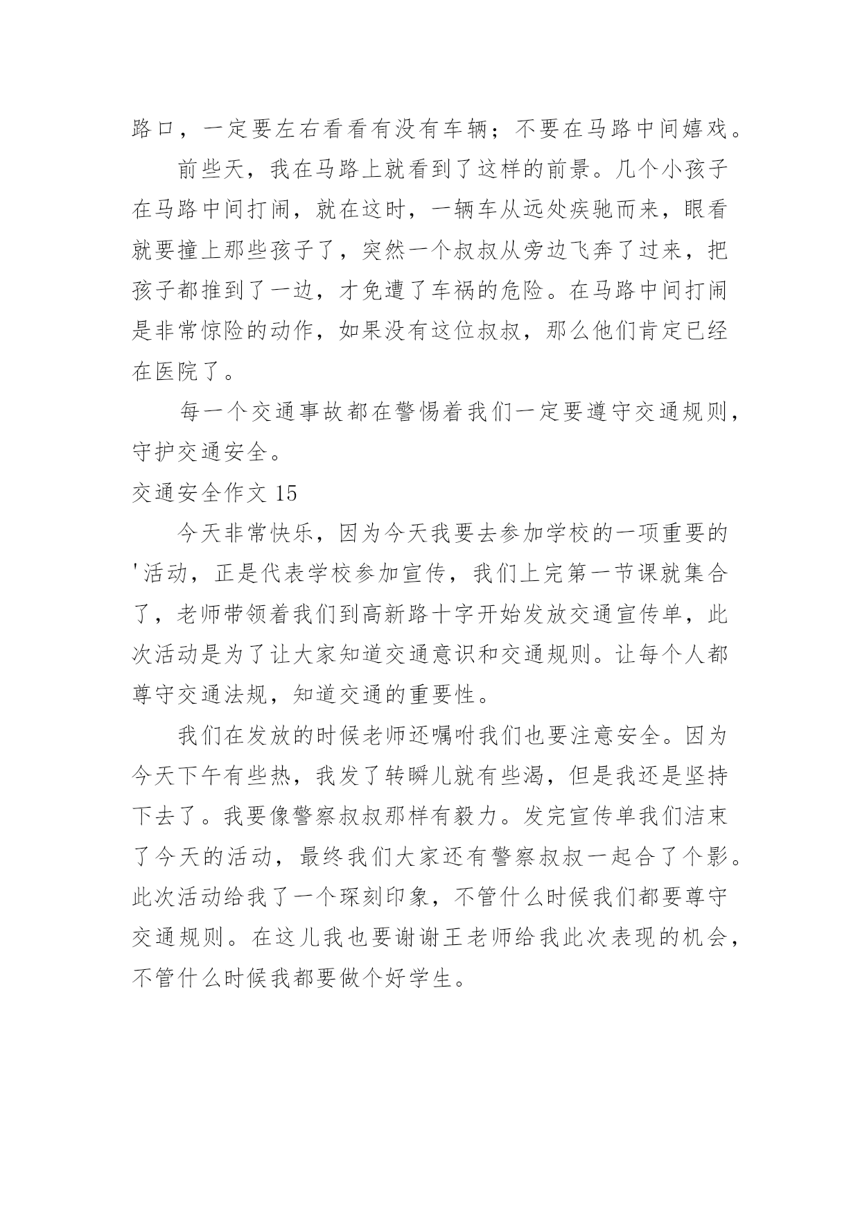 交通安全作文交通安全作文常用15篇在日复一日的学习、工作或生活中,大家都经常接触到作文吧,根据写作命题的特点,作文可以分为命题作文和非命题作文。你知道作文怎样才能写的好吗?下面是小编收集整理的交通安全作文,供大家参考借鉴,希望可以帮助到有需要的朋友。交通安全作文1“交通安全记心中!”前几天我就看了新闻,上面说某某某被车撞死。我就想有多少人记住了这句话呢?交通事故如一颗定时炸弹,要爆炸时,你得躲开,如果不躲开,等待的只有死亡!就在去年,我们班的刘昊昕就出了一起交通事故,爷爷带着我去学校的.时候。就看见了一辆救护车停在路旁,我们走近一看,一辆摩托车倒在地上,救护车里躺的正是刘昊昕和她妈妈,他在那里哭着喊:“妈妈!妈妈!”还有一次,新闻报道说一个小女孩因为他的球弹到了马路边,他不懂交通规则,所以就跑过去捡,不料被一辆货车给撞到,脆弱的生命就这样被剥夺去了。不能再这样下去了!难道我们要等到死神降临才如梦初醒吗?生命是非常脆弱的,我们得学会怎样去保护它。不要再让这些无辜的灵魂死去,不要再把那些注意安全的话当成耳边风。应该把这些话铭记在心。同学们,生命只有一次。交通安全牢记心中,不要让爸爸妈妈担心。交通安全作文2我是一名三年级的小学生,每天上放学,都是奶奶接送,一路上拉着我的手,还很不放心的在我耳边“唠叨”:’车,注意车……”我心里想,如果交通能更安全些,让奶奶放心些,那该多幸福啊!我心里特想“献计献策”,看看我的.金点子吧!金点子之一:把人行横道变得更醒目。除了斑马线,可以在路的两边画上颜色鲜艳的卡通图案,孩子们离很远都能看到,而且看起来亲切,就会更自觉的遵守交通规则,司机叔叔,也会因为图案,更加有童心,也不会钻空子闯红灯了。交通安全作文3在我们身边,常常会发生一些交通事故。在这些事故中,小到跌倒、大到身立,这些都是在提醒我们没一个人:必须时时刻刻注意交通安全!其实交通事故很多都是可以避免的。我们走路、骑车都要靠右边行走,我们过马路的时候左右看看,如果是十字路口要看“红绿灯”、如果没有“红绿灯”我们要看前后左右,不闯红灯,不要在马路上反架。记得有一次,有几个小孩子在马路边反架。说时迟说是快、突然远处有一台大货车飞快的向他们还过来,只有那么100米的`距离。路旁的人都吓呆了,有些胆小的还捂住了眼睛……就在这时一位叔叔从对面的便利店迅速地冲过来。一下子把他们几个小孩子推到路旁,他们的救了,真的好险啊……如果今天不是那位好心人的救助,后果会怎样呢?所以为了自身的安全,请大家一定要遵守交通规则。就像绿色环保小卫士一样、人人都有责哦!交通安全作文4在我们身边,常常会发生一些交通事故。在这些事故中,小到跌倒、大到身立,这些都是在提醒我们没一个人:必须时时刻刻注意交通安全!其实交通事故很多都是可以避免的。我们走路、骑车都要靠右边行走,我们过马路的时候左右看看,如果是十字路口要看红绿灯、如果没有红绿灯我们要看前后左右,不闯红灯,不要在马路上反架。记得有一次,有几个小朋友在马路边反架。说时迟说是快、突然远处有一台大货车飞快的向他们还过来,只有那么100米的距离。路旁的`人都吓呆了,有些胆小的还捂住了眼睛……就在这时一位叔叔从对面的便利店迅速地冲过来。一下子把他们几个小朋友推到路旁,他们的救了,真的好险啊……如果今天不是那位好心人的救助,后果会怎样呢?所以为了自身的安全,请大家一定要遵守交通规则。就像绿色环保小卫士一样、人人都有责哦!交通安全作文5腊月二十三日晚上,我和爸爸妈妈一起去艾美百货买衣服。已快到新年,街上有的商店张灯结彩,人来人往的,很热闹。大街上的车把本来就不宽的`道路挤得水泄不通。在艾美百货走了一阵子,觉得衣服太贵,就想去金岭商场看一看。刚到安溪大桥的时候,突然听到一阵刺耳的声音,“吱……”,循声望去,看到一个女孩子躺在血泊之中,旁边还有一辆面包车。不一会儿,有几个警察叔叔来到了现场,随后,救护车向安溪大桥开来。穿着白色衣服的护士把受伤的女孩子抬上了车,“叮咚叮咚”,救护车急忙的开走了。我被眼前的情景吓呆了,其实像这种交通事故在我国每天都发生很多。我在想,如果面包车不开那么快,女孩子就不会受伤,交通事故就不会发生。如果每个人都注意安全,遵守交通规则,交通事故就会减少许多。--300字交通安全作文6今天爸爸妈妈和我一起去书城看书,在去的路上,妈妈和爸爸给我上了一堂有关交通安全的课程。当我走到路口,想要乱穿马路的时候,妈妈一把拉住我说:“不要乱穿马路,我们要走信号灯,乱穿马路容易被车碰到哦,很危险的`哦!”。看着马路上大卡车和小轿车嗖嗖的开过,我想想妈妈说的话有道理,万一我们走在路中间的时候,卡车碰到我们那可不得了。于是,我决定和爸爸妈妈去走红绿灯。经过一条铁路的时候,我对妈妈说,我们也不能乱穿铁路,妈妈冲我点点头,夸奖我是一个遵守交通规则的