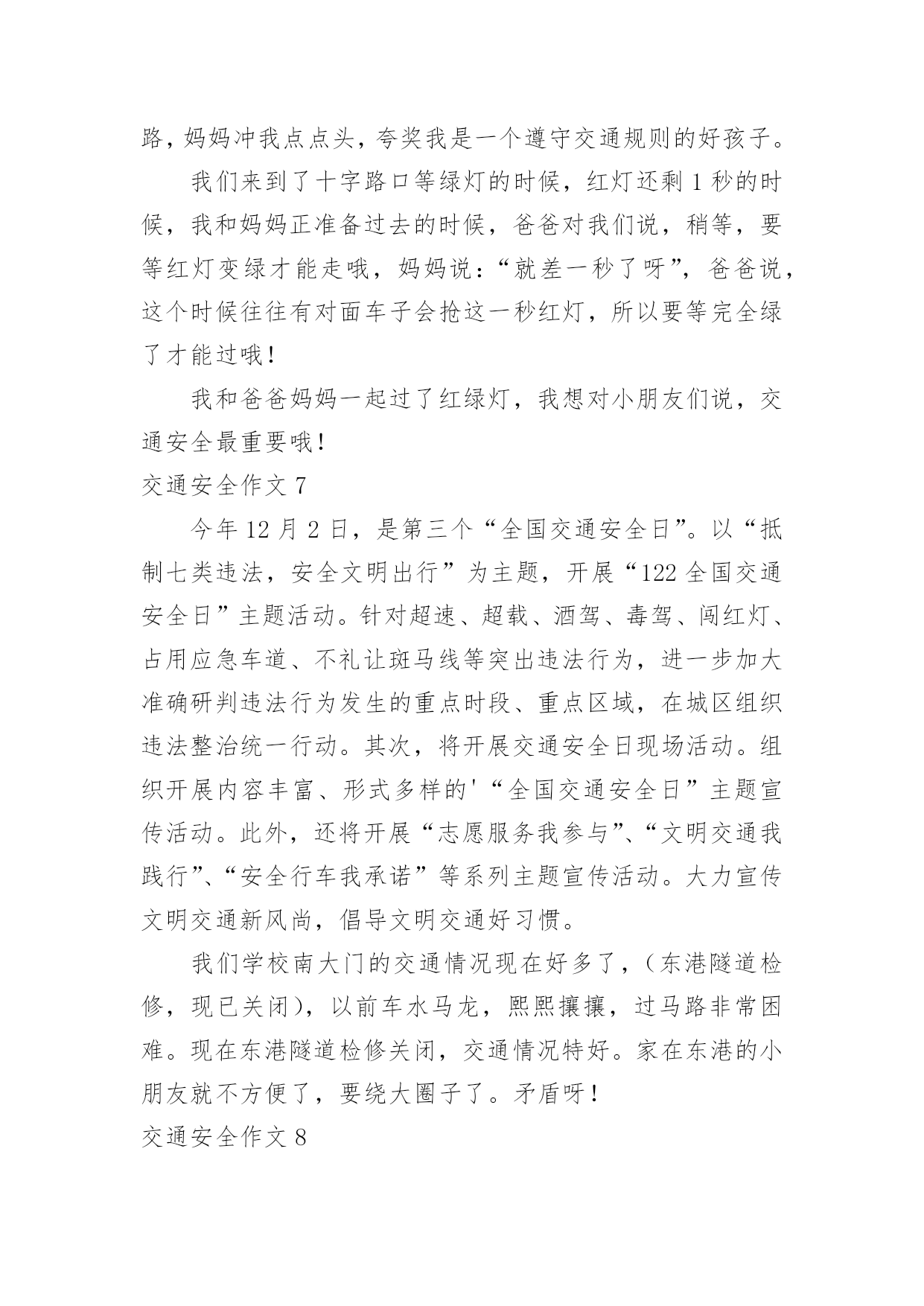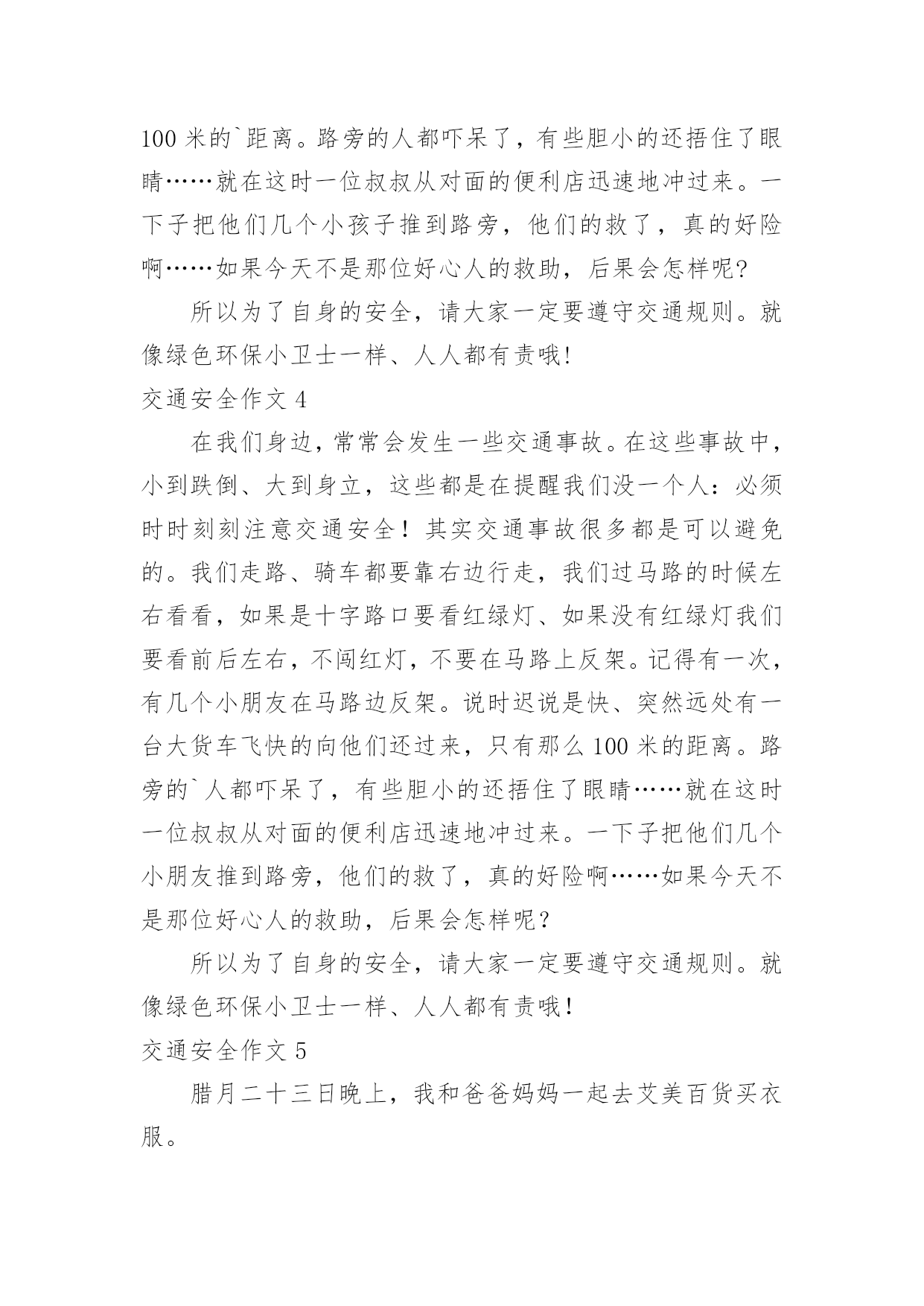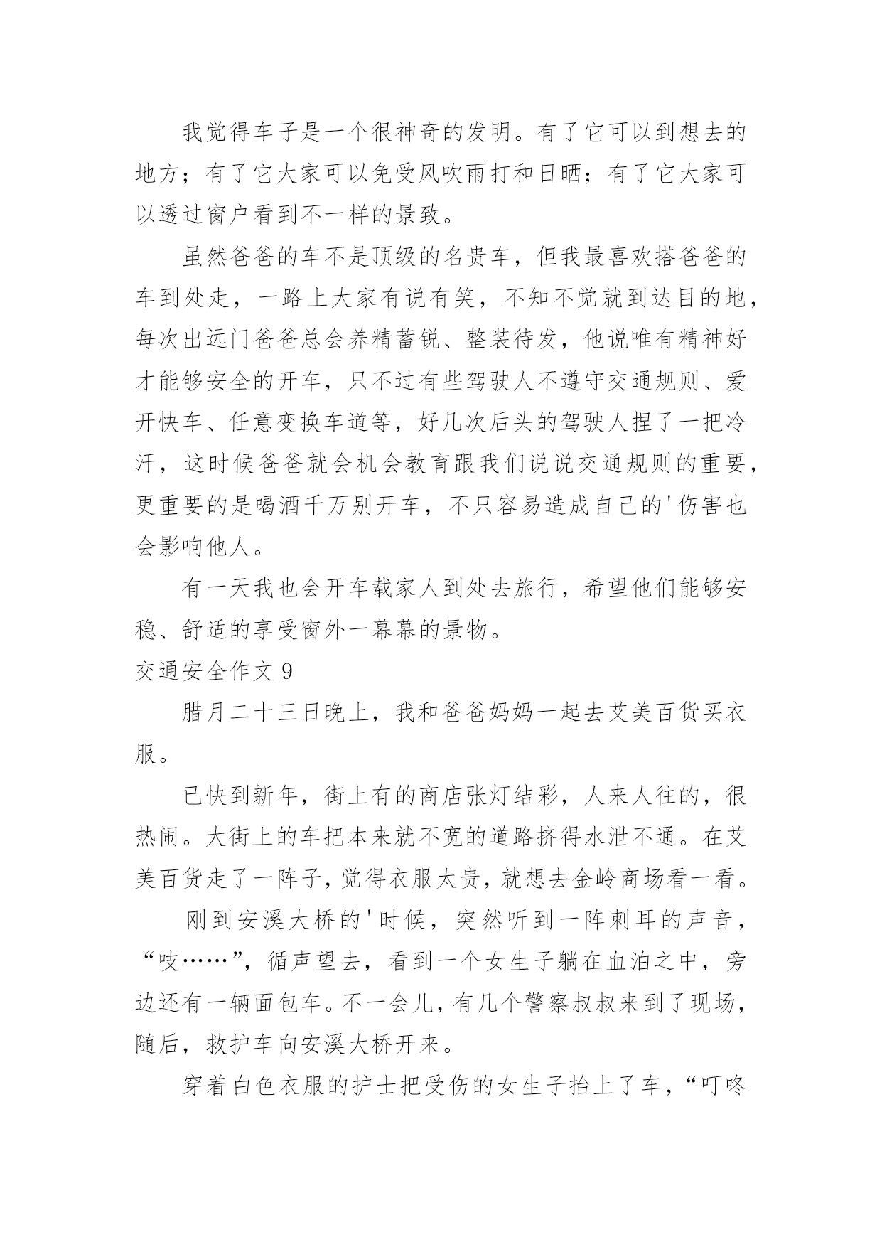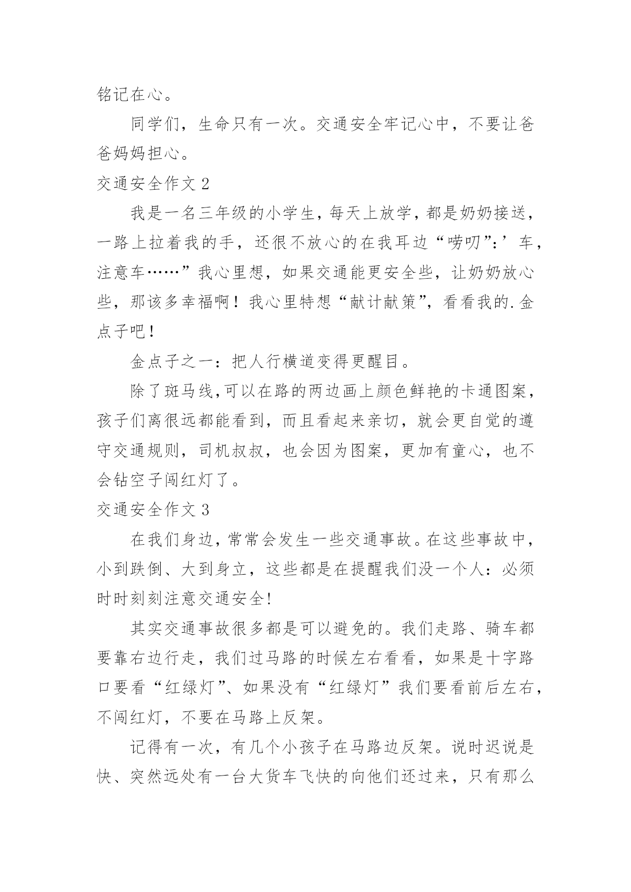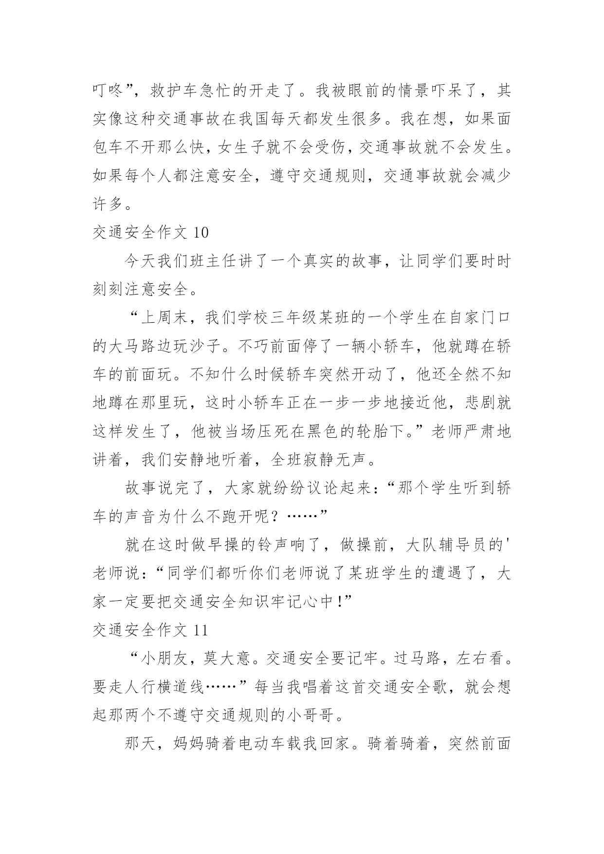 交通安全作文交通安全作文常用15篇在日复一日的学习、工作或生活中,大家都经常接触到作文吧,根据写作命题的特点,作文可以分为命题作文和非命题作文。你知道作文怎样才能写的好吗?下面是小编收集整理的交通安全作文,供大家参考借鉴,希望可以帮助到有需要的朋友。交通安全作文1“交通安全记心中!”前几天我就看了新闻,上面说某某某被车撞死。我就想有多少人记住了这句话呢?交通事故如一颗定时炸弹,要爆炸时,你得躲开,如果不躲开,等待的只有死亡!就在去年,我们班的刘昊昕就出了一起交通事故,爷爷带着我去学校的.时候。就看见了一辆救护车停在路旁,我们走近一看,一辆摩托车倒在地上,救护车里躺的正是刘昊昕和她妈妈,他在那里哭着喊:“妈妈!妈妈!”还有一次,新闻报道说一个小女孩因为他的球弹到了马路边,他不懂交通规则,所以就跑过去捡,不料被一辆货车给撞到,脆弱的生命就这样被剥夺去了。不能再这样下去了!难道我们要等到死神降临才如梦初醒吗?生命是非常脆弱的,我们得学会怎样去保护它。不要再让这些无辜的灵魂死去,不要再把那些注意安全的话当成耳边风。应该把这些话铭记在心。同学们,生命只有一次。交通安全牢记心中,不要让爸爸妈妈担心。交通安全作文2我是一名三年级的小学生,每天上放学,都是奶奶接送,一路上拉着我的手,还很不放心的在我耳边“唠叨”:’车,注意车……”我心里想,如果交通能更安全些,让奶奶放心些,那该多幸福啊!我心里特想“献计献策”,看看我的.金点子吧!金点子之一:把人行横道变得更醒目。除了斑马线,可以在路的两边画上颜色鲜艳的卡通图案,孩子们离很远都能看到,而且看起来亲切,就会更自觉的遵守交通规则,司机叔叔,也会因为图案,更加有童心,也不会钻空子闯红灯了。交通安全作文3在我们身边,常常会发生一些交通事故。在这些事故中,小到跌倒、大到身立,这些都是在提醒我们没一个人:必须时时刻刻注意交通安全!其实交通事故很多都是可以避免的。我们走路、骑车都要靠右边行走,我们过马路的时候左右看看,如果是十字路口要看“红绿灯”、如果没有“红绿灯”我们要看前后左右,不闯红灯,不要在马路上反架。记得有一次,有几个小孩子在马路边反架。说时迟说是快、突然远处有一台大货车飞快的向他们还过来,只有那么100米的`距离。路旁的人都吓呆了,有些胆小的还捂住了眼睛……就在这时一位叔叔从对面的便利店迅速地冲过来。一下子把他们几个小孩子推到路旁,他们的救了,真的好险啊……如果今天不是那位好心人的救助,后果会怎样呢?所以为了自身的安全,请大家一定要遵守交通规则。就像绿色环保小卫士一样、人人都有责哦!交通安全作文4在我们身边,常常会发生一些交通事故。在这些事故中,小到跌倒、大到身立,这些都是在提醒我们没一个人:必须时时刻刻注意交通安全!其实交通事故很多都是可以避免的。我们走路、骑车都要靠右边行走,我们过马路的时候左右看看,如果是十字路口要看红绿灯、如果没有红绿灯我们要看前后左右,不闯红灯,不要在马路上反架。记得有一次,有几个小朋友在马路边反架。说时迟说是快、突然远处有一台大货车飞快的向他们还过来,只有那么100米的距离。路旁的`人都吓呆了,有些胆小的还捂住了眼睛……就在这时一位叔叔从对面的便利店迅速地冲过来。一下子把他们几个小朋友推到路旁,他们的救了,真的好险啊……如果今天不是那位好心人的救助,后果会怎样呢?所以为了自身的安全,请大家一定要遵守交通规则。就像绿色环保小卫士一样、人人都有责哦!交通安全作文5腊月二十三日晚上,我和爸爸妈妈一起去艾美百货买衣服。已快到新年,街上有的商店张灯结彩,人来人往的,很热闹。大街上的车把本来就不宽的`道路挤得水泄不通。在艾美百货走了一阵子,觉得衣服太贵,就想去金岭商场看一看。刚到安溪大桥的时候,突然听到一阵刺耳的声音,“吱……”,循声望去,看到一个女孩子躺在血泊之中,旁边还有一辆面包车。不一会儿,有几个警察叔叔来到了现场,随后,救护车向安溪大桥开来。穿着白色衣服的护士把受伤的女孩子抬上了车,“叮咚叮咚”,救护车急忙的开走了。我被眼前的情景吓呆了,其实像这种交通事故在我国每天都发生很多。我在想,如果面包车不开那么快,女孩子就不会受伤,交通事故就不会发生。如果每个人都注意安全,遵守交通规则,交通事故就会减少许多。--300字交通安全作文6今天爸爸妈妈和我一起去书城看书,在去的路上,妈妈和爸爸给我上了一堂有关交通安全的课程。当我走到路口,想要乱穿马路的时候,妈妈一把拉住我说:“不要乱穿马路,我们要走信号灯,乱穿马路容易被车碰到哦,很危险的`哦!”。看着马路上大卡车和小轿车嗖嗖的开过,我想想妈妈说的话有道理,万一我们走在路中间的时候,卡车碰到我们那可不得了。于是,我决定和爸爸妈妈去走红绿灯。经过一条铁路的时候,我对妈妈说,我们也不能乱穿铁路,妈妈冲我点点头,夸奖我是一个遵守交通规则的